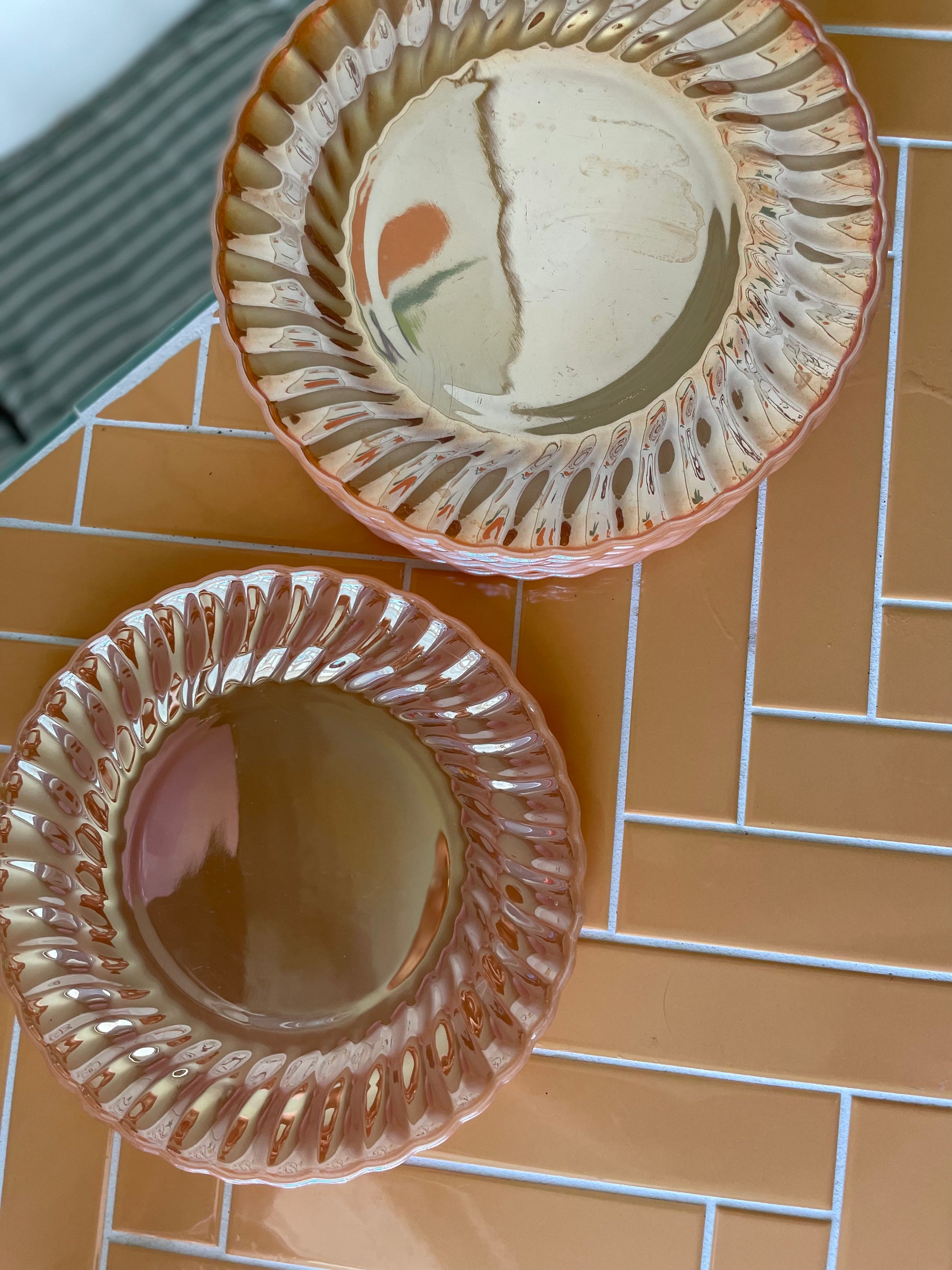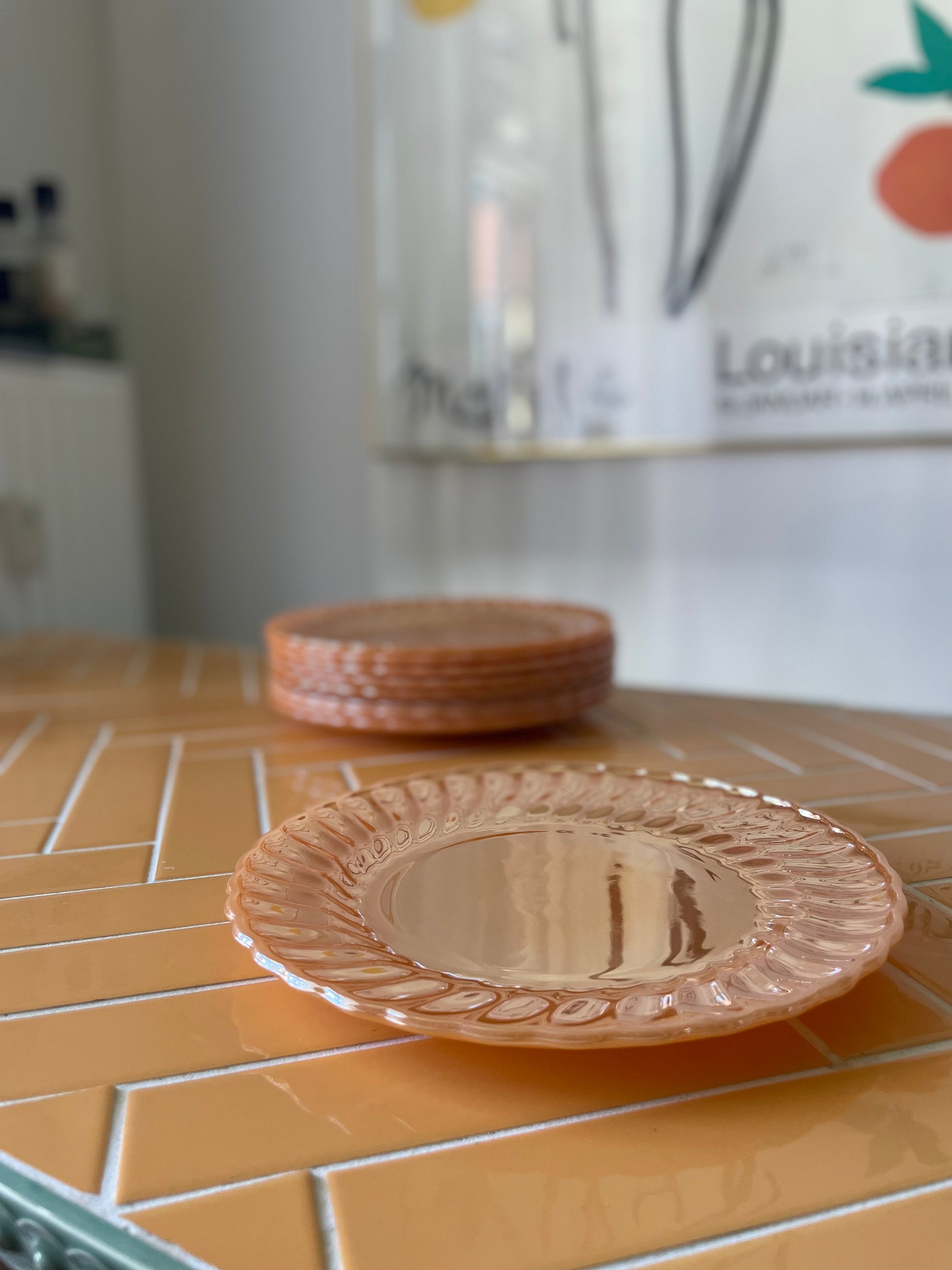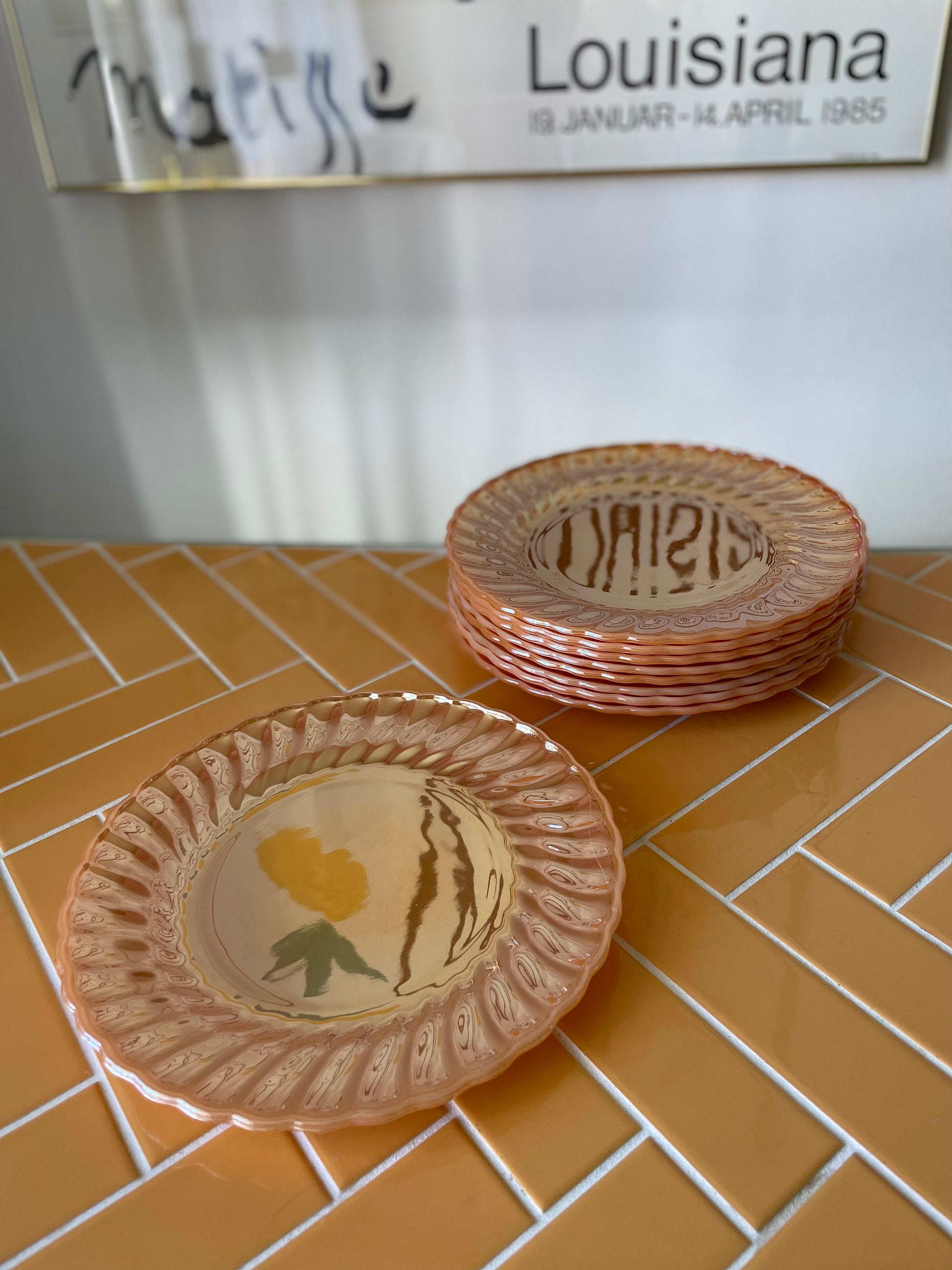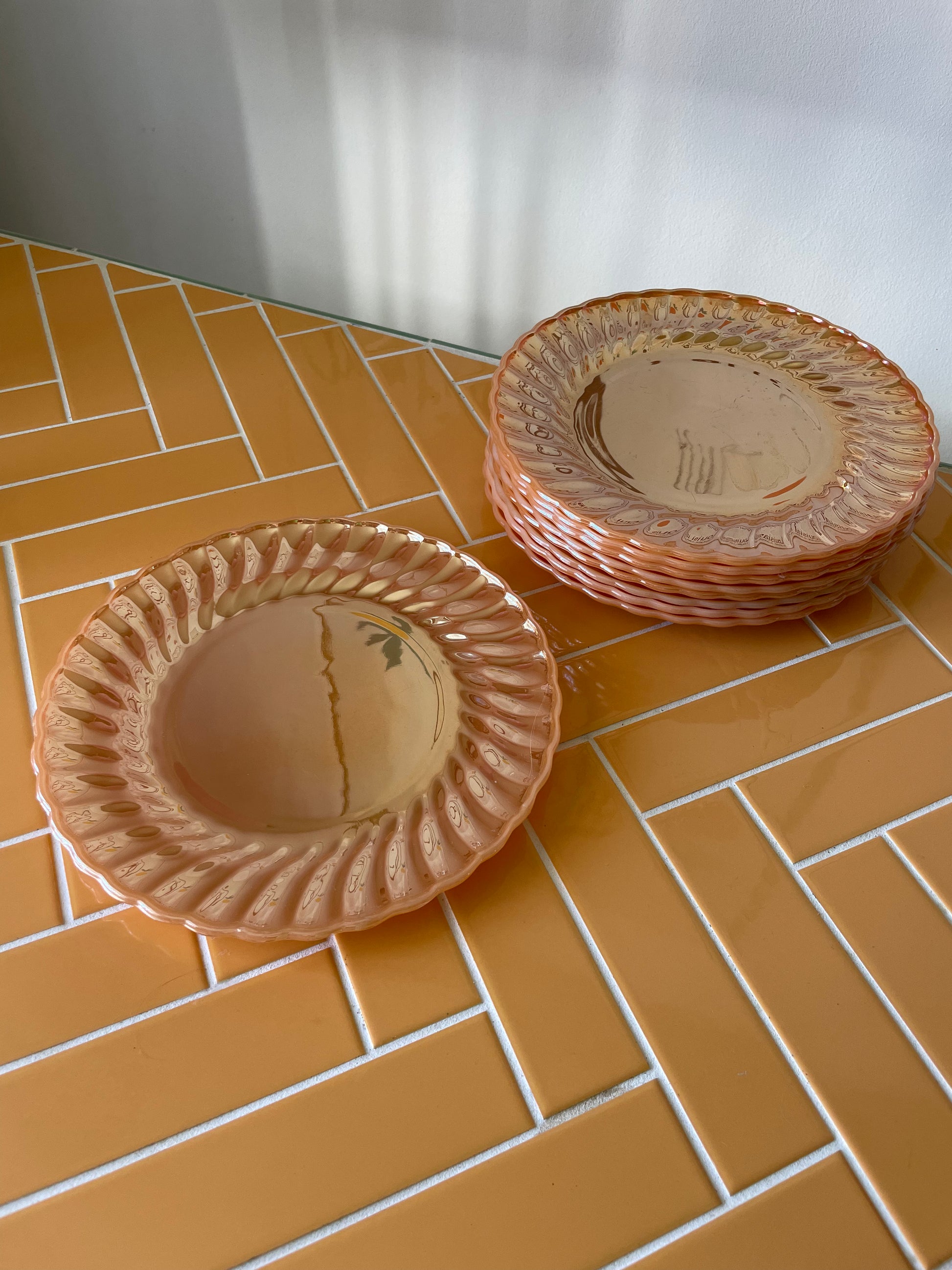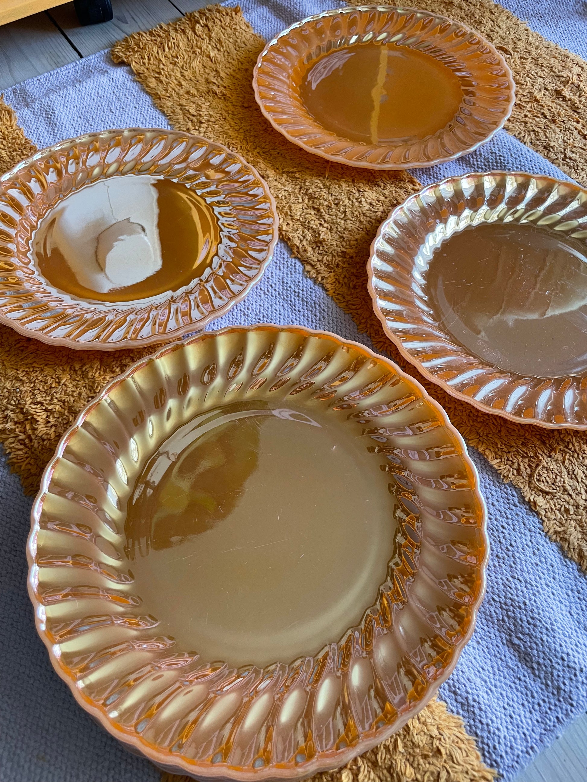 Fantastiske amerikanske Fire King middagstallerkener fra Anchor Hocking. Tallerkenerne er ildfaste og utroligt holdbare. De måler 25,5cm i diameter.