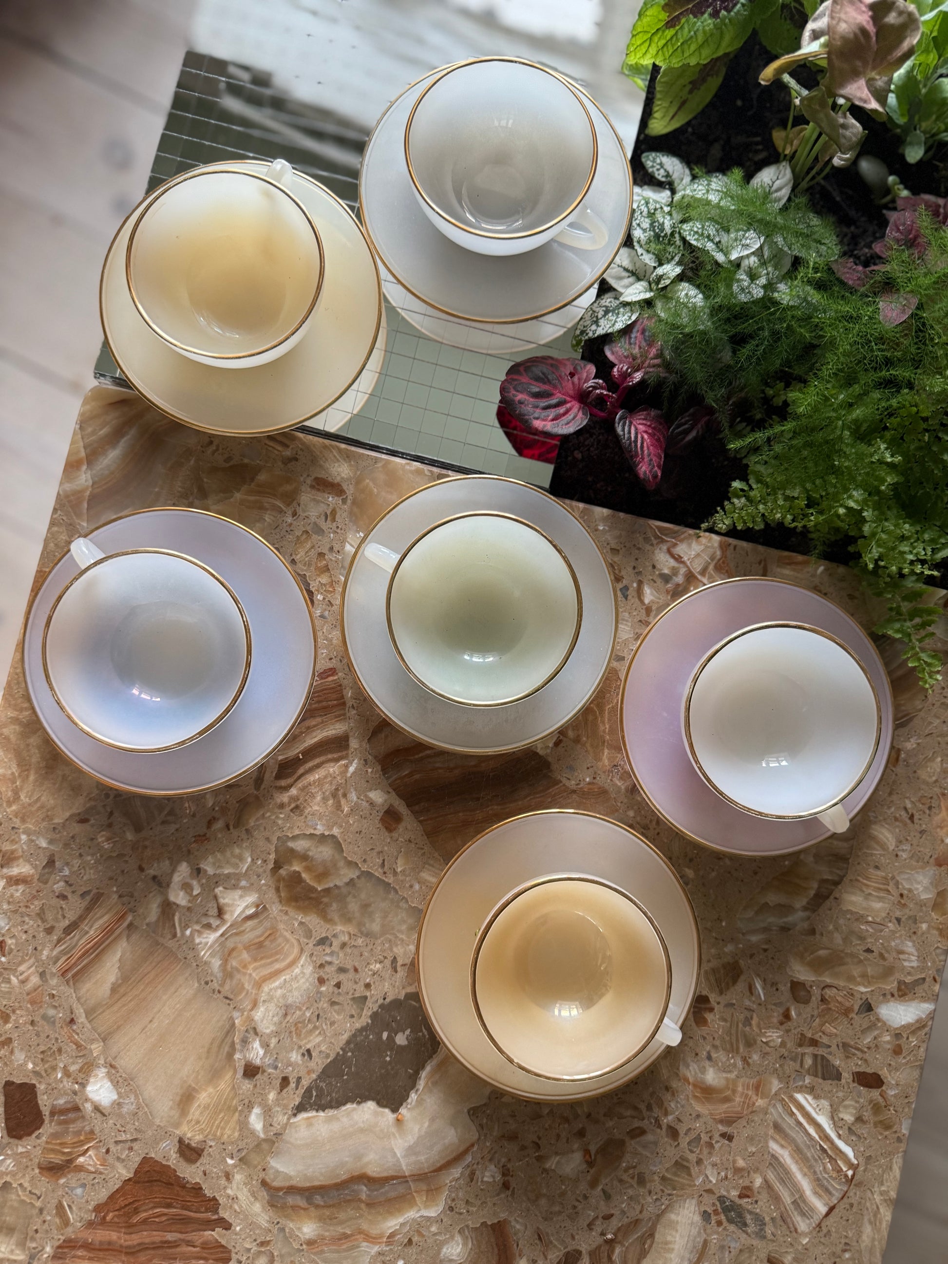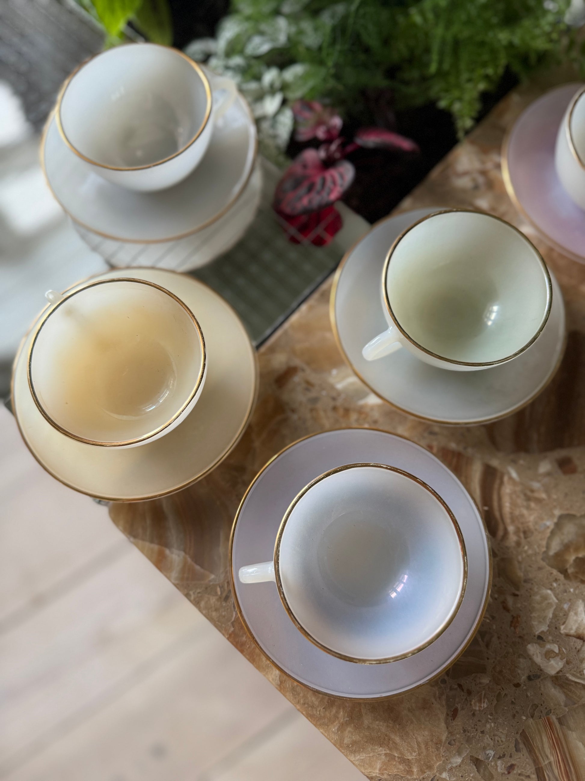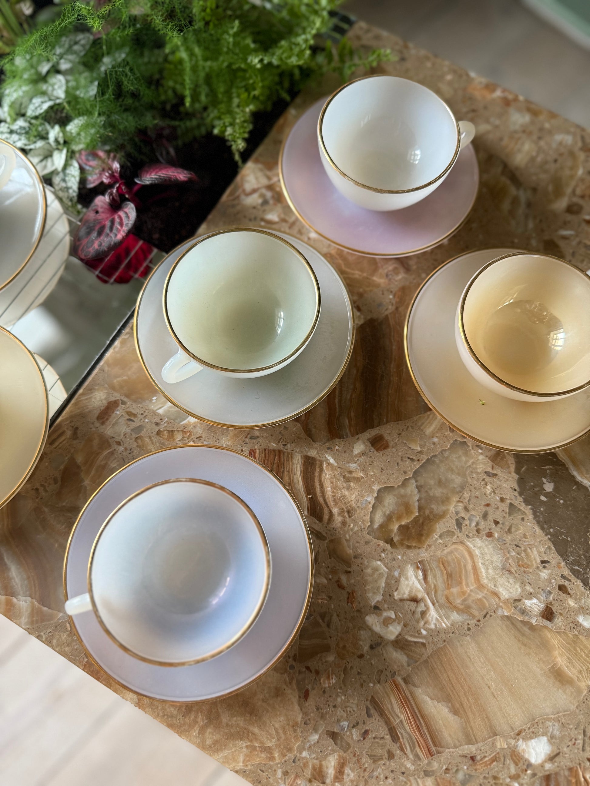 Smukke gamle franske kopsæt af mærket Arcopal. Kopperne er espresso størrelse, og rummer 0,5dl.