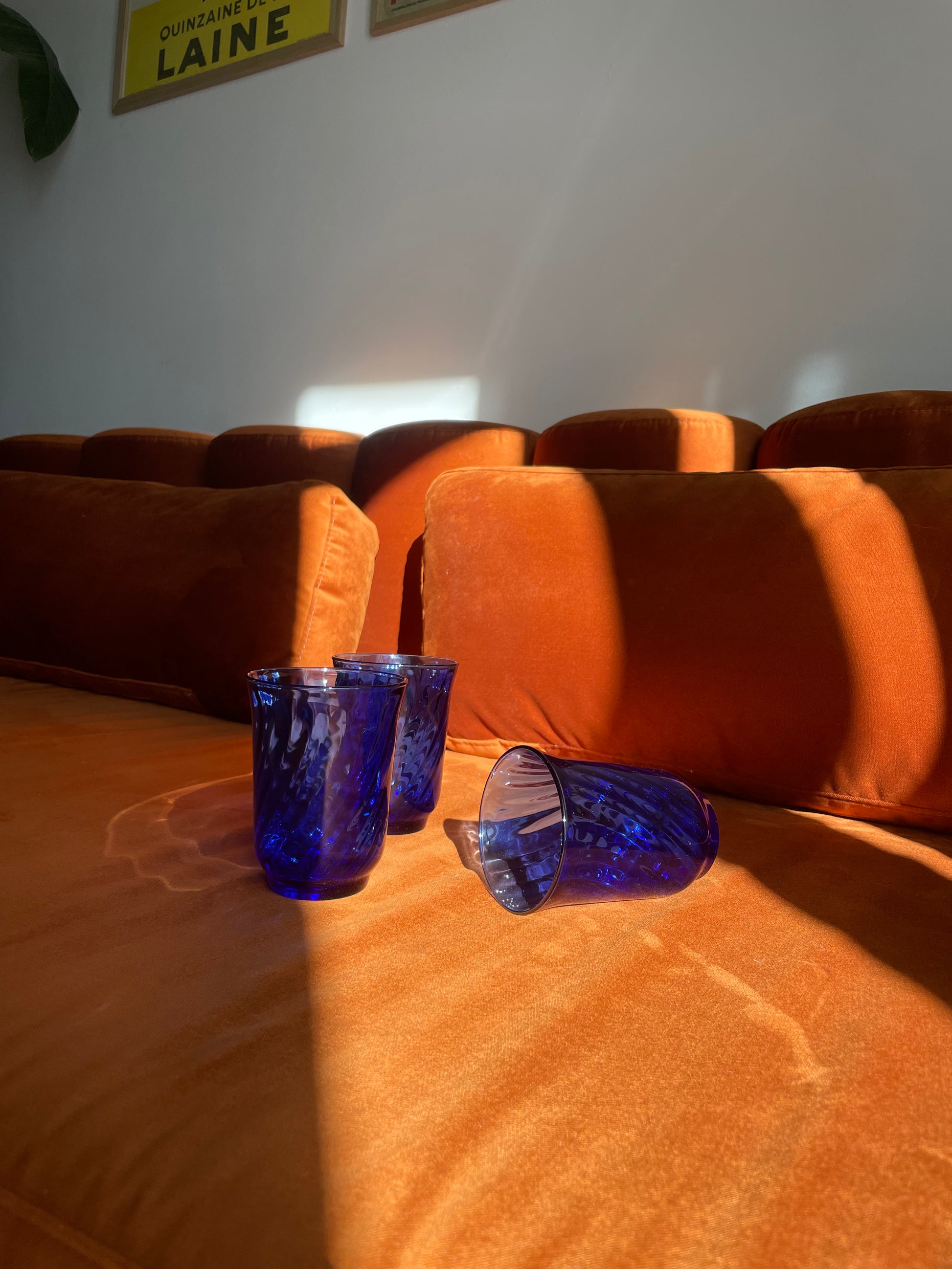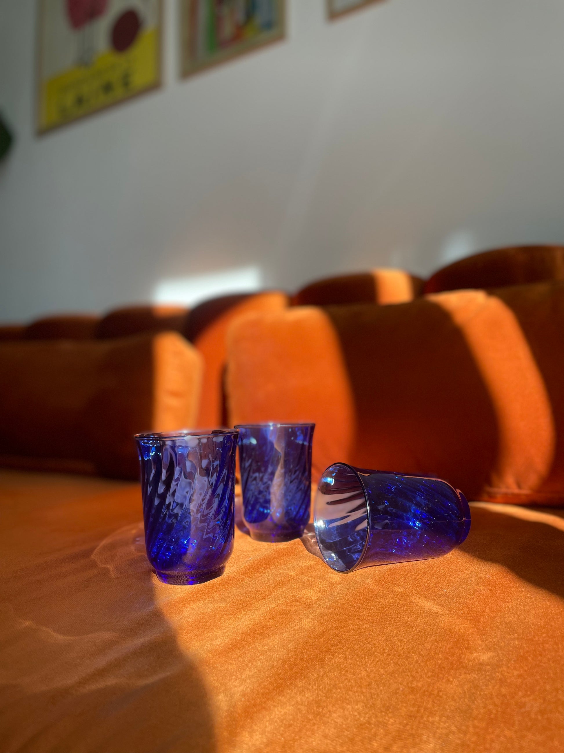 Smukke vandglas i en yderst fortryllende og royal blå farve fra franske Arcoroc. Glassene måler 10,5cm i højden.