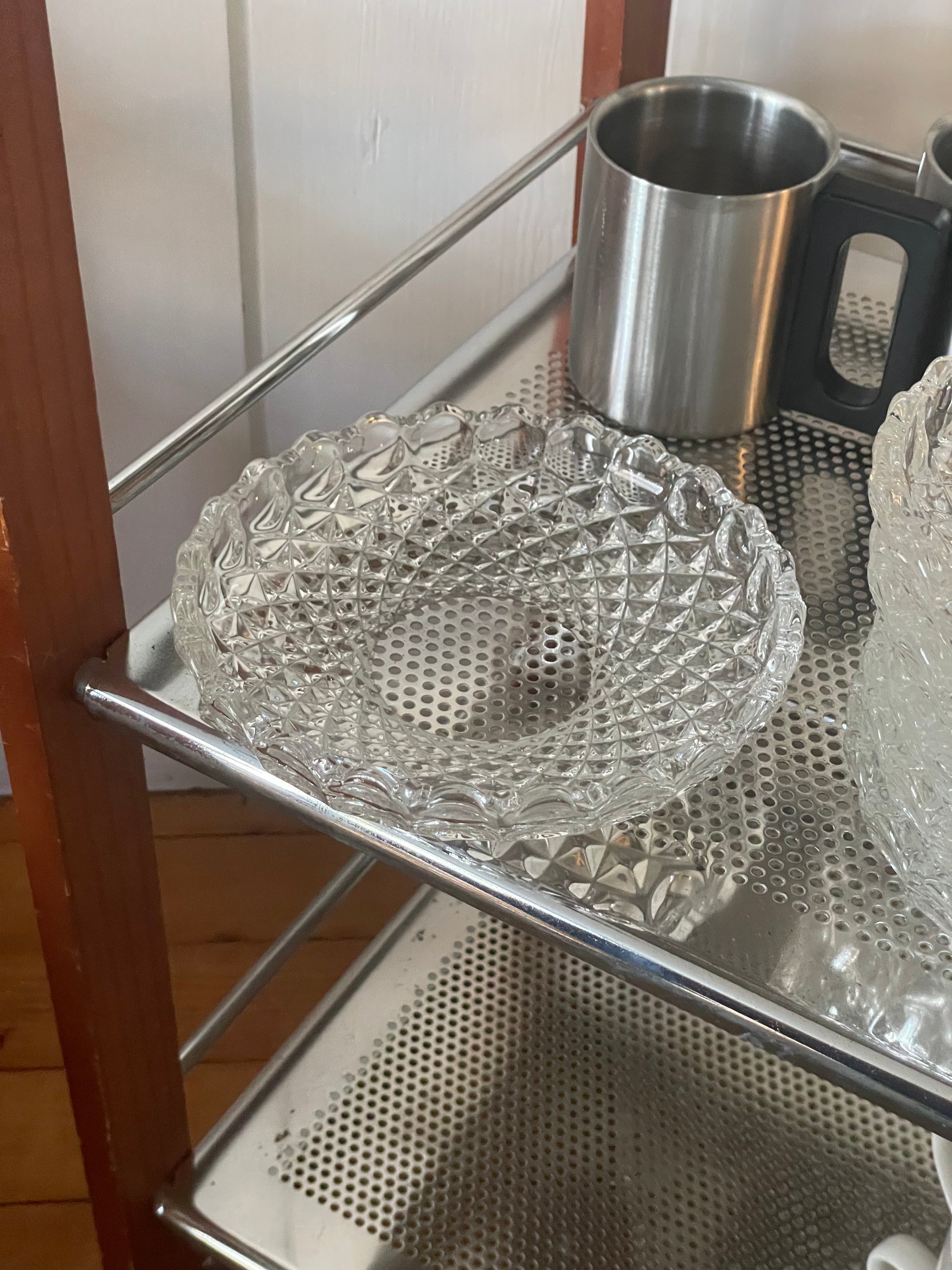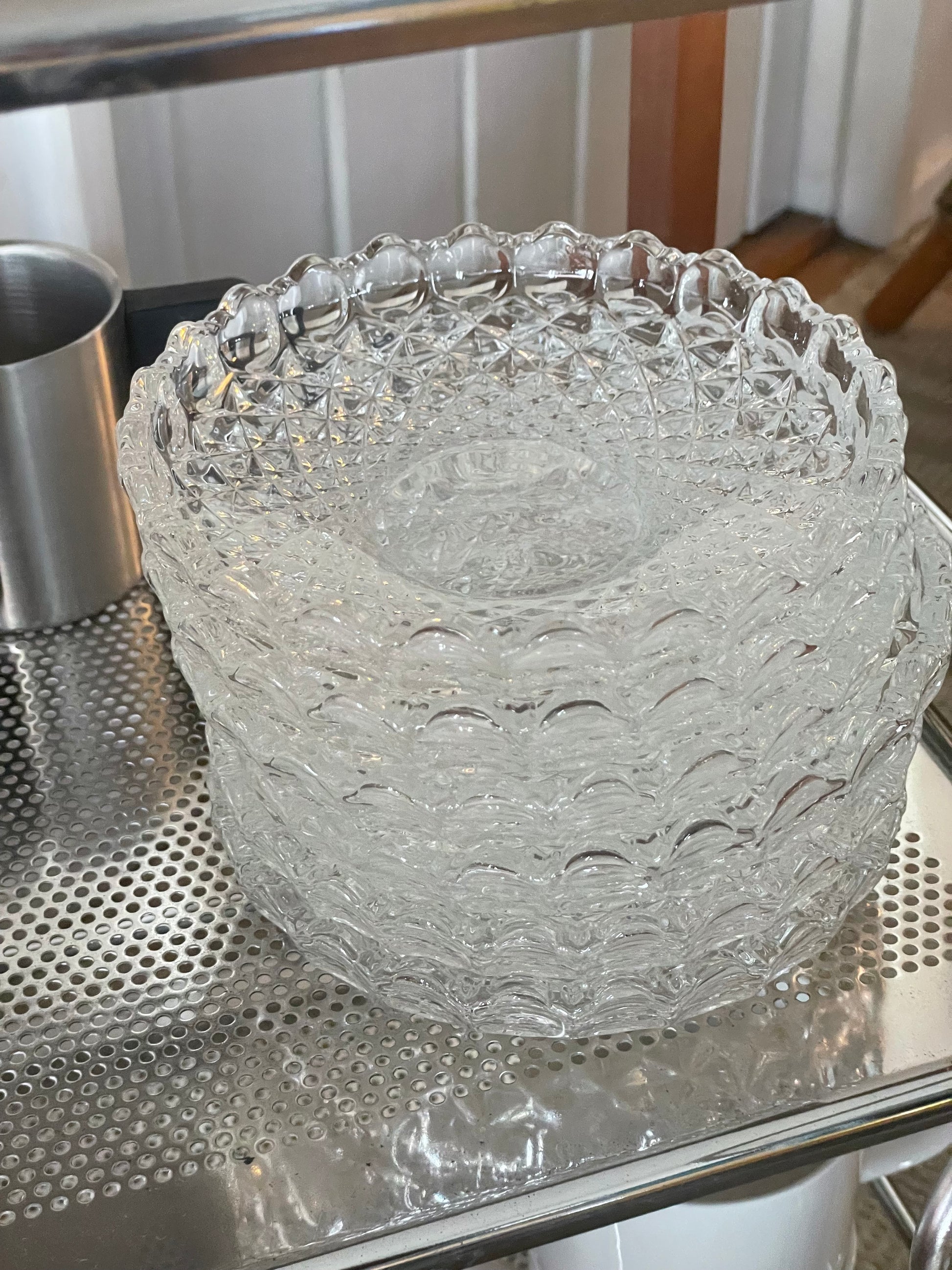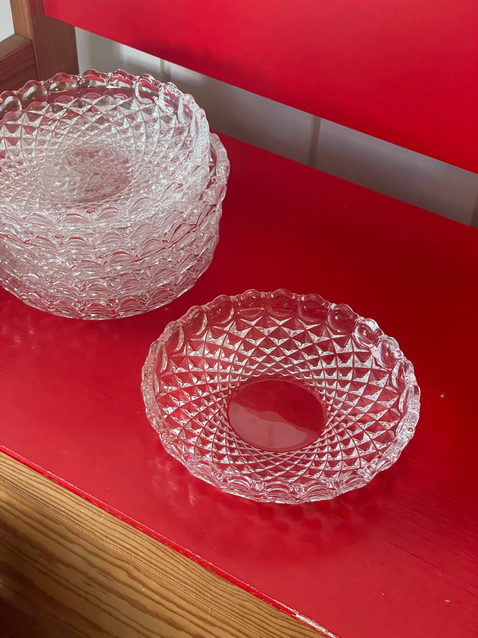 Bedårende asietter i klart massivt glas med den vildeste struktur og bløde runde kanter. Asietterne kan du enten bruge samlet til forret eller dessert eller du kan bruge dem enkeltvis til servering af tilbehør eller opbevaring af smykker på natbordet. De sælges stykvis og kommer i flot stand. De måler 15,5cm i bredden.