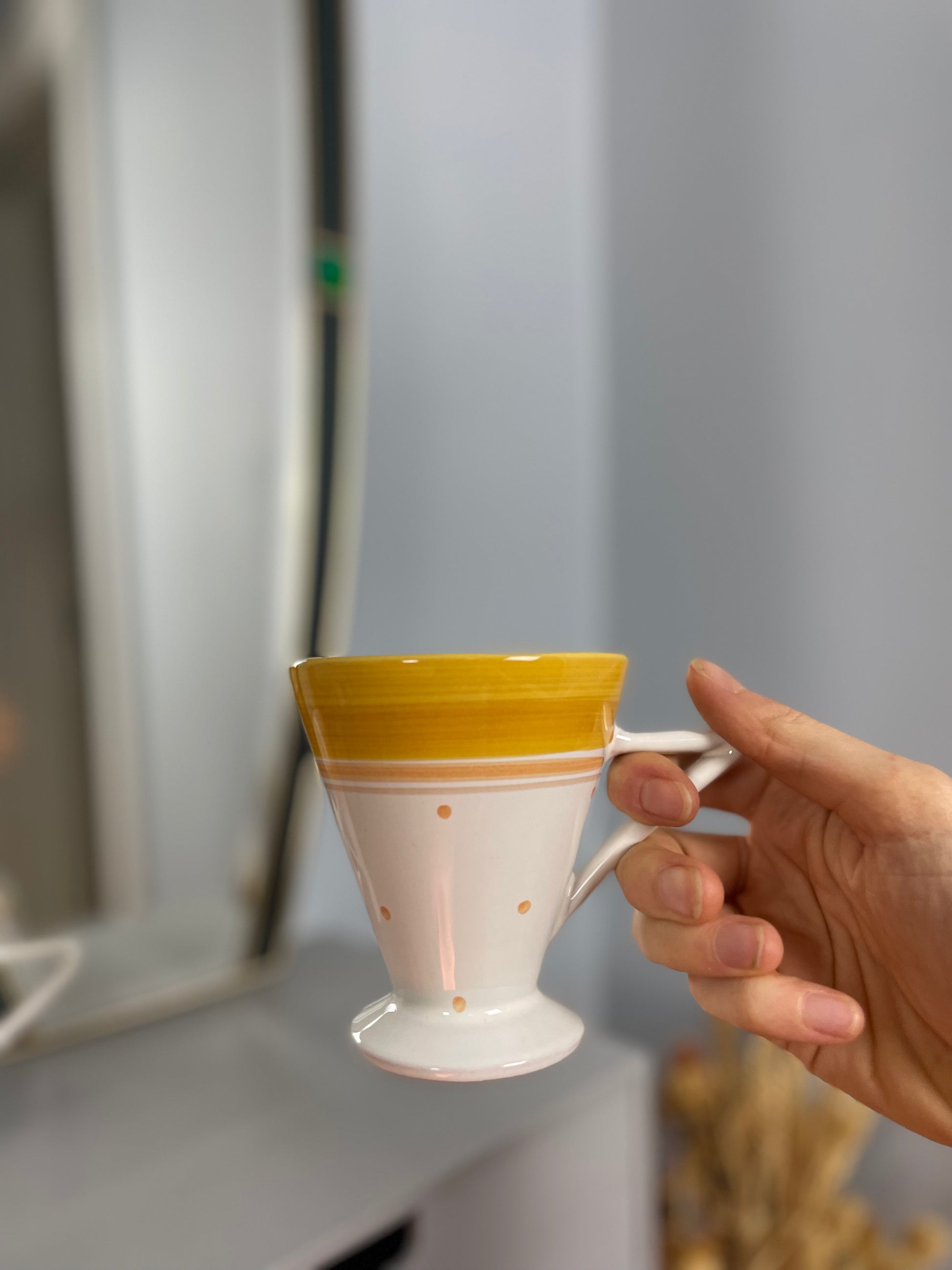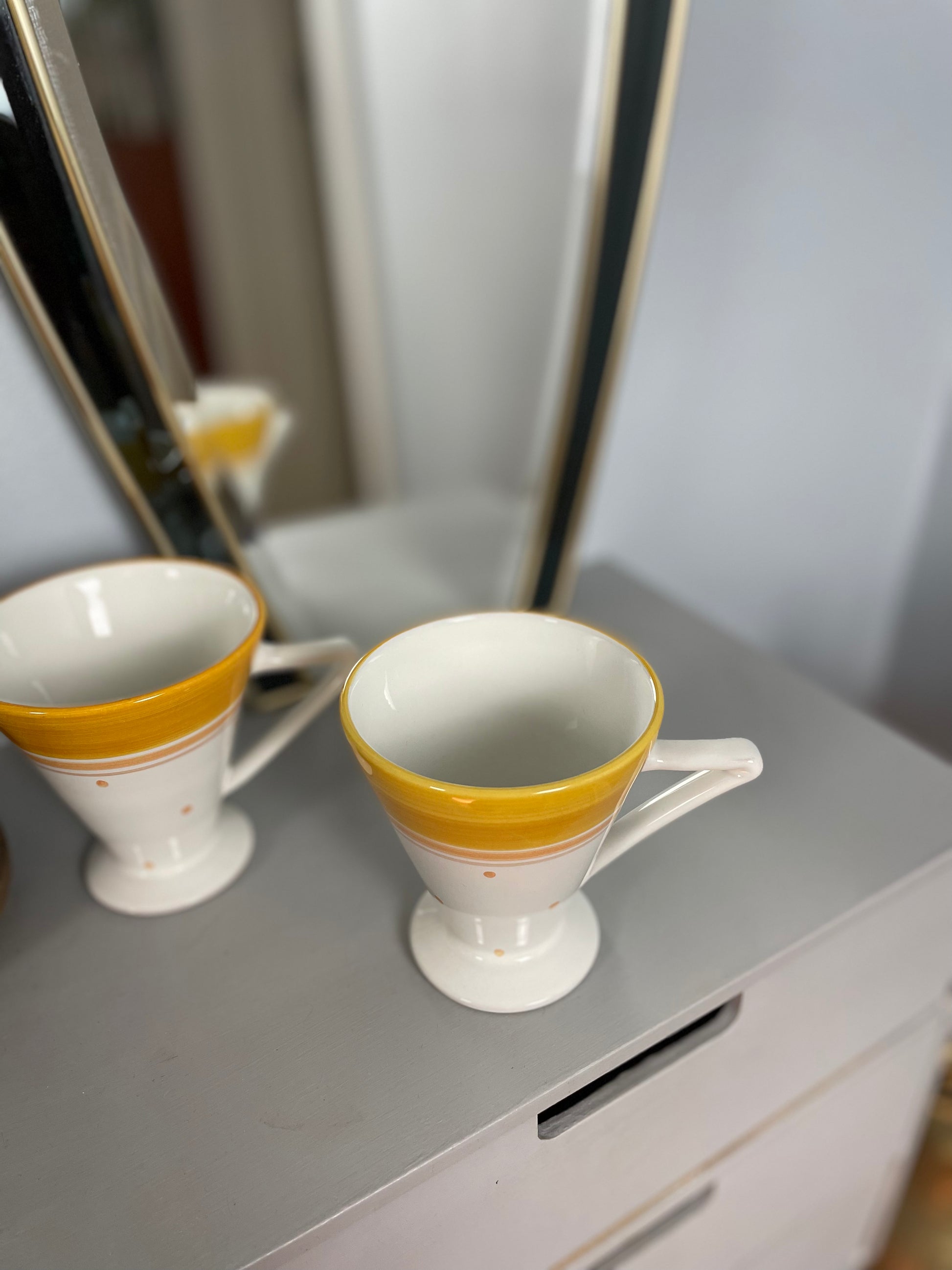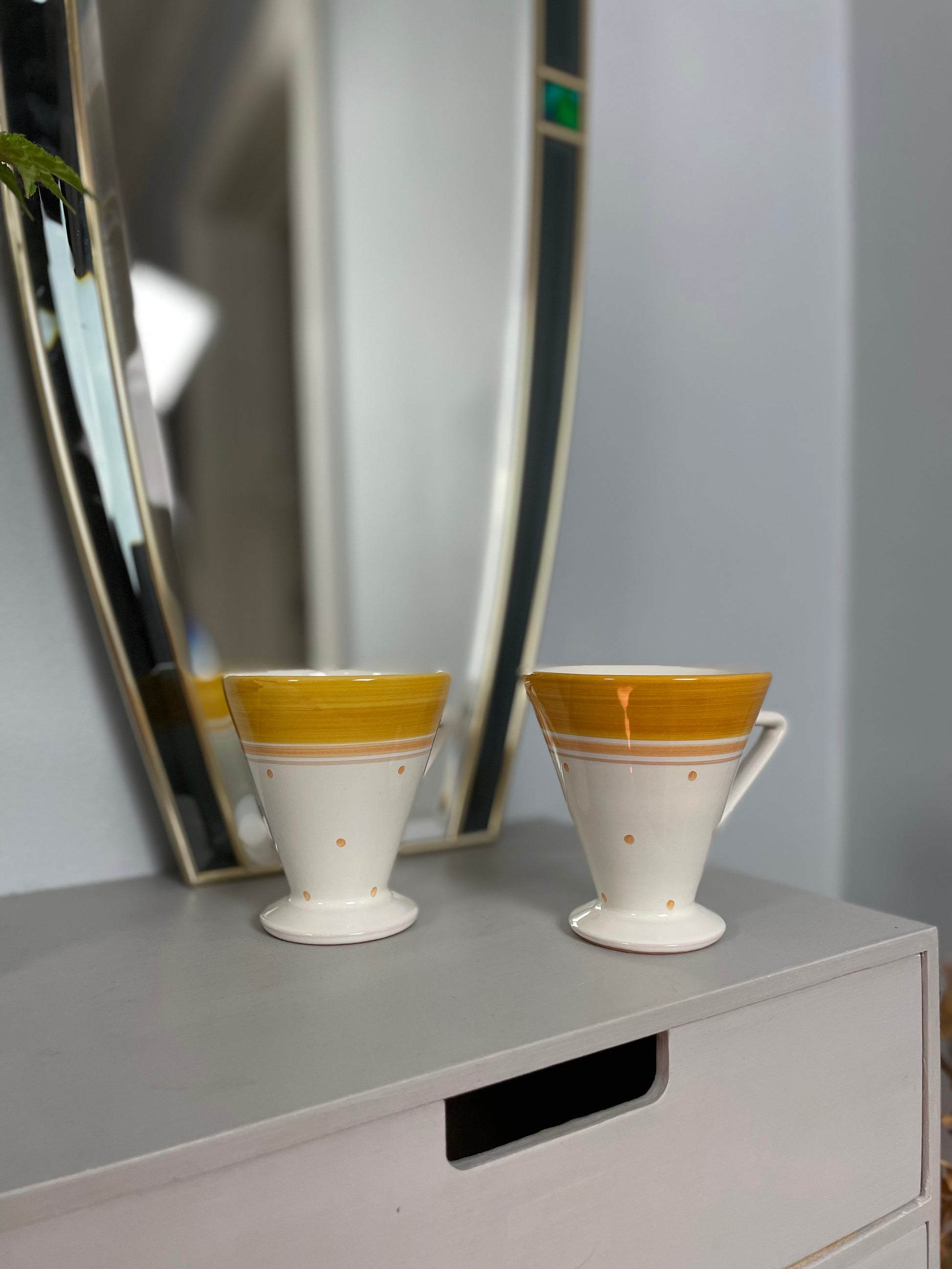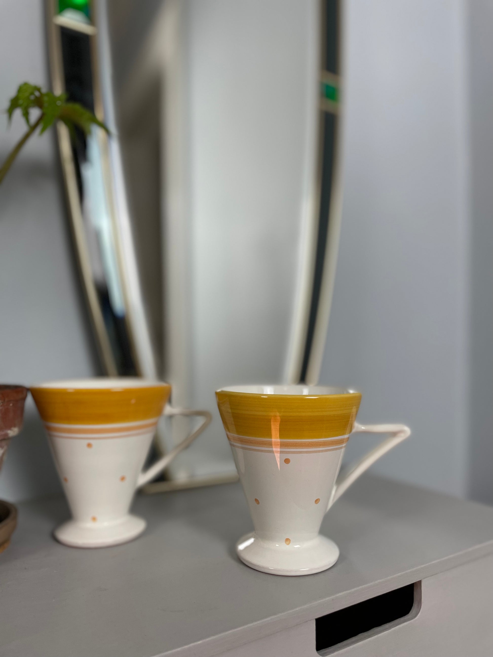 Kopper fra Bangholm keramik i smuk hvid og varm gul farve. Fornem stand med minimale brugsspor. Ingen afslag. Koppen måler 9,5cm i højden og 9cm i diameter ved åbningen. Sælges stykvis.