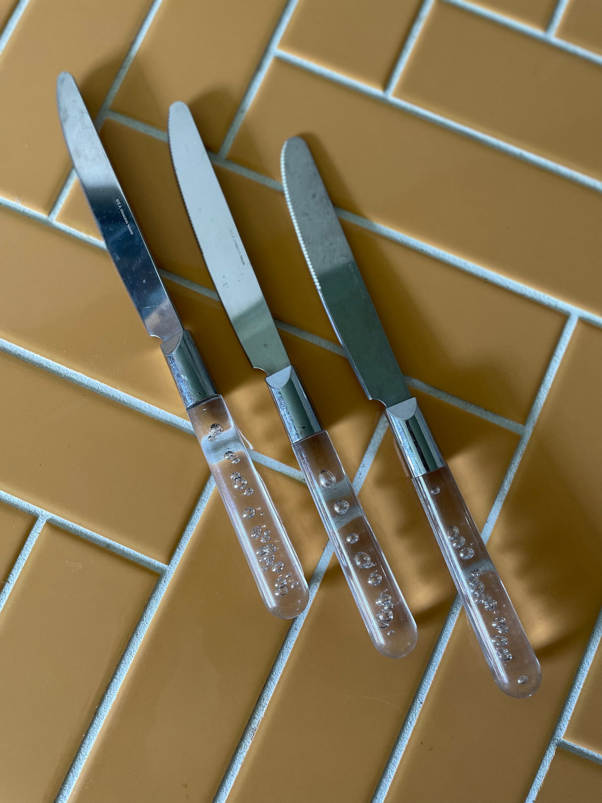 Boblebestik - knive i klar plast med bobler. Uden revner og ‘løse led’ men almindelige brugsspor. Sælges stykvis.