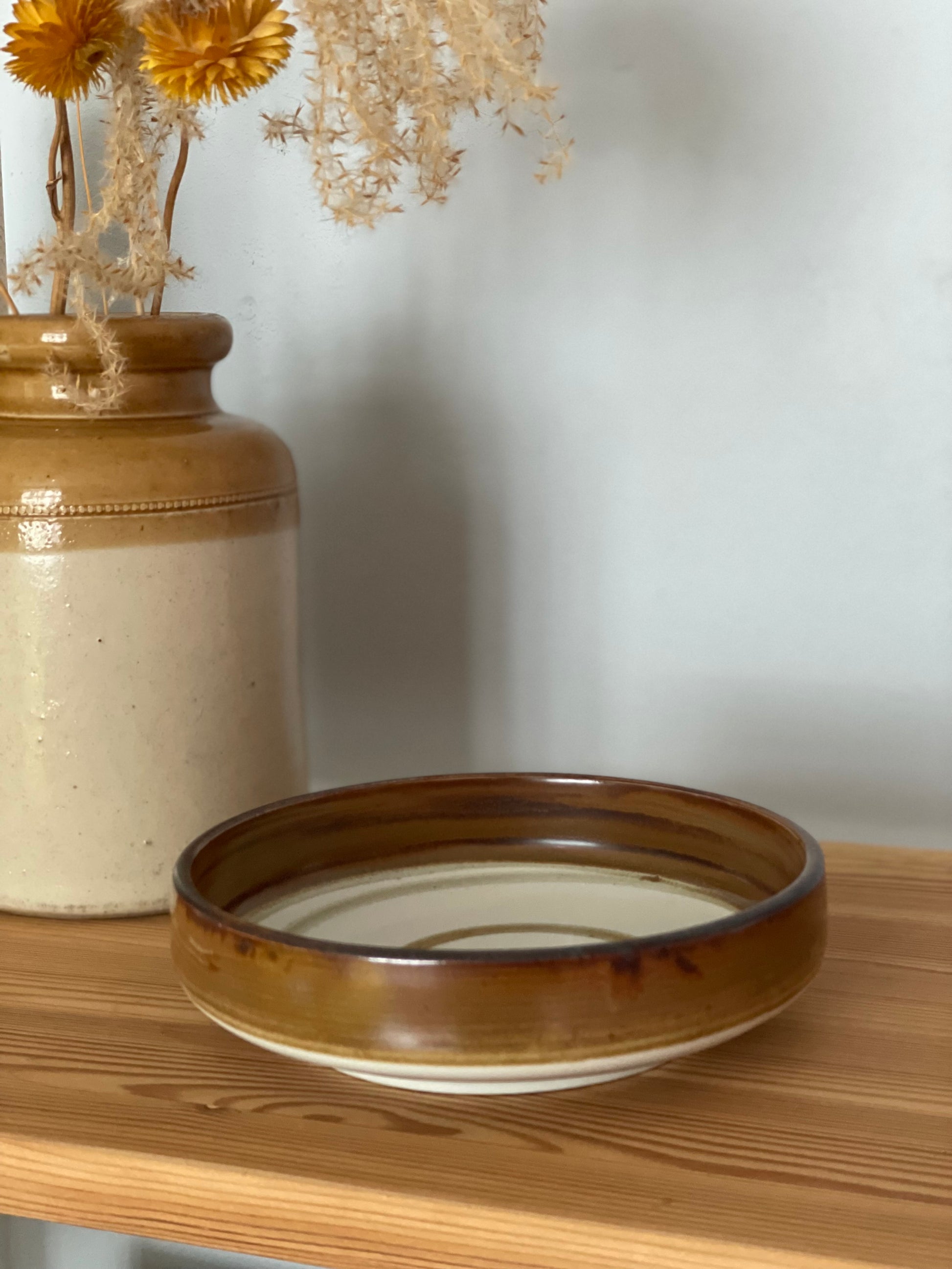Lækker lav skål i jordnære farver og enkel swirl. Skålen står i flot stand og måler 16,5cm i bredden og 4,5cm i højden.