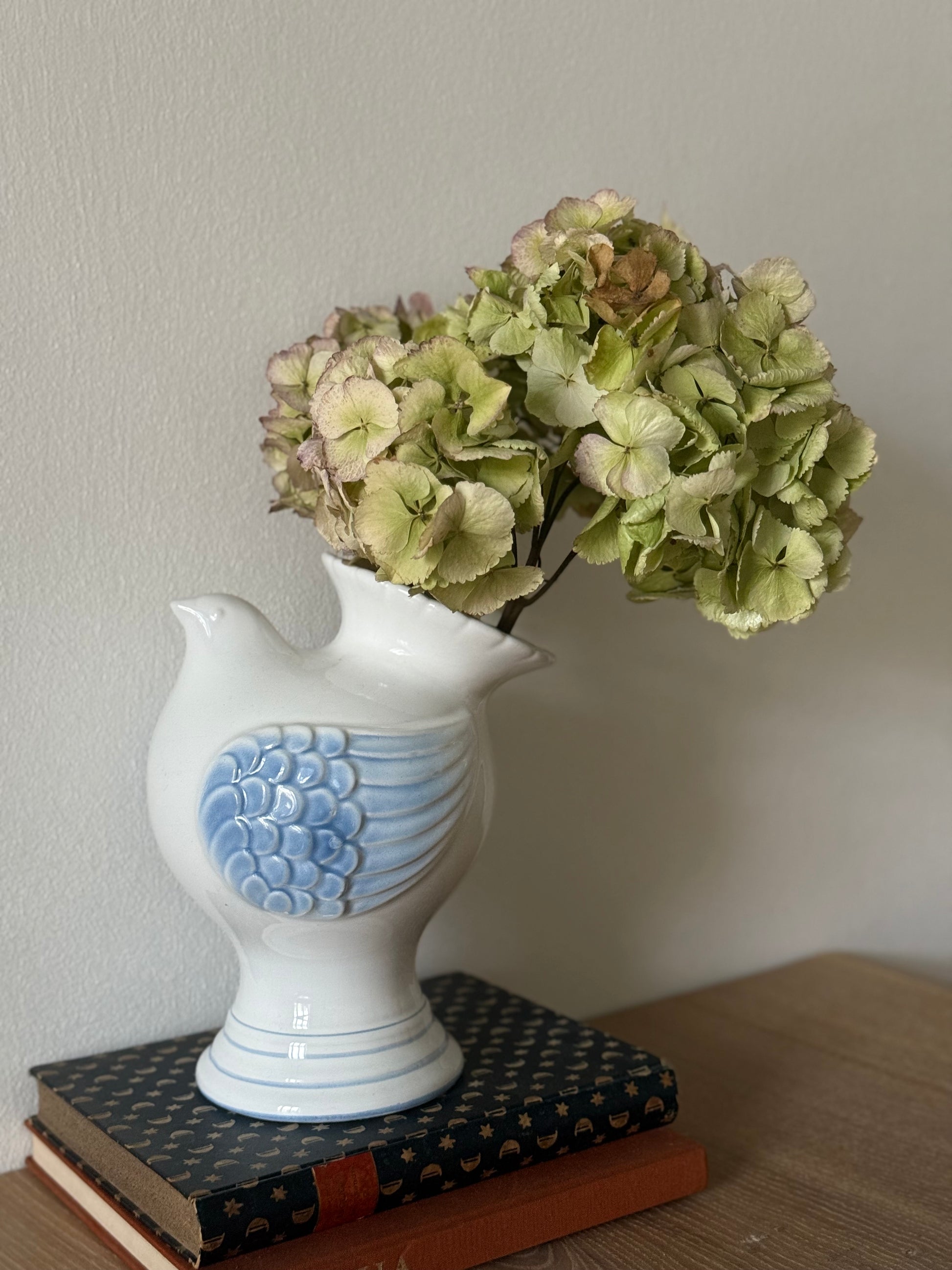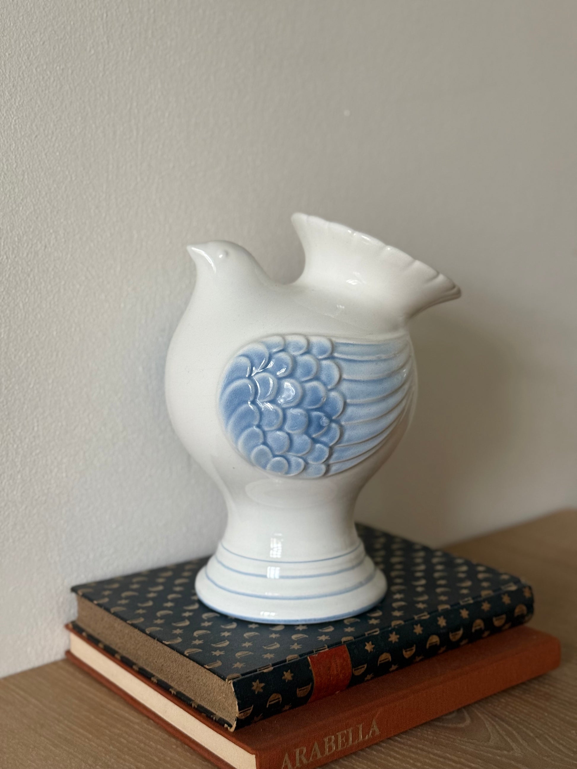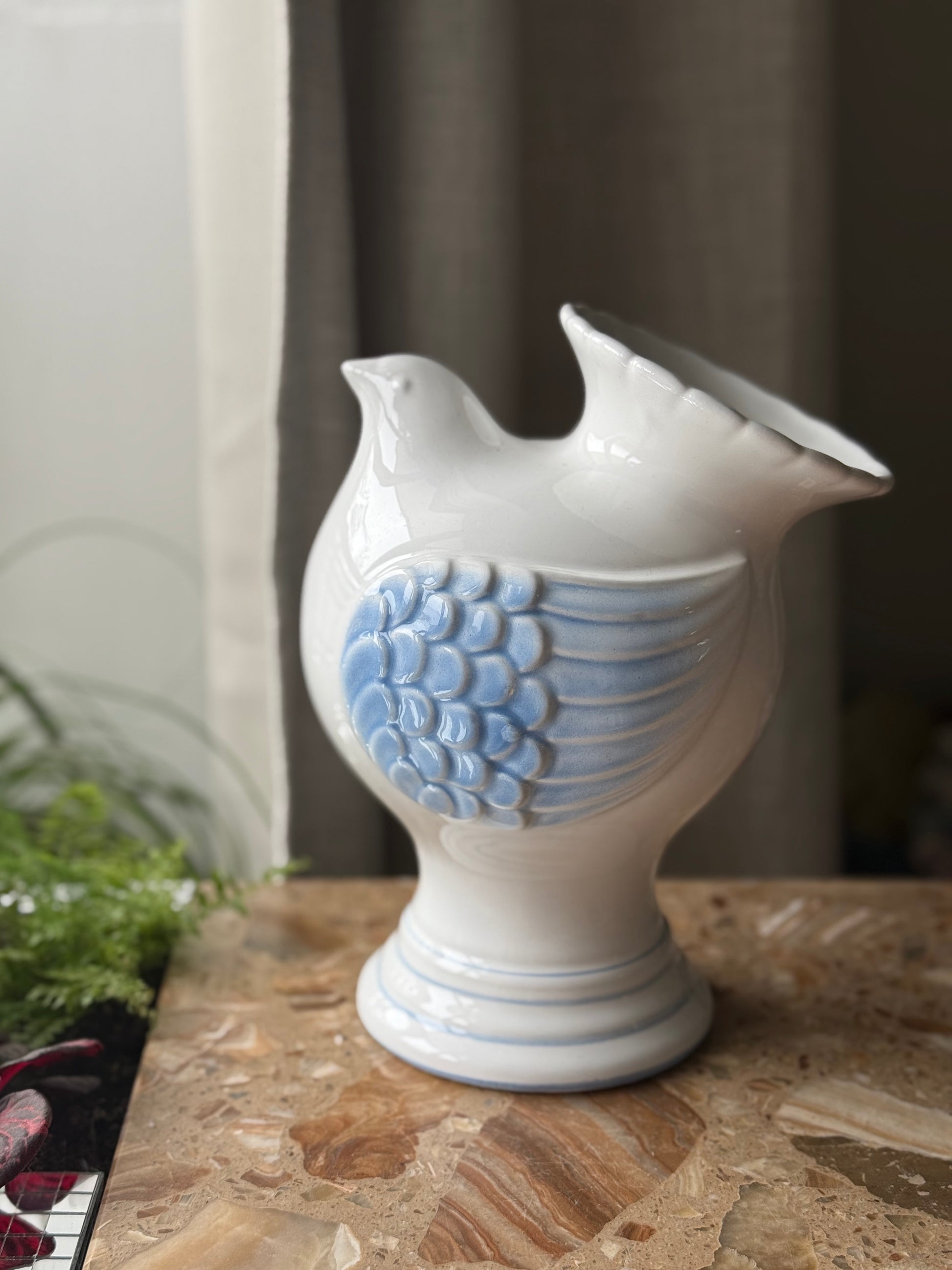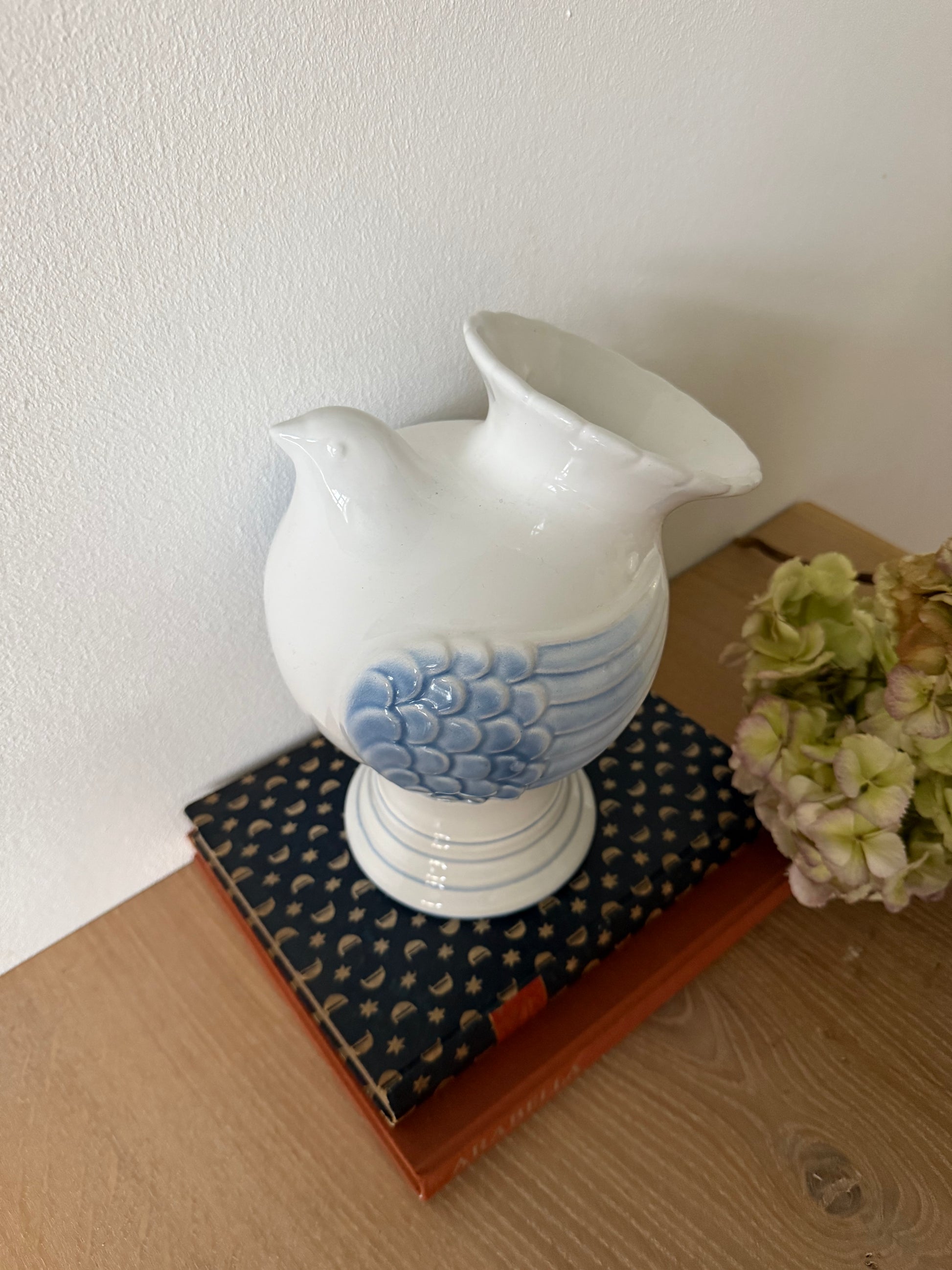 Smuk klassisk, men legene vase formet som due i hvid blank glasur med blå vinger med fine detaljer. Vasen står i flot stand og måler 25cm i højden.
