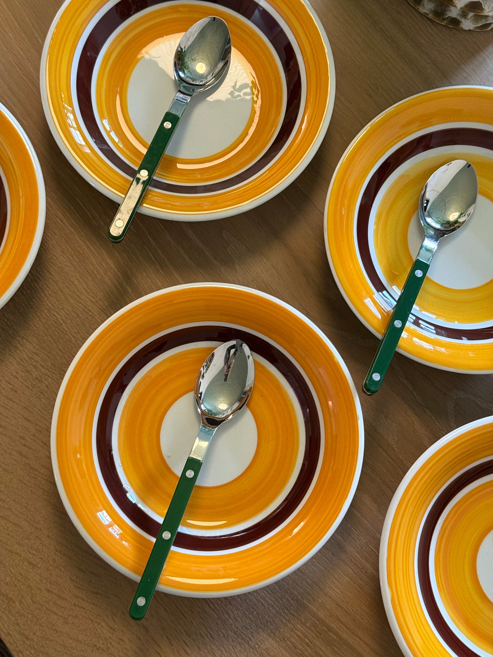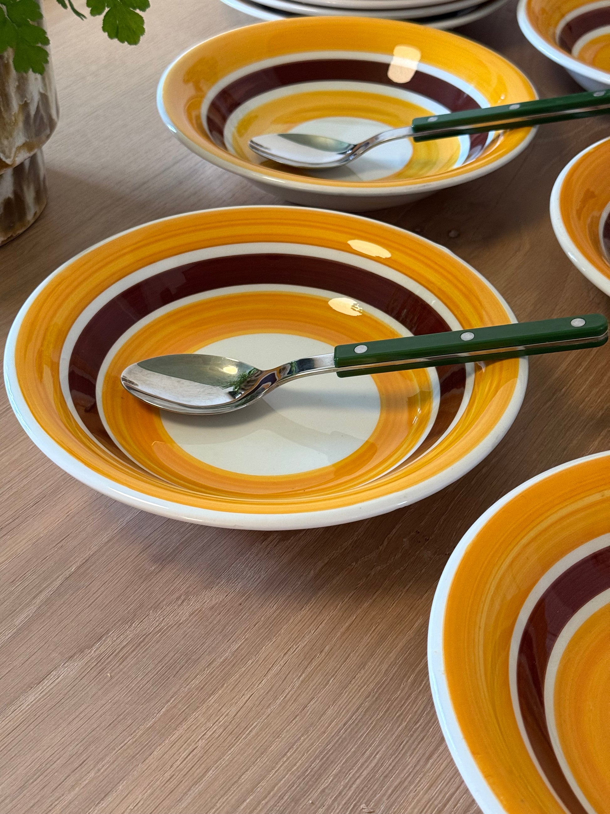 Italienske dybe tallerkener i brune og gule nuancer. De måler 22,5cm i bredden og sælges stykvis.