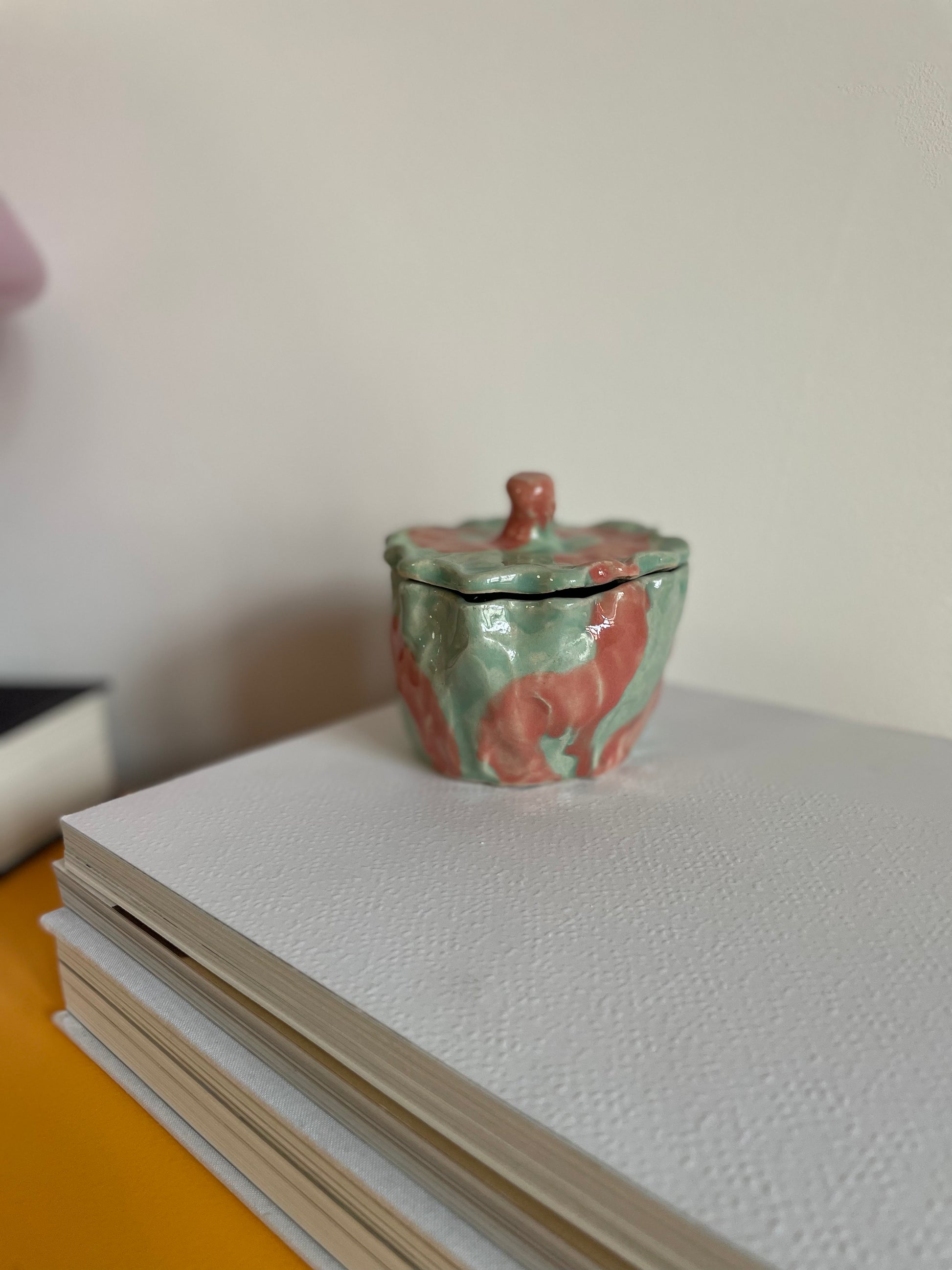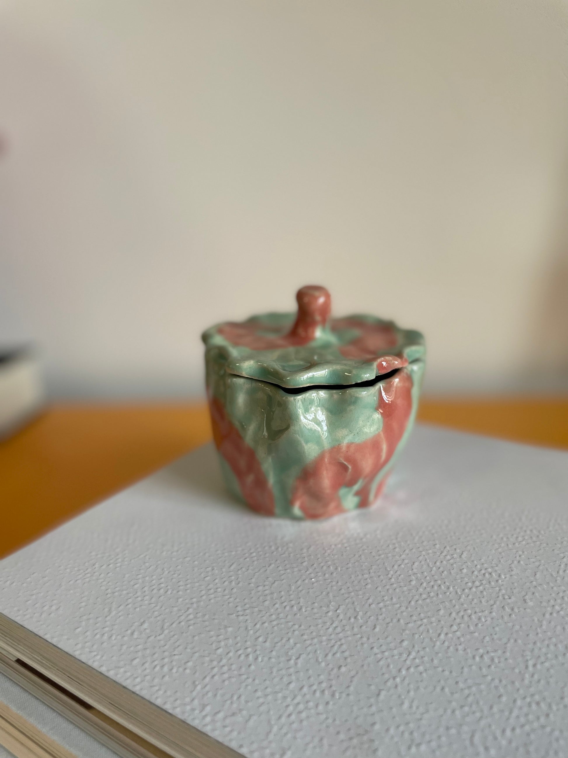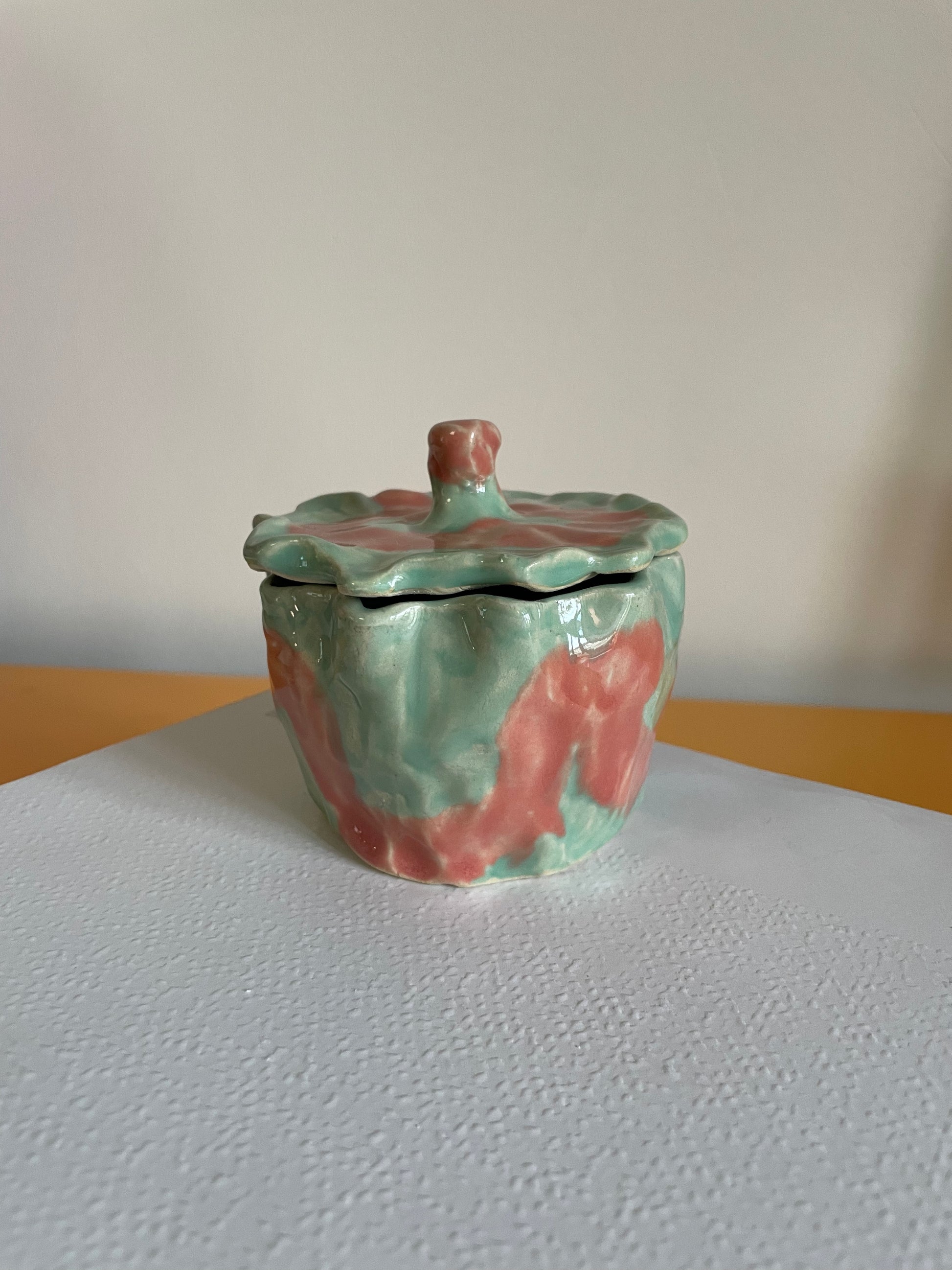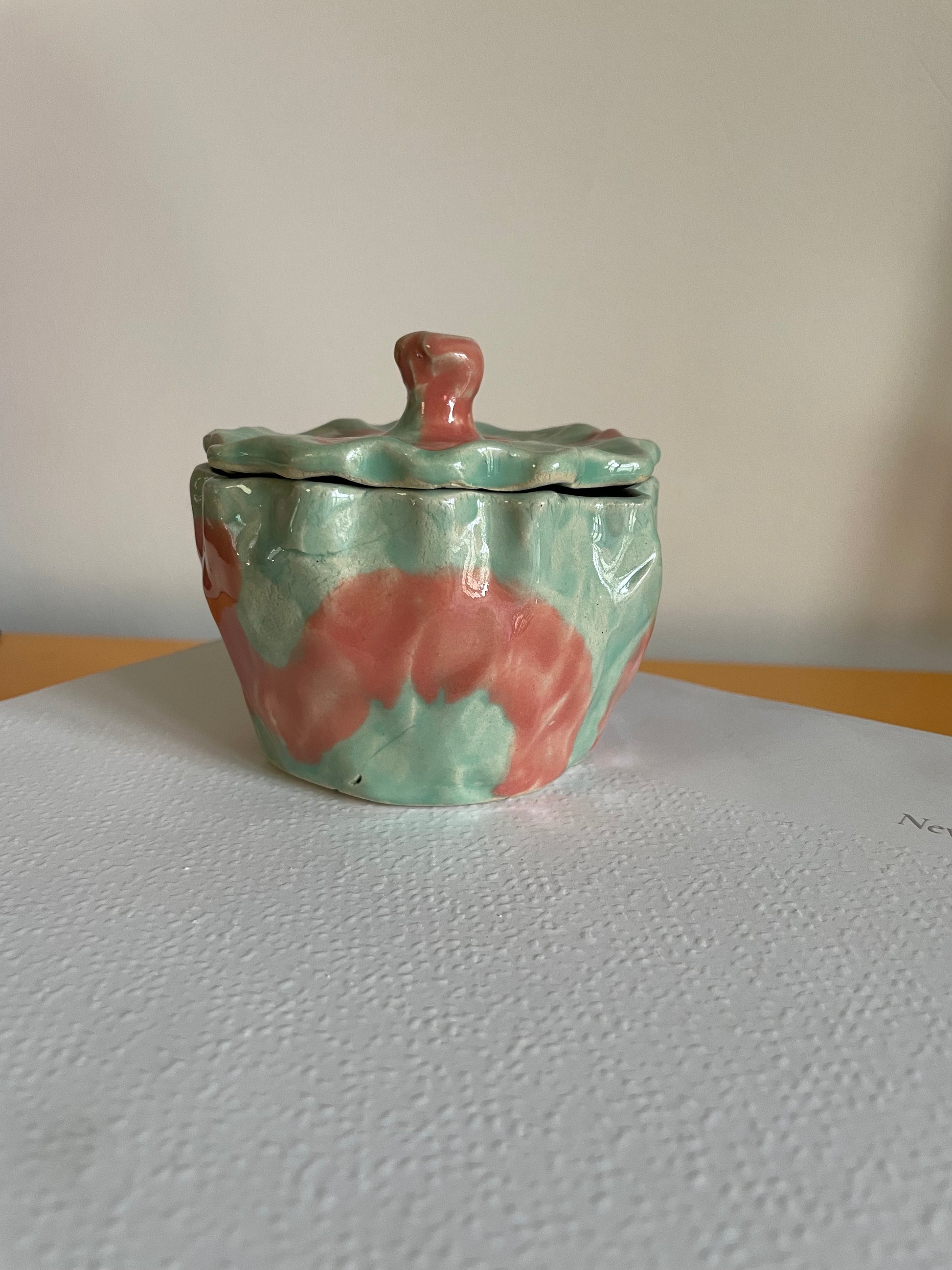 Skøn lille håndlavet krukke med låg i keramik. Sen er perfekt til sukker, smykker eller vatrondeller. Bemærk at krukken her har haft en revne inden glasering. Det betyder ikke noget for funktionen og den er ikke sart. Alligevel sælges den til en favorabel pris.