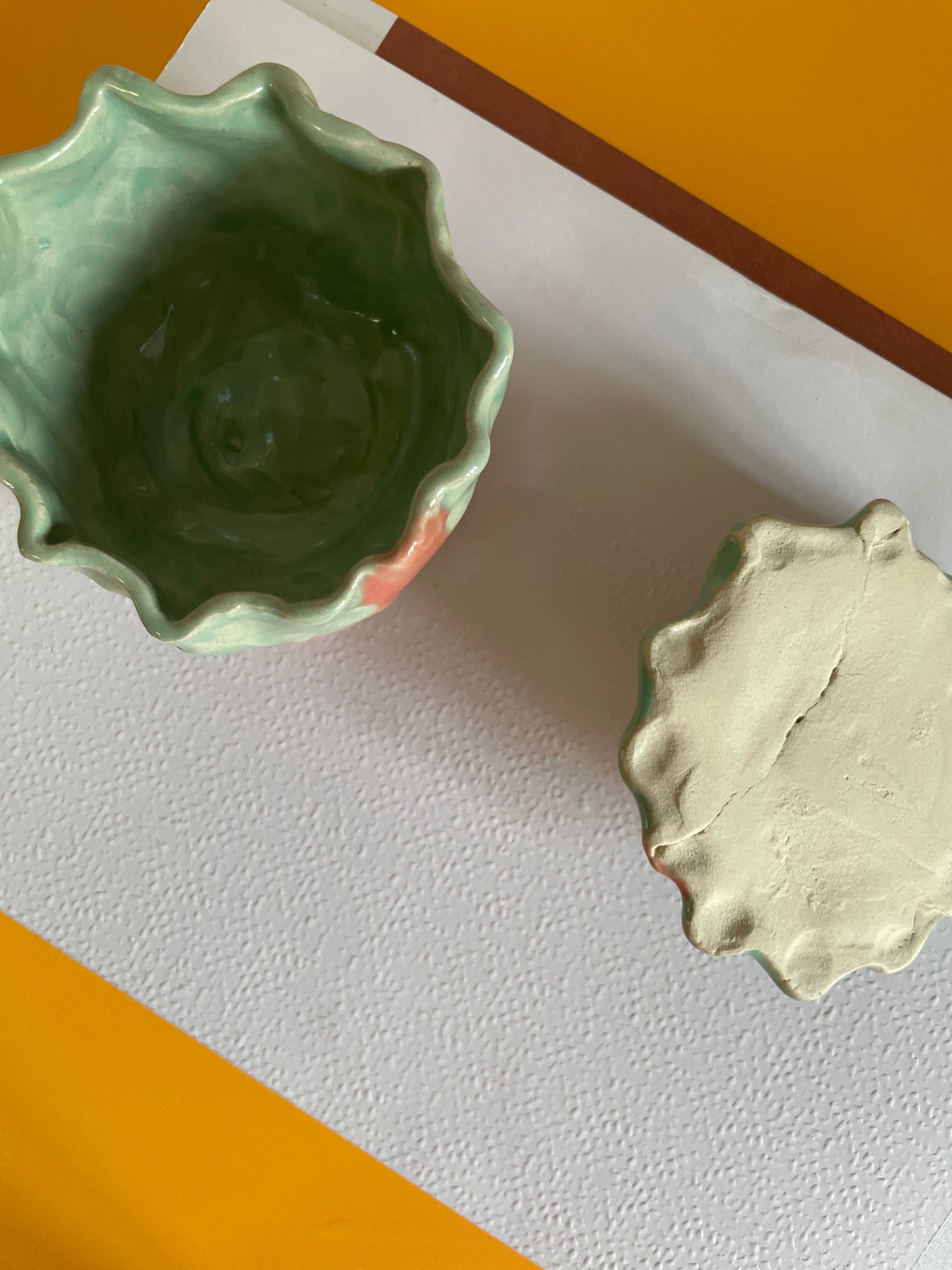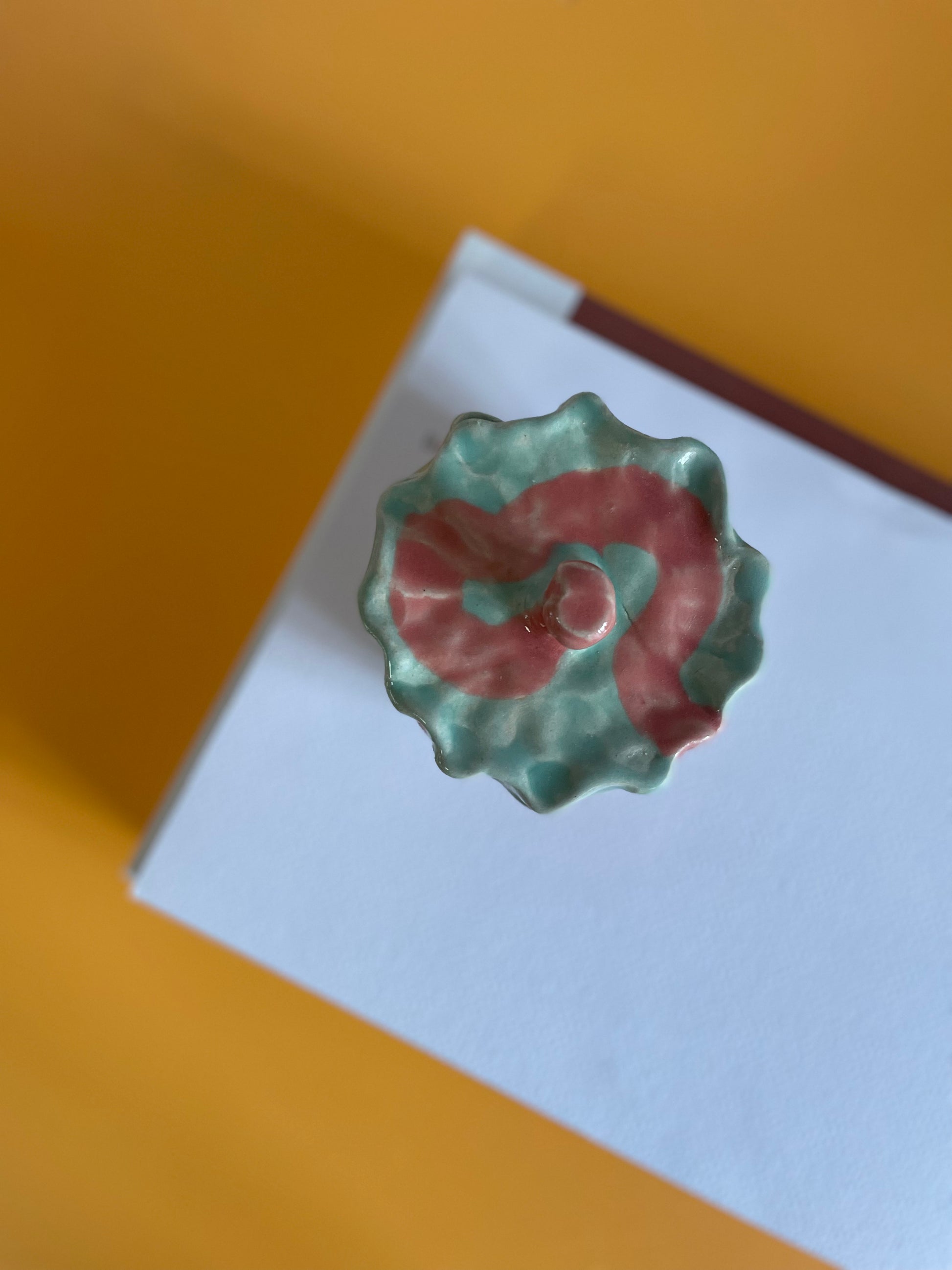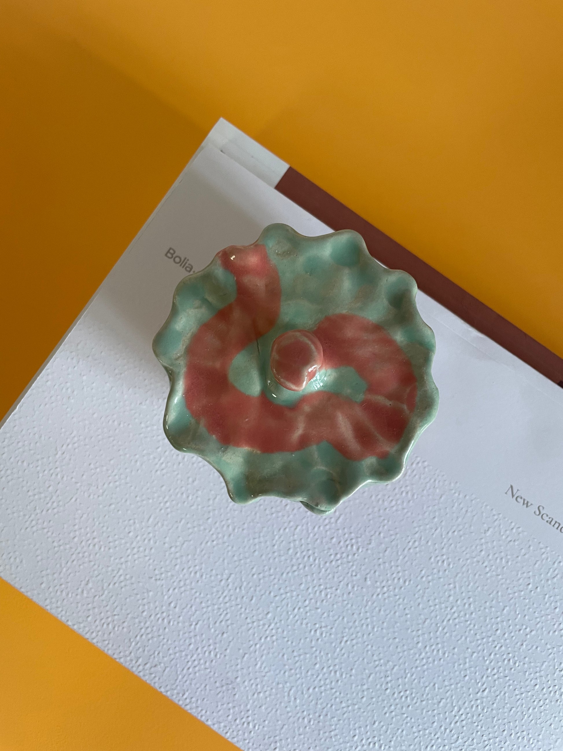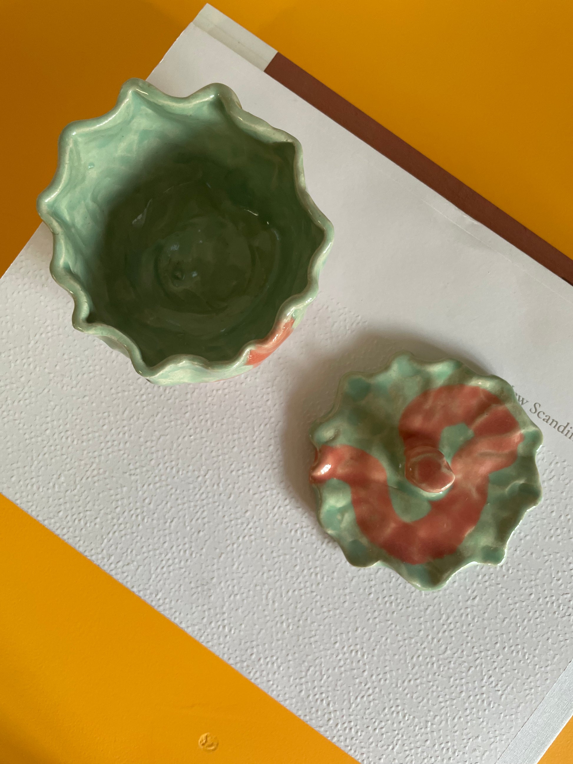 Skøn lille håndlavet krukke med låg i keramik. Sen er perfekt til sukker, smykker eller vatrondeller. Bemærk at krukken her har haft en revne inden glasering. Det betyder ikke noget for funktionen og den er ikke sart. Alligevel sælges den til en favorabel pris.