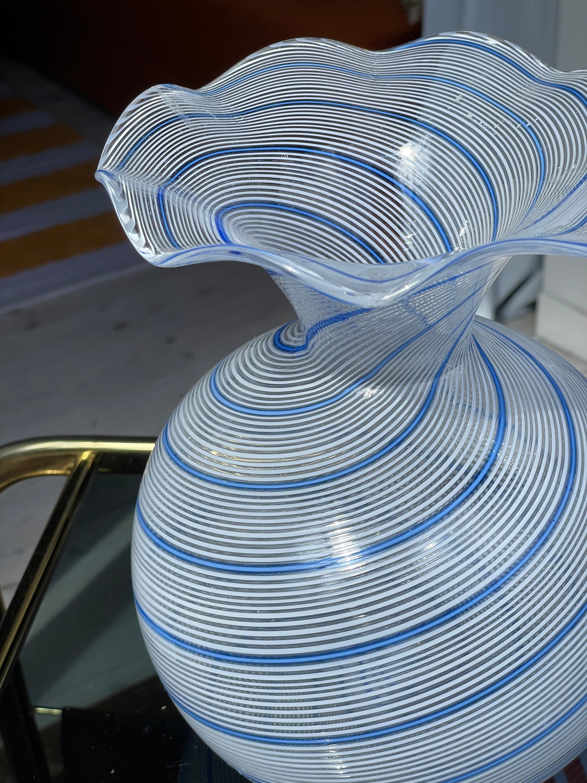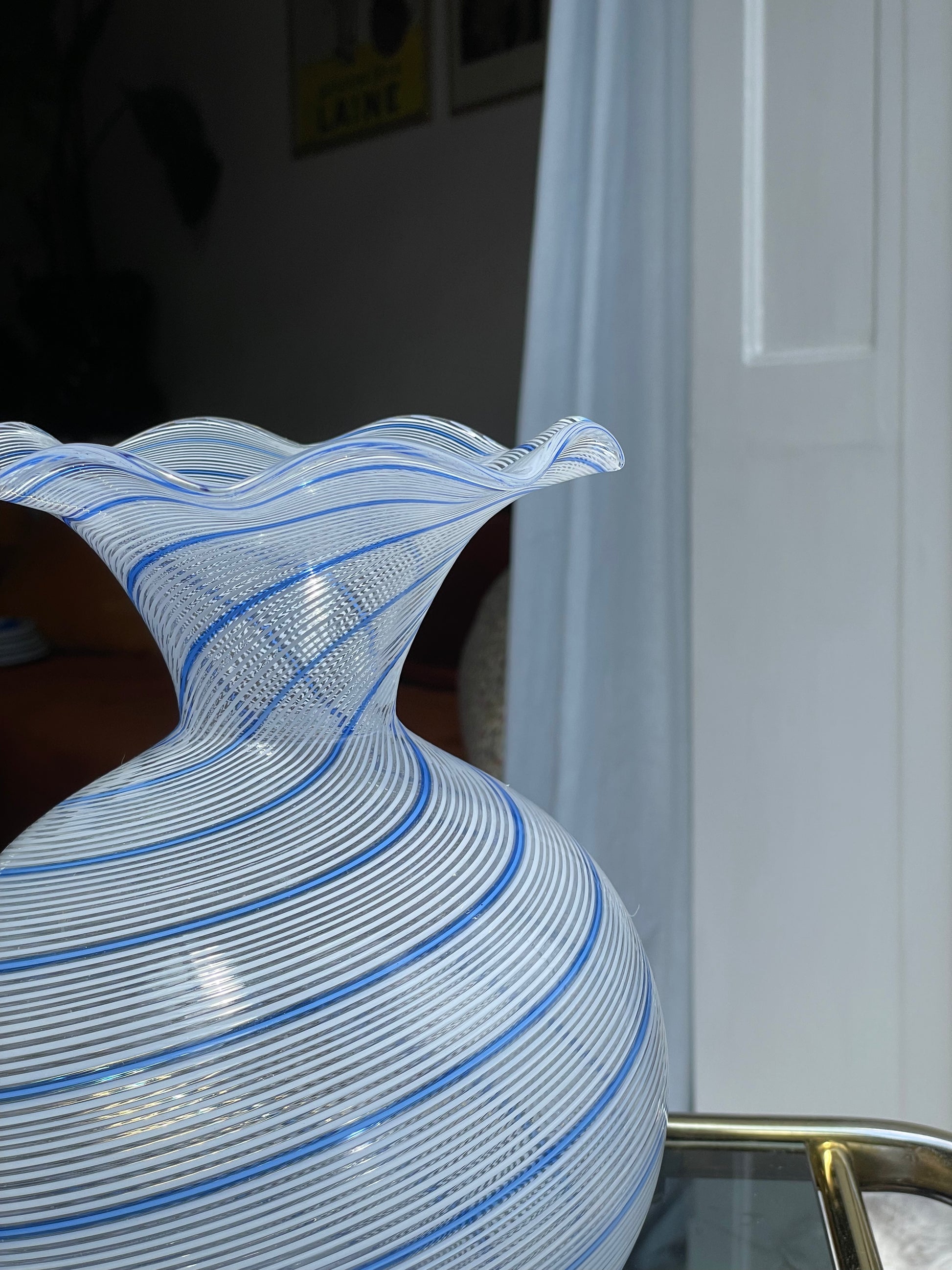 Stilren smuk vase af muranoglas lavet i teknikken der kaldes Filigrana og smuk bøglekant. Med et elegant og detaljeret mønster af hvidt og blåt swirl, måler den 25,5cm i højden og vil tilføje en fornem og tidløs elegance til ethvert rum. Pæn vintage stand uden skår.
