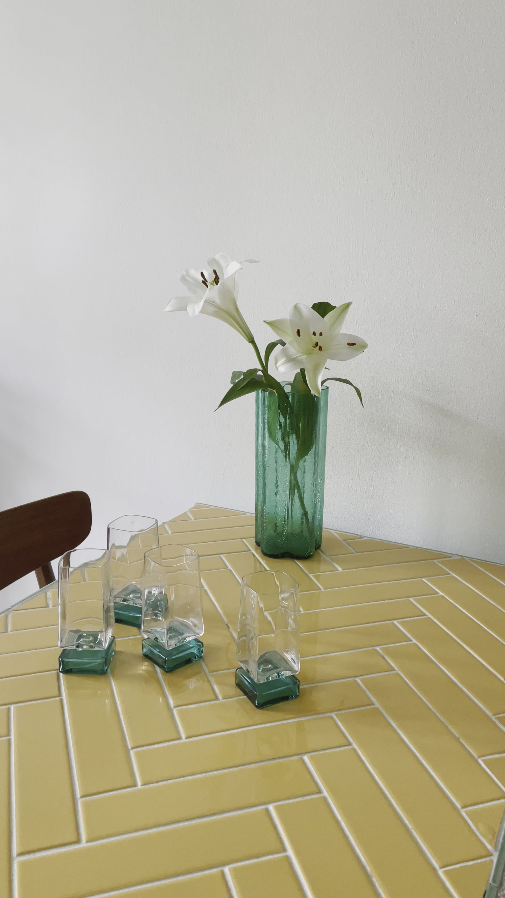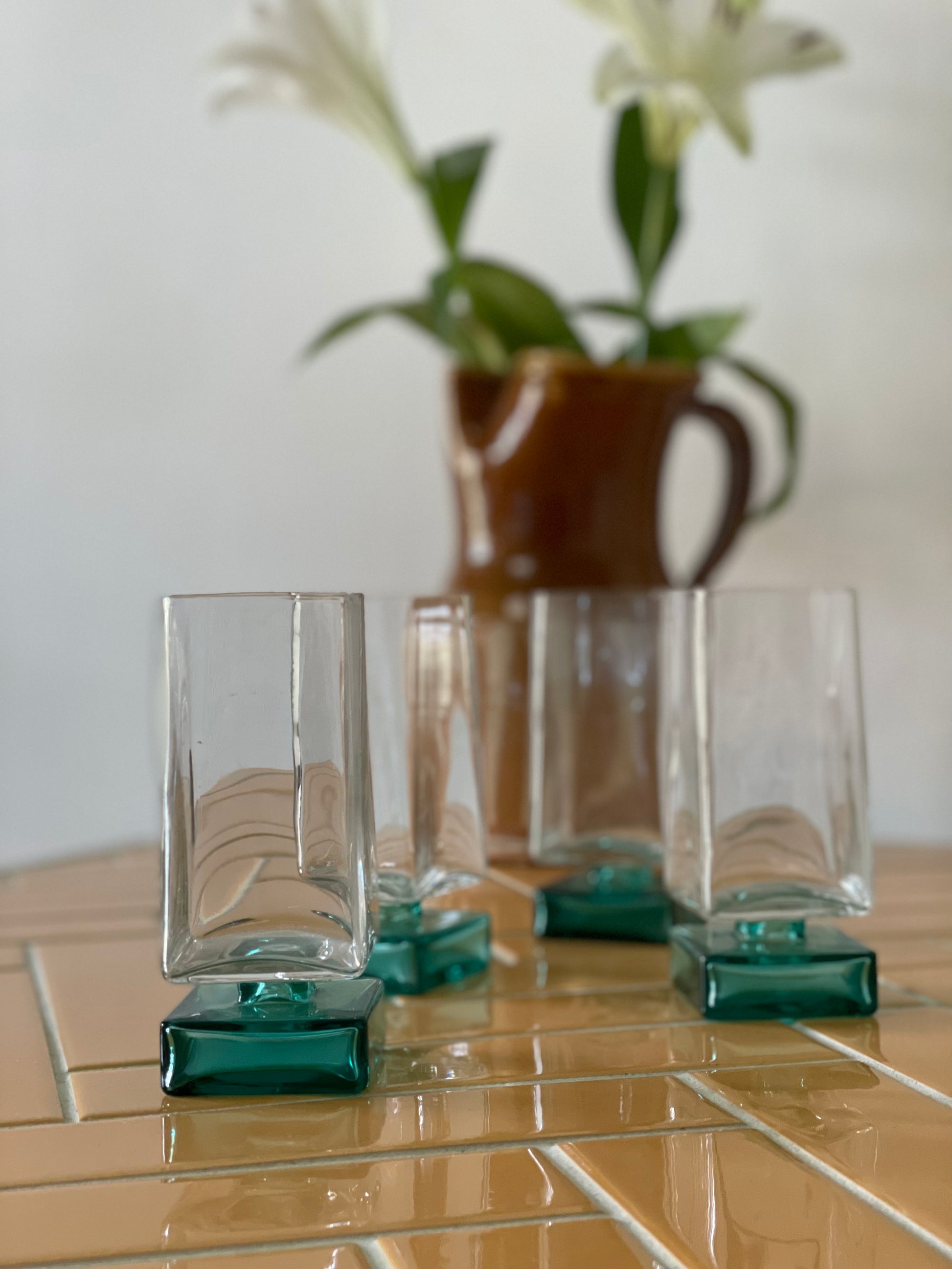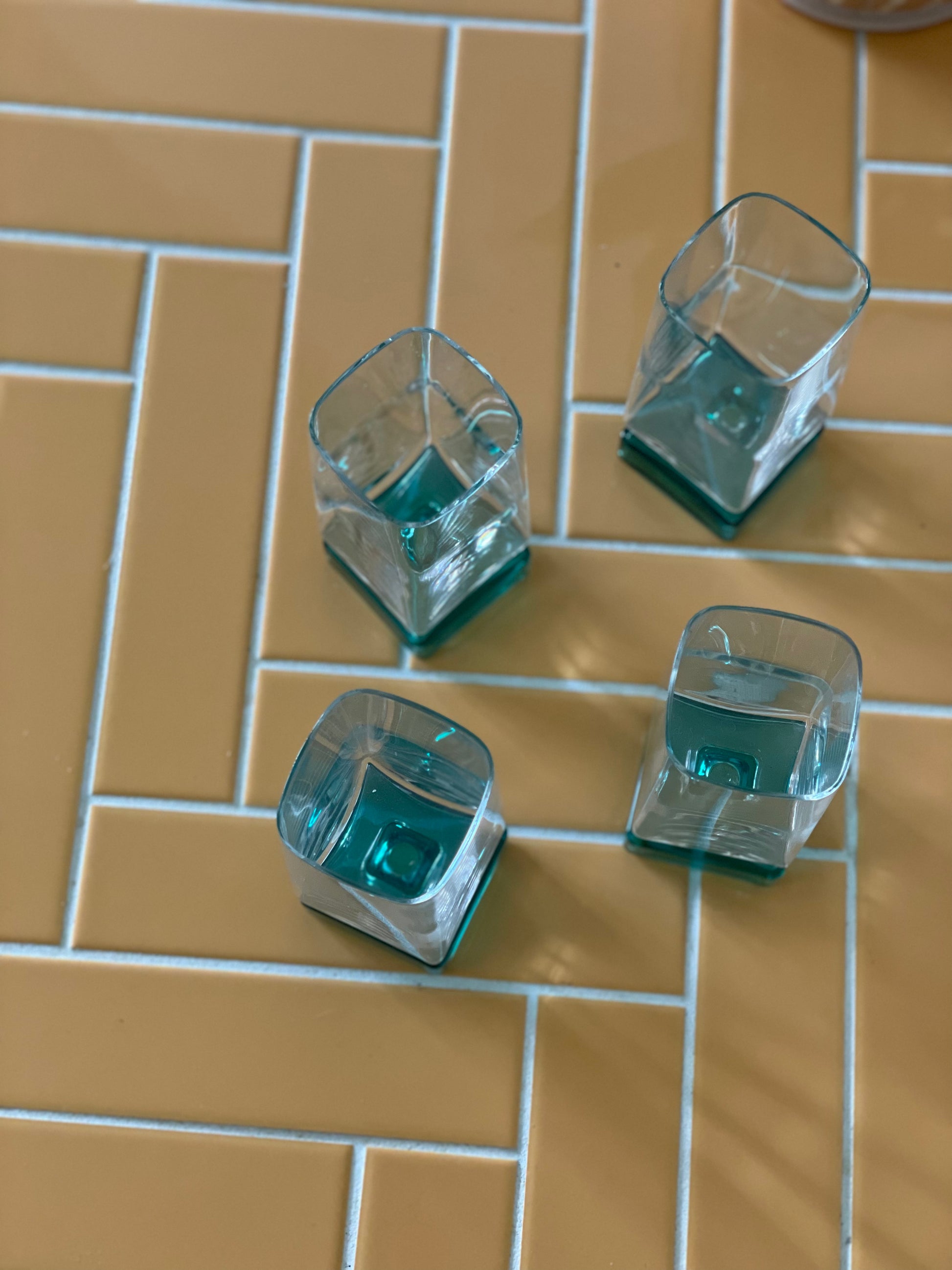 Enormt smukke og særegne glas fundet i Italien. Med deres firkantede form er de både lækre at se på samt at holde ved. Standen er exceptionel!