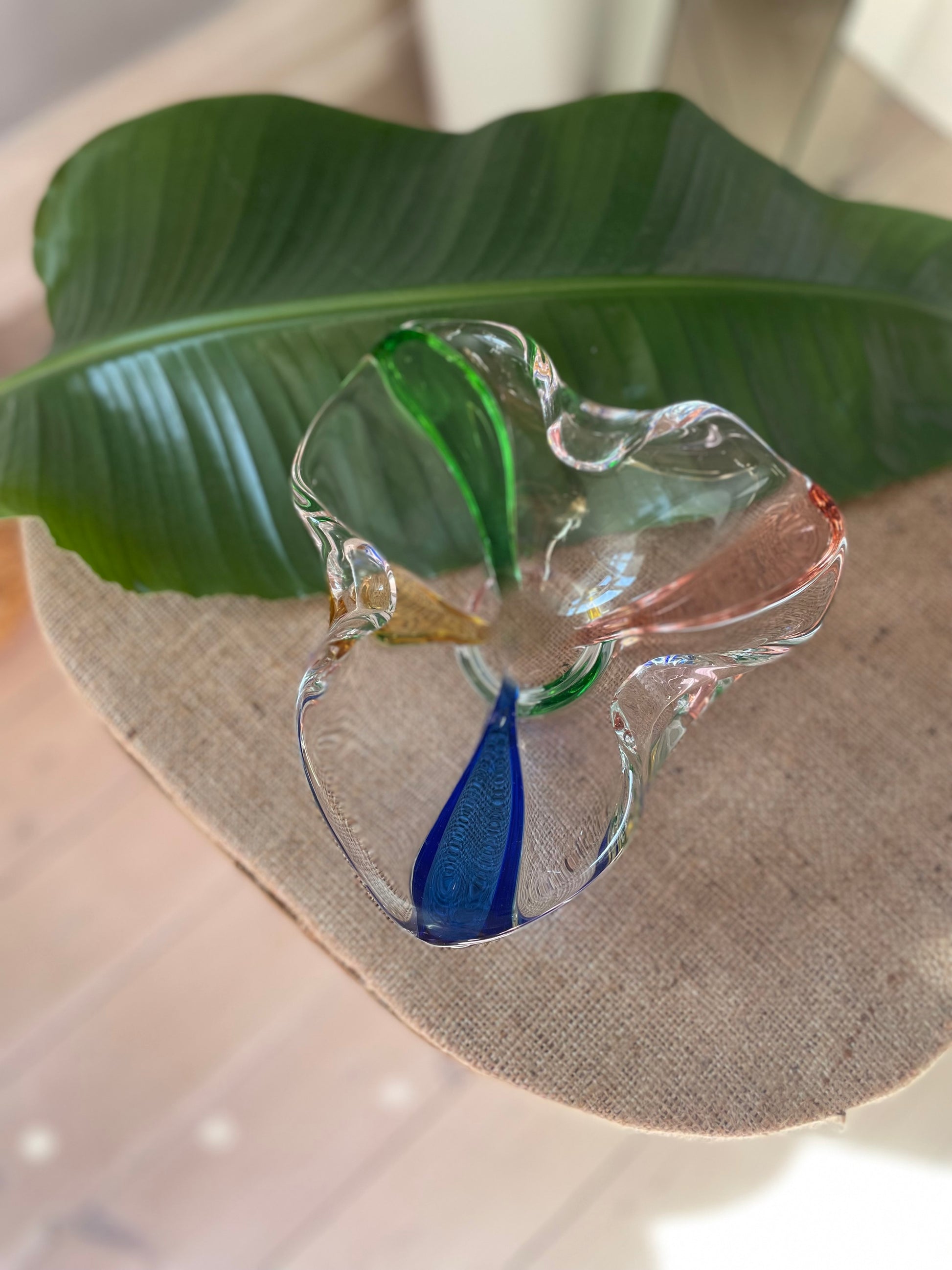 Absurd smuk glasskål fundet i Norge. Den er nærmest trekanten på en smallere fod og er i klart glas med striber af blå, grøn, gul og rød. Glasskålen måler 21cm i bredden og 8,5cm i højden.