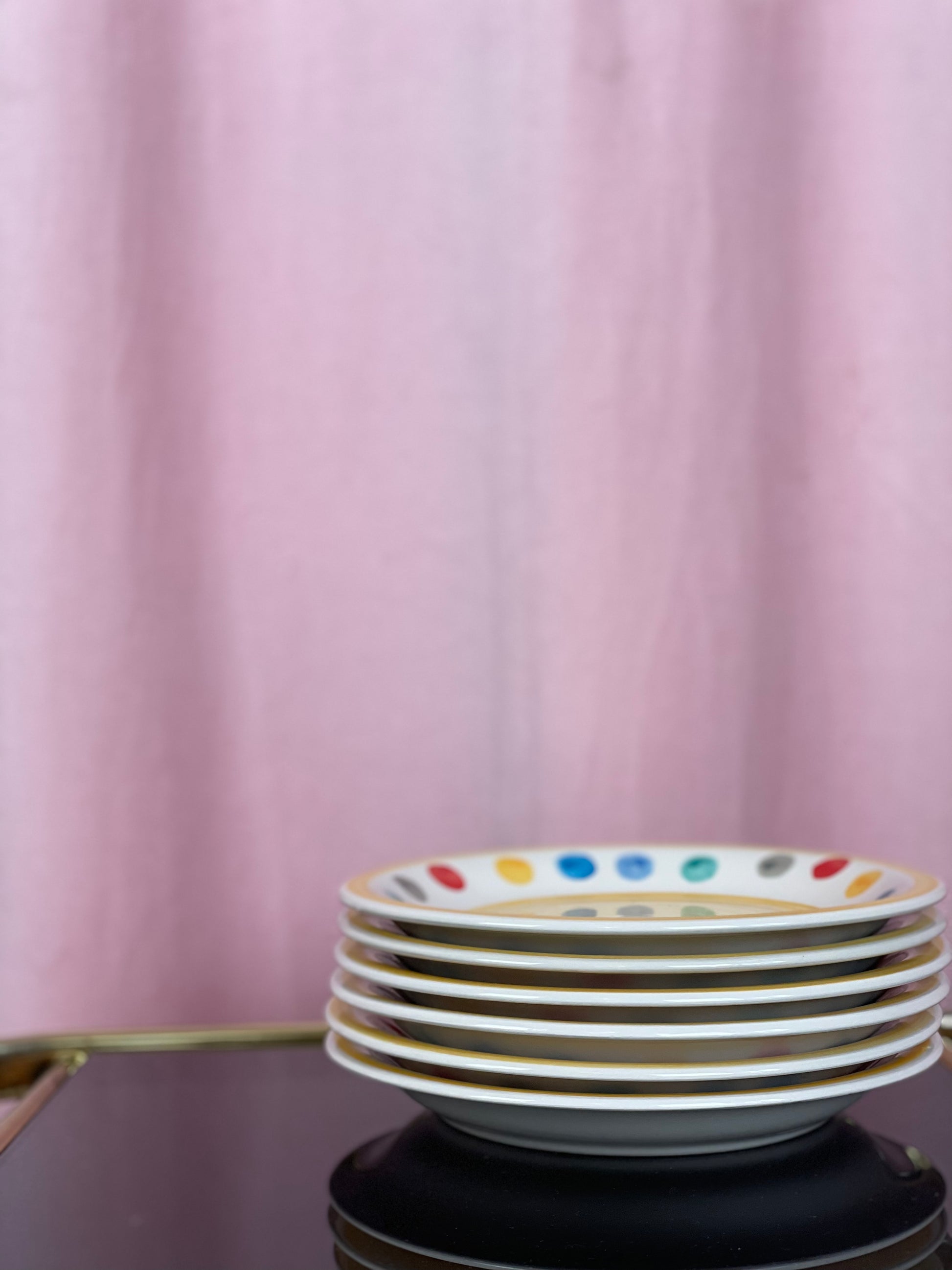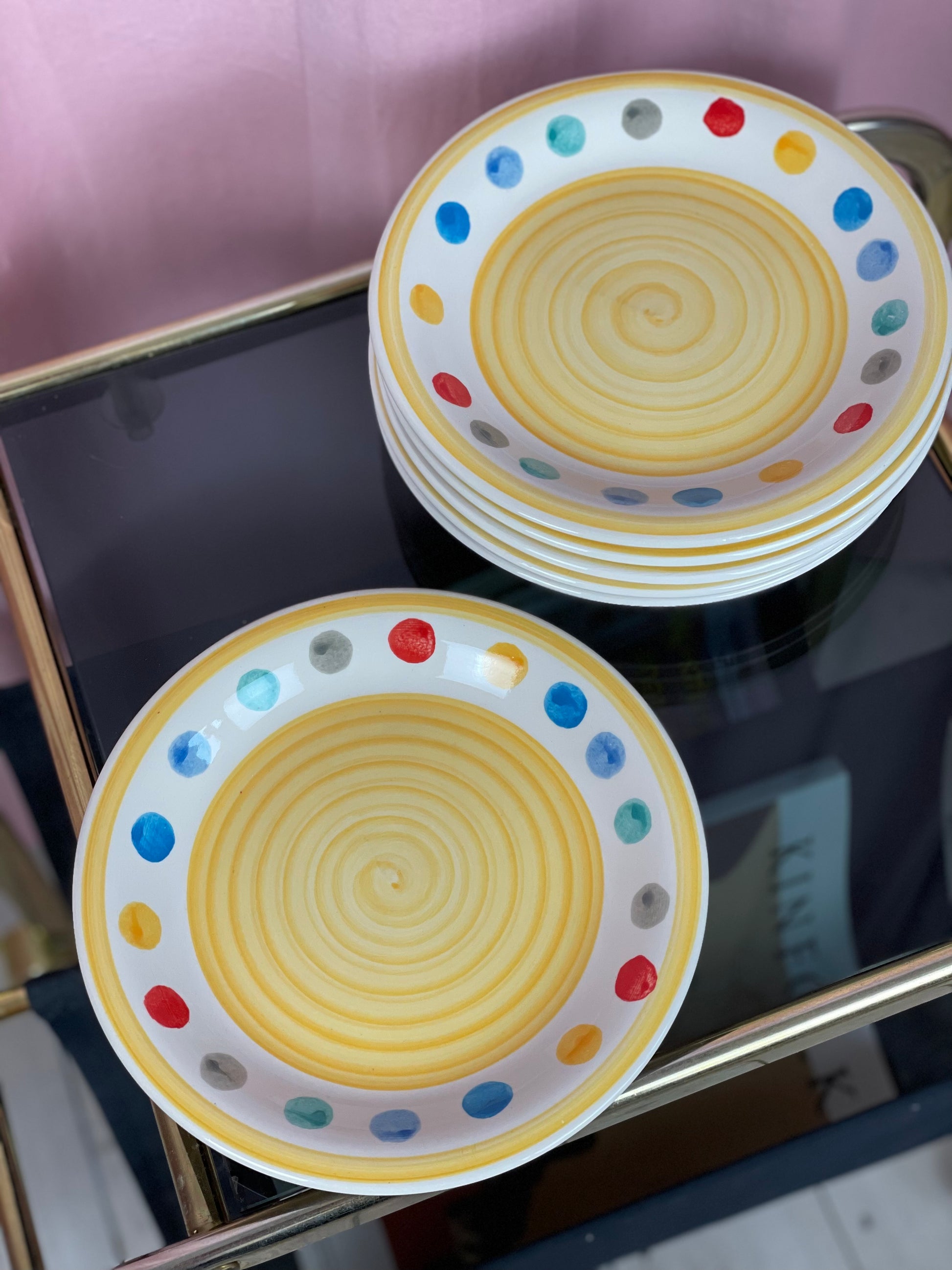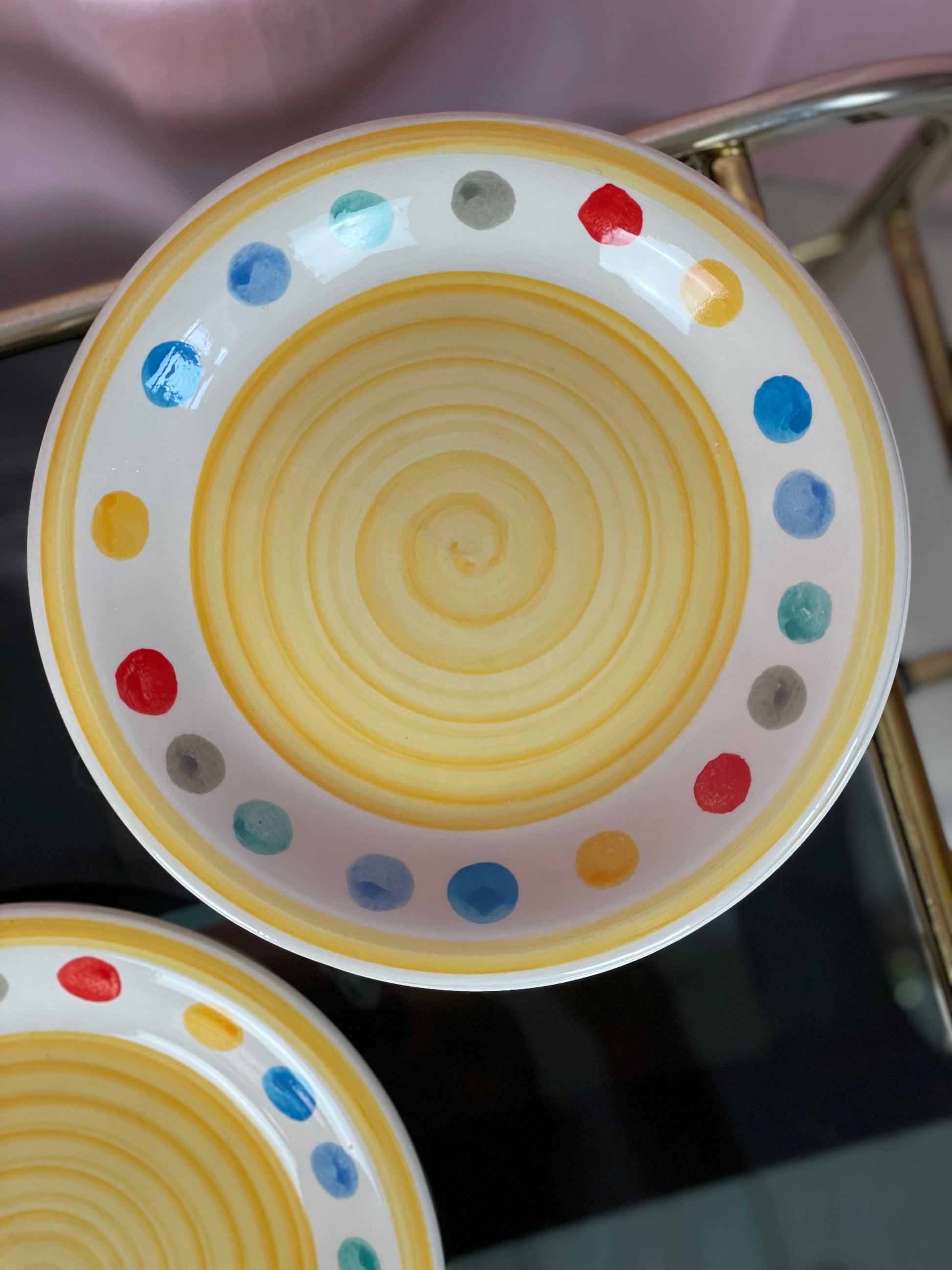 Smukke gule italienske frokosttallerkener med swirl og prikker langs kanten. Disse tallerkener er i rigtig flot stand og måler 19,5cm i diameter. Sælges stykvis