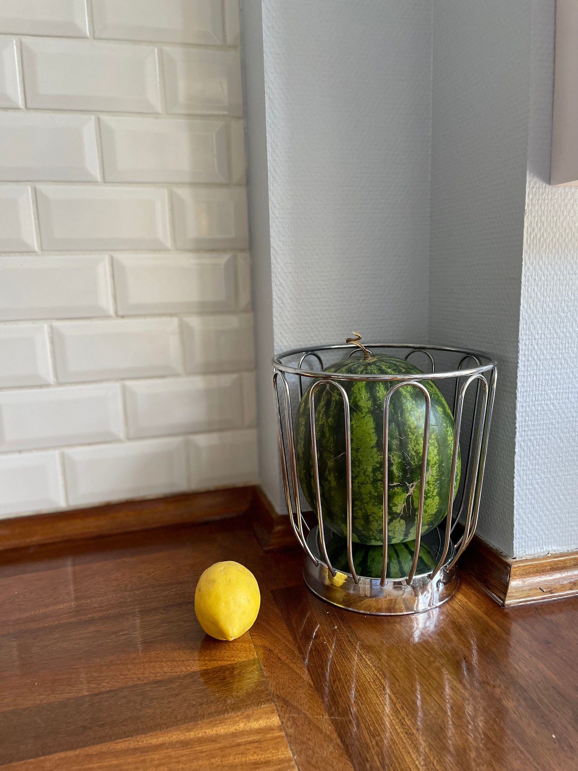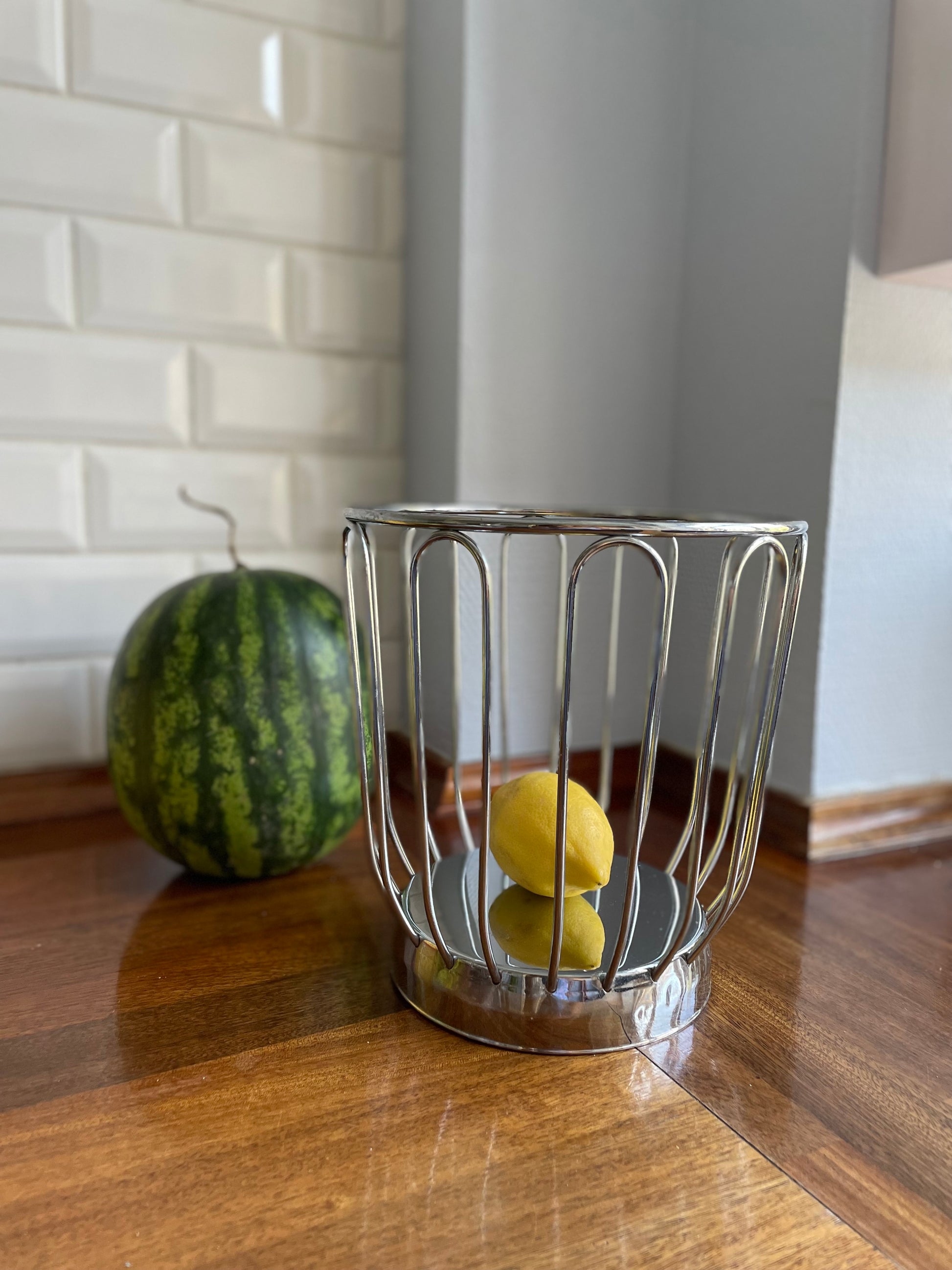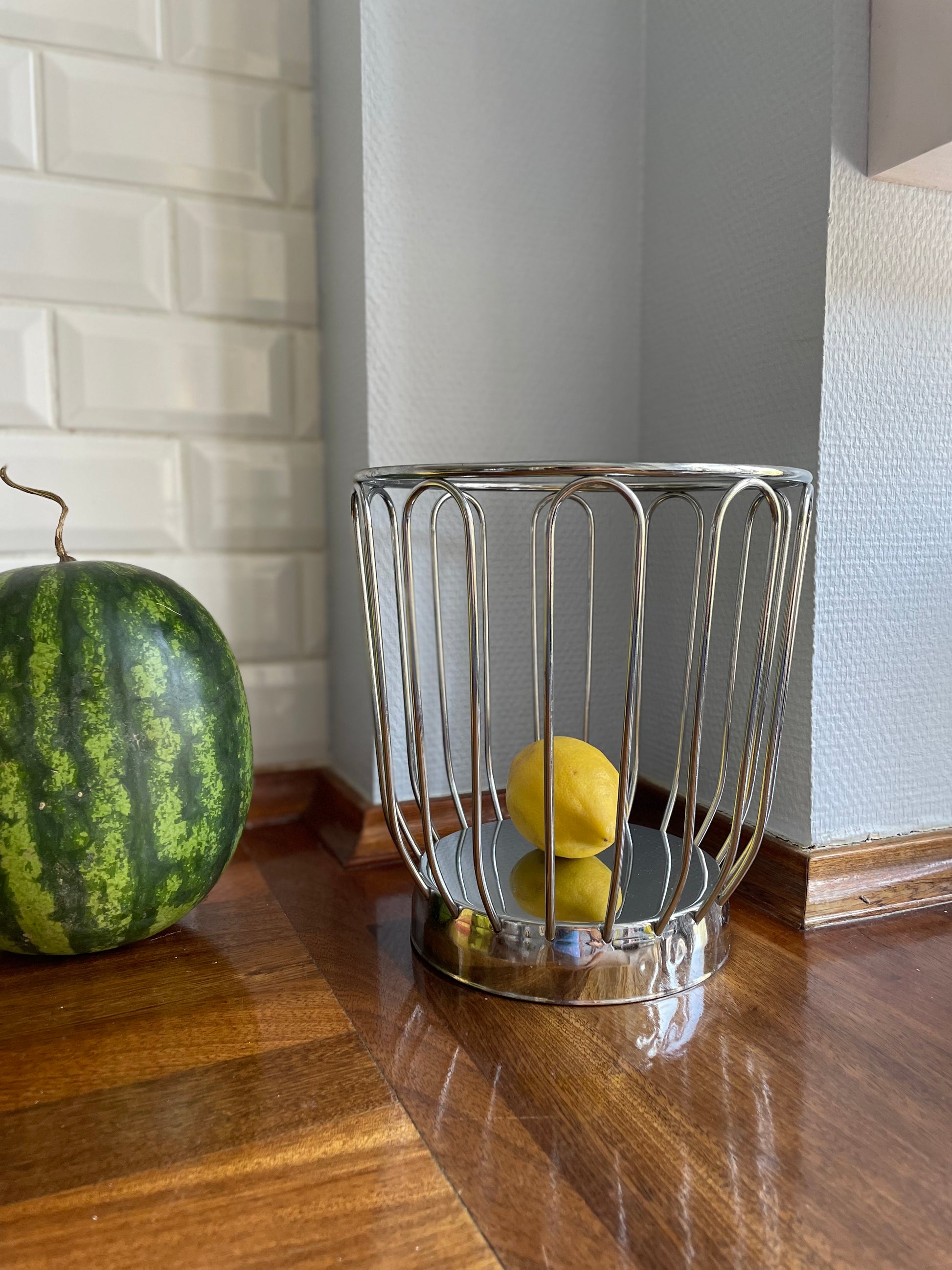 Lækker kurv til frugt eller andet på køkkenbordet i den fineste krom. Skålen er 24cm høj og 22cm bred.