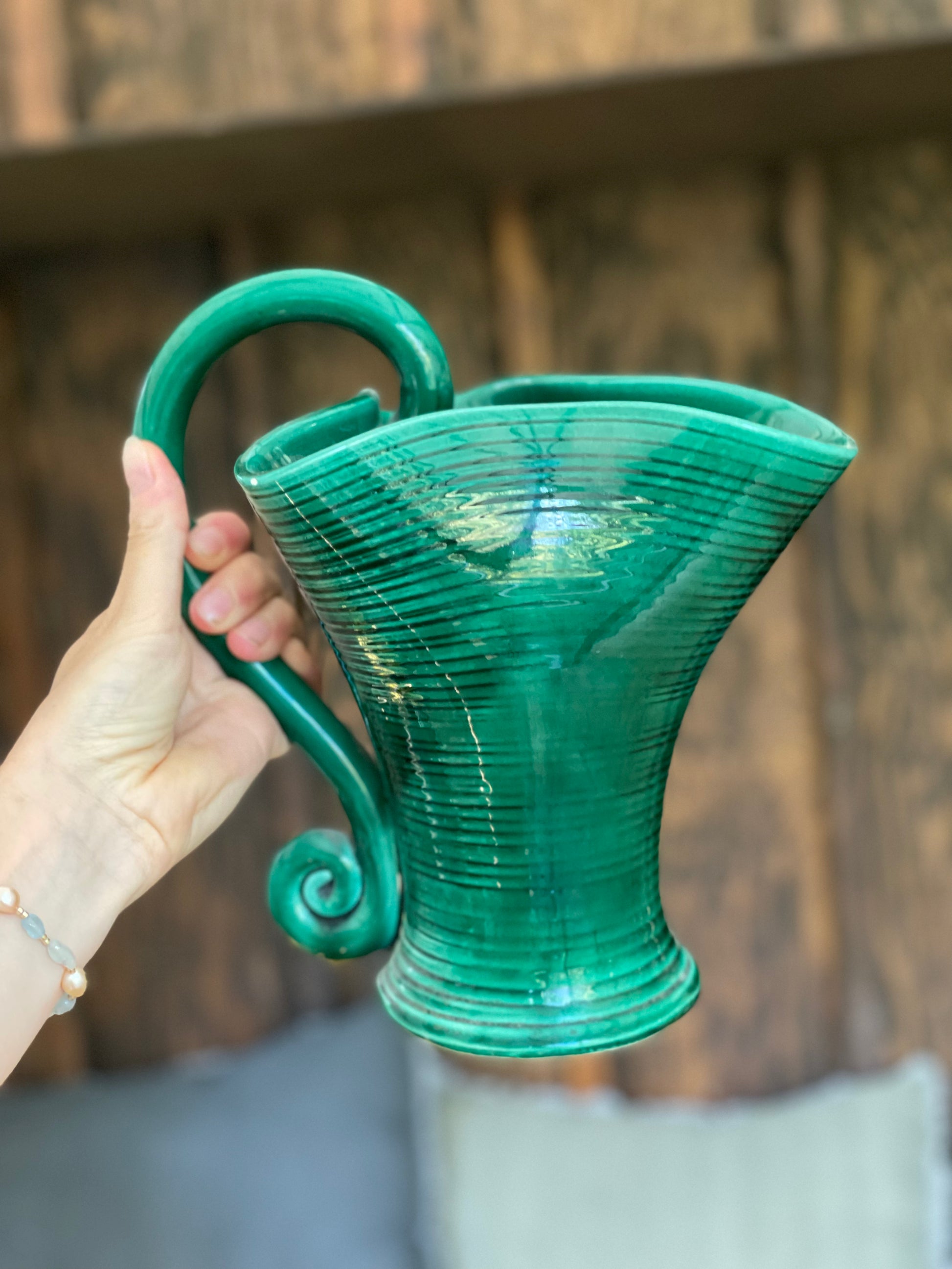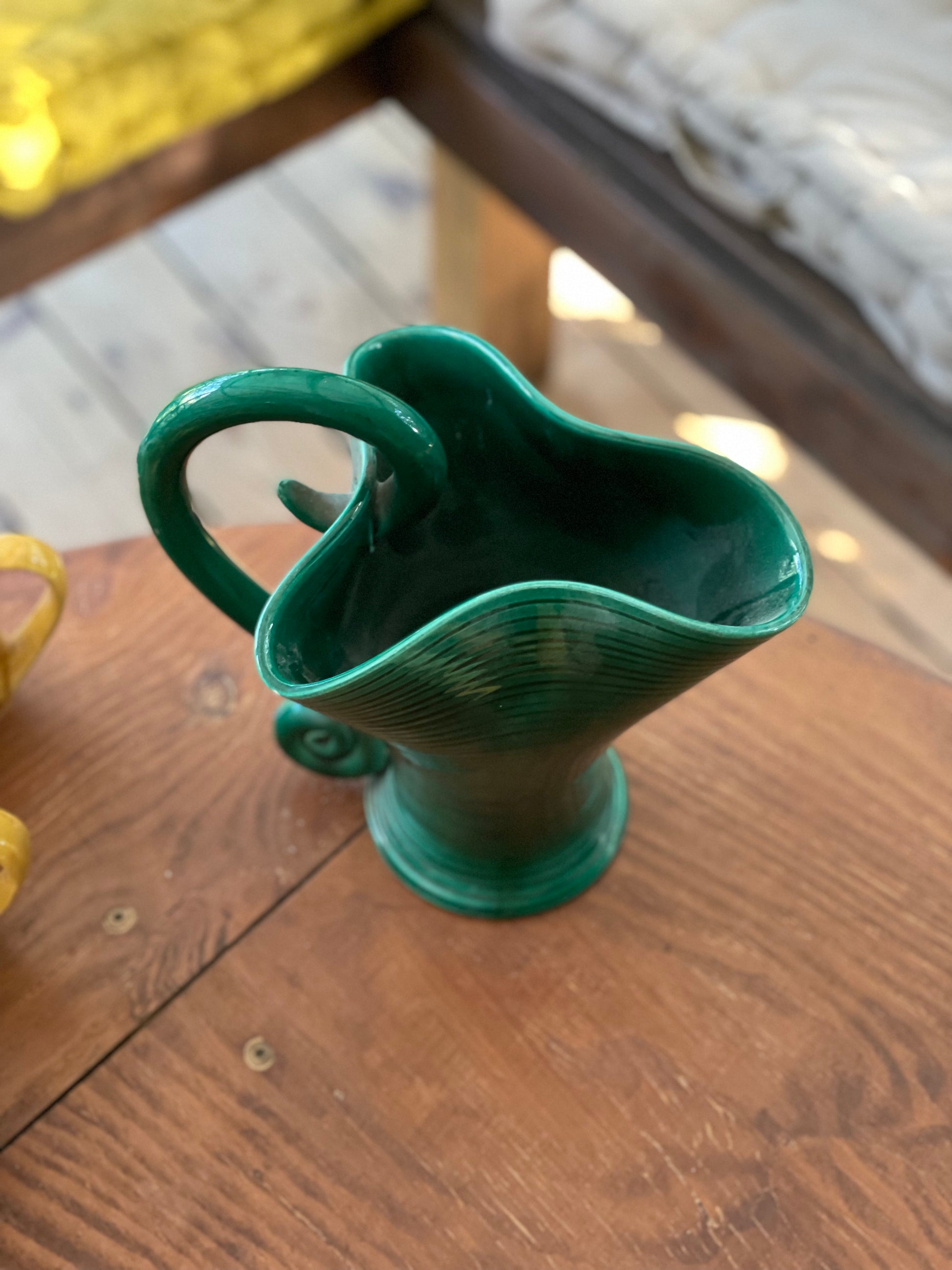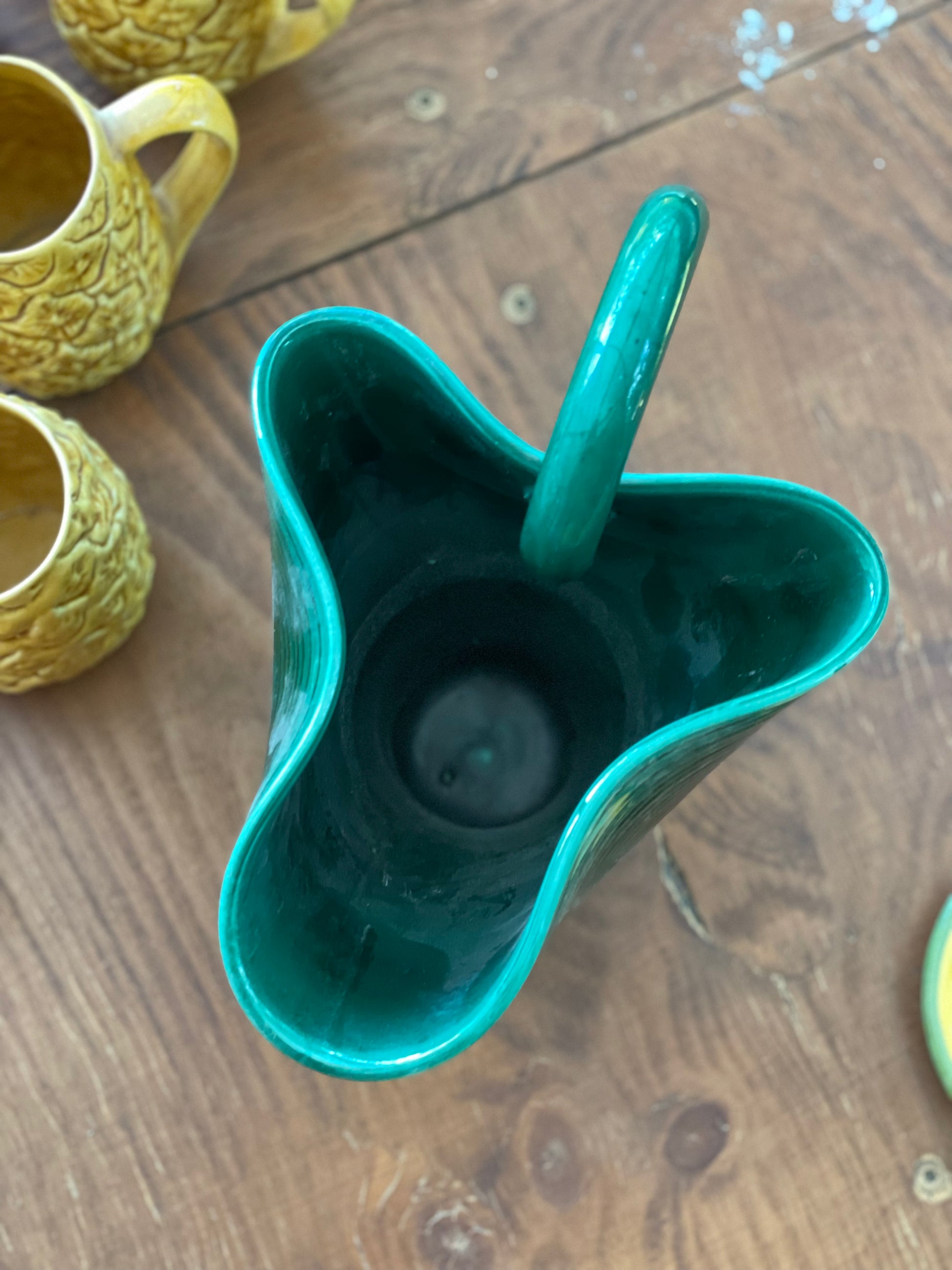 Absurd smuk kande i skinnende grøn glasur med formelig snoet hank og riller i glasuren. Kanden er ikke mærket, men minder os neget om vores franske grønne Sarreguemines fiskeservice. Den er dog umiddelbart lavet i stentøj.