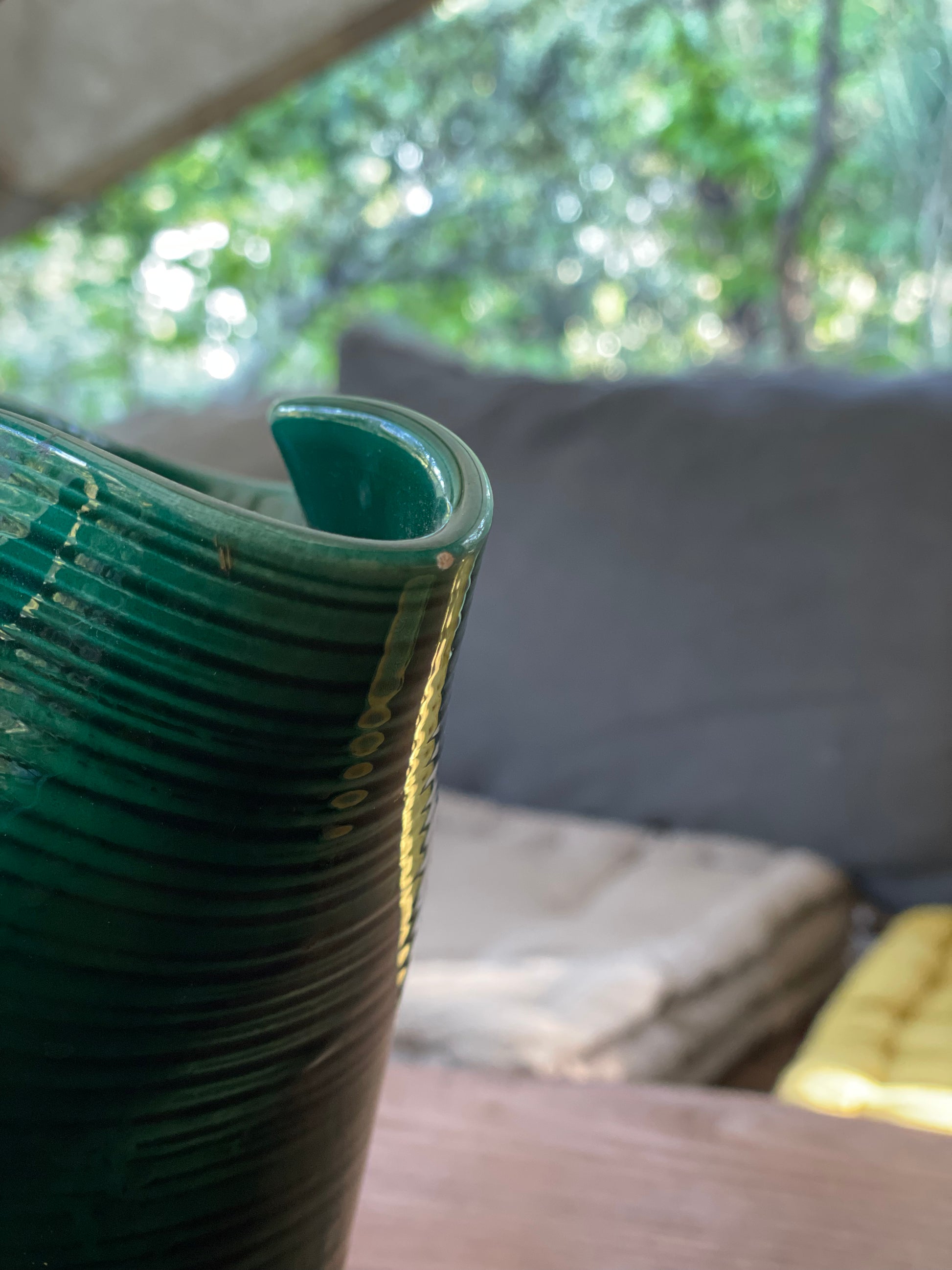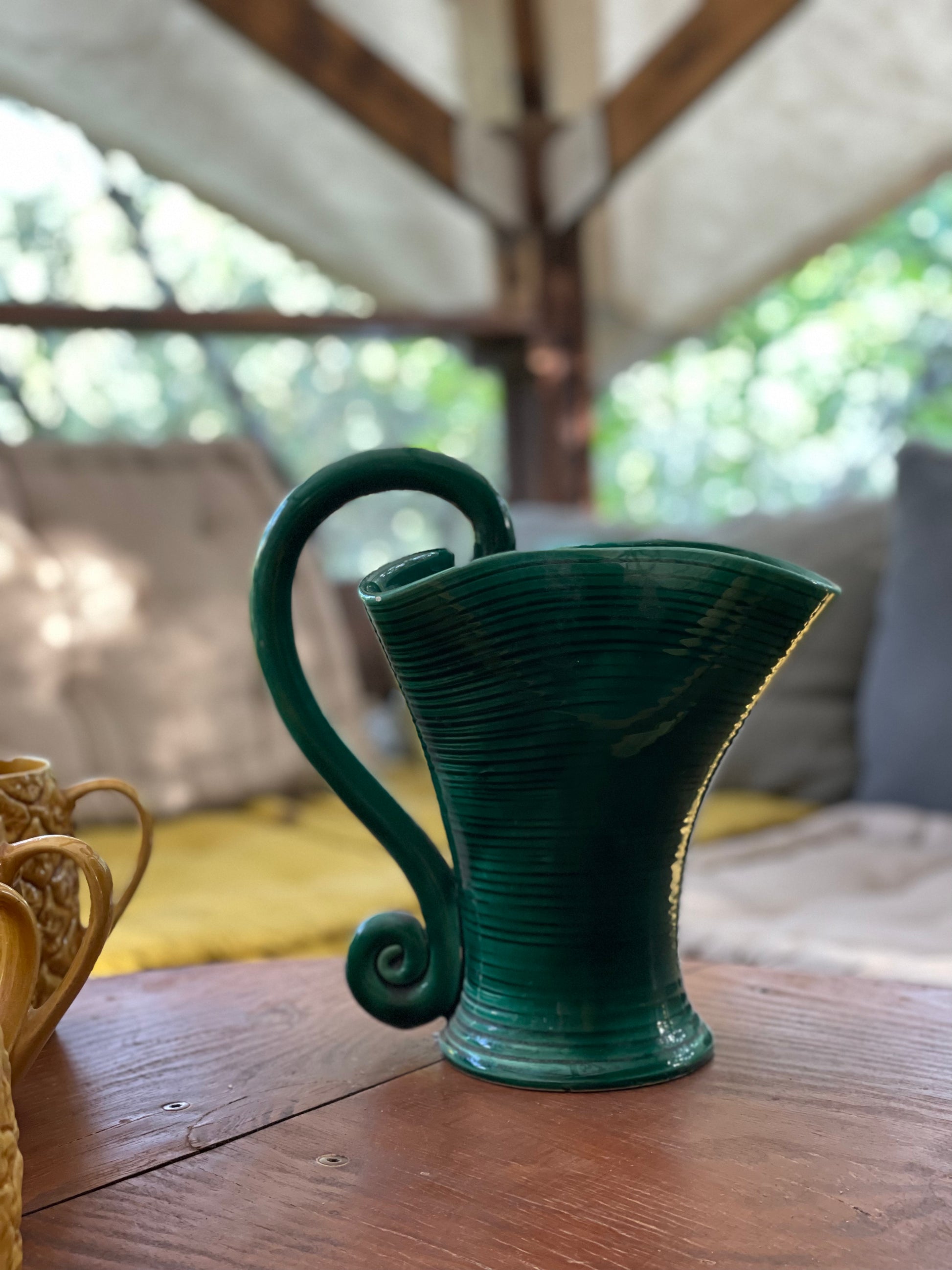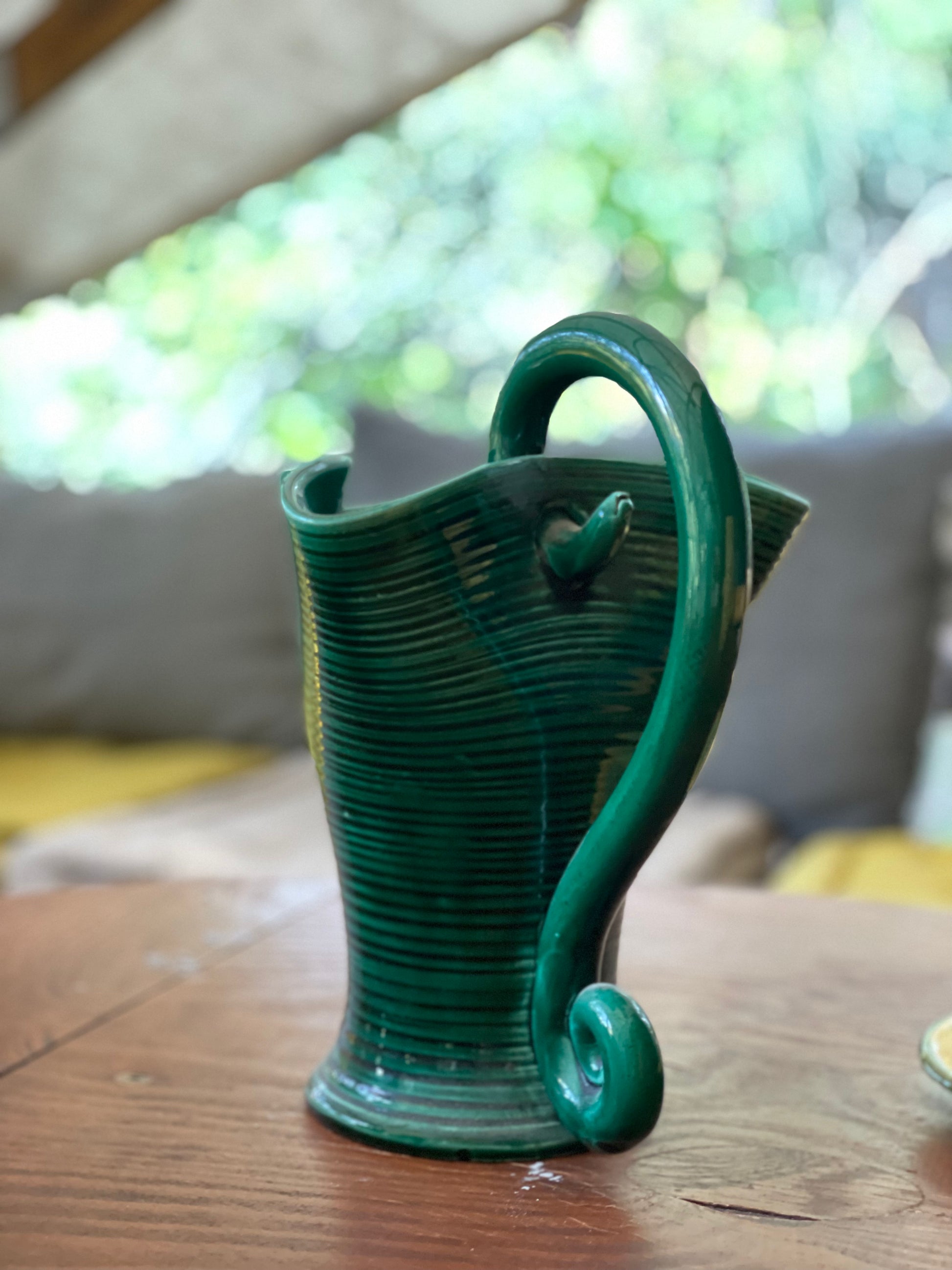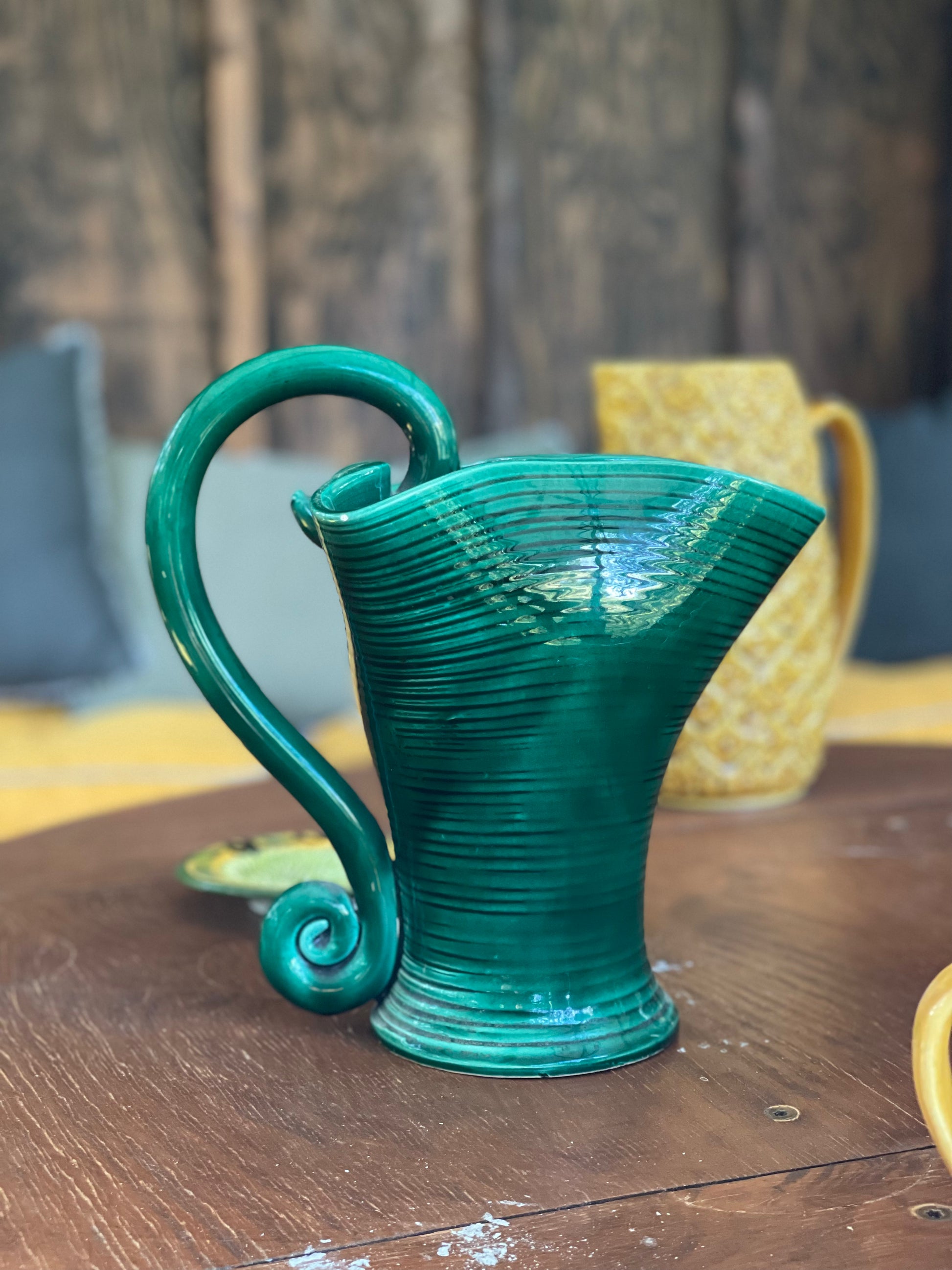 Absurd smuk kande i skinnende grøn glasur med formelig snoet hank og riller i glasuren. Kanden er ikke mærket, men minder os neget om vores franske grønne Sarreguemines fiskeservice. Den er dog umiddelbart lavet i stentøj.