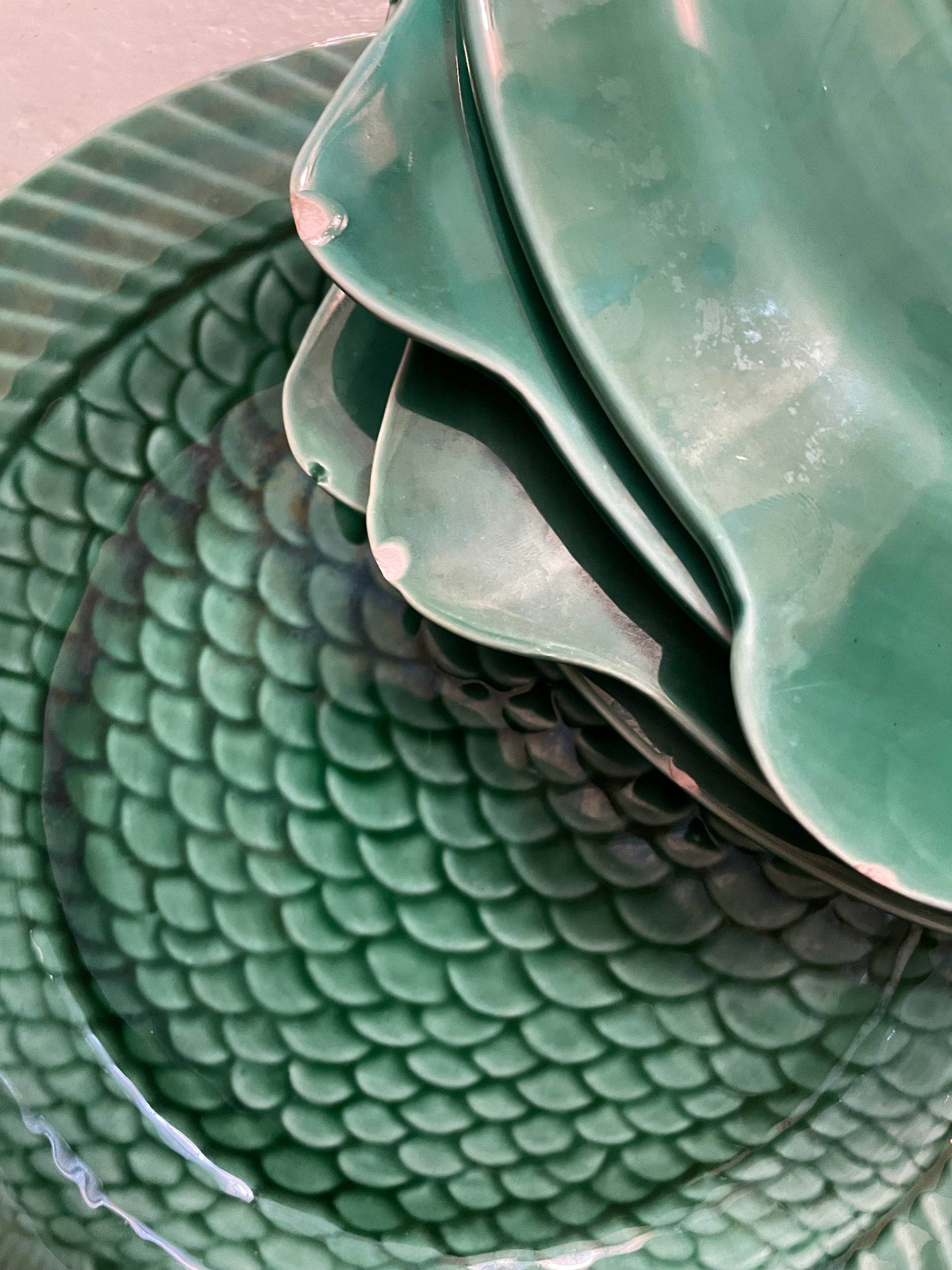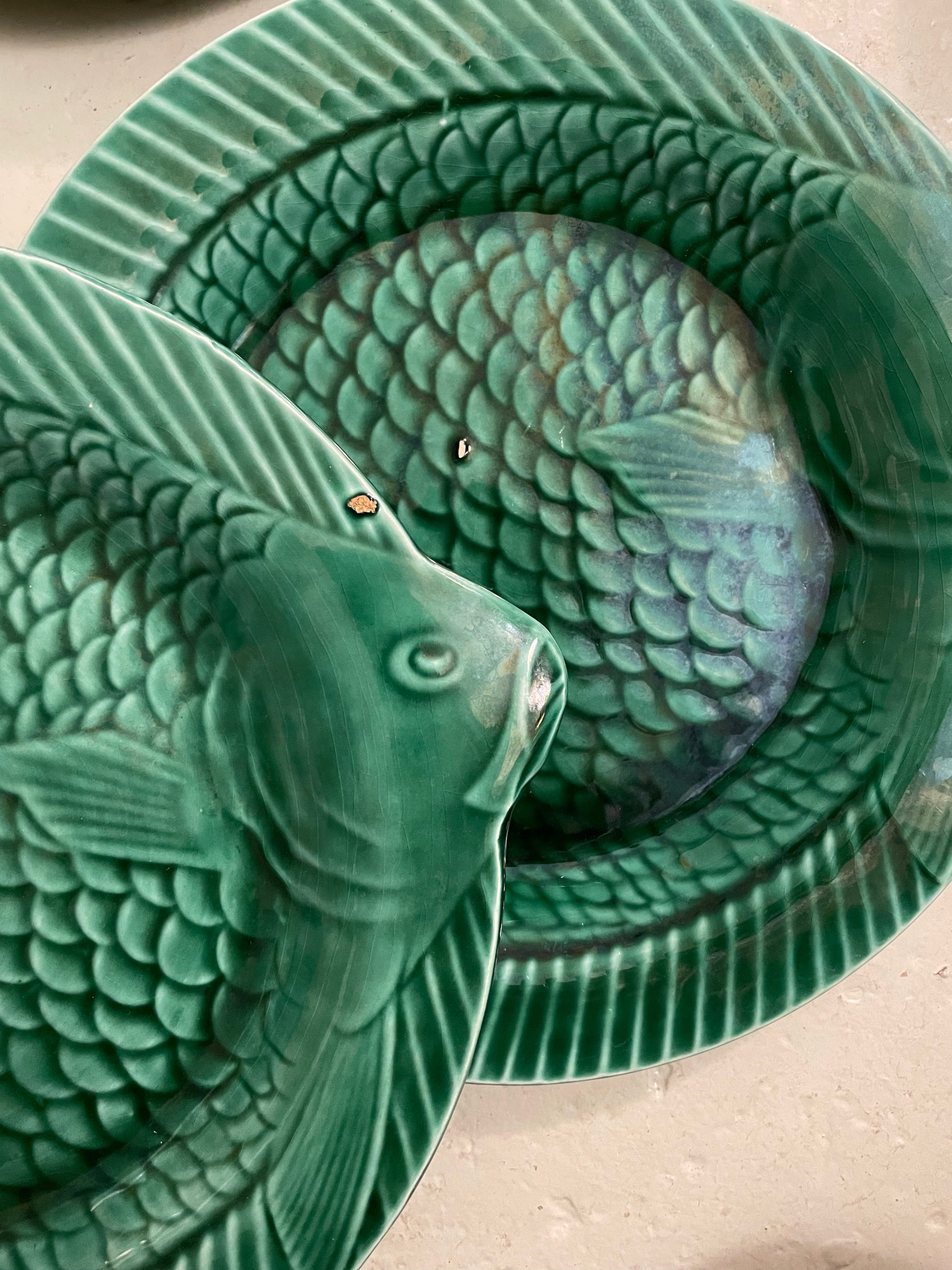 Disse smukke grønne fisketallerkener fra Sarreguemines har du måske set i vores egen private samling på Instagram - de er også en genganger her hos Farveladeland. Tallerkenen måler 27,5cm i diameter fra hale til mund.