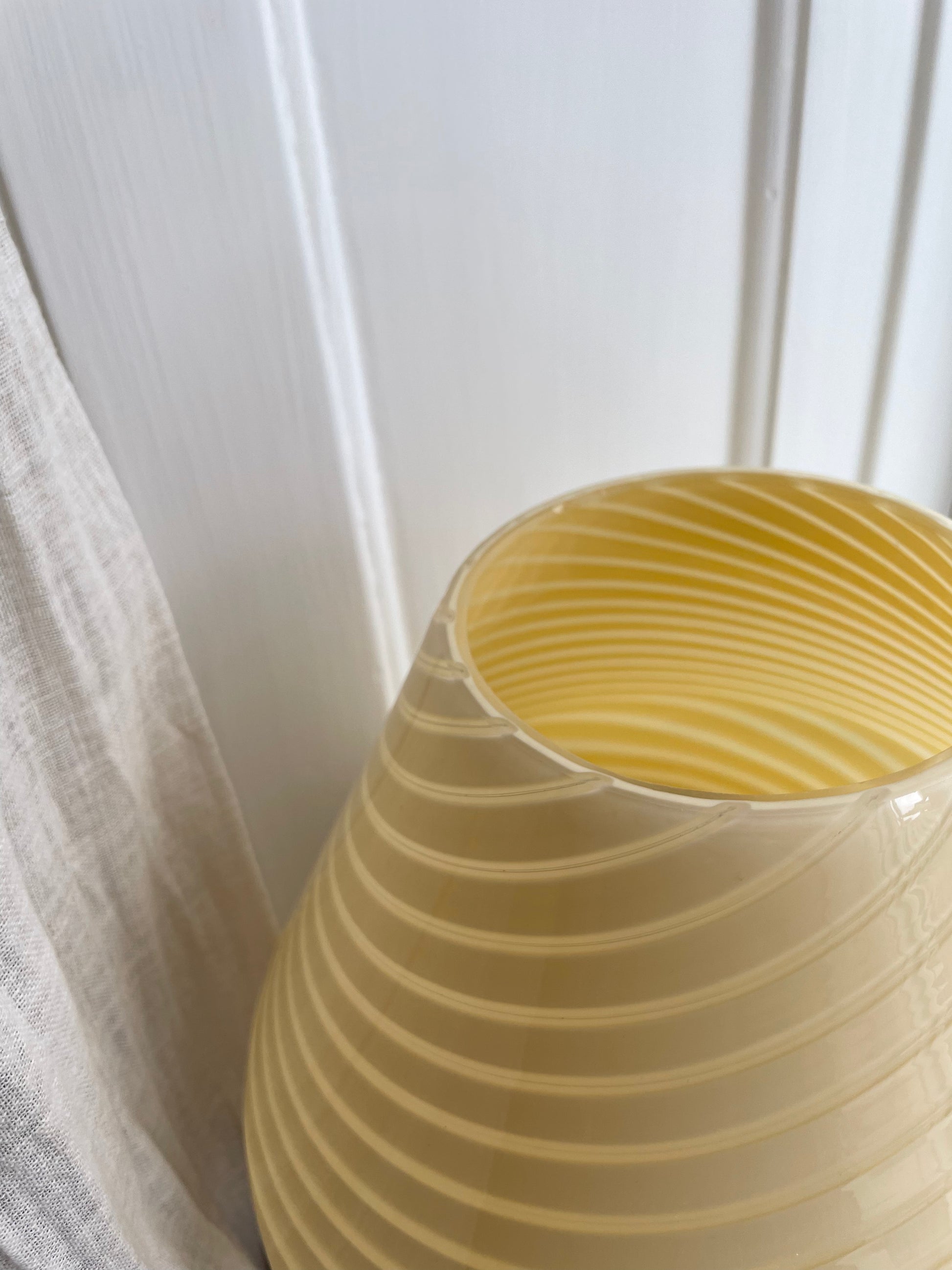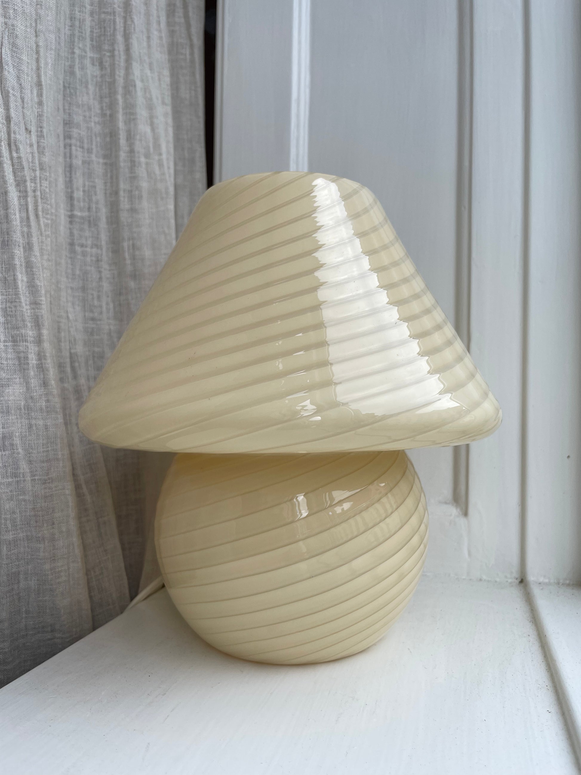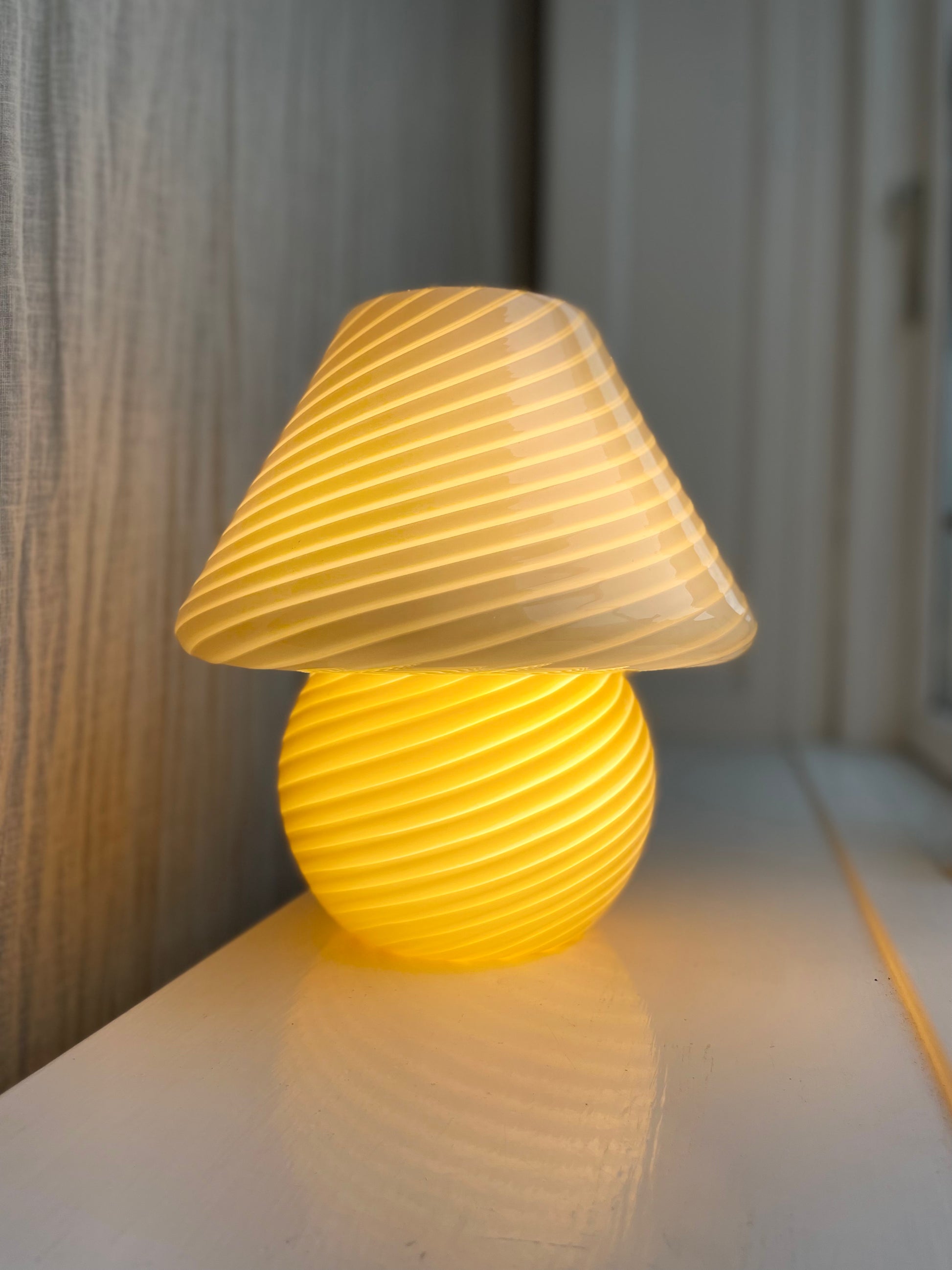 Denne fine gule vintage Murano mushroom swirl lampe er 26cm høj og kommer med en enkelt E27 fatning. Perfekt som både sengelampe eller skrivebordslampe.
