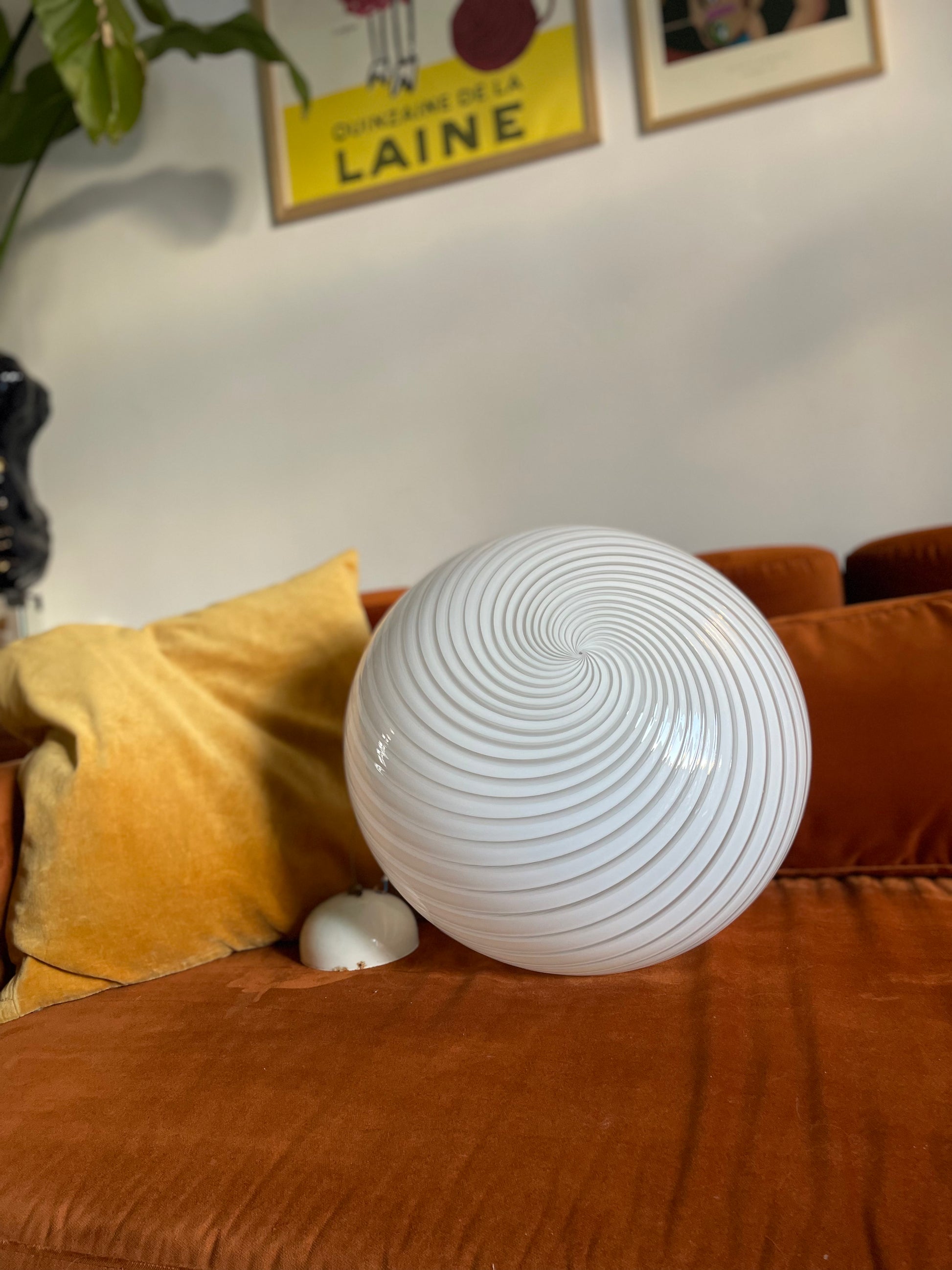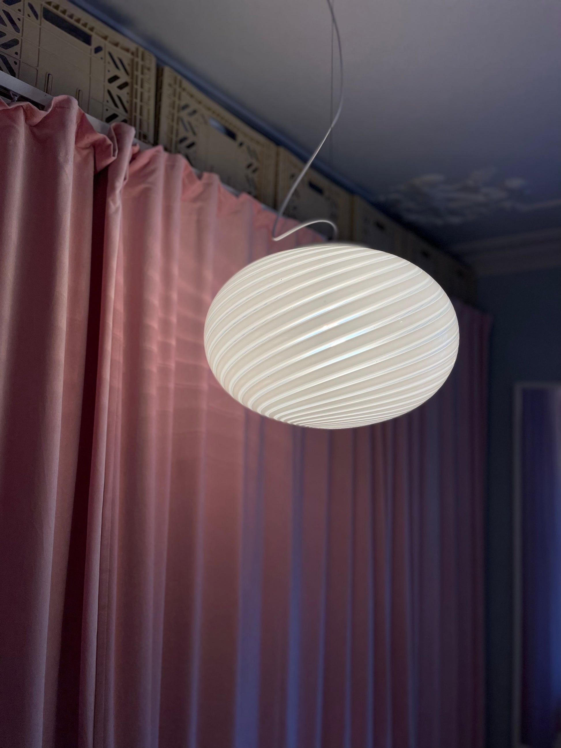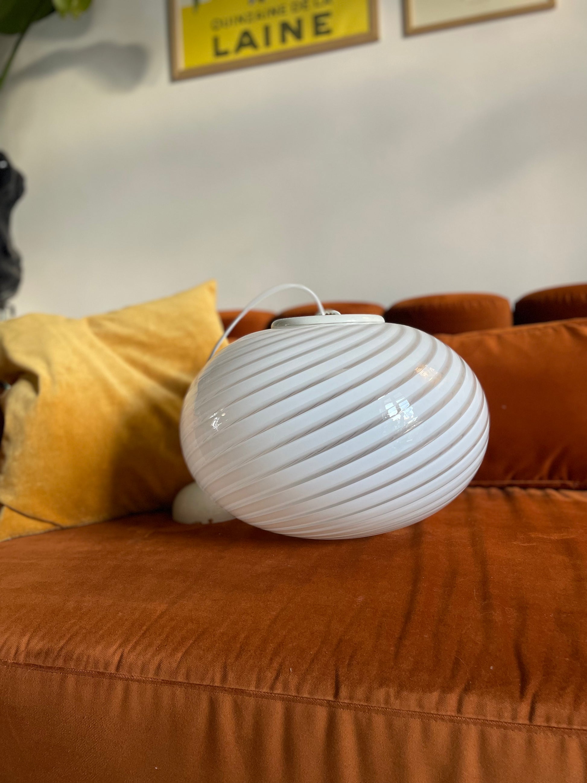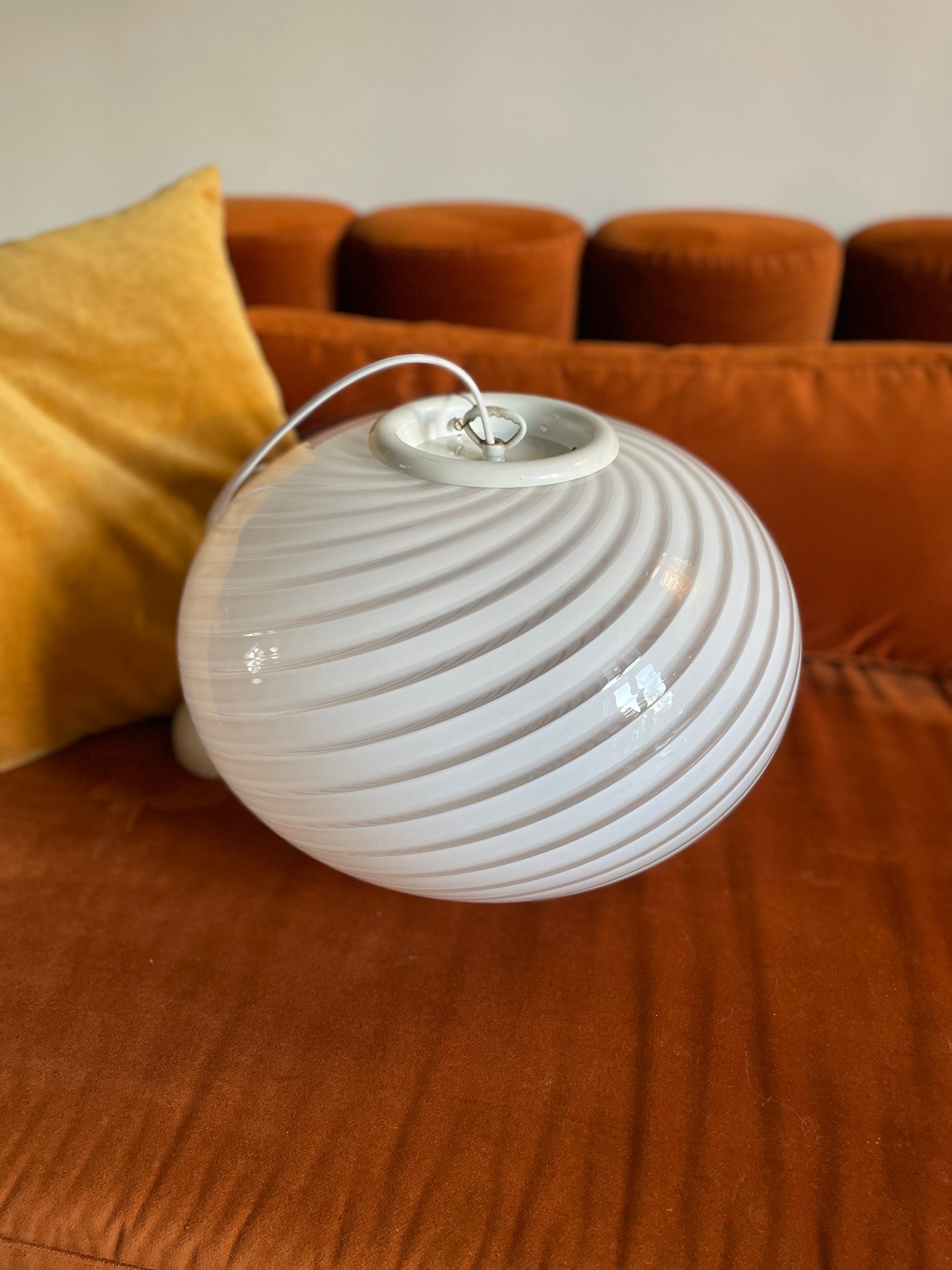 Smuk vintage Murano pendel på 40cm med hvidt gennemsigtigt swirl. Lampen er oval og måler 32cm i højden. Lampen står i rigtig fin stand og kommer med et hvidt greb. Den bruger desuden en enkelt E27 pære.