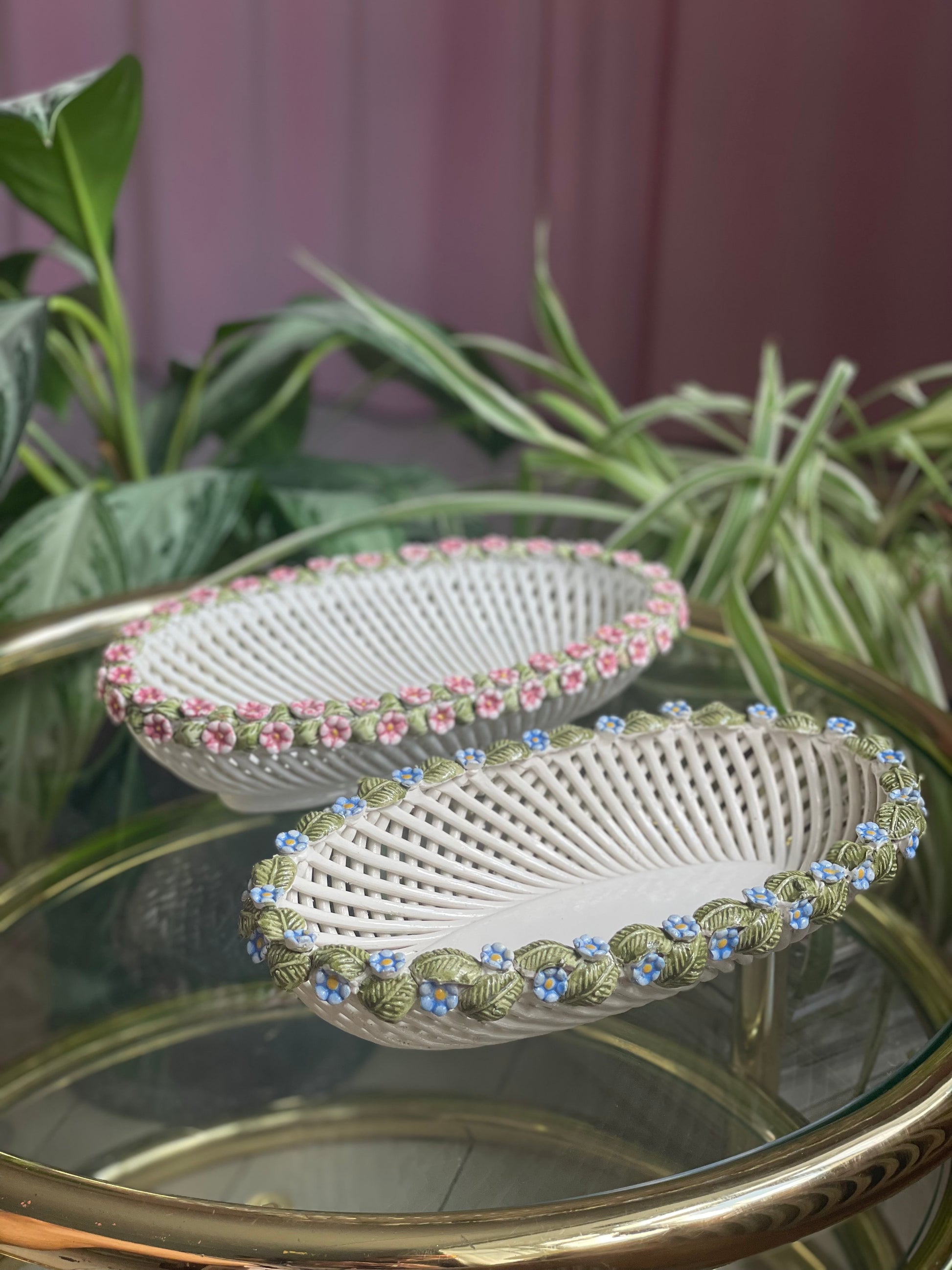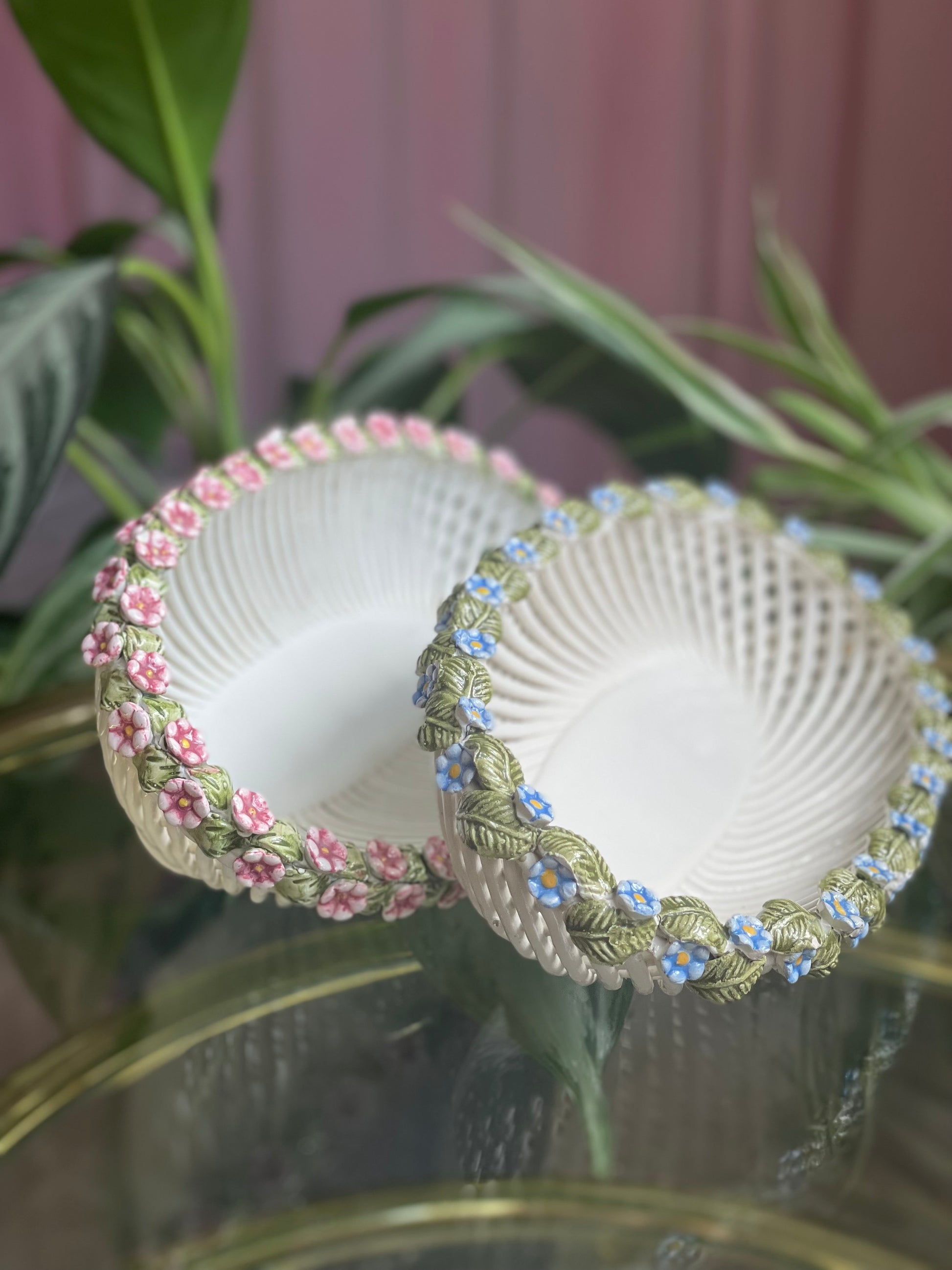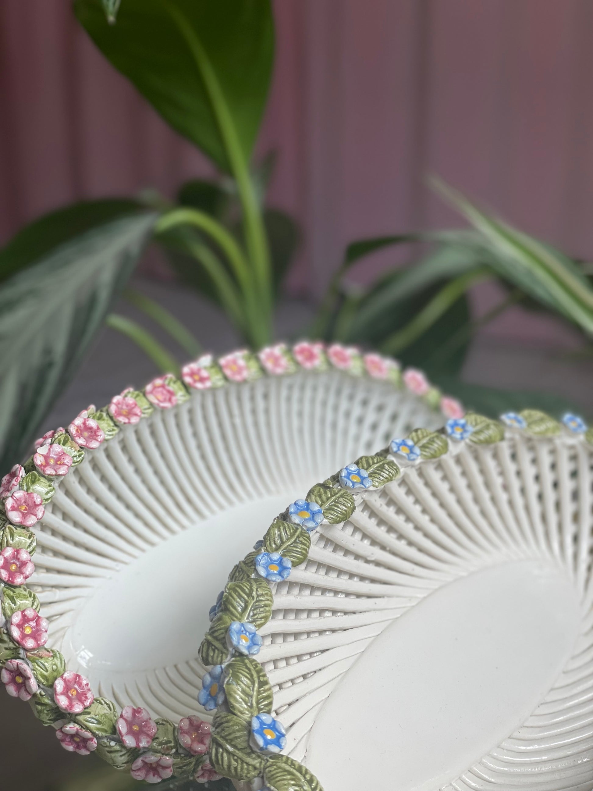 Vi har søgt Italien tynd efter disse sjældne keramikkurve. Håndværket er exceptionelt og standen på dem ligeså. Vælg mellem kurv med lyserøde blomster og kurv med blå blomster. De sælges stykvis.