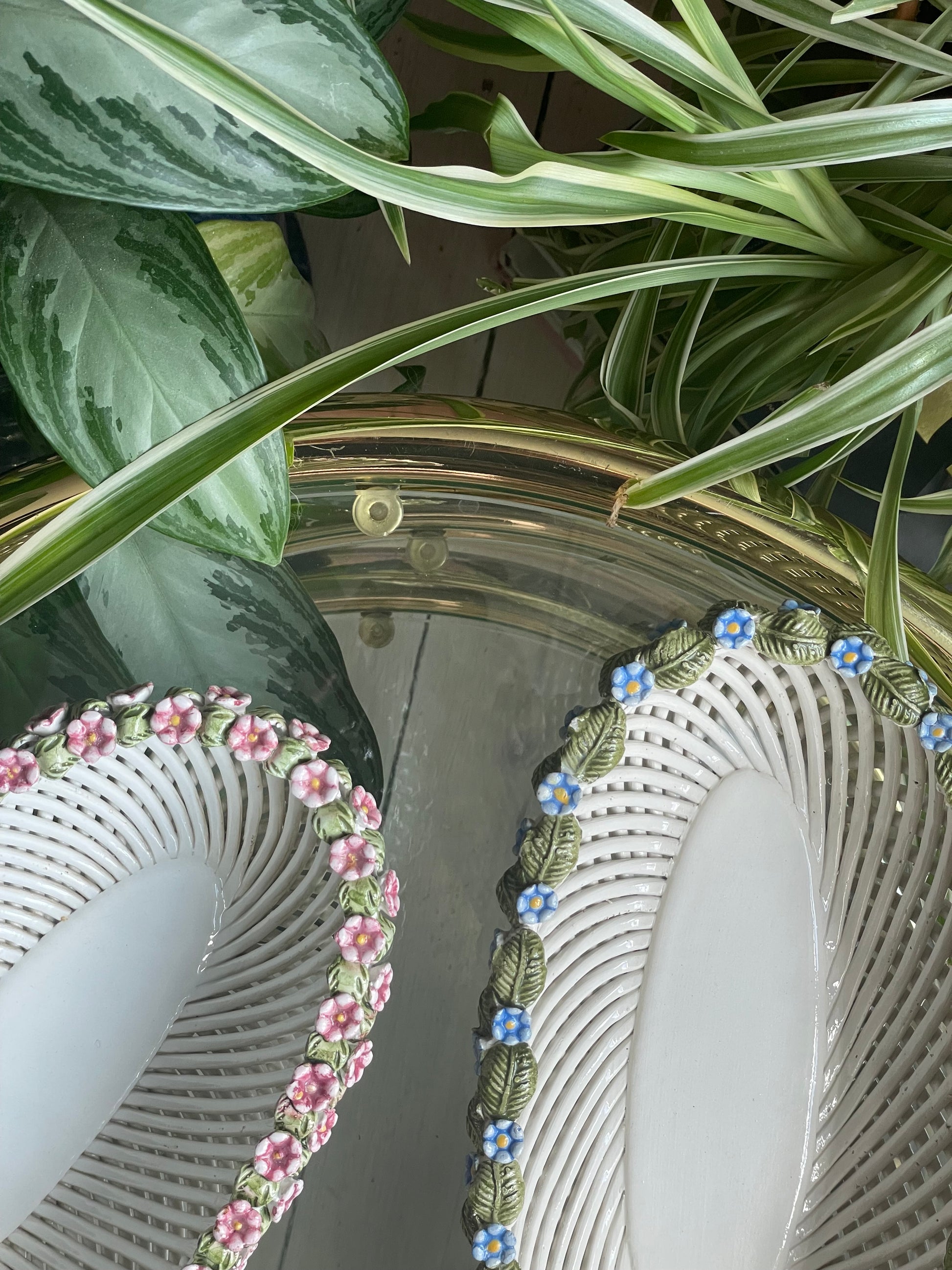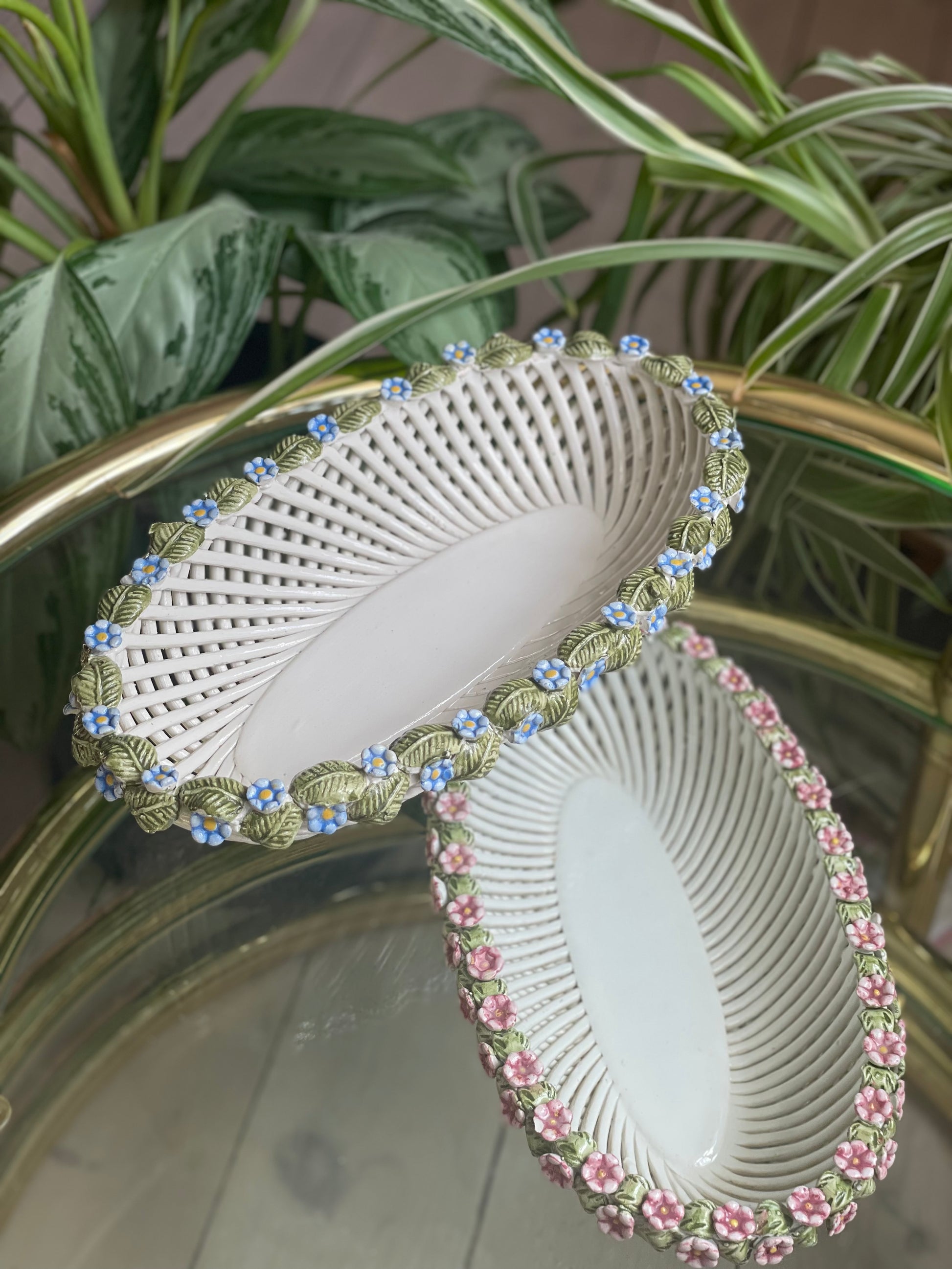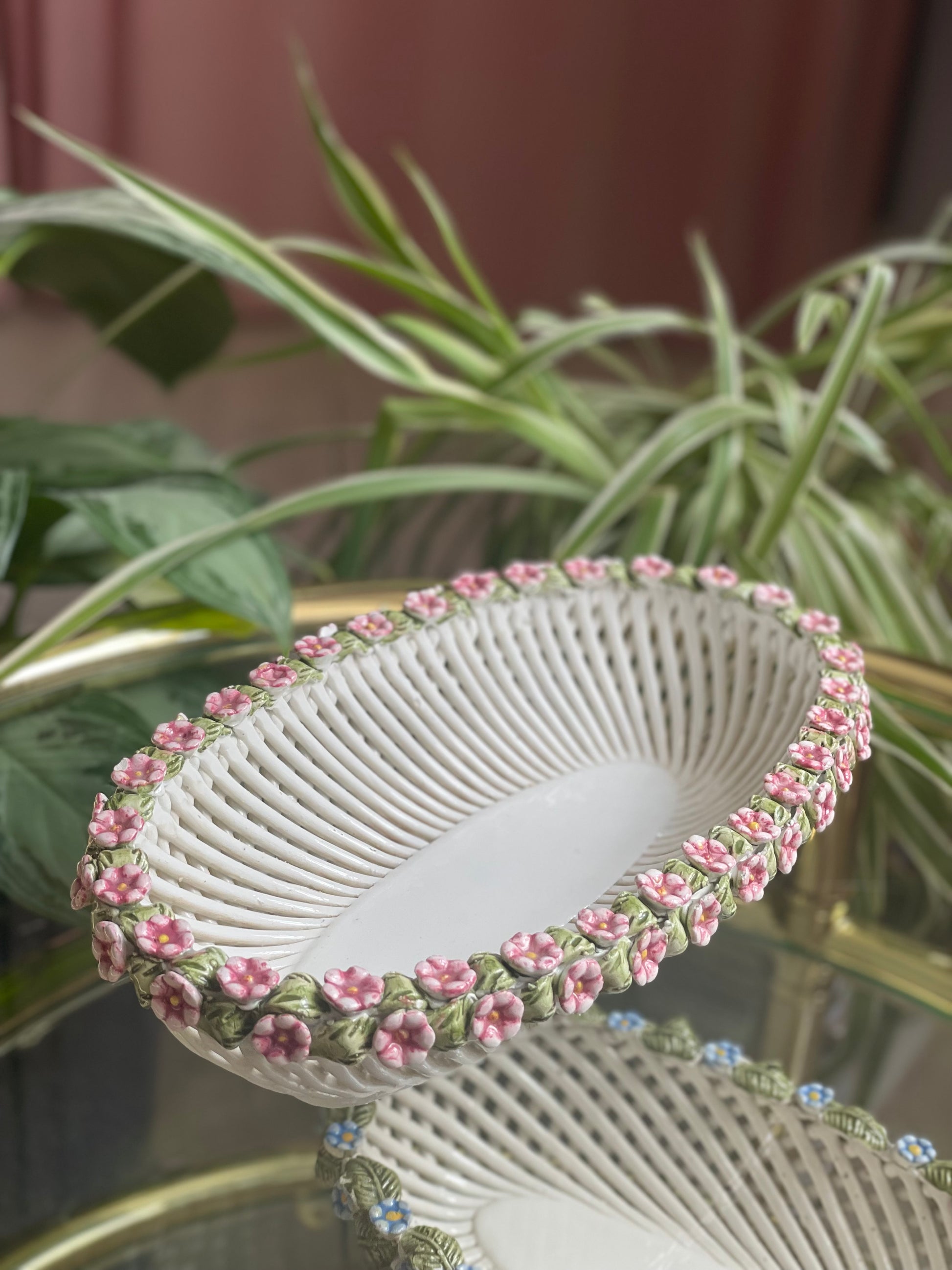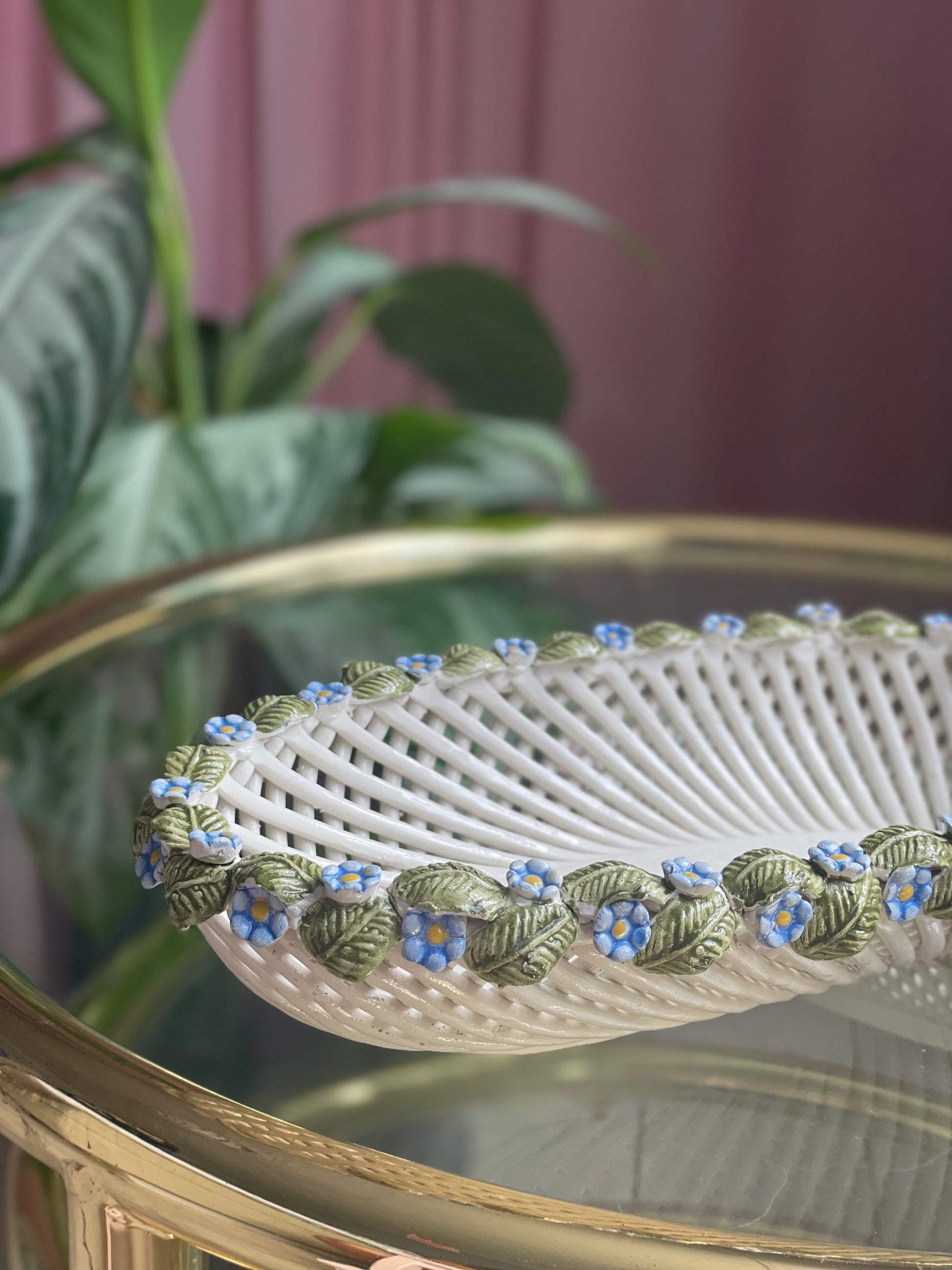 Vi har søgt Italien tynd efter disse sjældne keramikkurve. Håndværket er exceptionelt og standen på dem ligeså. Vælg mellem kurv med lyserøde blomster og kurv med blå blomster. De sælges stykvis.