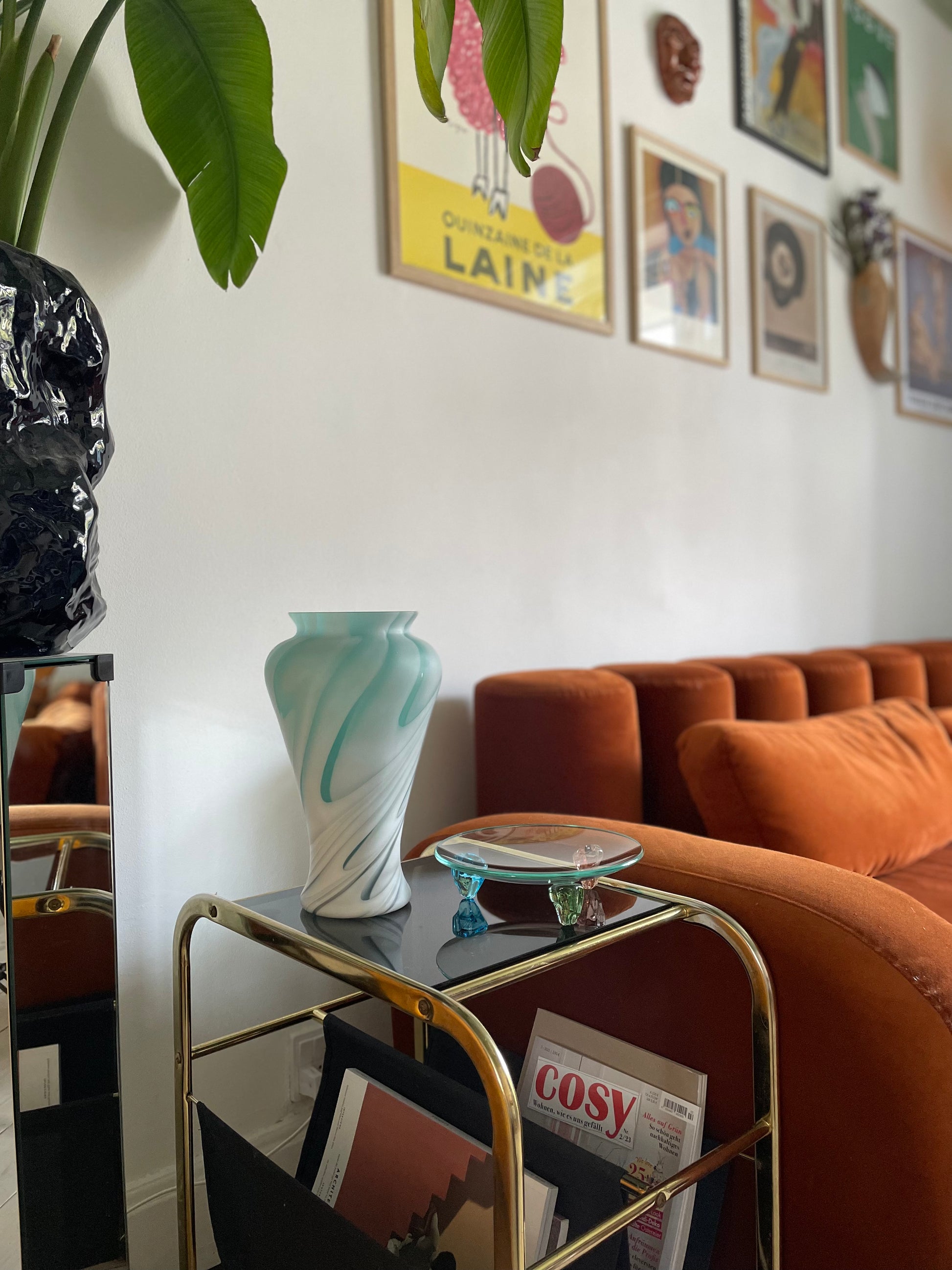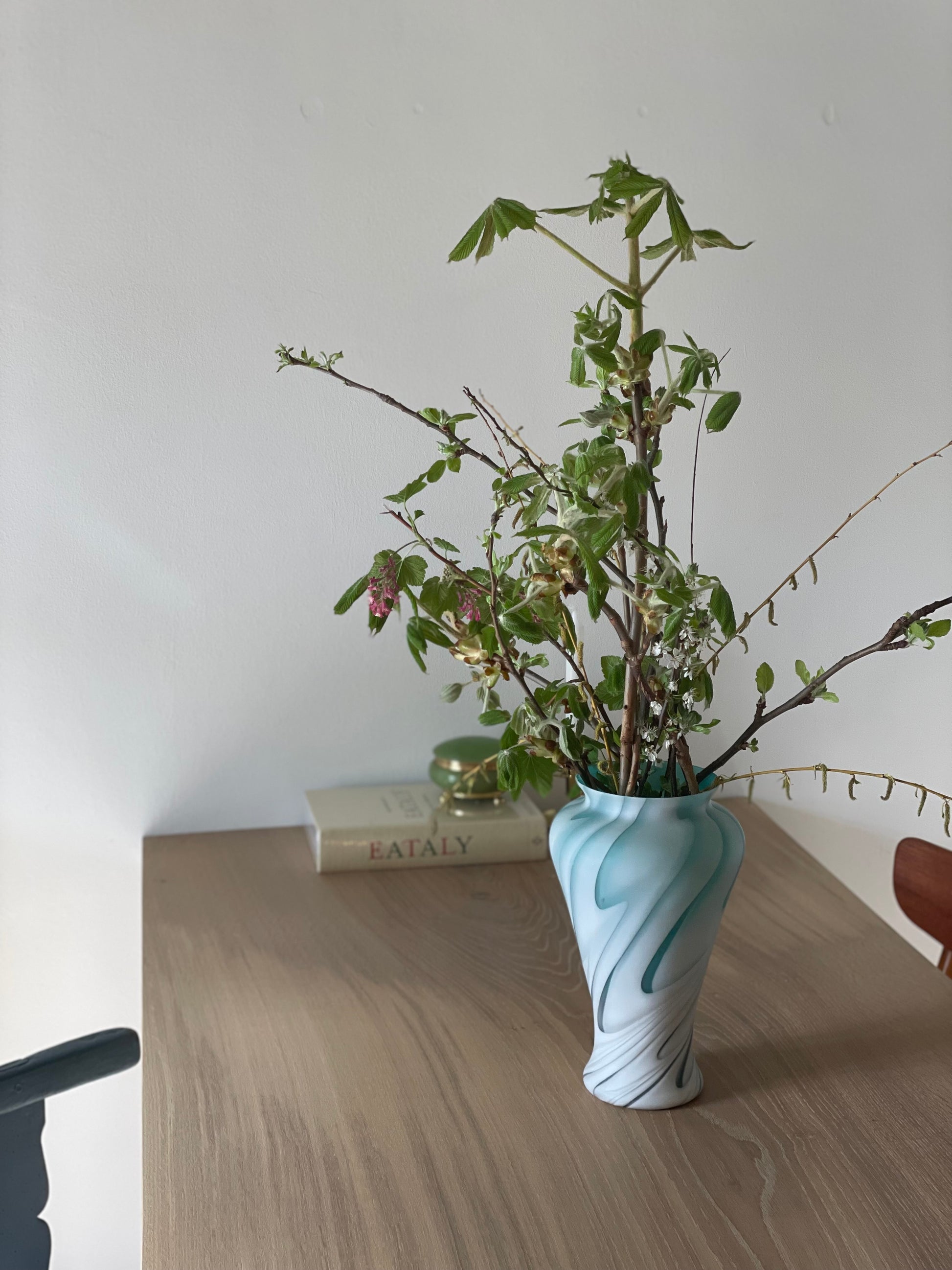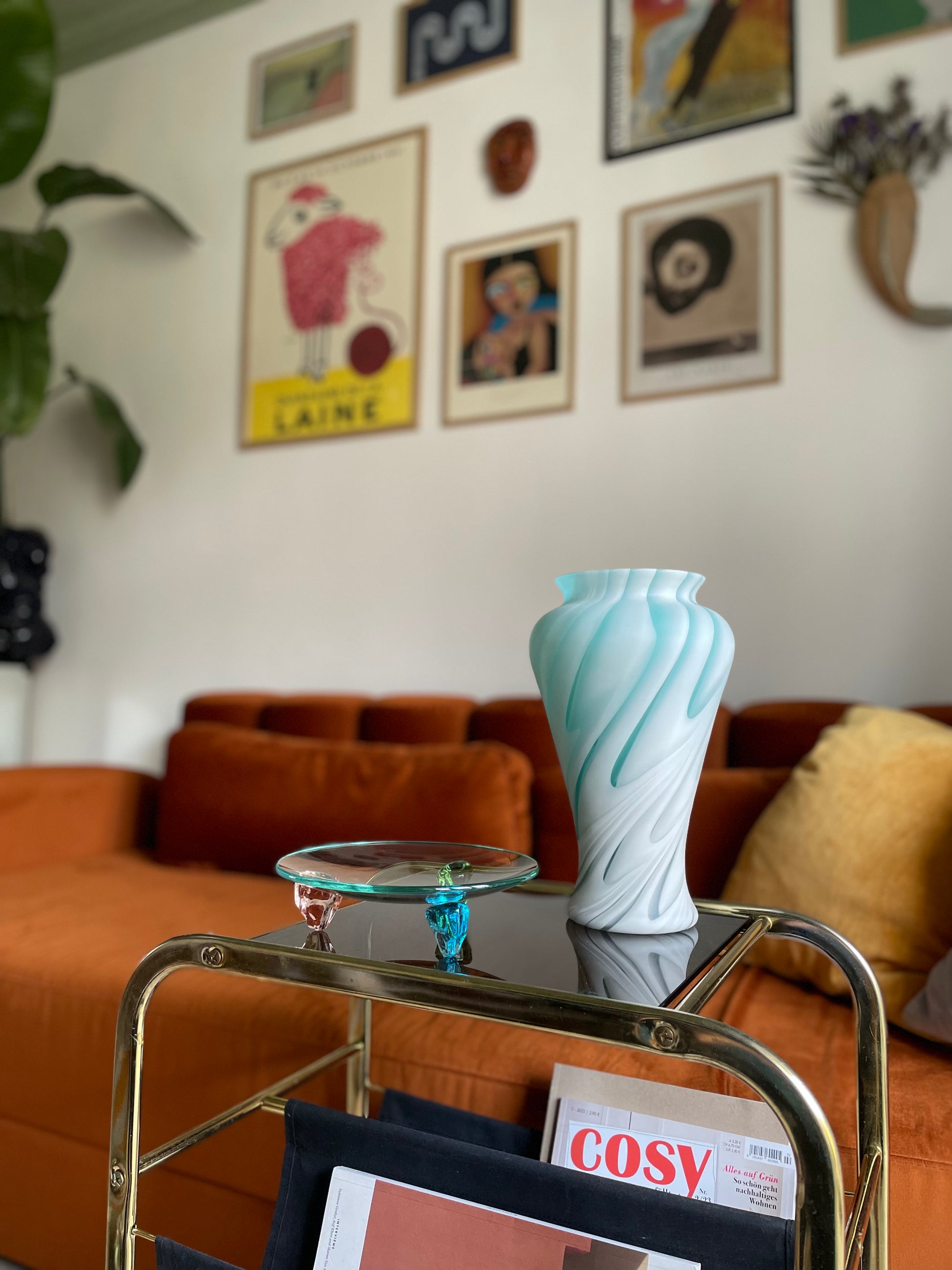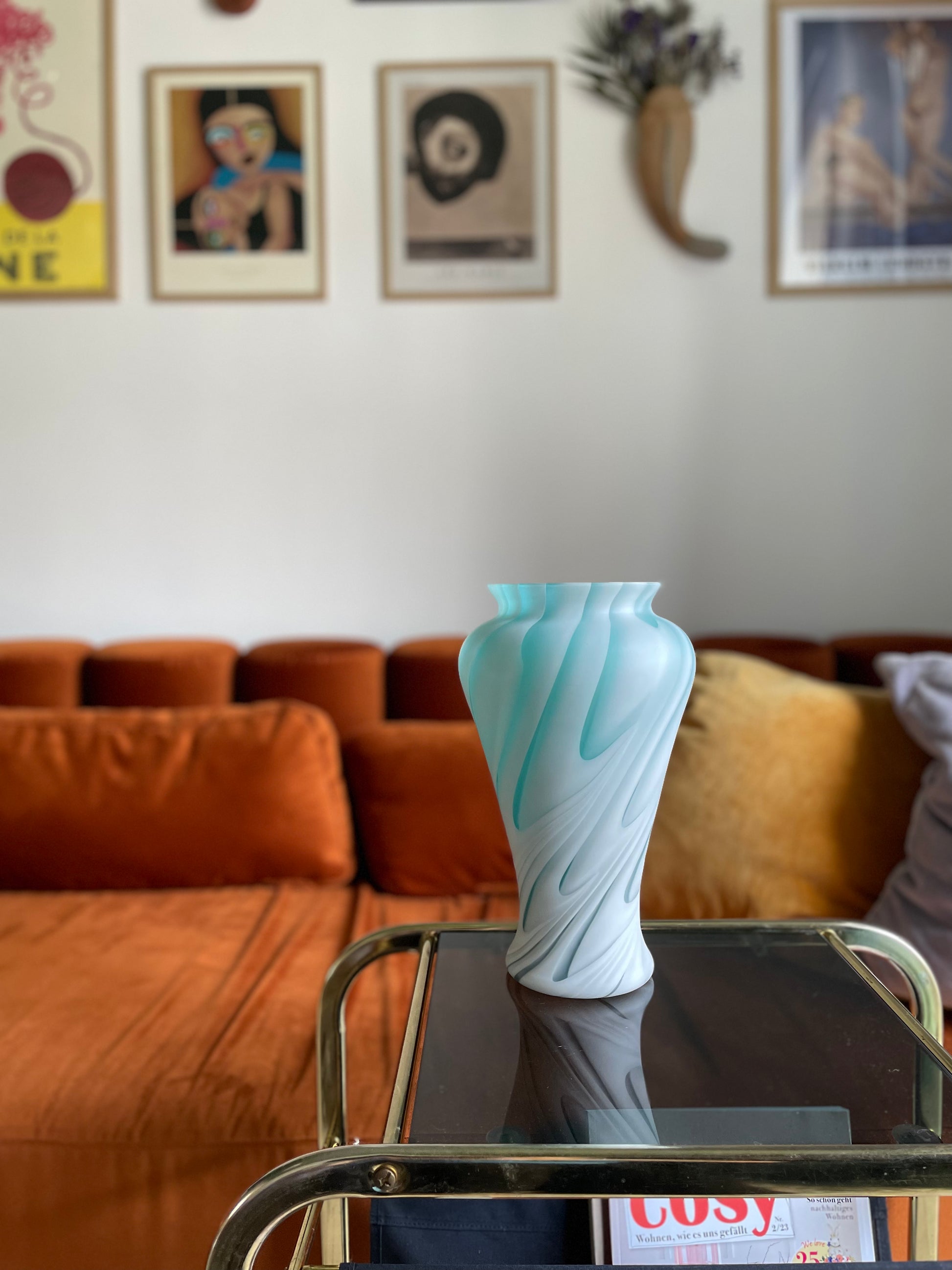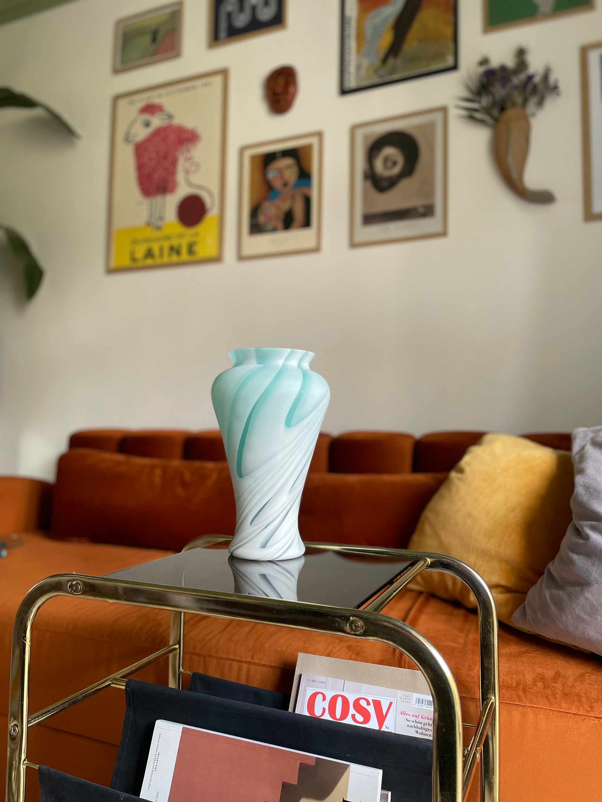 Smuk vintage vase med swirl i glasset der får det til at virke som om at lampen har flere overskyggende lag. Fundet i Italien og nænsomt transporteret hjem. Vasen er i smuk vintage stand og måler 28cm i højden og 12,5cm i åbningen. Åbningens form gør desuden at blomsterne holdes godt på plads.