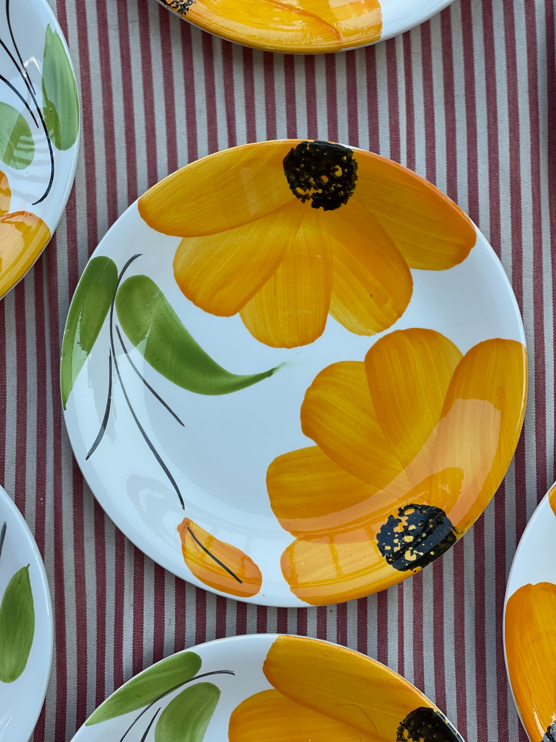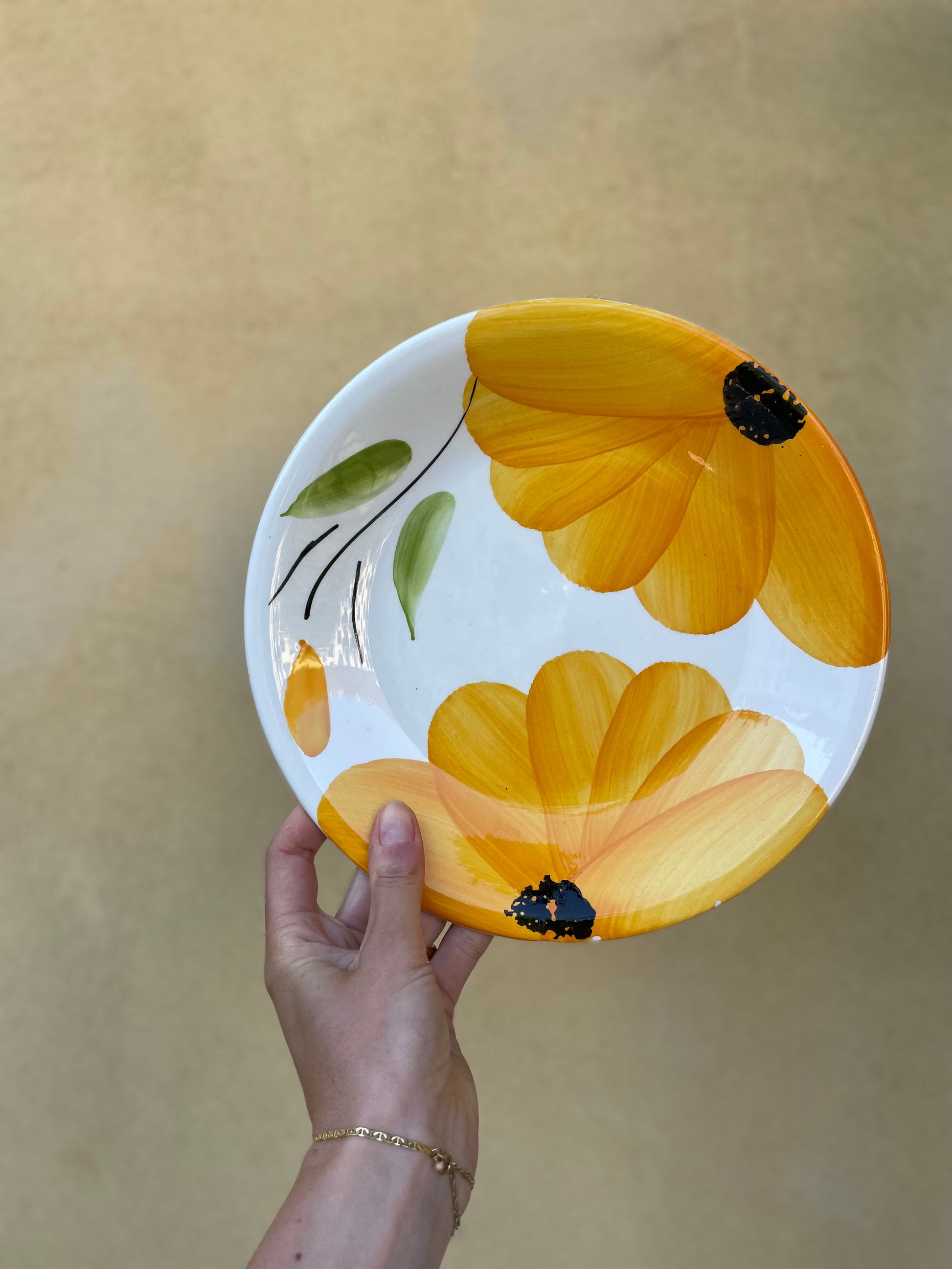 Lækre italienske middagstallerkener med kraftige gule blomster. Tallerkenerne sælges stykvis, måler 25cm i bredden og kommer med lette skrab eller små skår på kant.