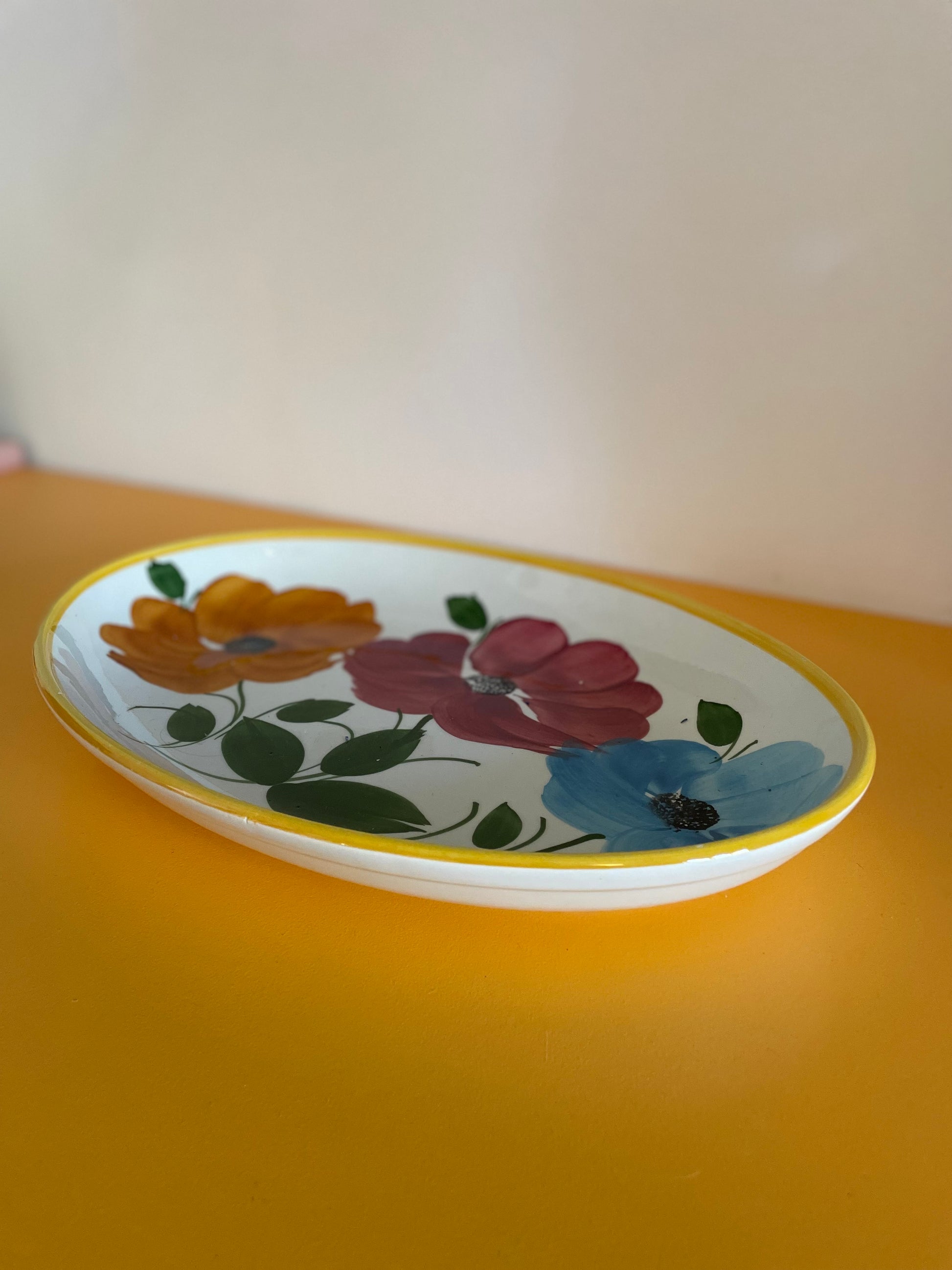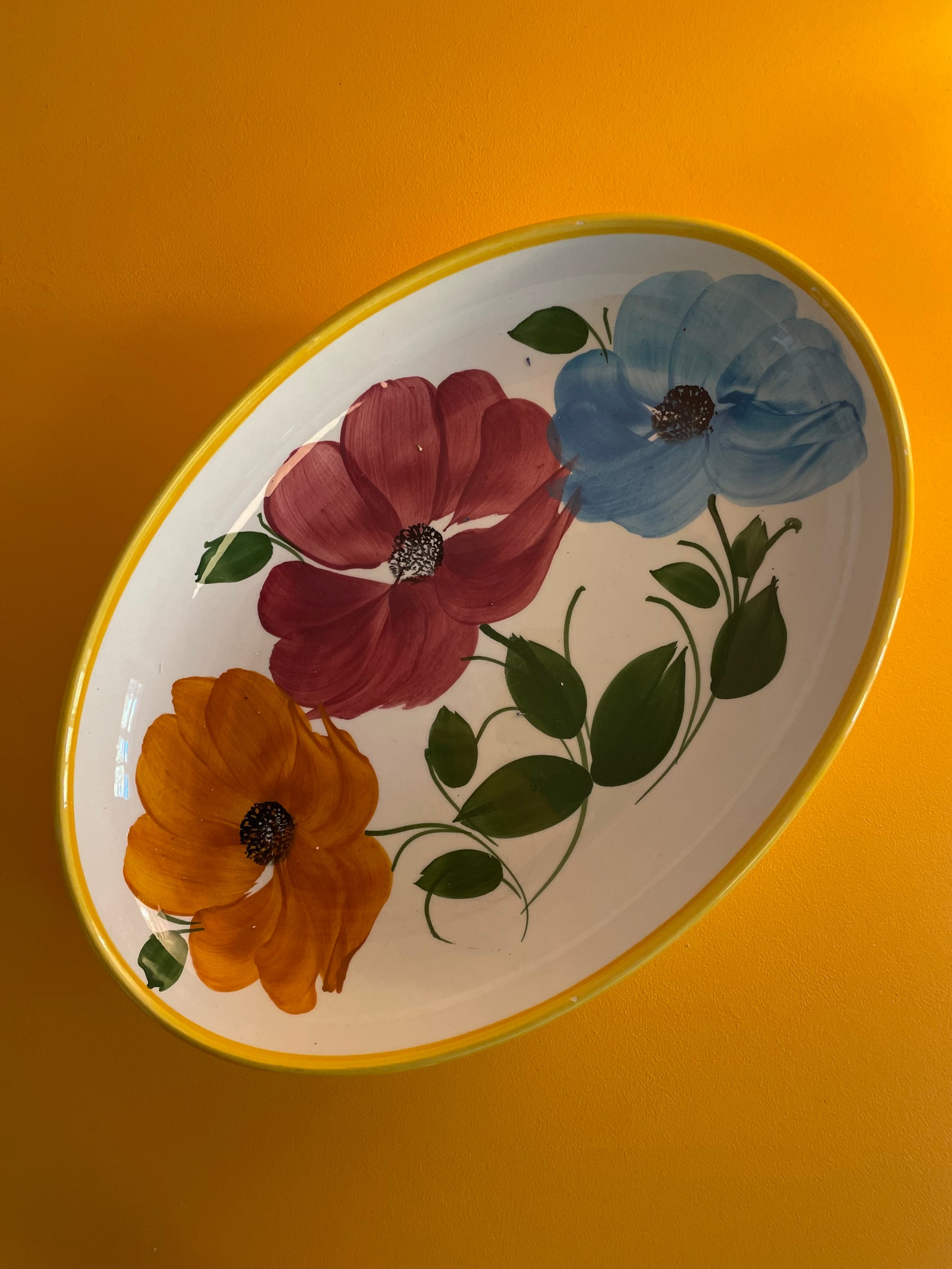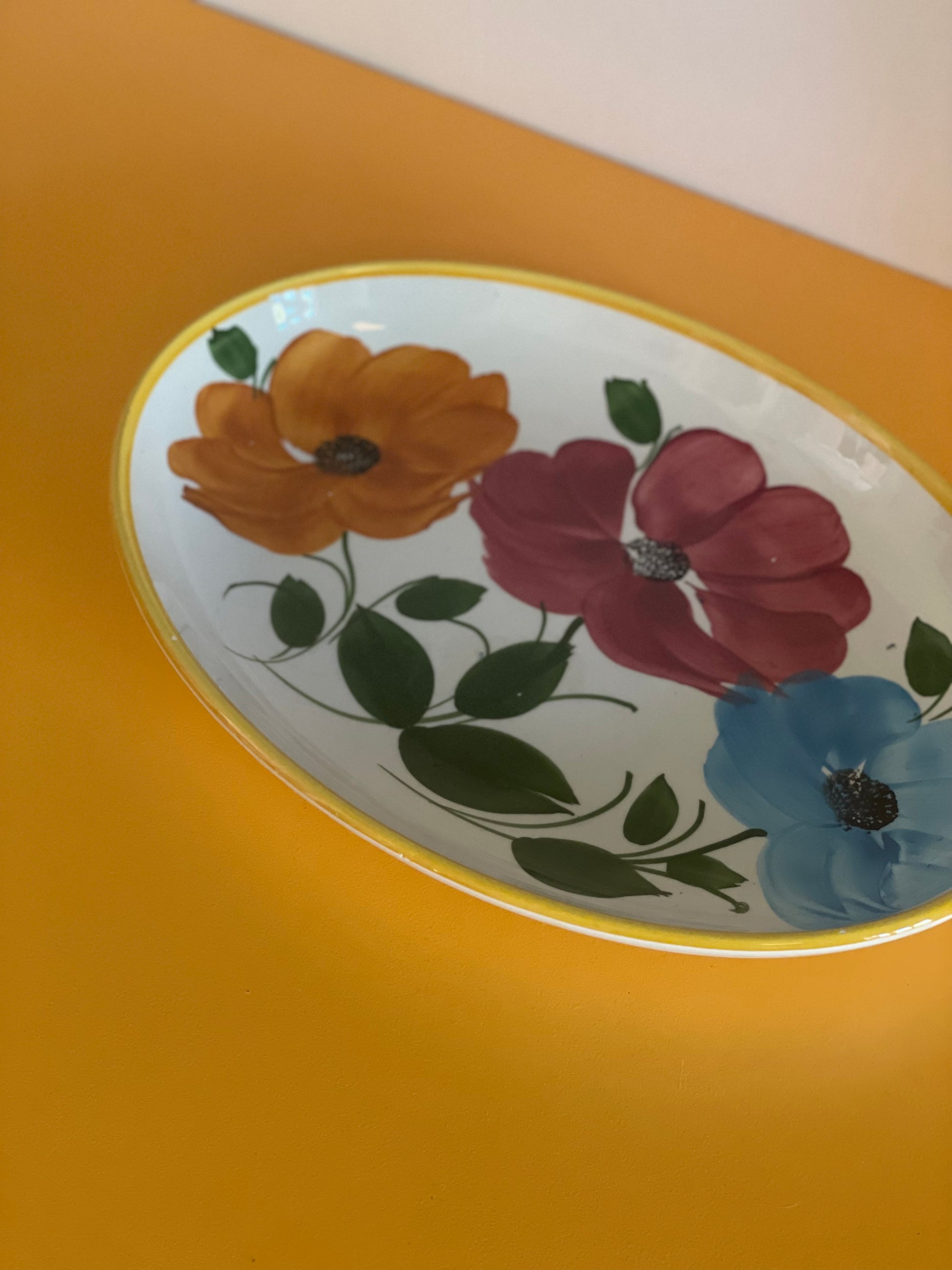 Kæmpe stort blomsterfad med farverige blomster. Dette fad måler hele 40cm og står i rigtig flot vintagestand med almindelige brugsforening.