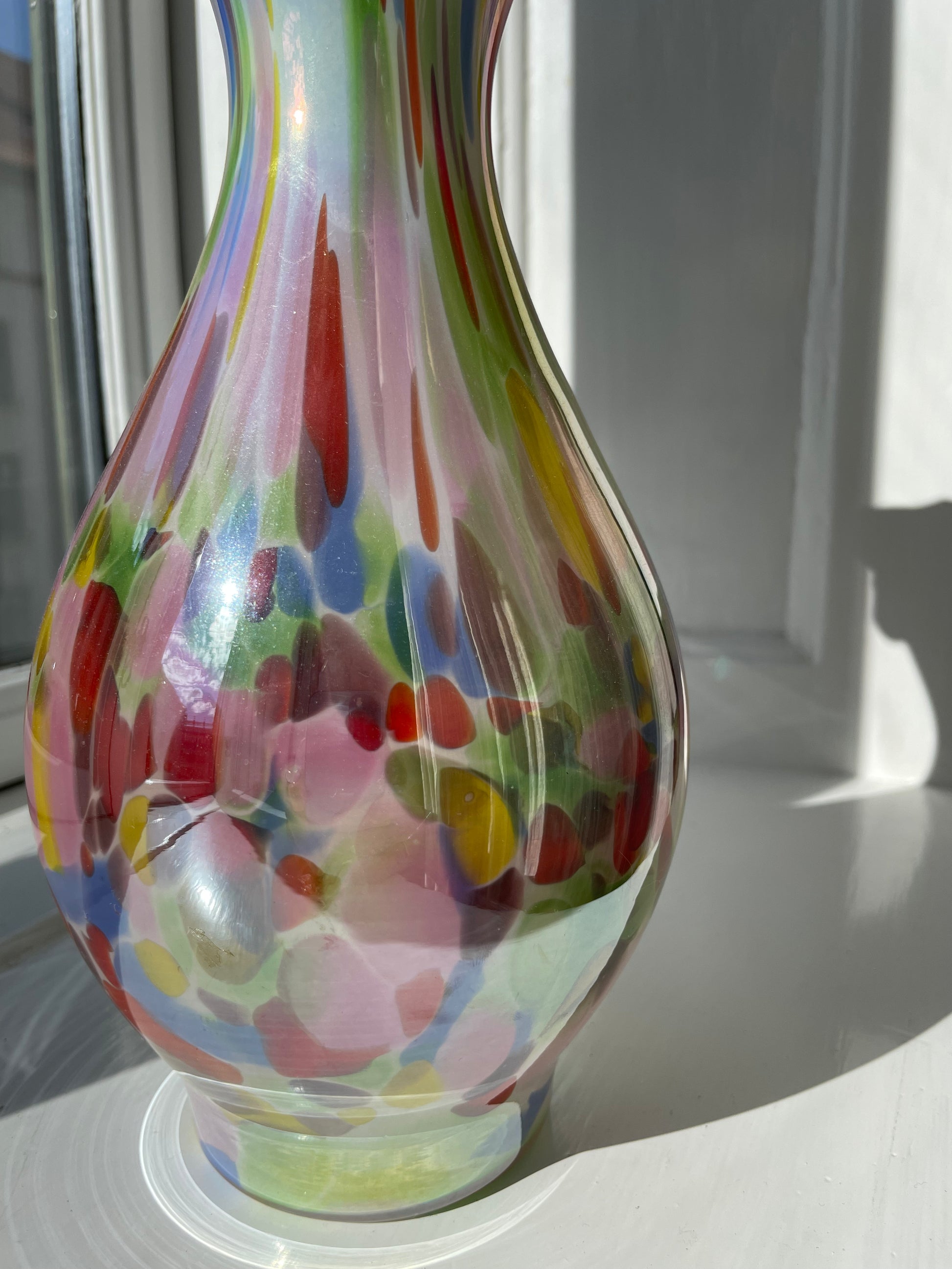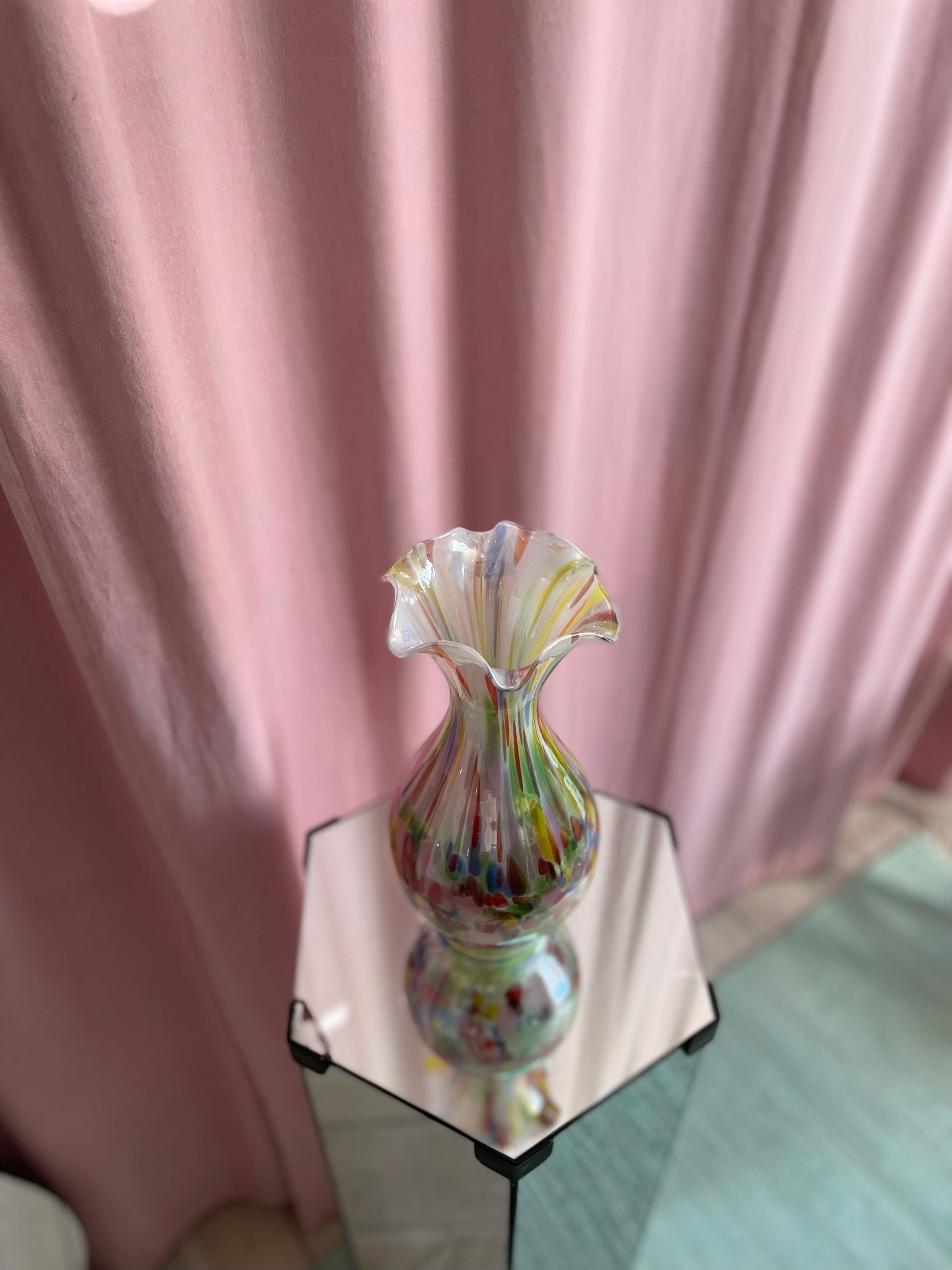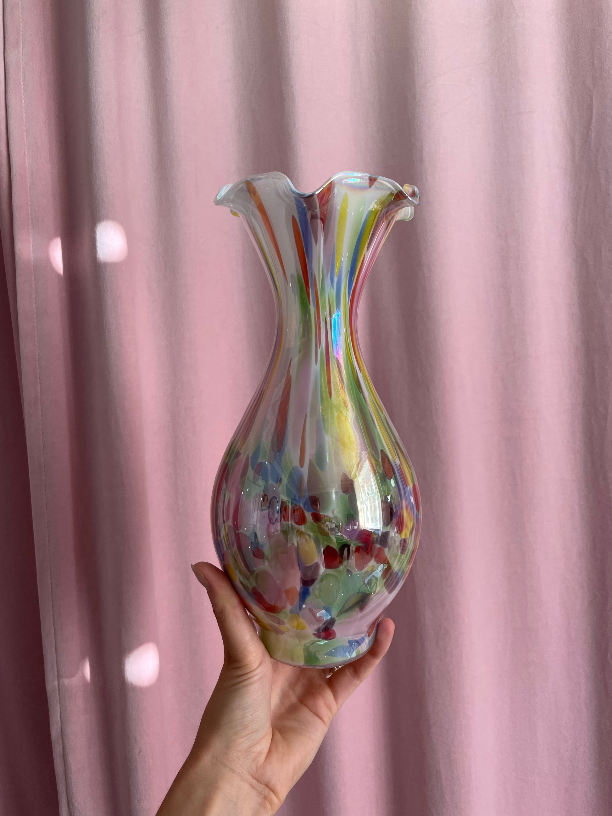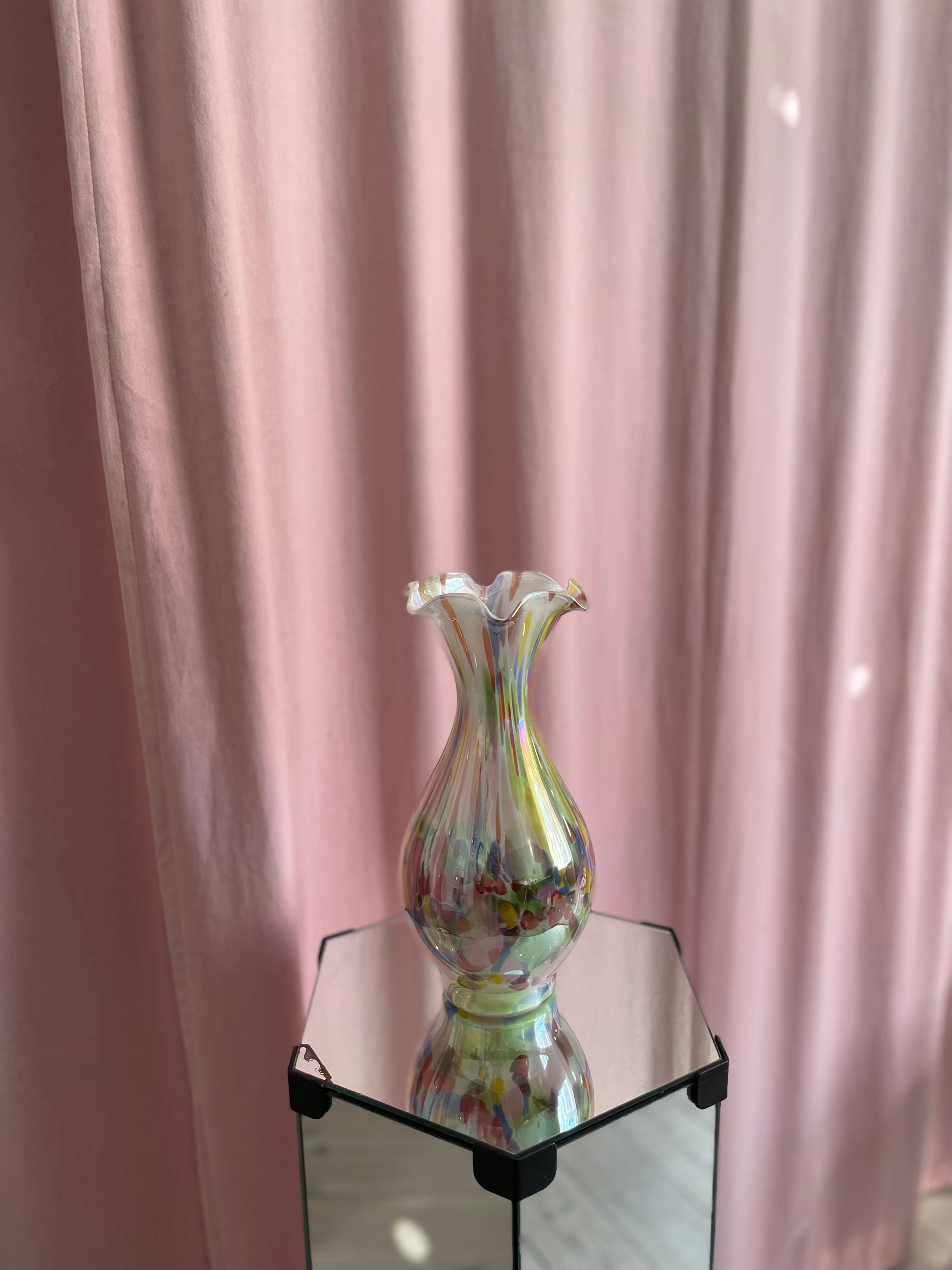 Smuk konfetti-vase med maksimum shine er klar til den næste buket! Måler 28cm i højden og 12cm i bredden. Standen er fænomenal!