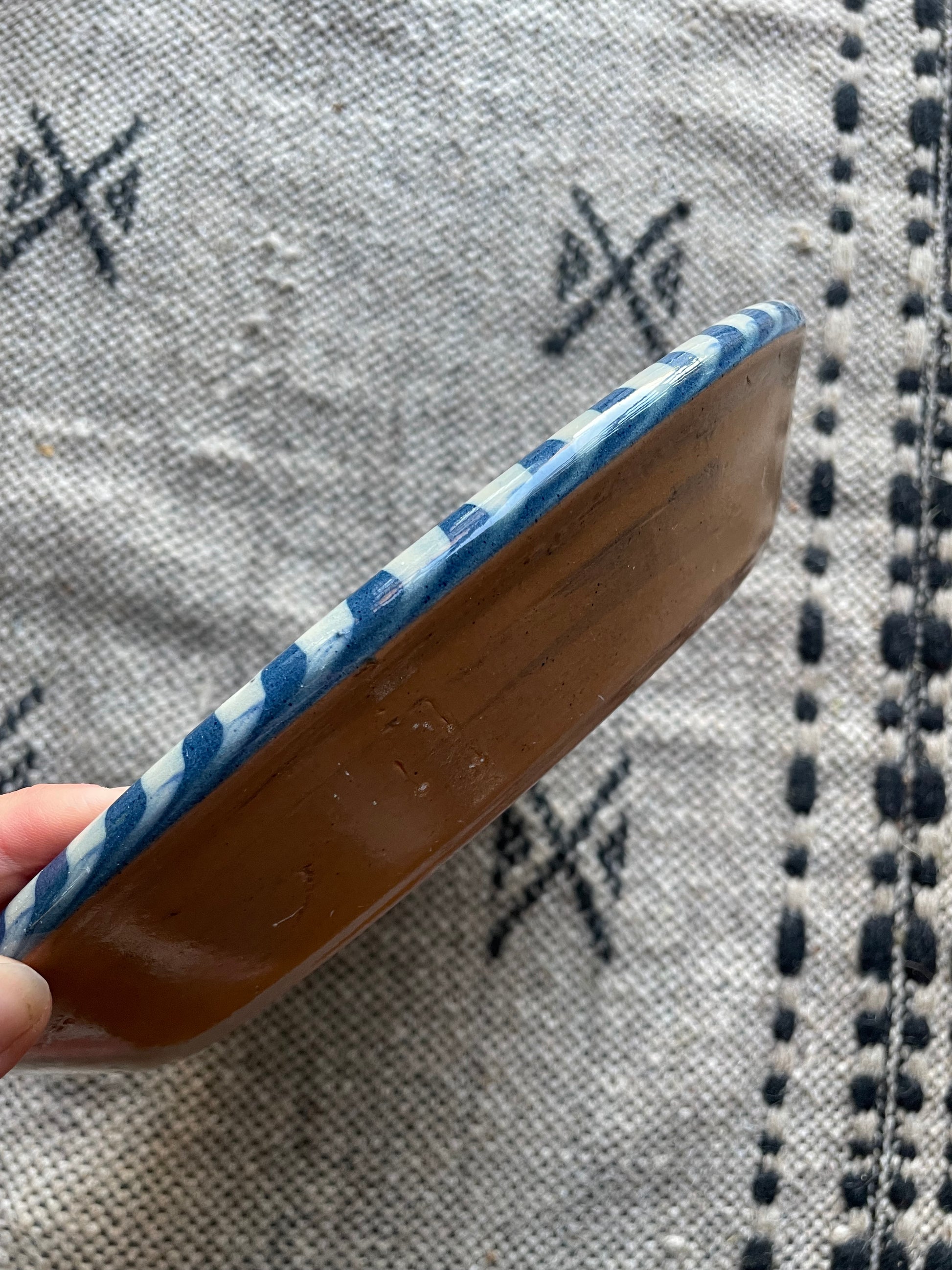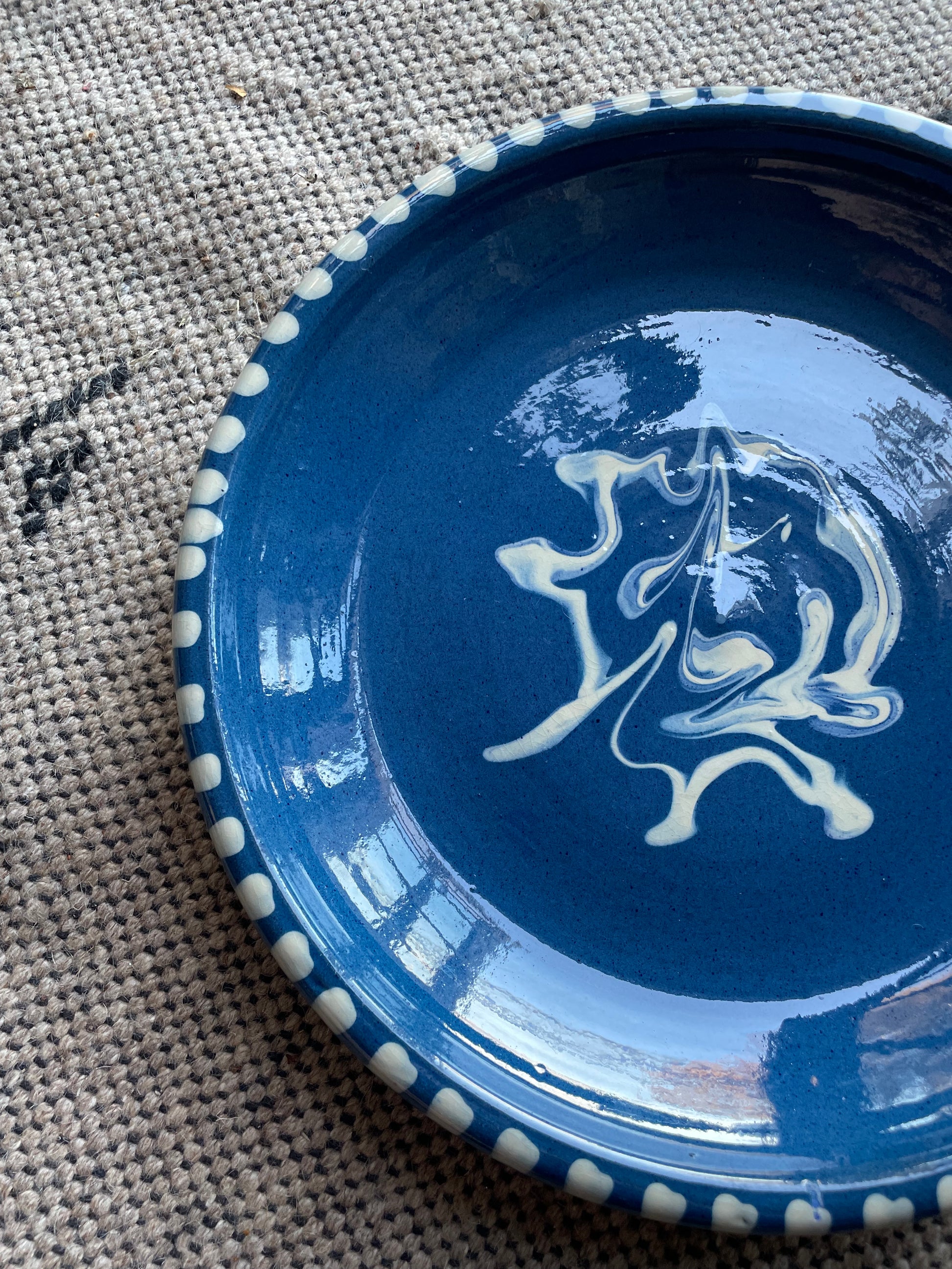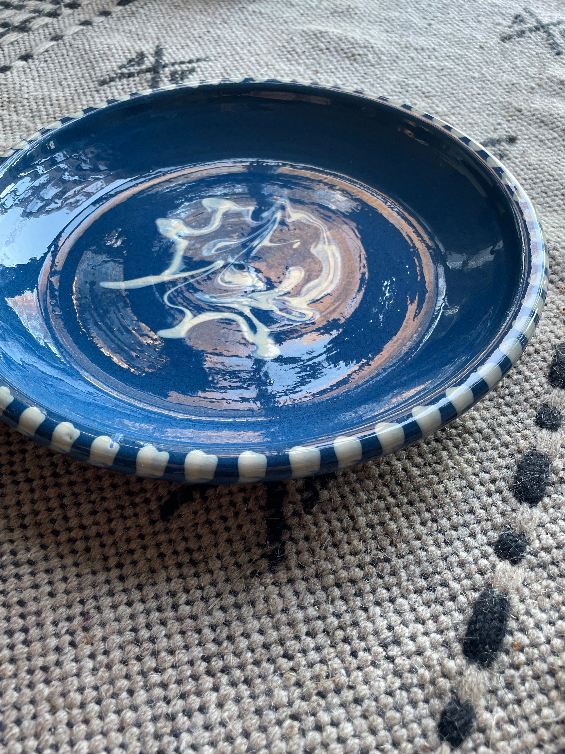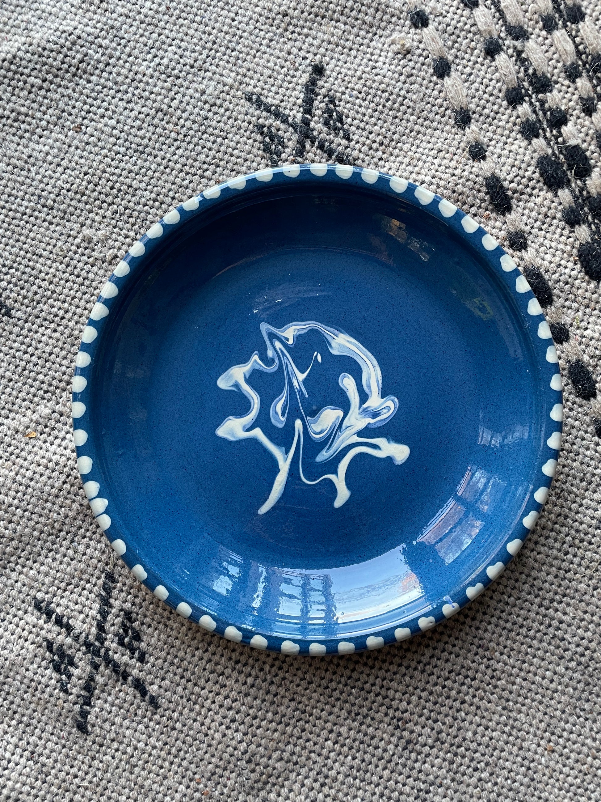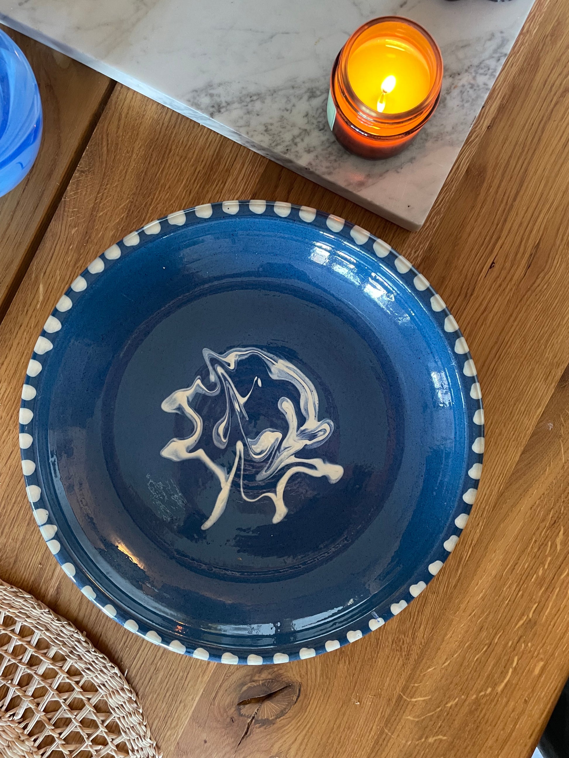 Lækkert, kraftig lertøjsfad med støvet blå glasur og en hvirvelvind på midten. Fadet står i flot stand med minimale brugsspor. Bredden på fadet er 28,5cm og højden er 4cm.