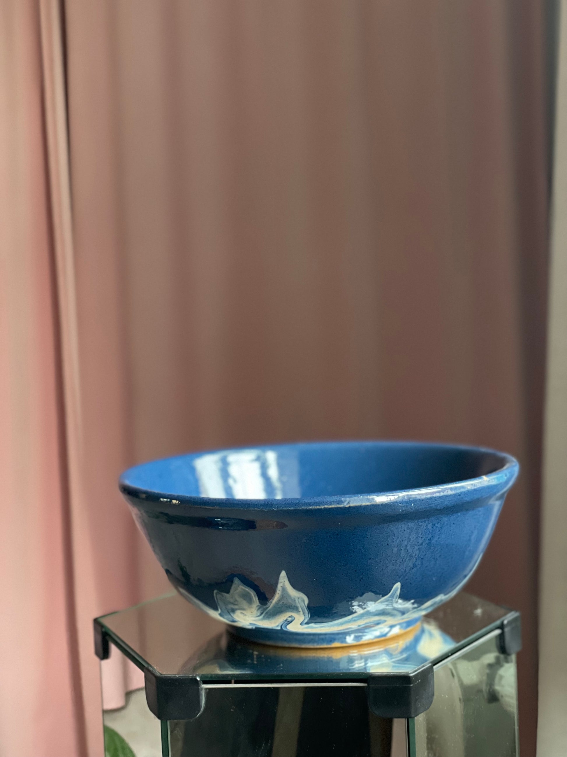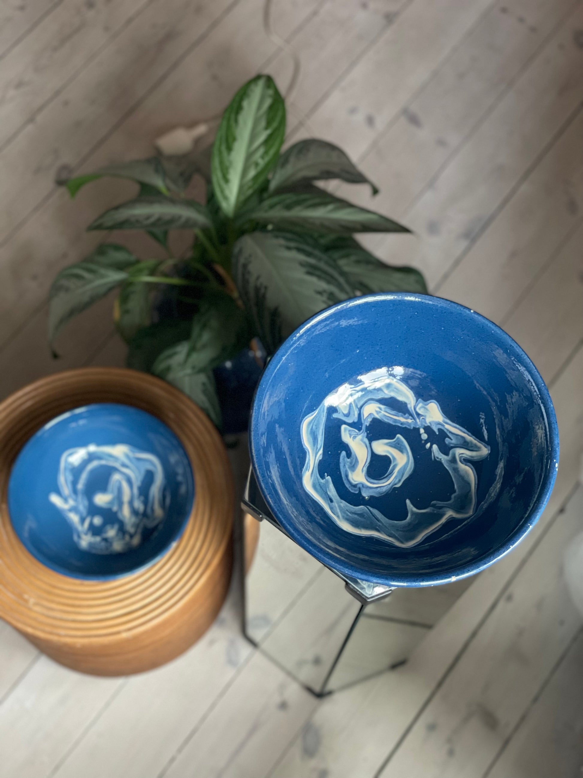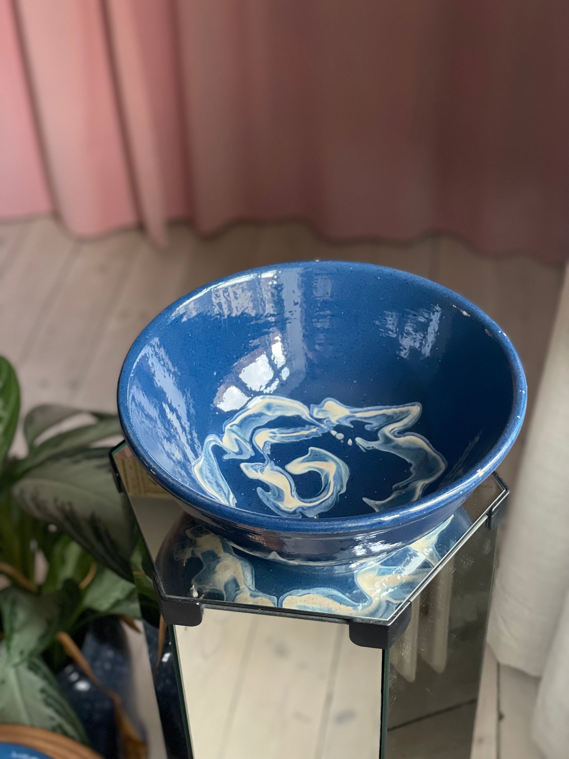 Lækker, kraftig lertøjsskål med støvet blå glasur og en hvirvelvind på midten. Skålen står i flot stand med sædvanlige brugsspor på kanterne. Bredden på skålen er 26cm og højden er 10cm.
