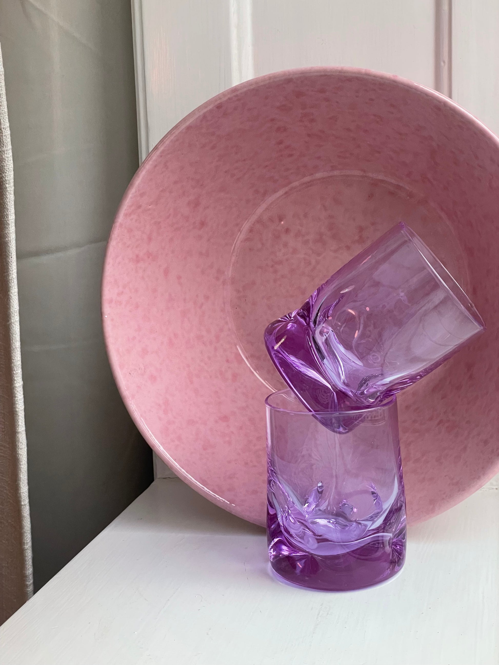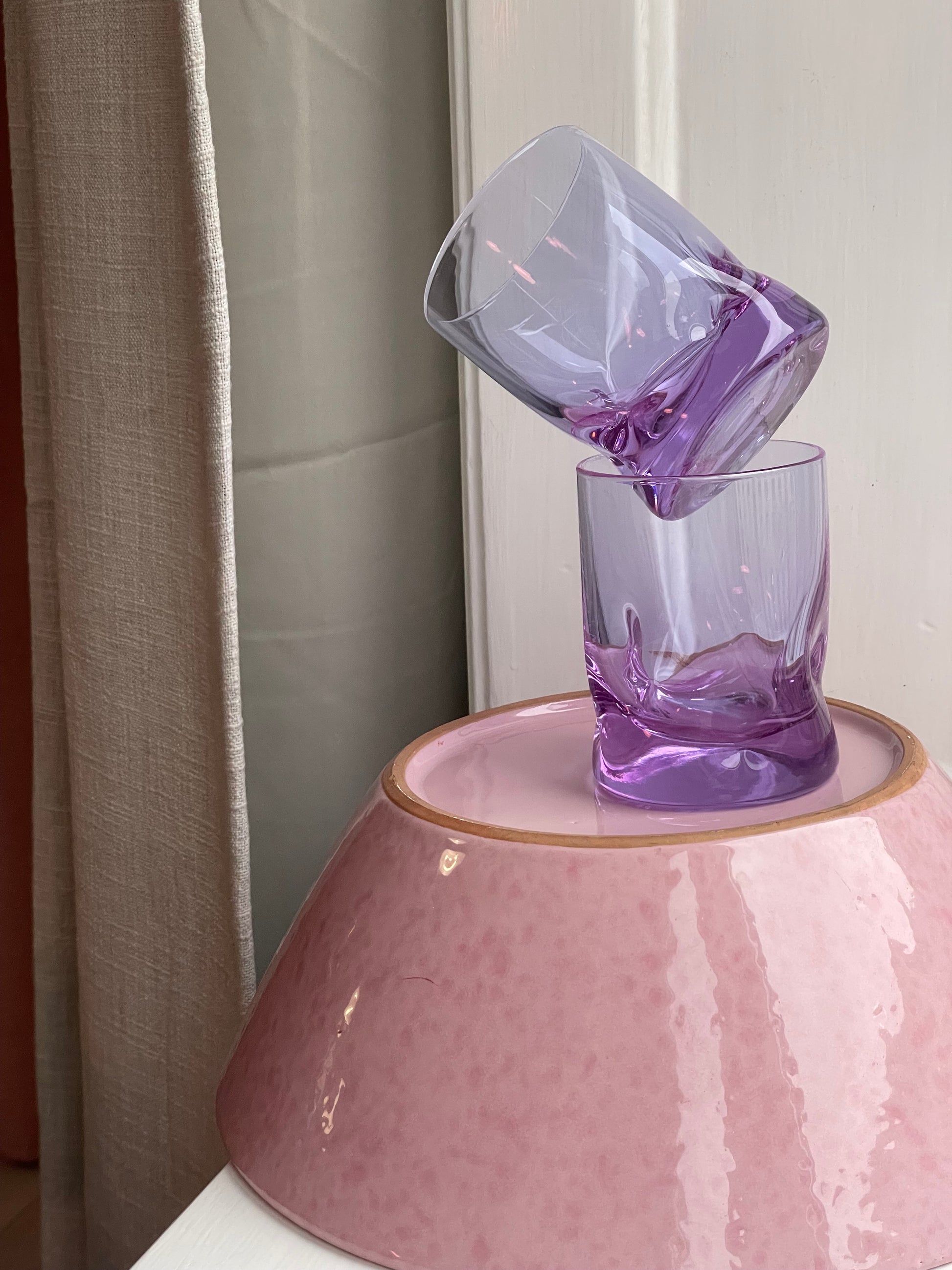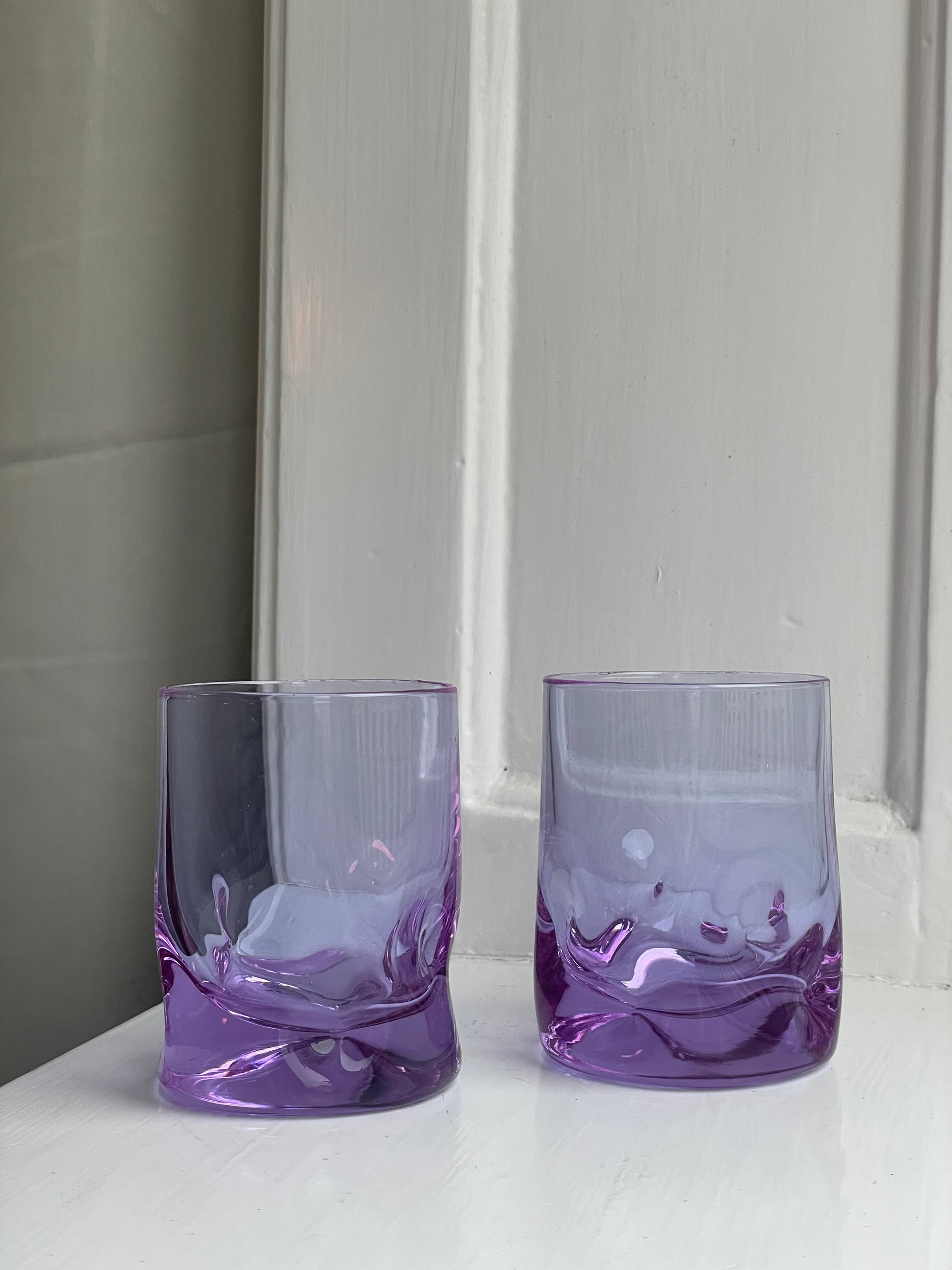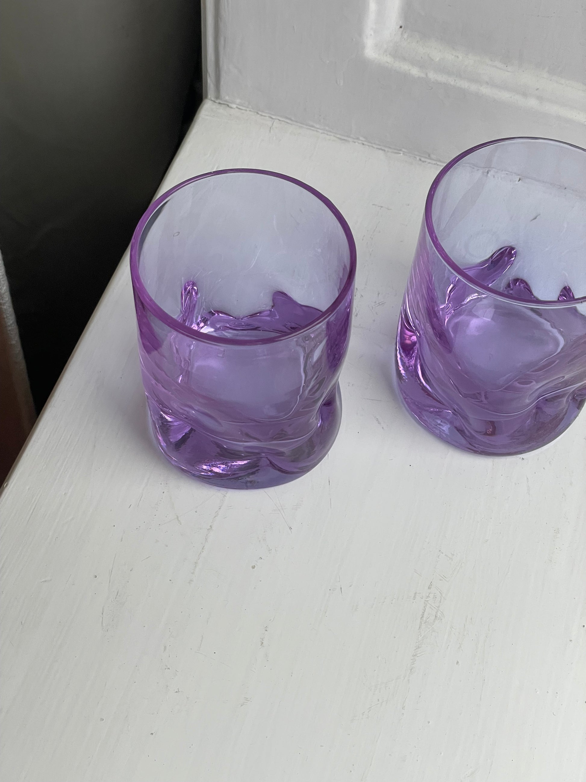 Disse lilla vandglas er den perfekte tilføjelse til enhver middagsopdækning. Lavet af smukt lilla krøllet glas, har de et legende og utraditionelt look, og så ligger de tilmed super godt i hånden. Hvert glas måler 9,8cm i højden, hvilket gør dem ideelle til servering af vand, saft, sodavand eller enhver anden favoritdrik. De indeholder 3dl hver og sælges stykvis.