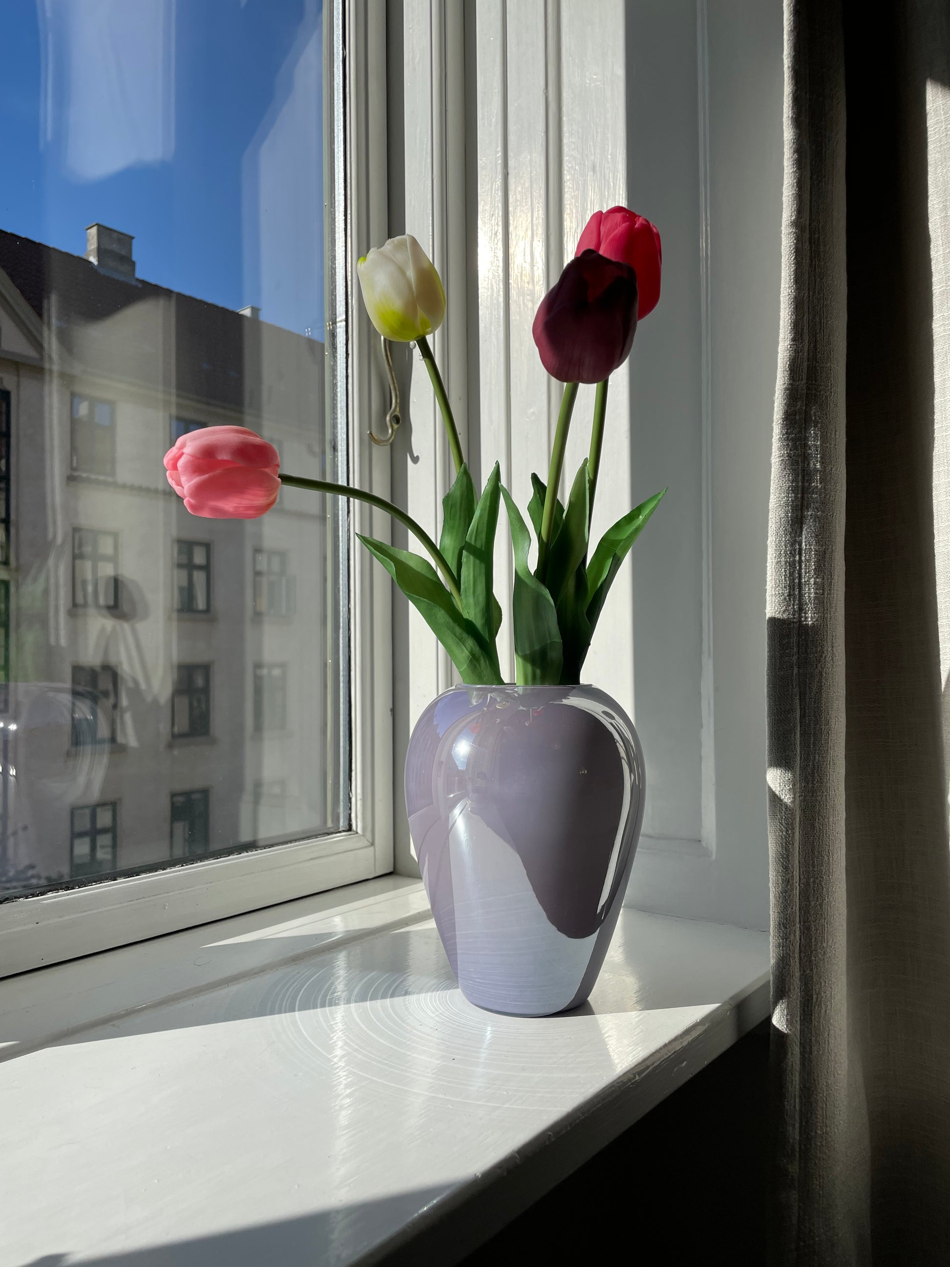 Smuk skinnende vase i lilla perlemorsglasur. Vasen er 19cm høj og i flot stand.