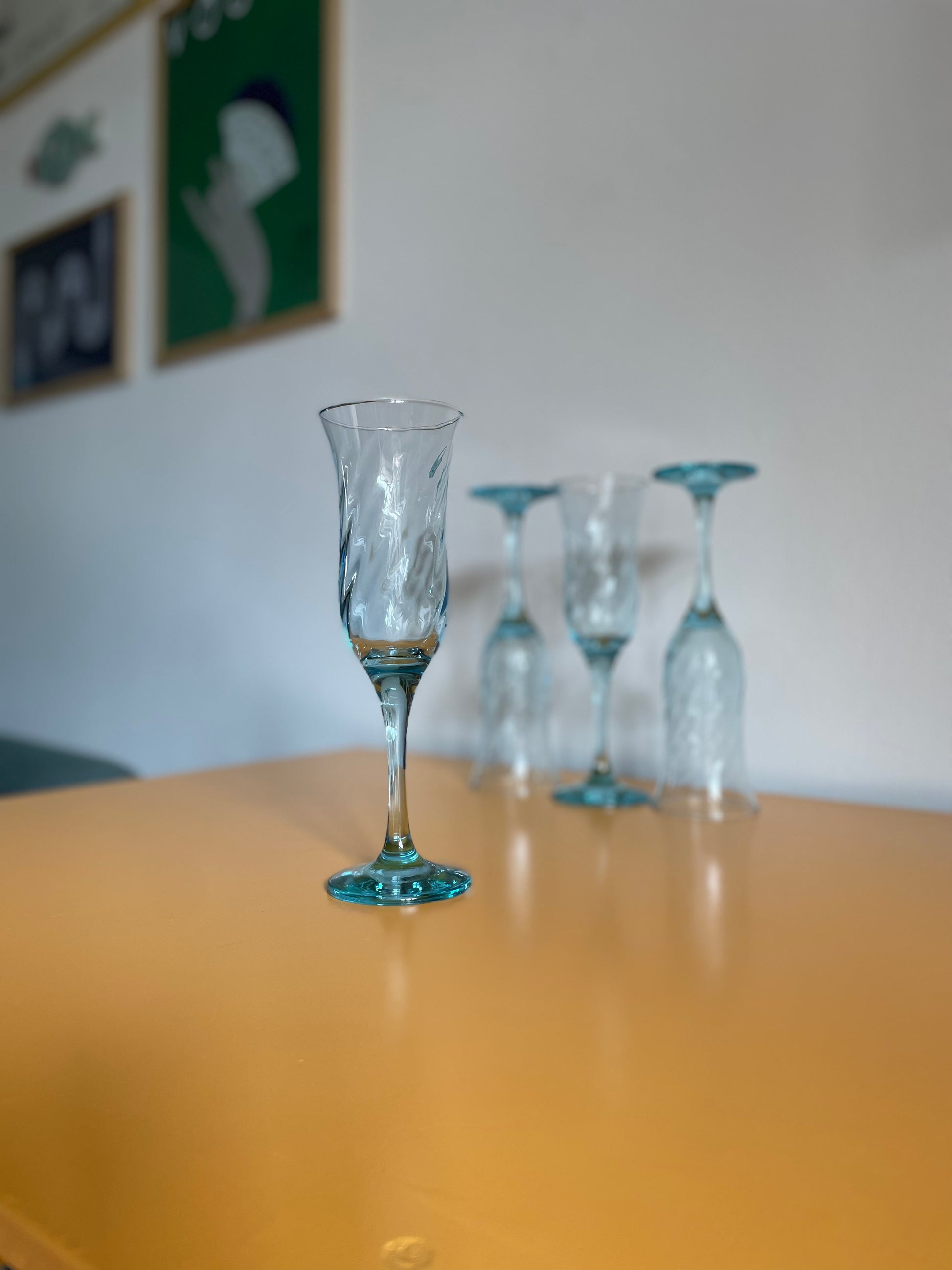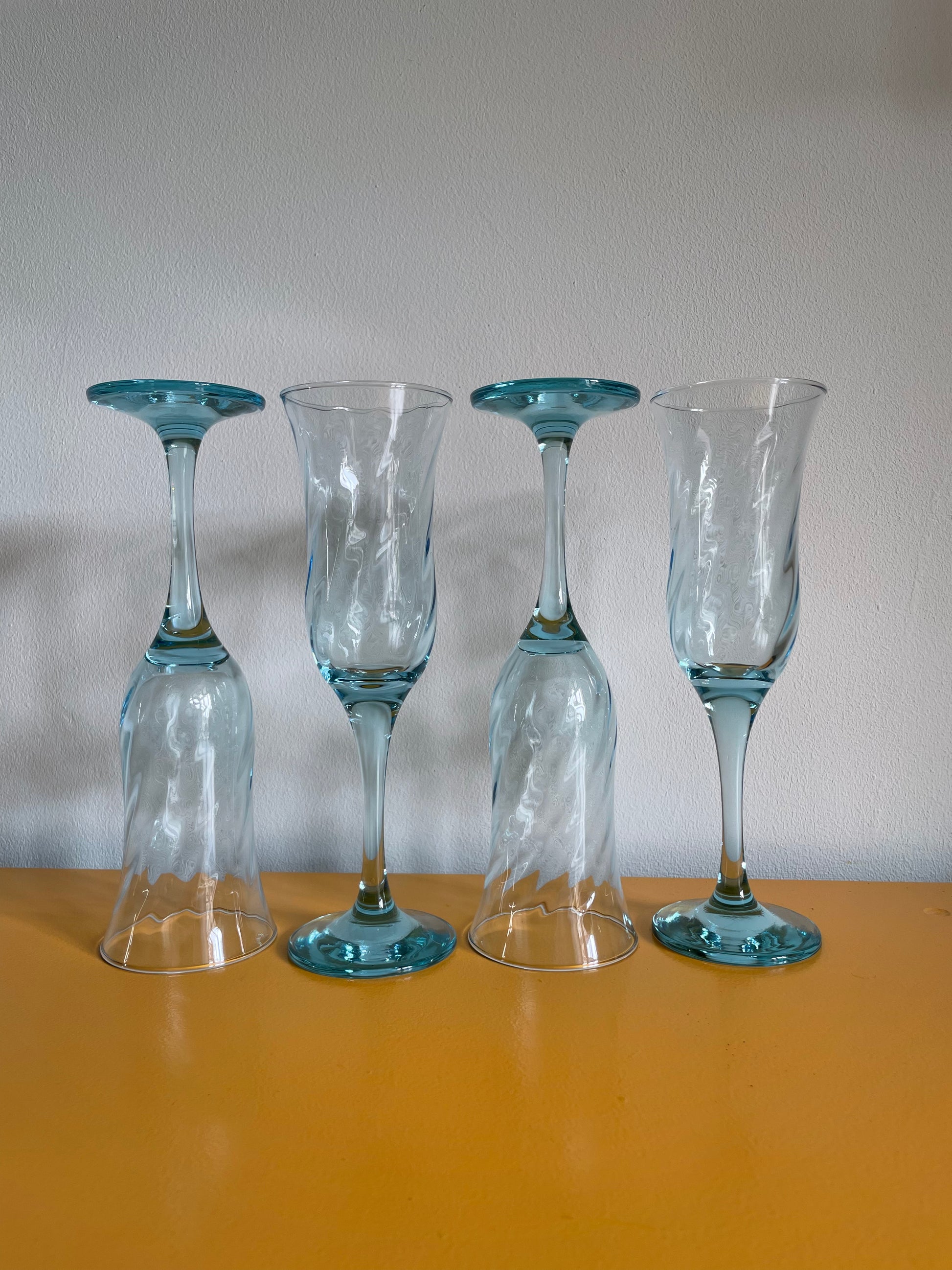 Flotte lyseblå champagneglas med swirl måler 21cm i højden og kan indeholde 1,5 dl. Prisen er pr styk