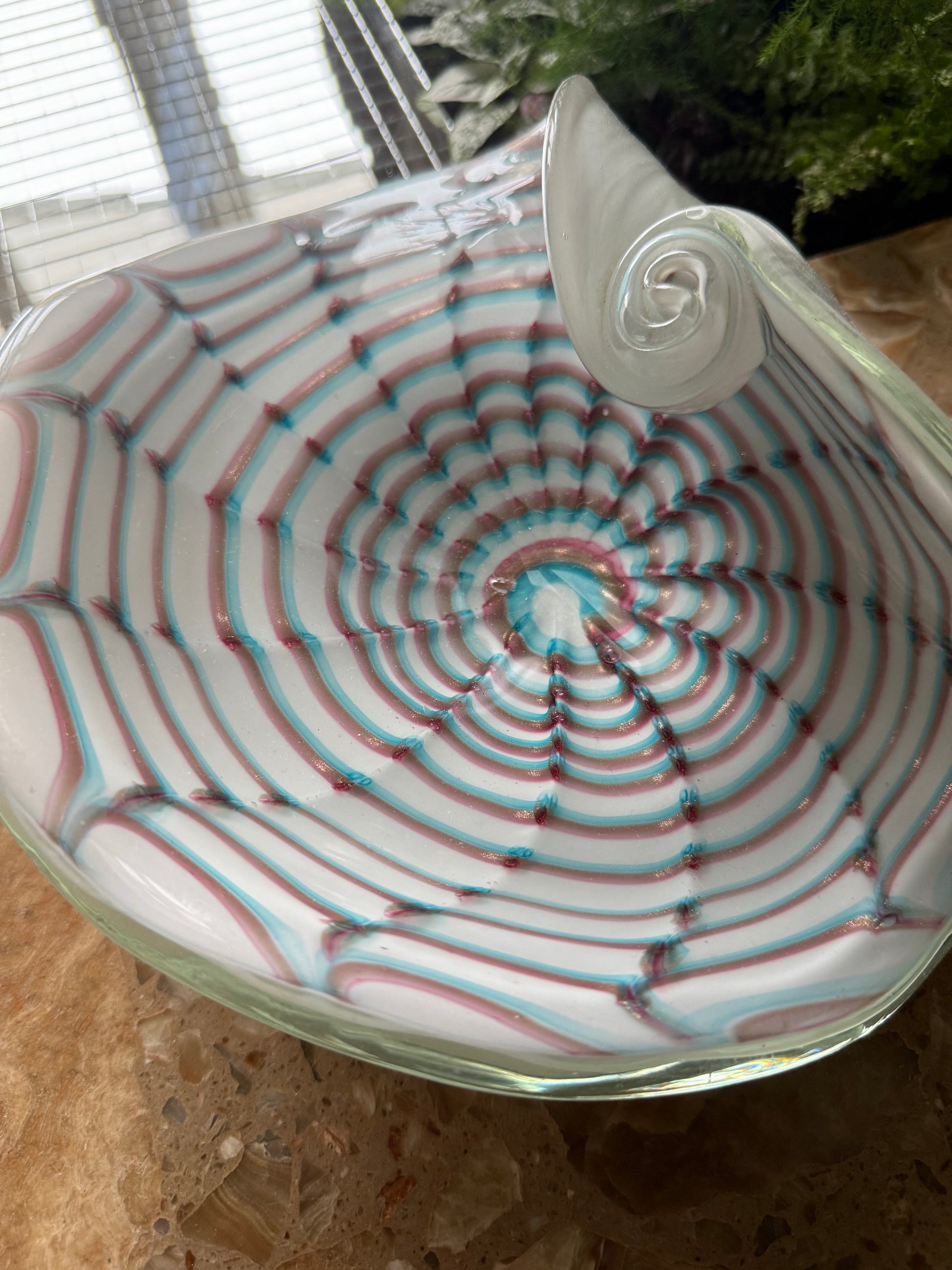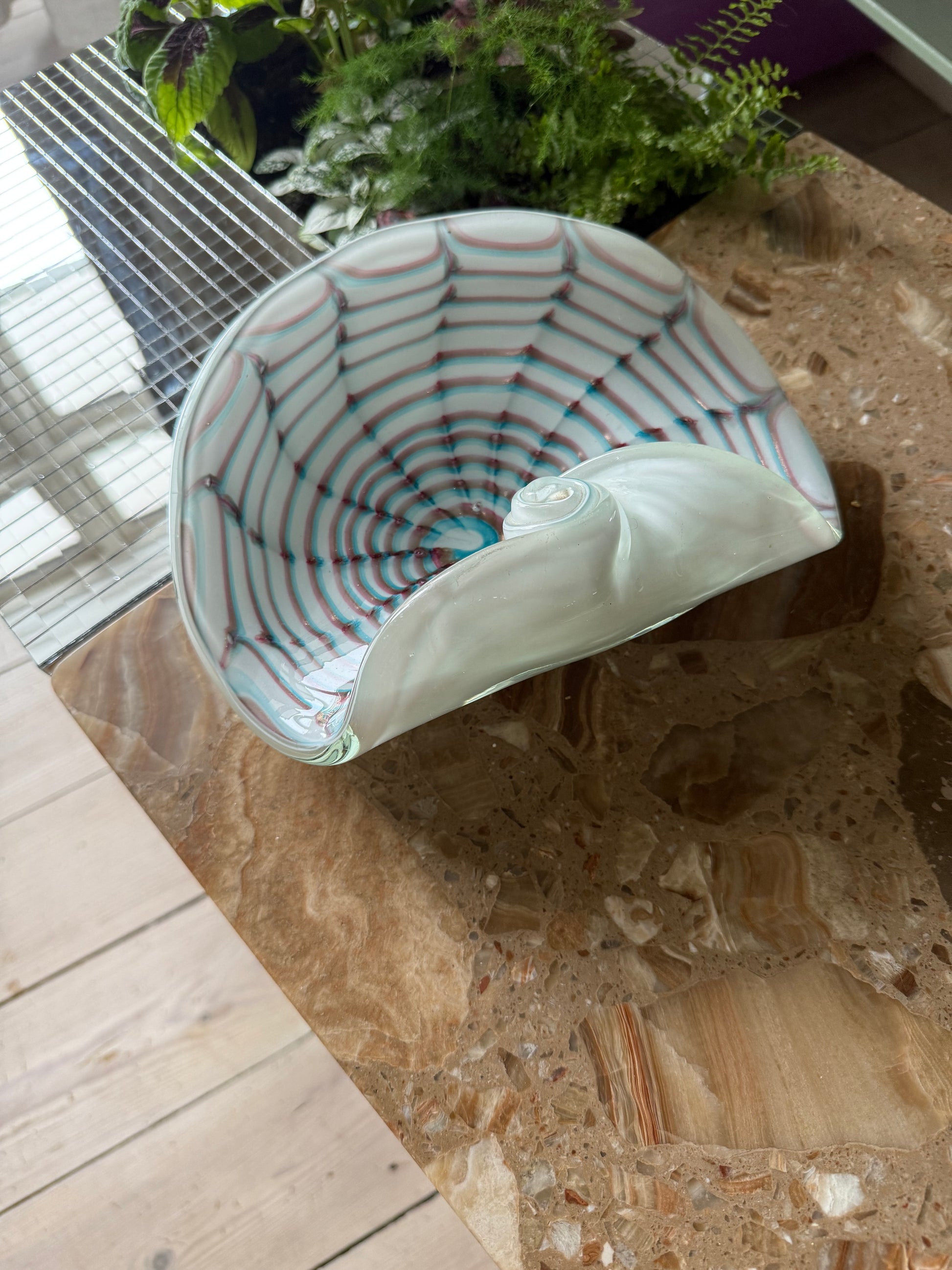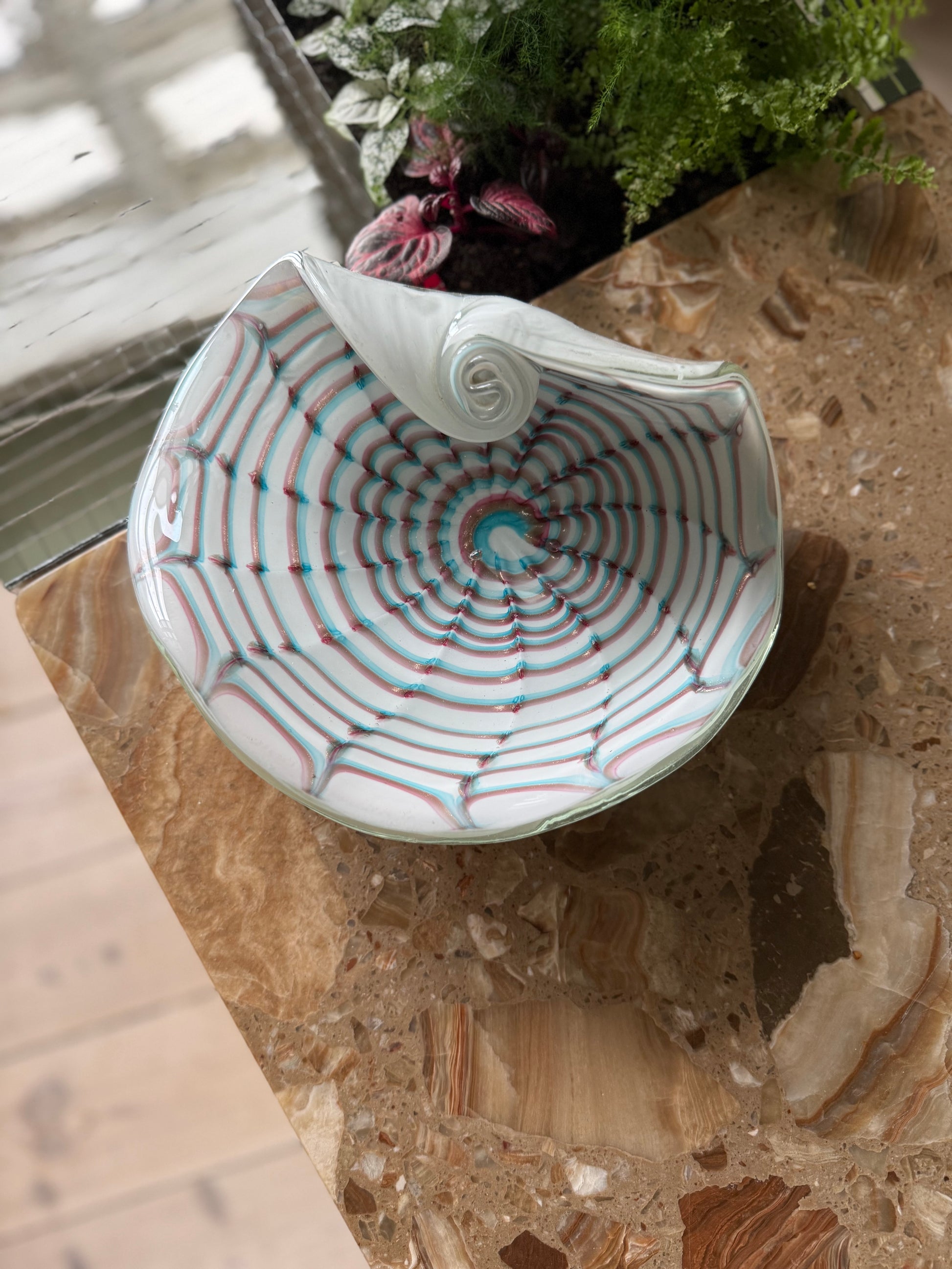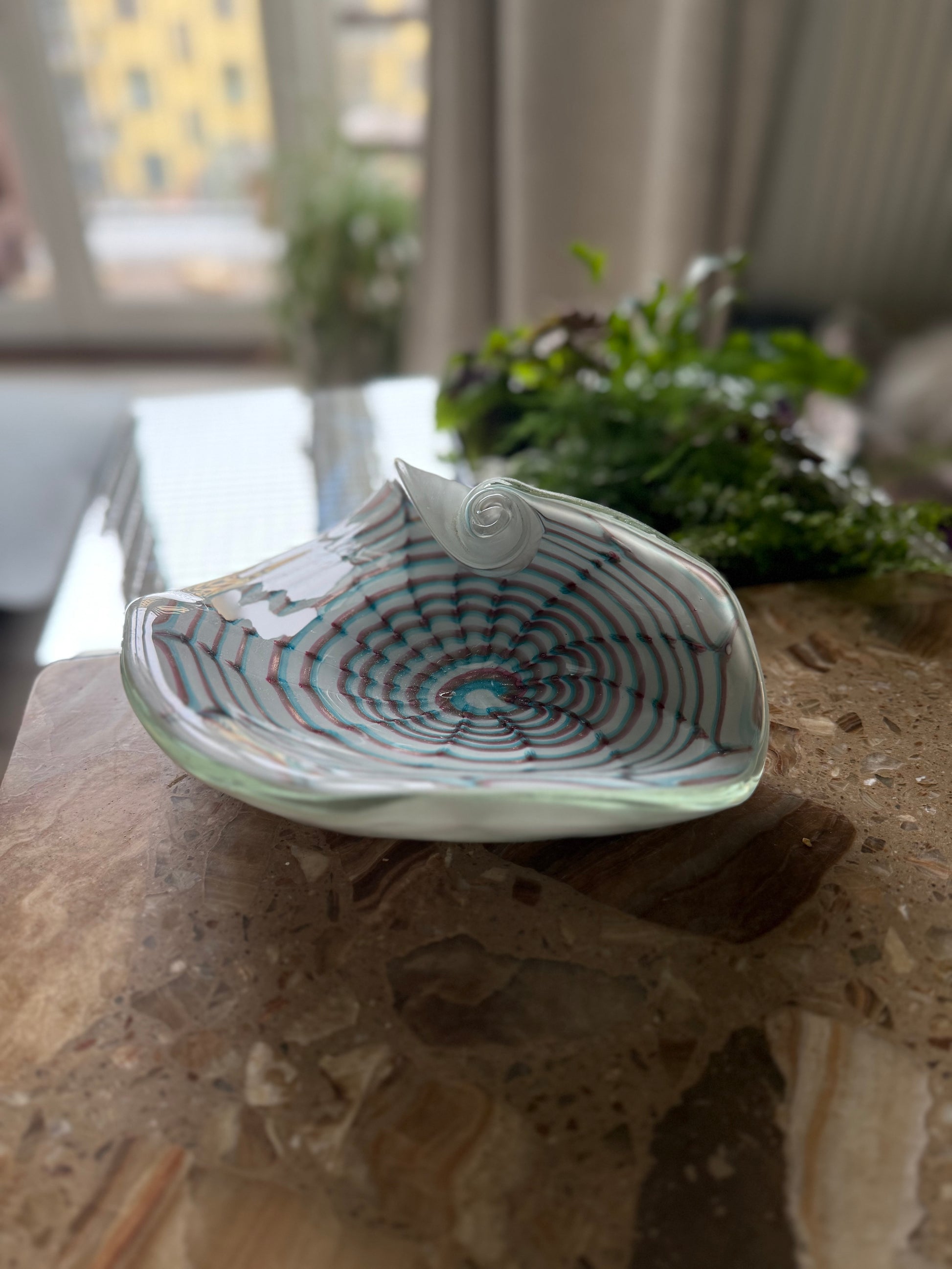 Absurd smuk skål på en hvid base med smukt bordeaux og blåt farvespil. Skålens kant er rullet og krøllet som en konkylie eller musling - virkelig et særsyn. Med en bredde på 22cm og en højde på 8cm kan skålen bruges til lidt af hvert, om det er til nøgler, smykker eller chili på køkkenbordet. Skålen har en lille glasbobbel som man kan mærke ved overfladen.