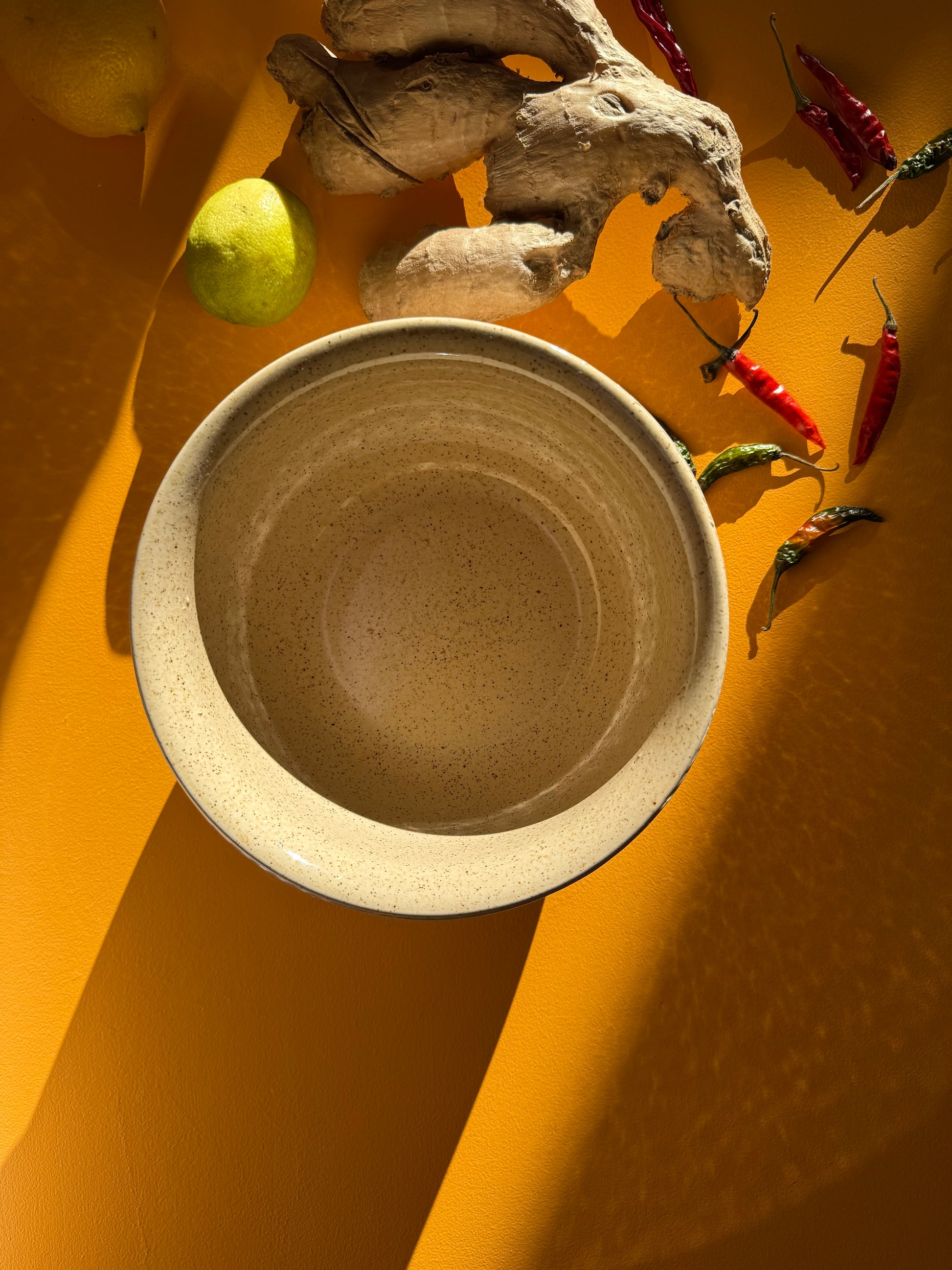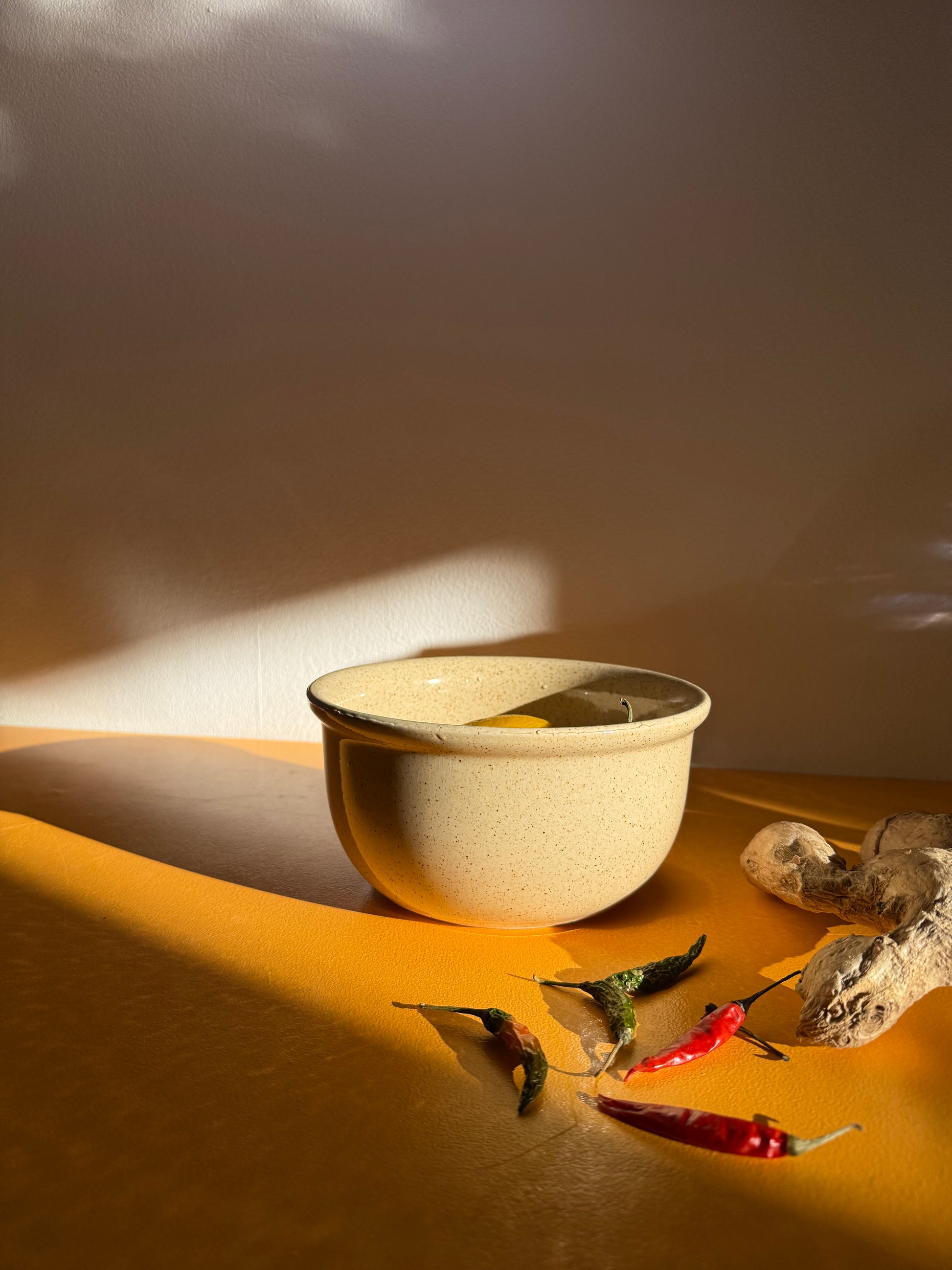 Lækker dyb skål i lertøj med en blød beige nistret glasur. Skålen er i flot stand og måler 9,5 på tværs og 8,5 i højden.