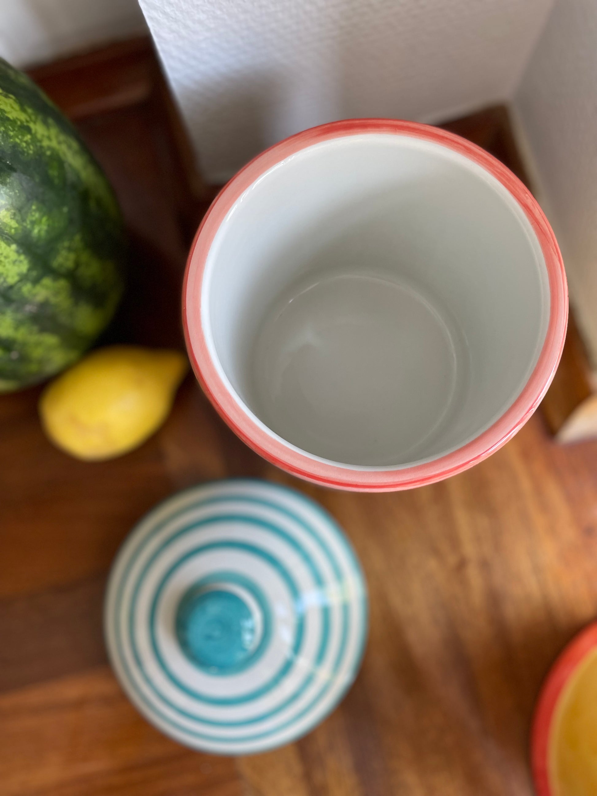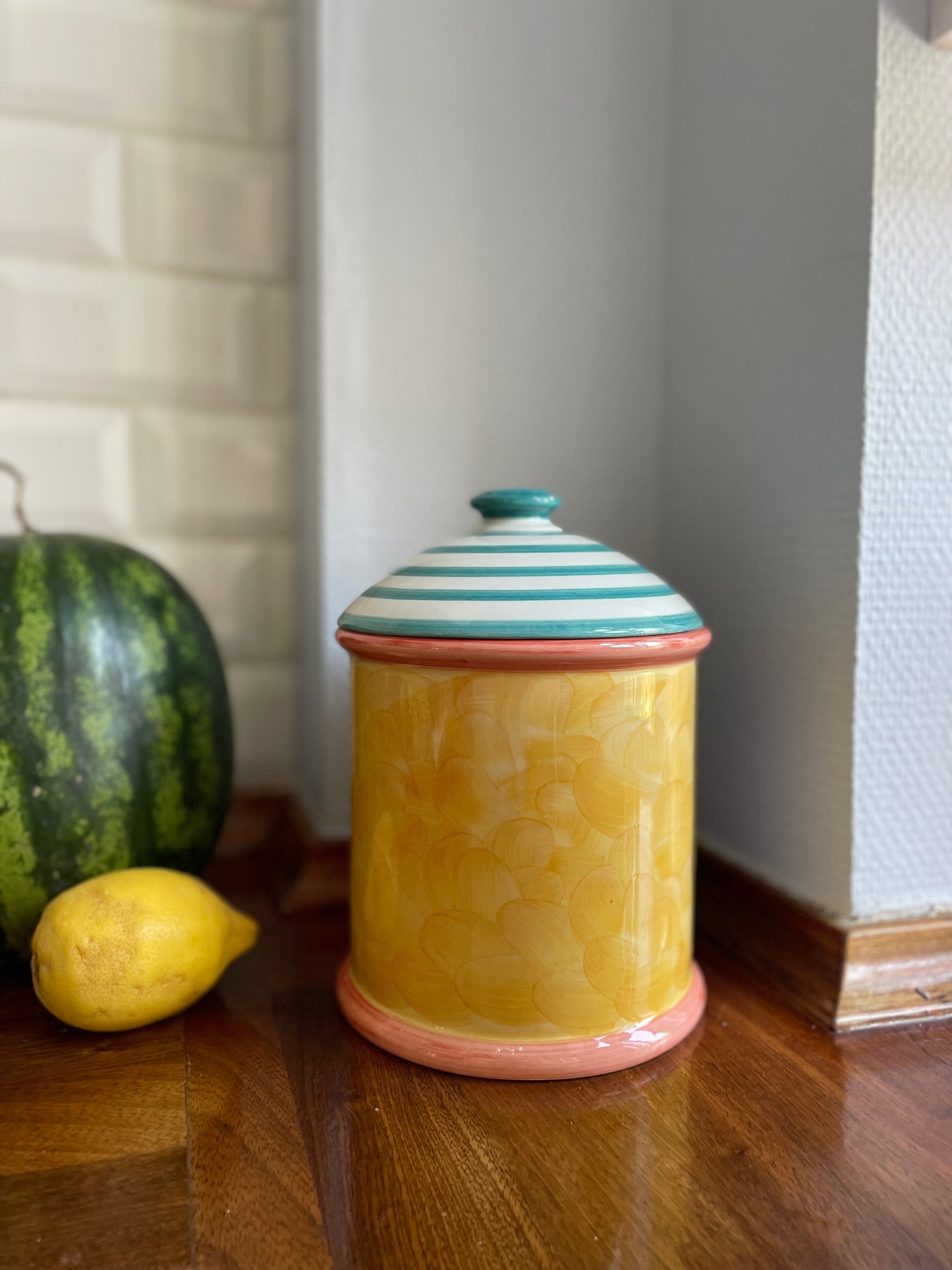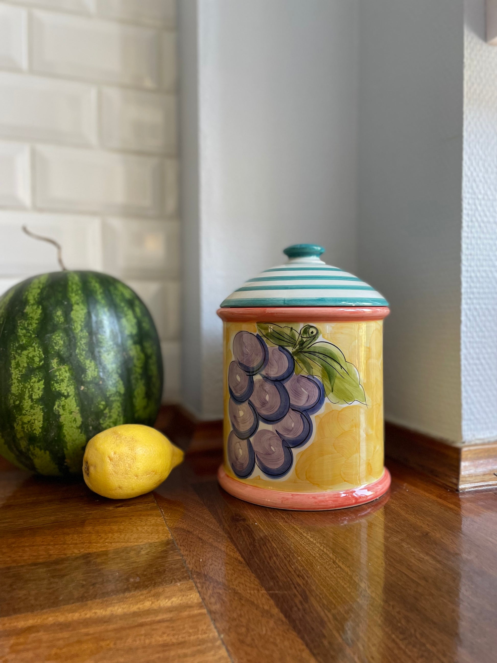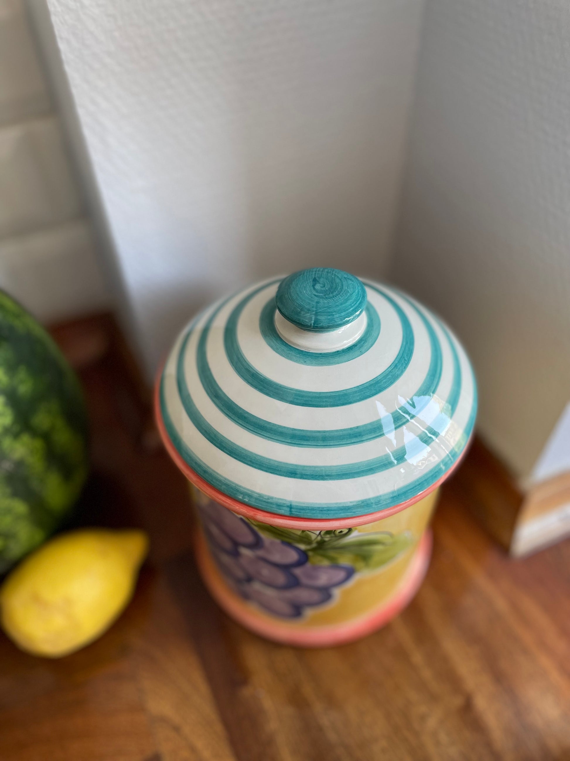 Lækker portugisisk krukke til havregryn på køkkenbordet. Her bruger vi i al fald vores egen. 21,5cm høj og 15cm bred. Håndmalet med brede gule strøg og lilla vindruer. Eneste brugsspor er en lille prik på håndtaget.