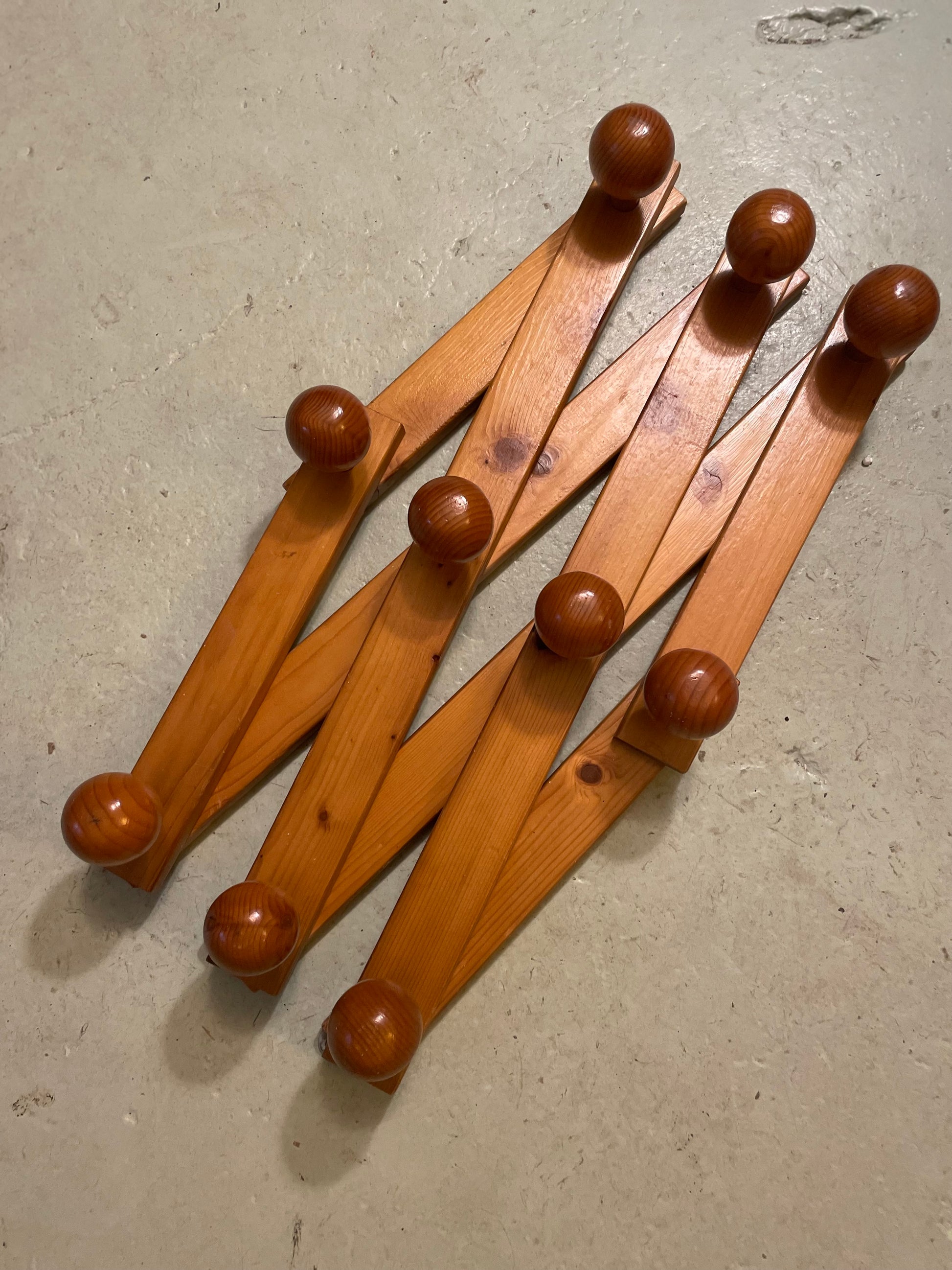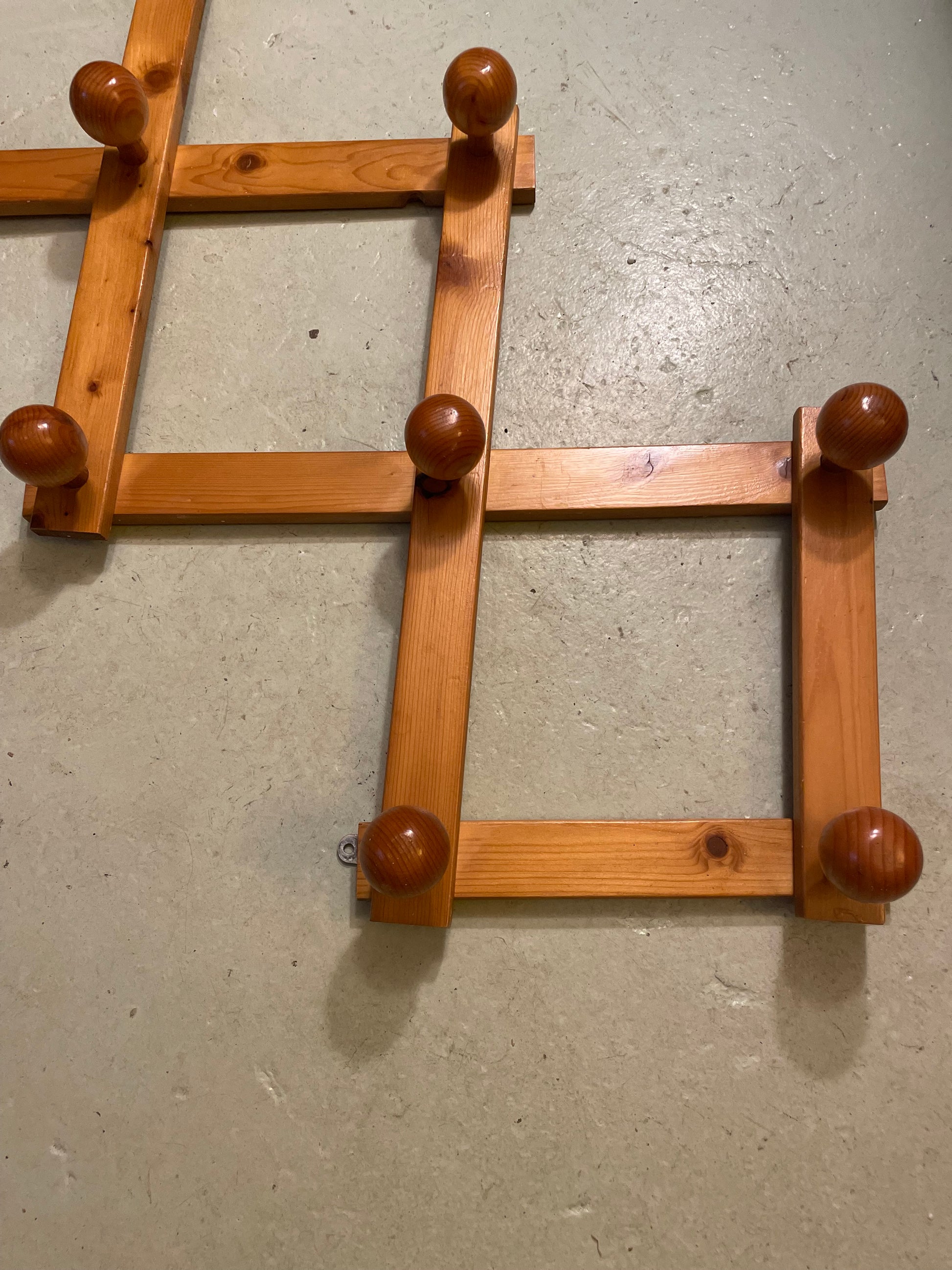 Flot stor sakseknagerække i fyr med 8 knager. Kommer i flor stand med almindelige brugsspor. Der er påsæt 2 beslag til opsætning. Knagen kan laves lang eller kort alt efter ønske. Såfremt man strækker den til at alle firkanter er helt kvadratiske måler den 1m i længden og 40cm i højden.