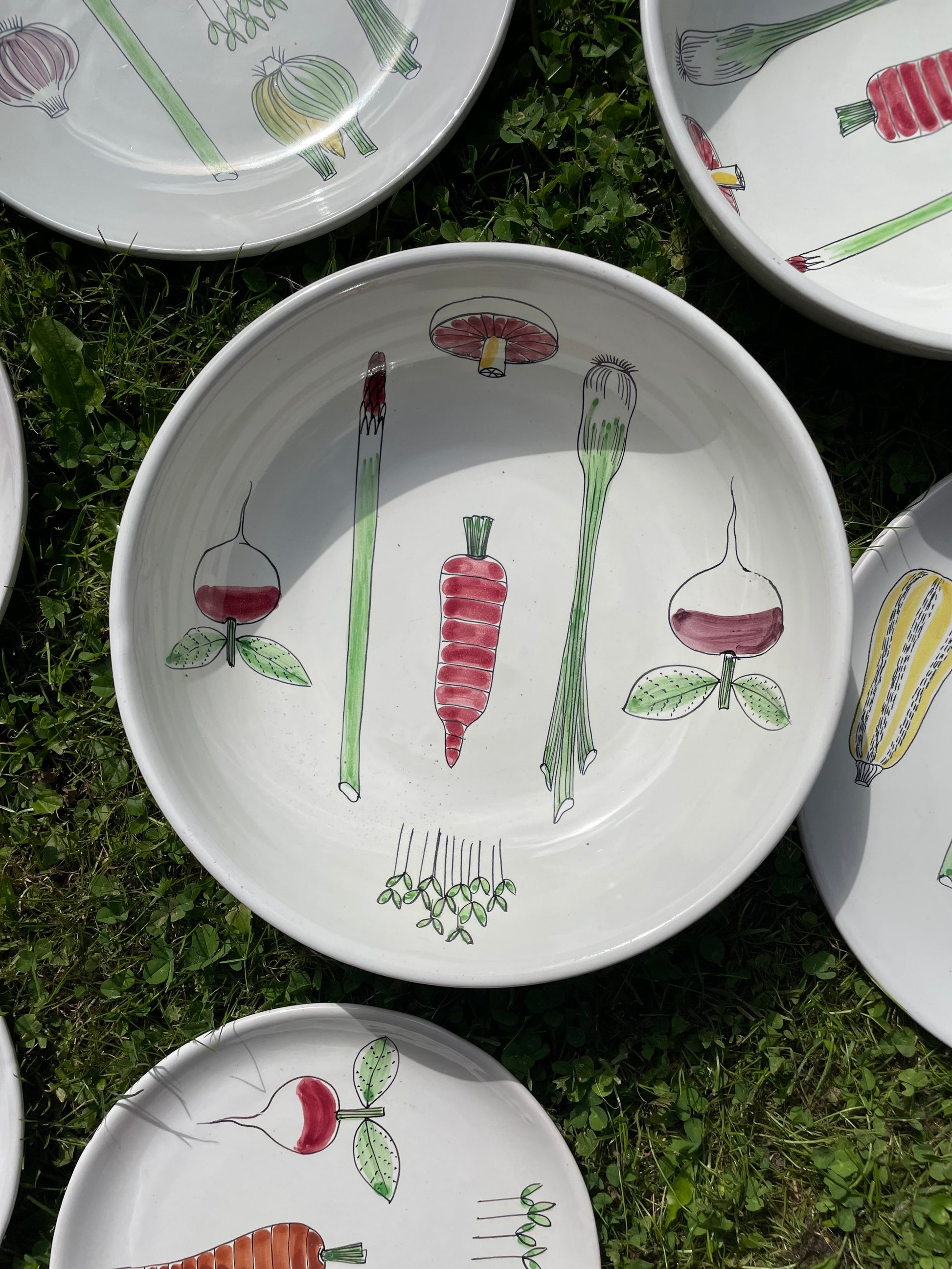 Smuk skål til servering. I hvid med glaserede grøntsager. Skålen er i flot stand og måler 23cm i bredden og 7cm i højden.