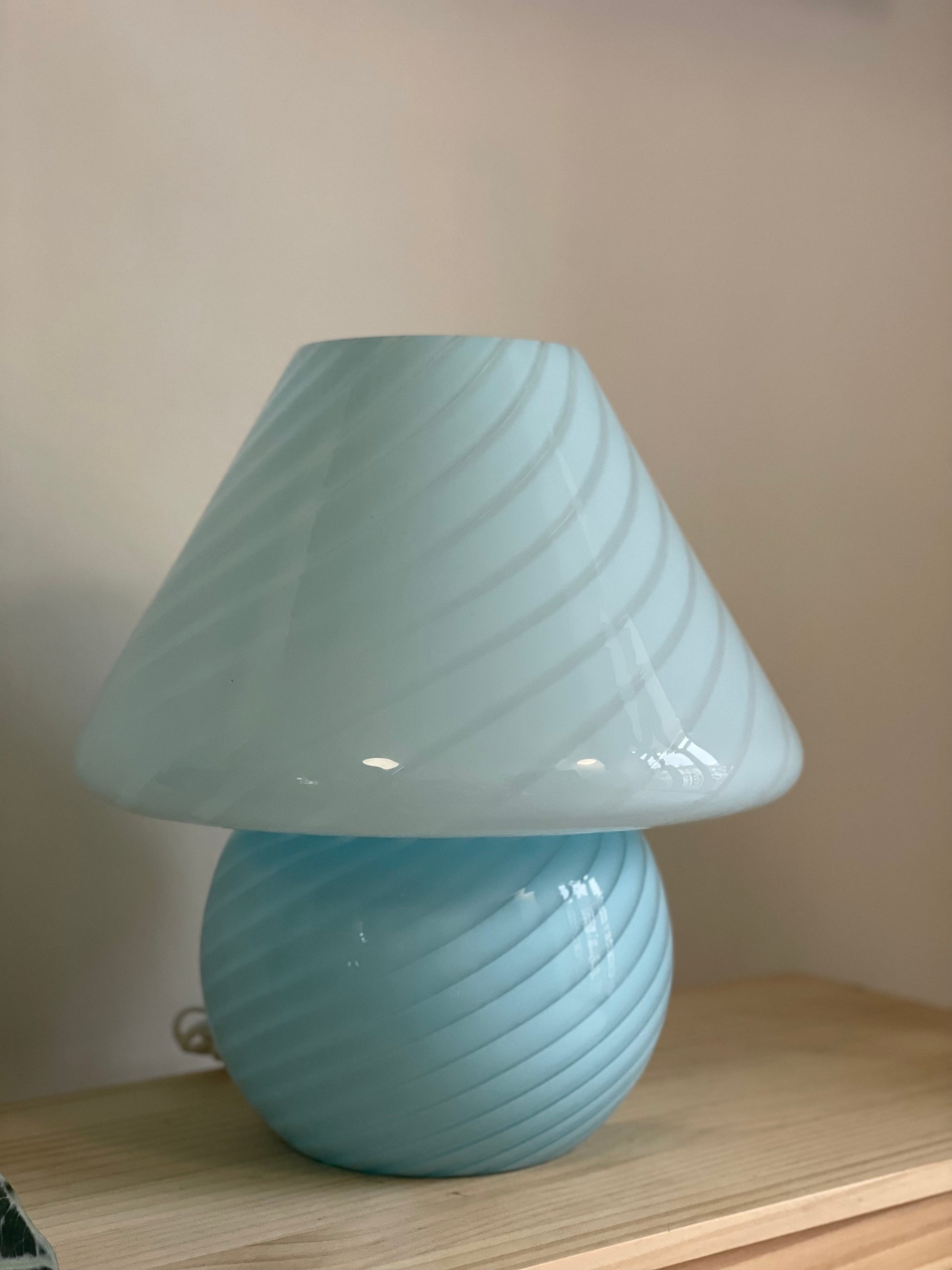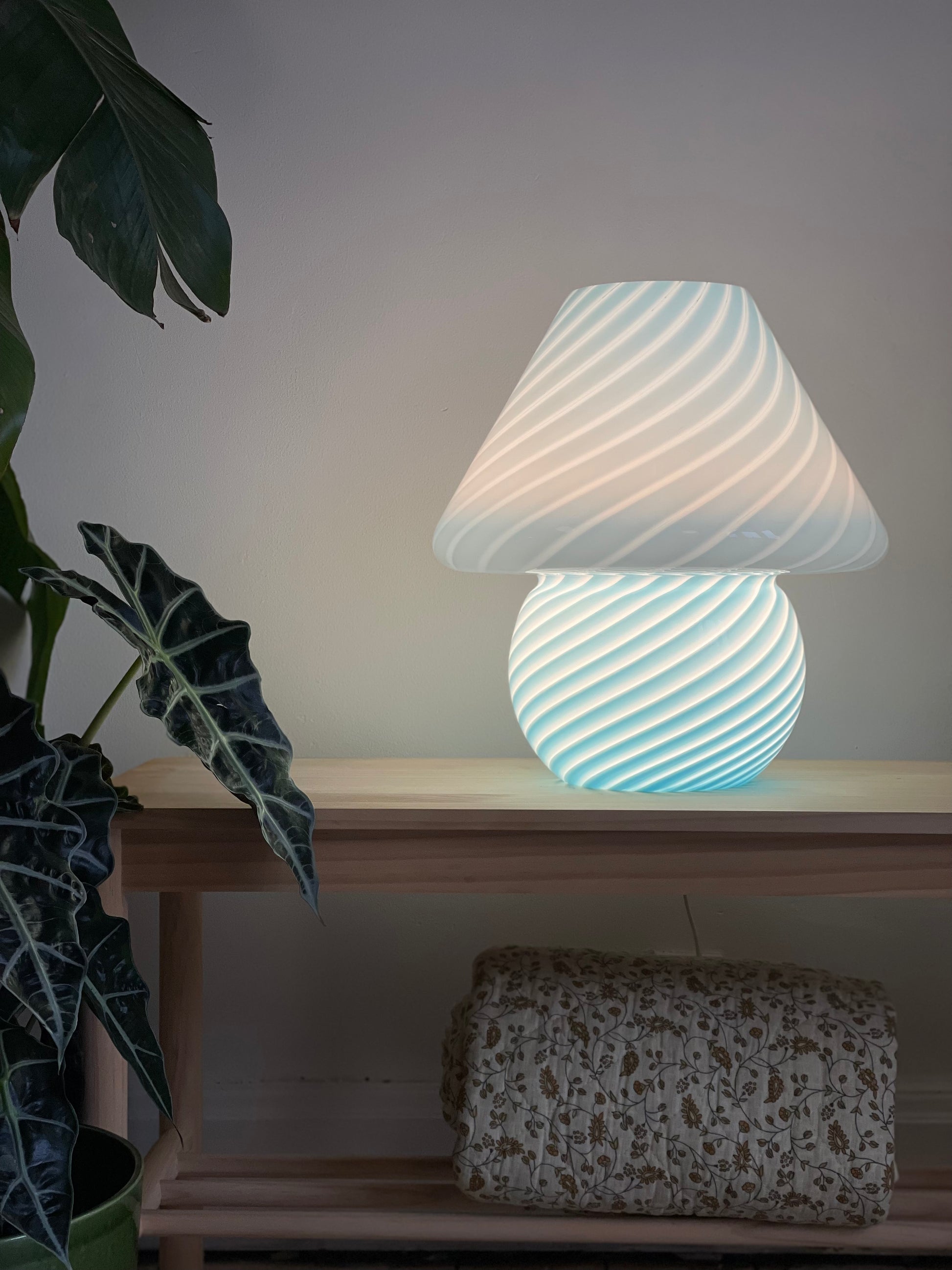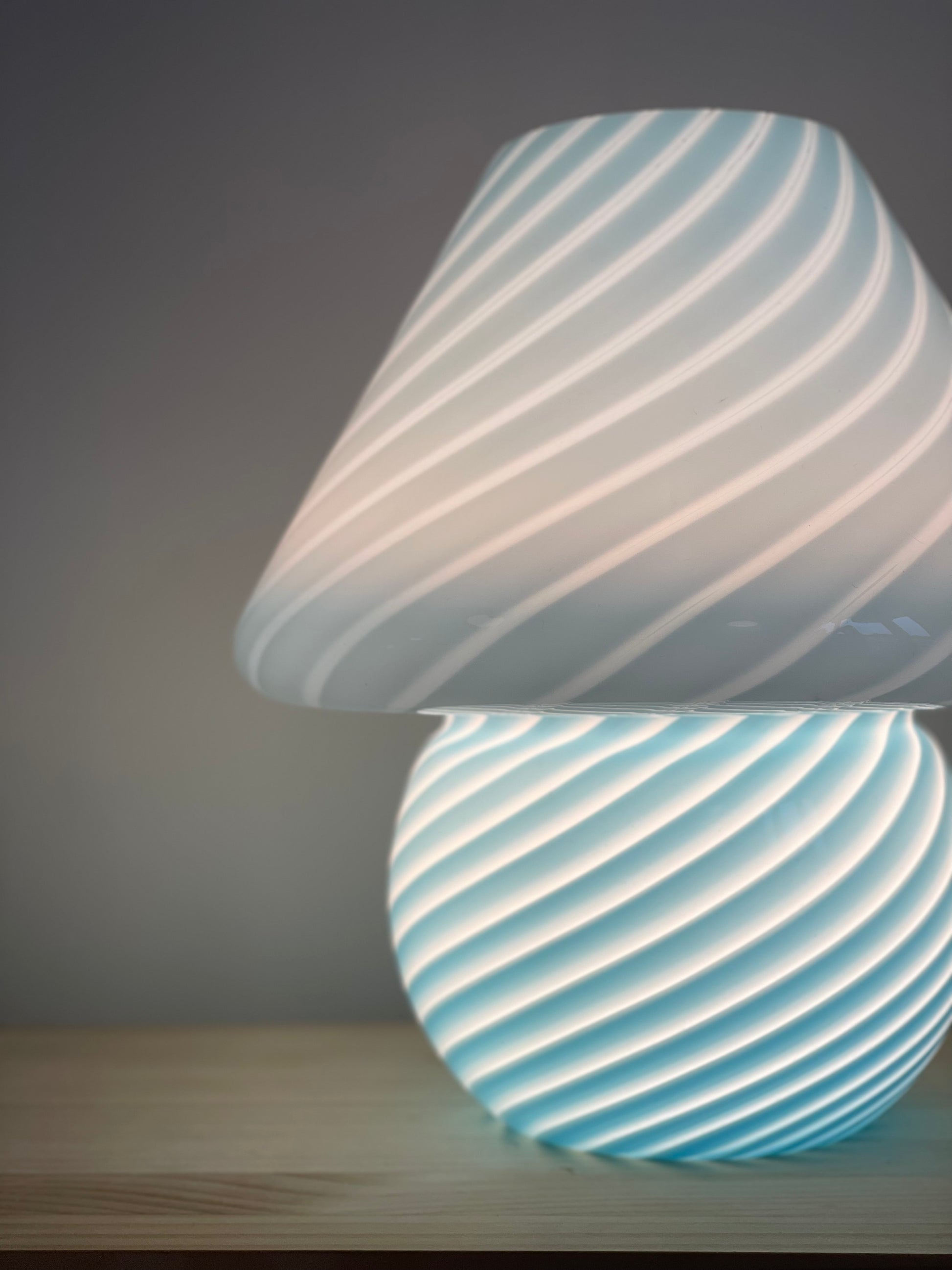 Vintage Vetri Murano mushroom bordlampe i den helt store størrelse på 37cm. Lampen er i pæn vintage stand og kommer med ny ledning. Den bruger 1 styks e27 pære.