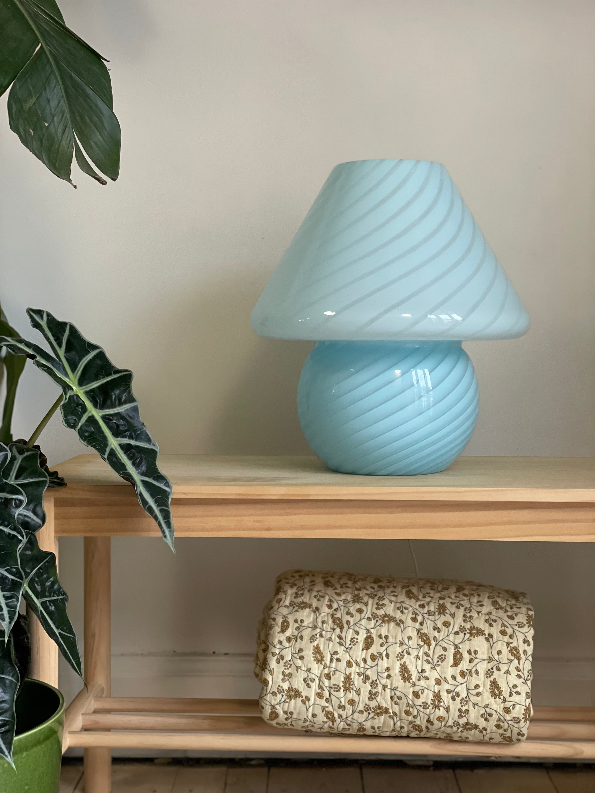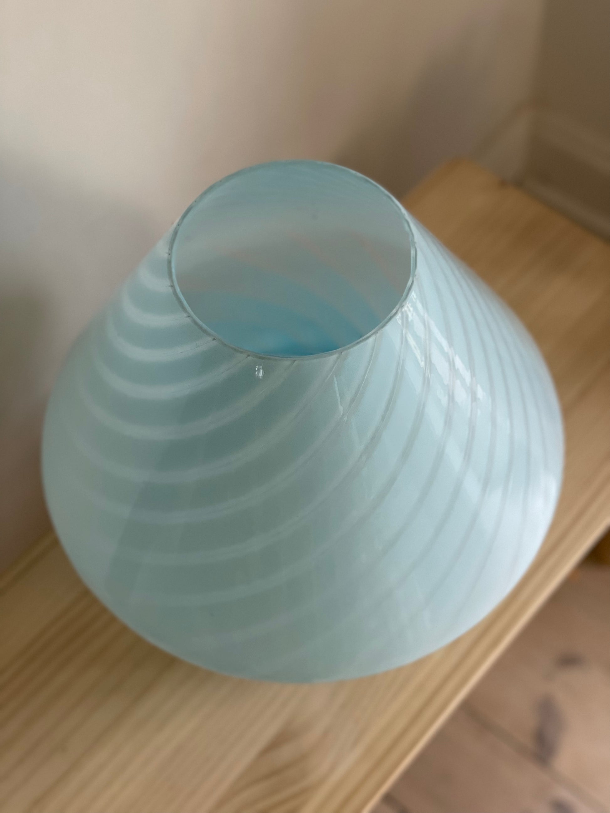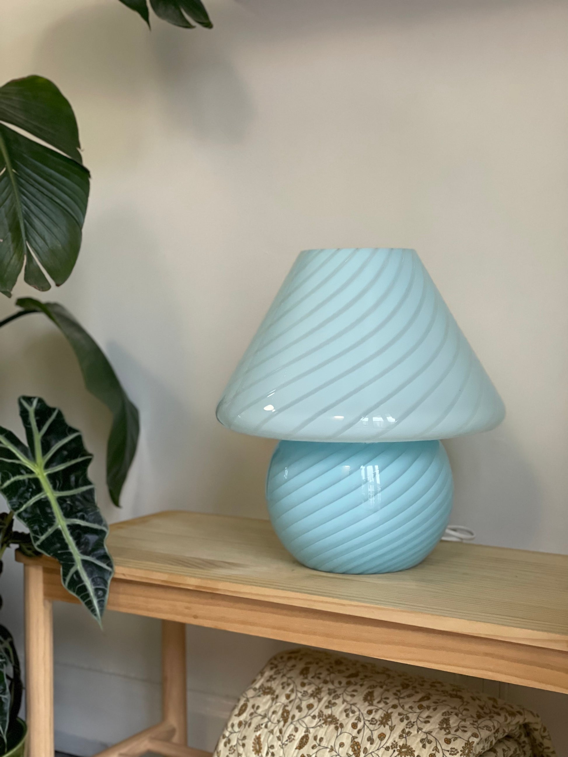 Vintage Vetri Murano mushroom bordlampe i den helt store størrelse på 37cm. Lampen er i pæn vintage stand og kommer med ny ledning. Den bruger 1 styks e27 pære.