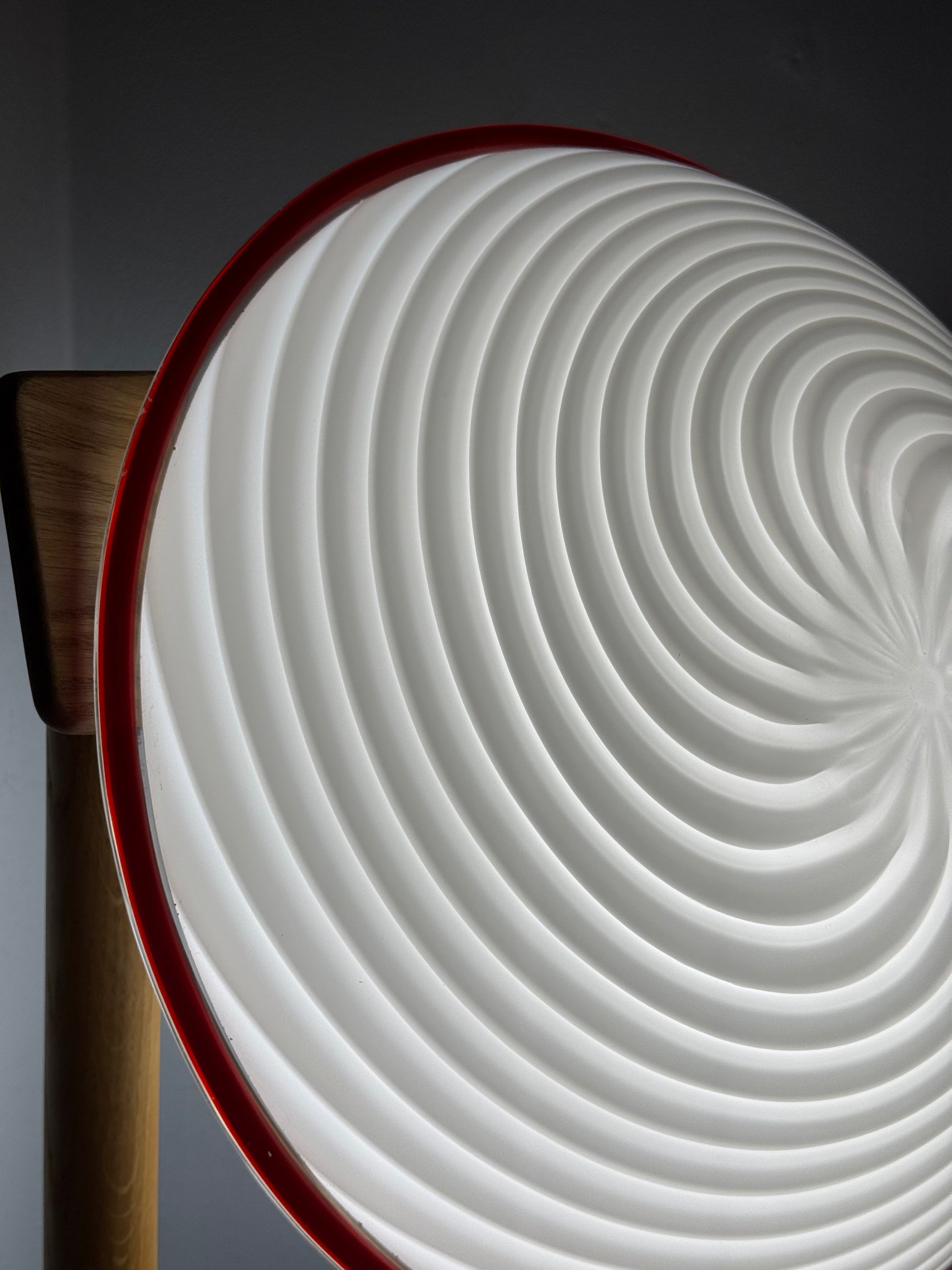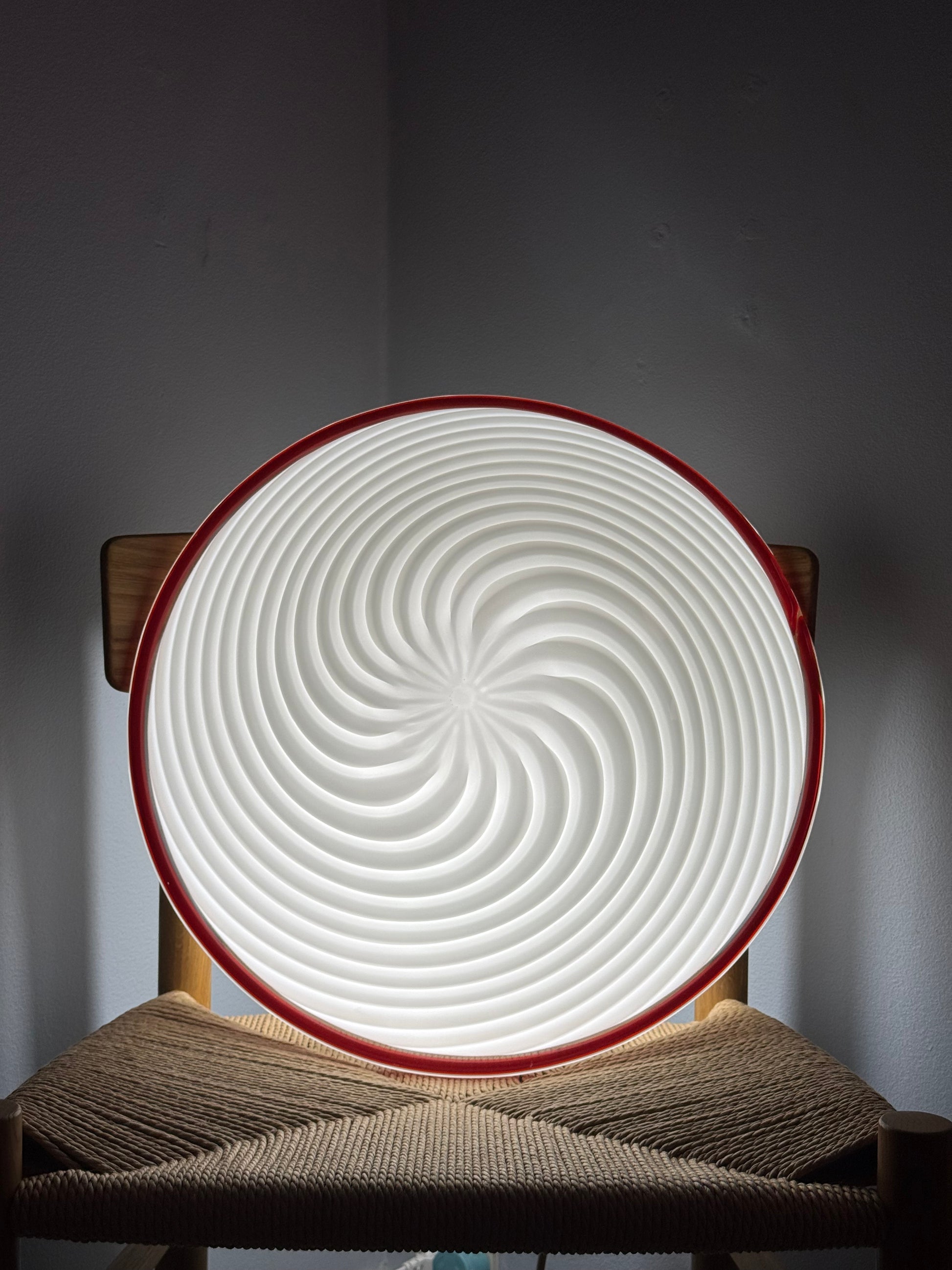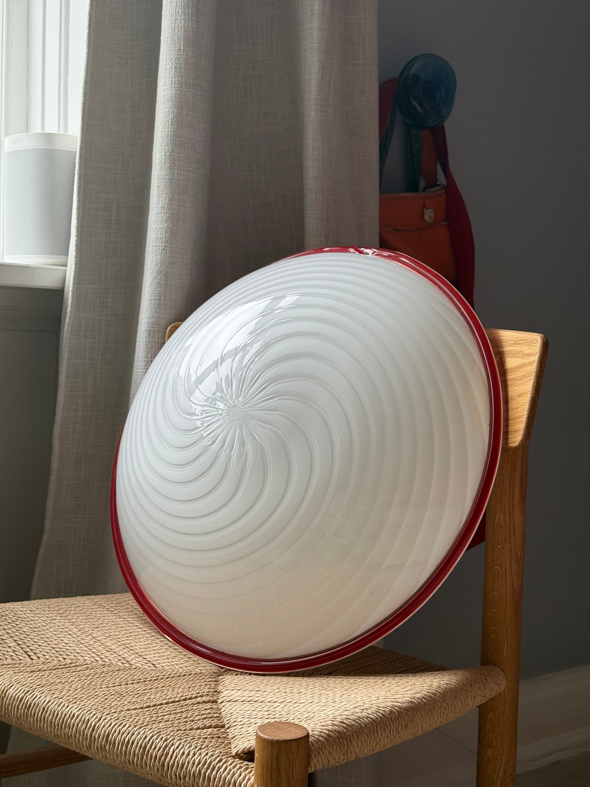 Udformet i mælkehvidt glas med kraftig swirl og med en finish af rødt glas langs kanten. Absolut et stilikon!