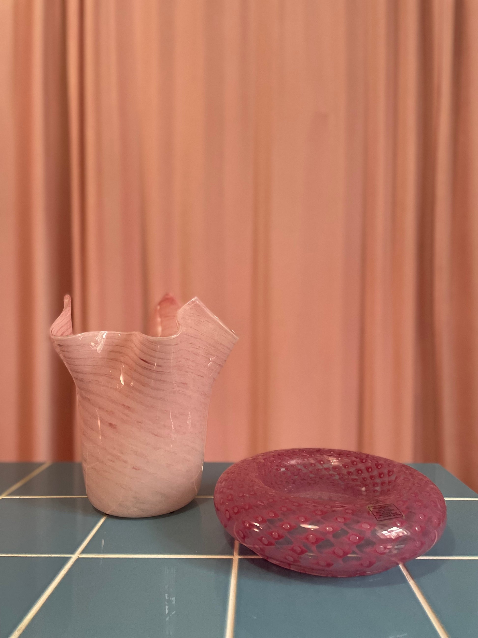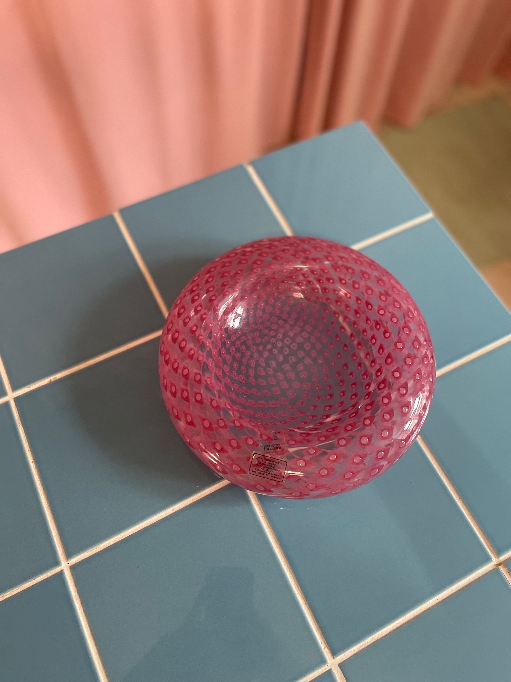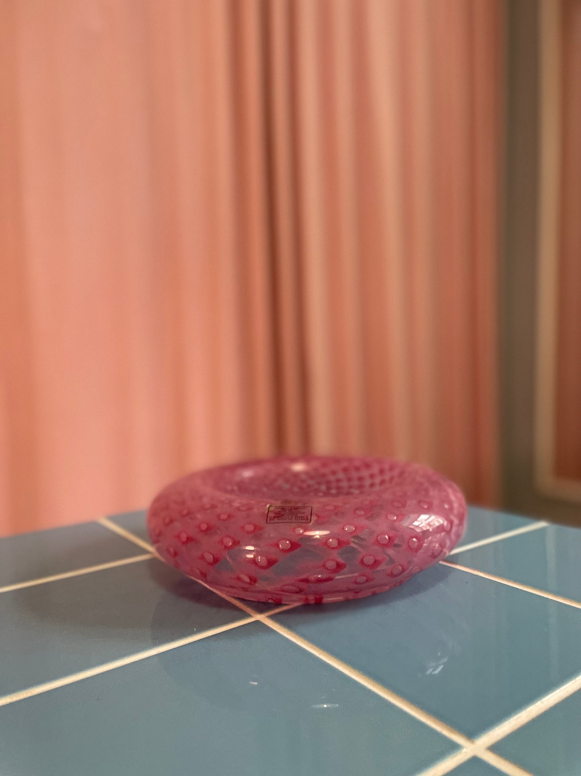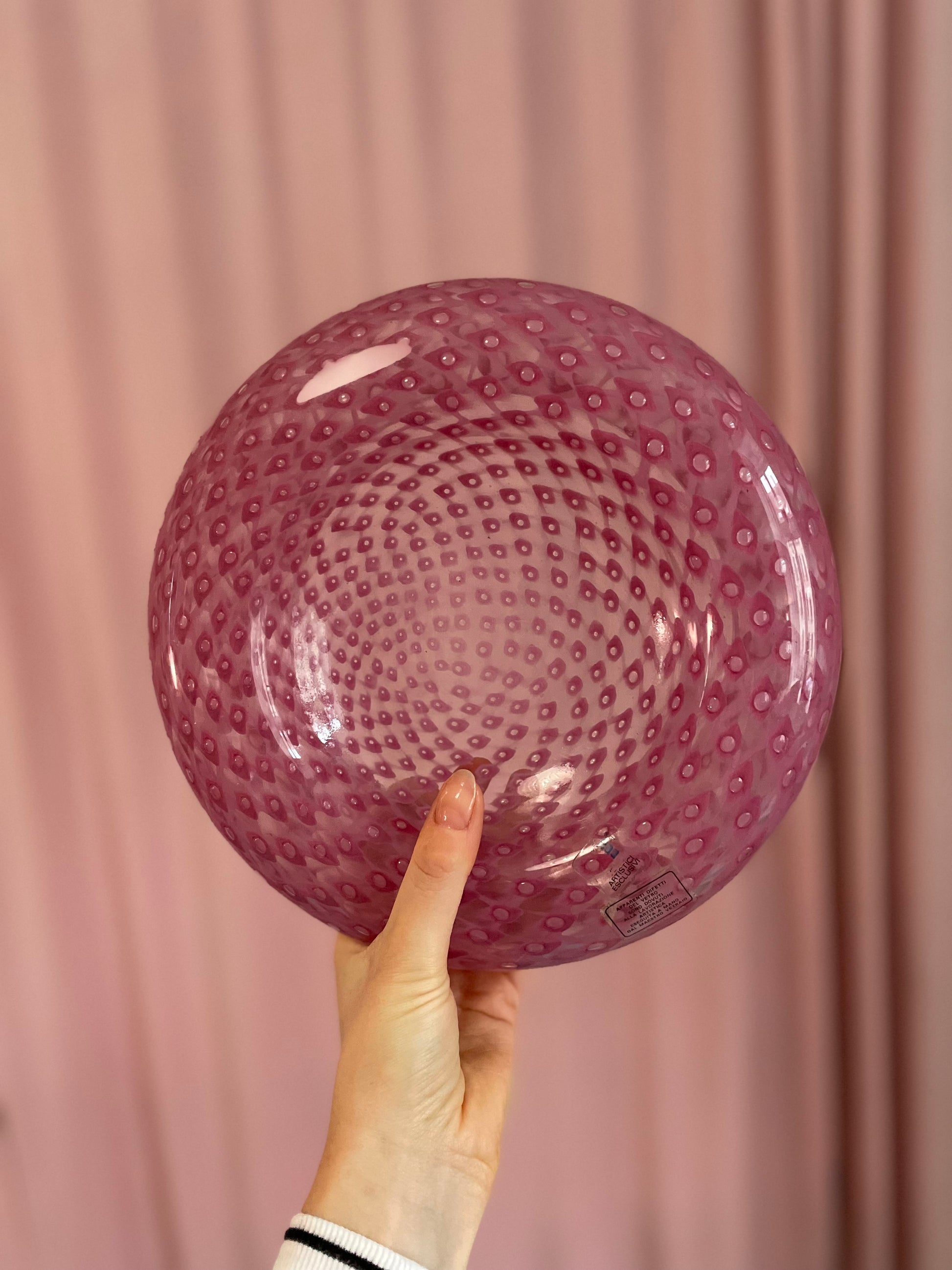 Pink vintage Murano glasskål måler 24cm i bredden og 7cm i højden. Denne smukke skål står uden brugsspor og med sit originale Murano klistermærke.