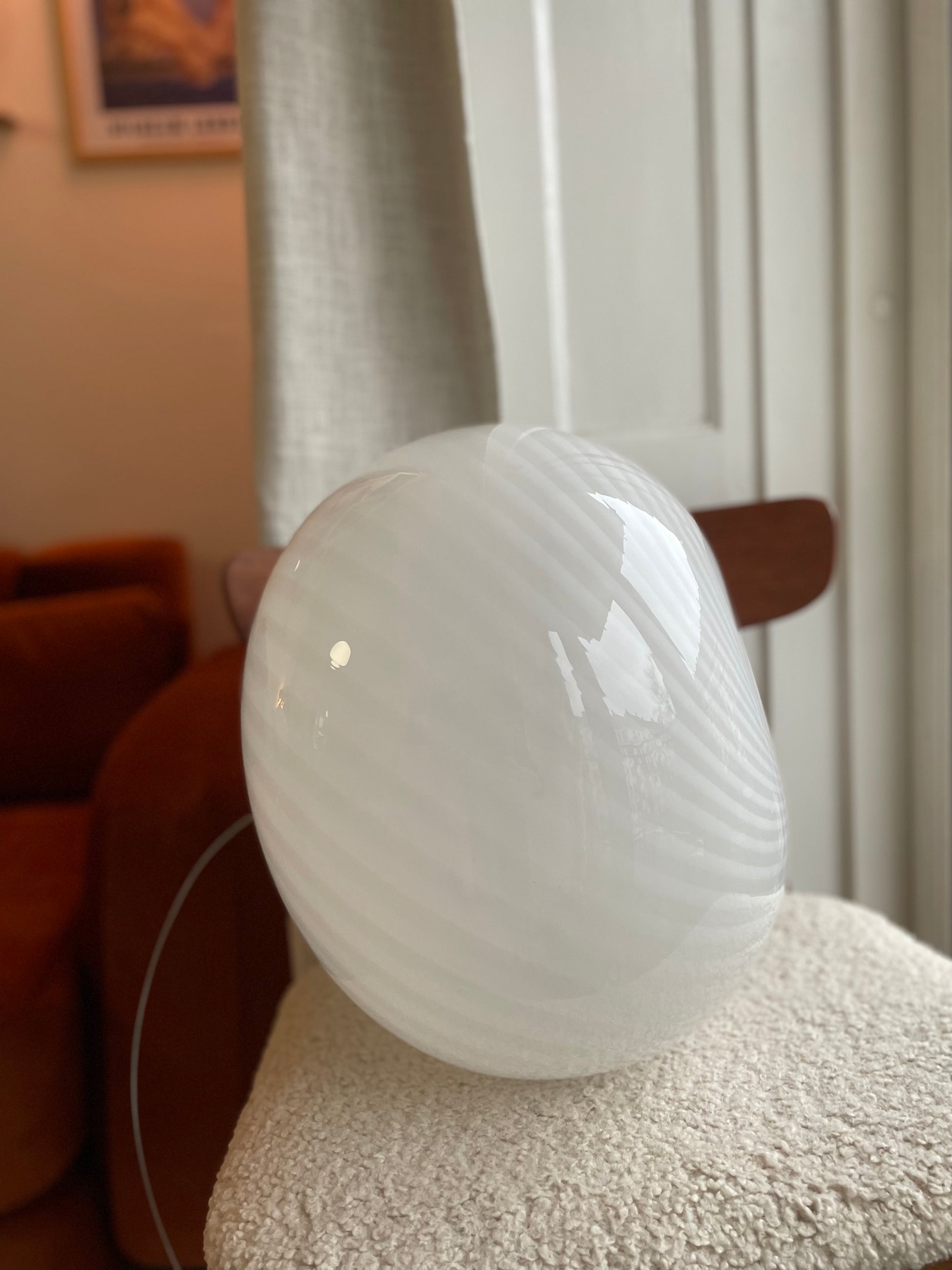 Oval pendel i hvidt vintage Murano glas med swirl mønster. Lampen måler 38cm i bredden og fremstår flad i bunden med unaturligt smuk swirl! Lampen kommer desuden med hvidt ophæng.