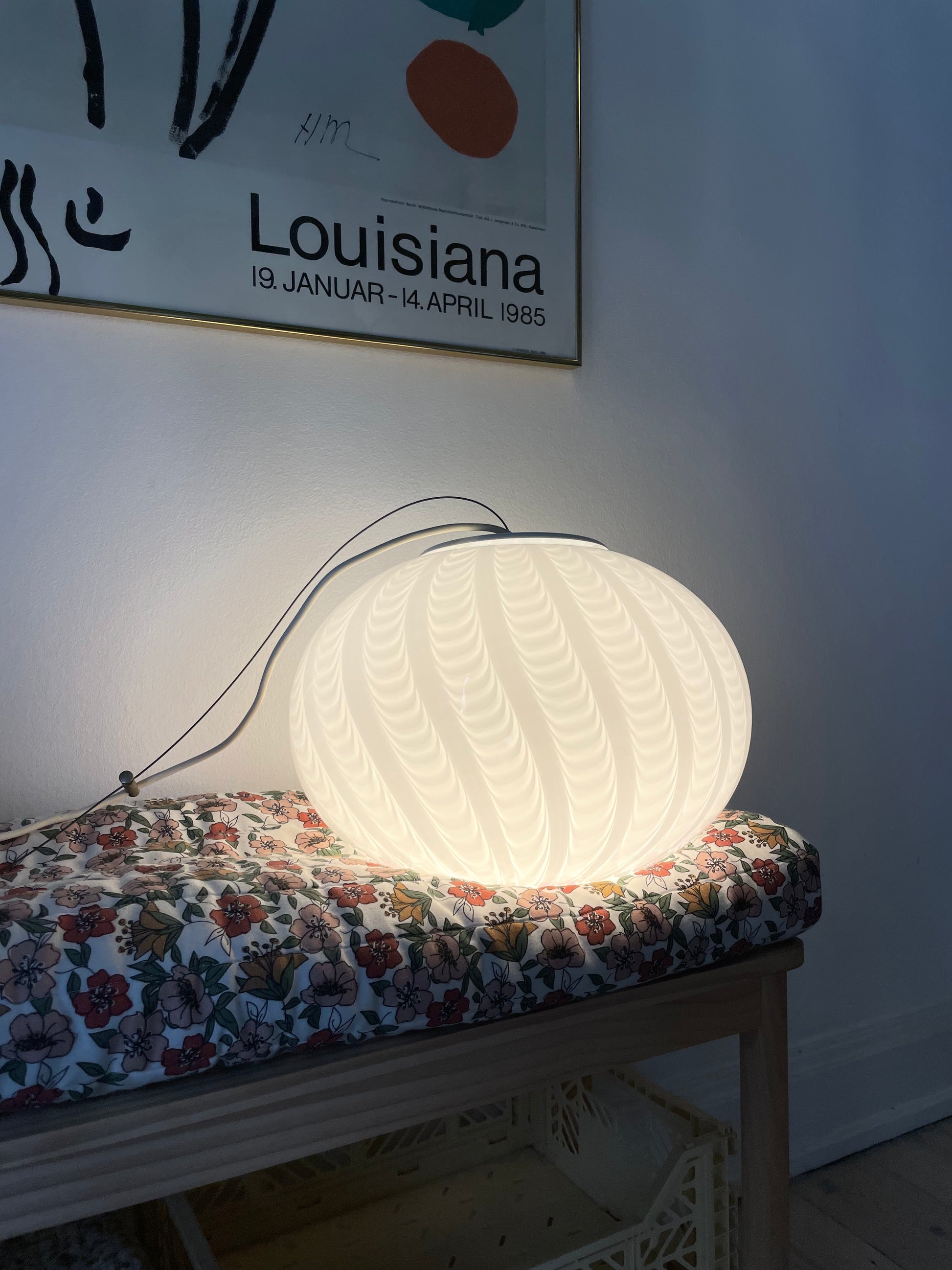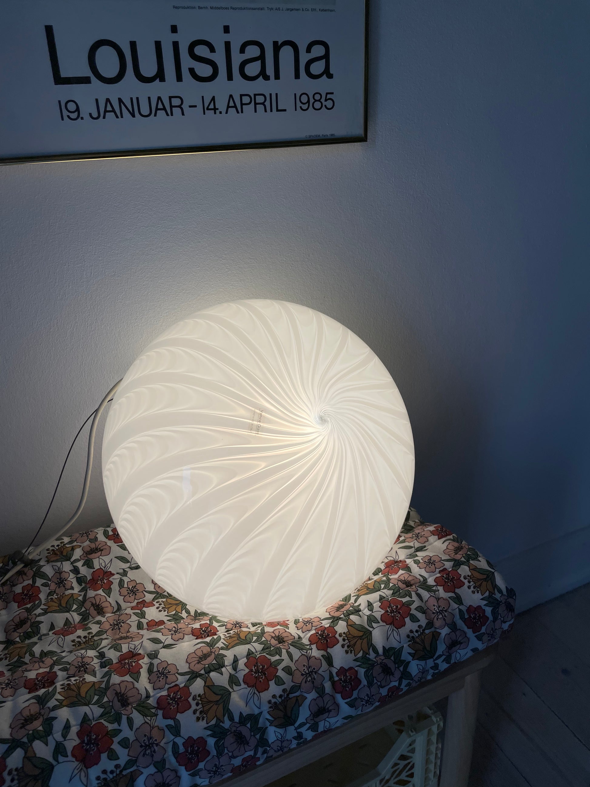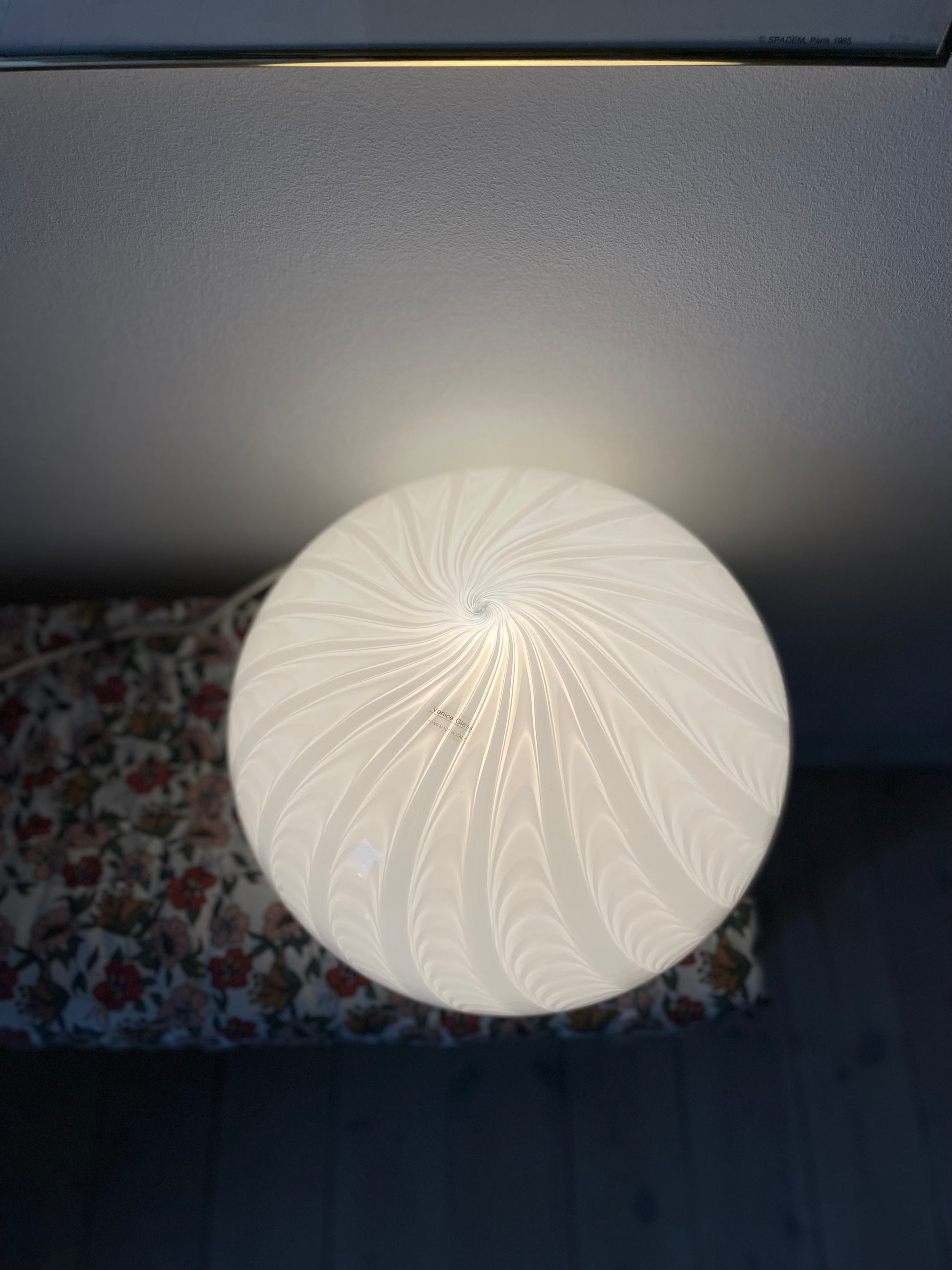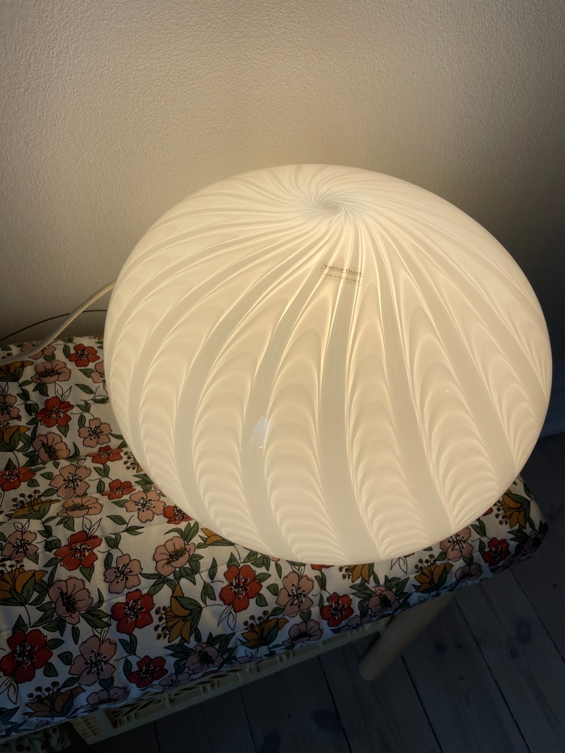 Fantastisk vintage Murano loftlampe med peacock mønster. Lampen er oval og måler 35cm i bredden og 25cm i højden. Den kommer med hvidt greb og bruger 1 styks e27 pære. Desuden kommer pendlen med originalt klistermærke.