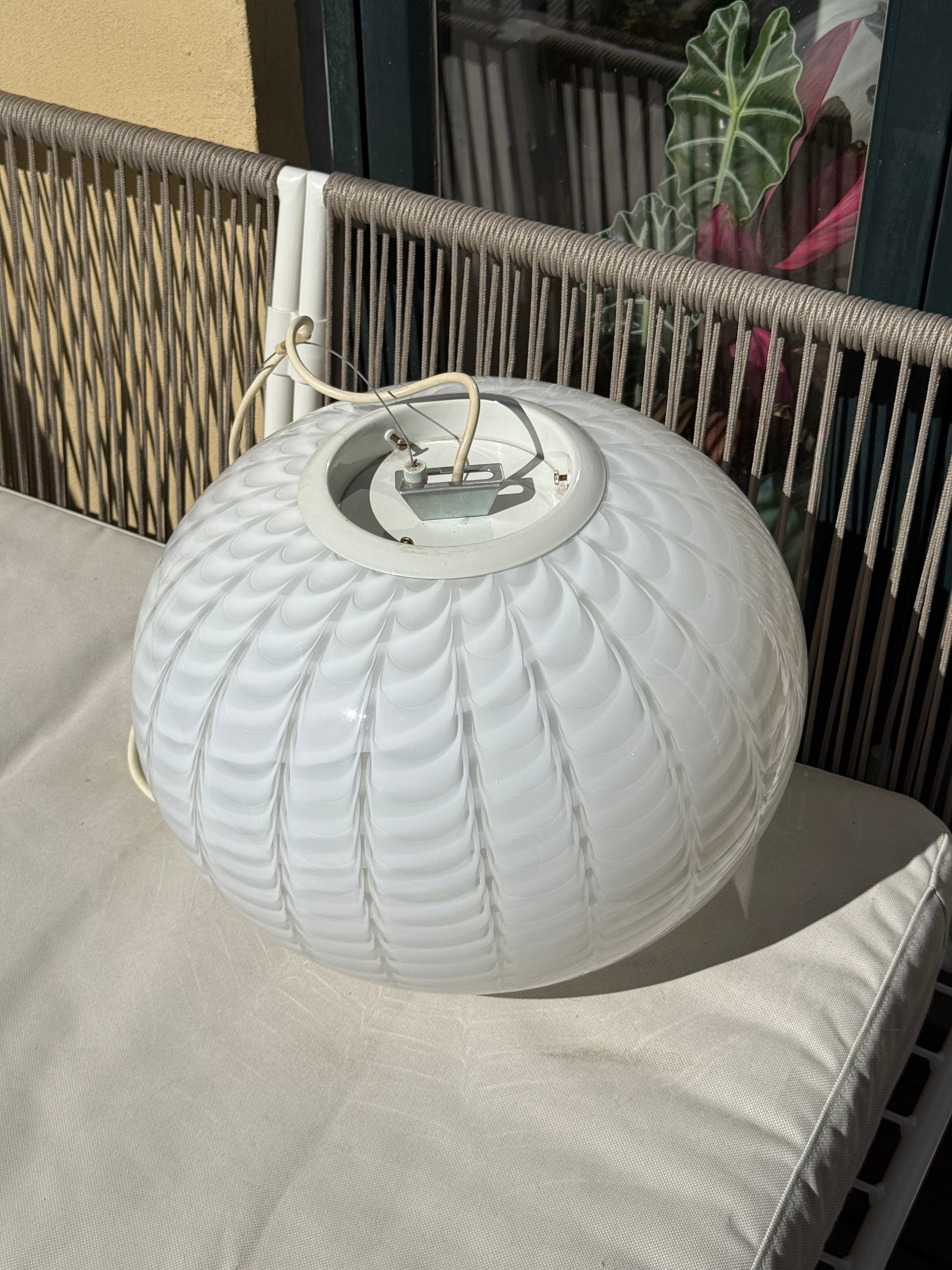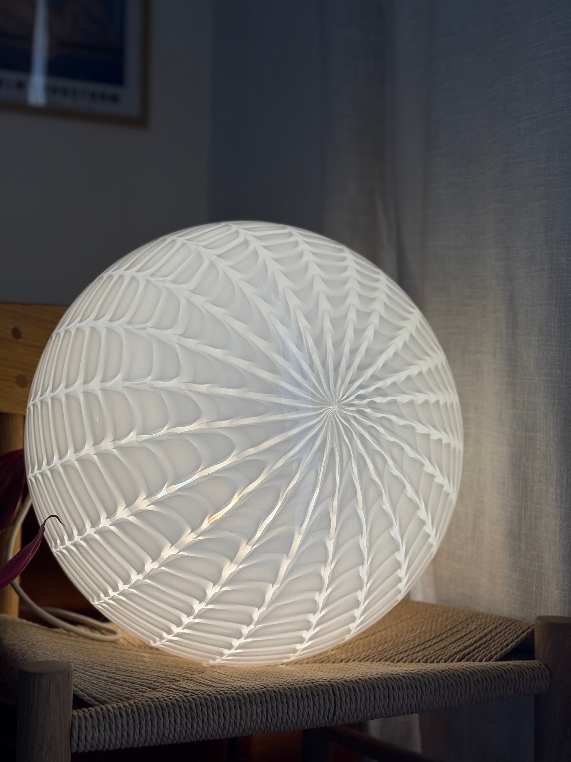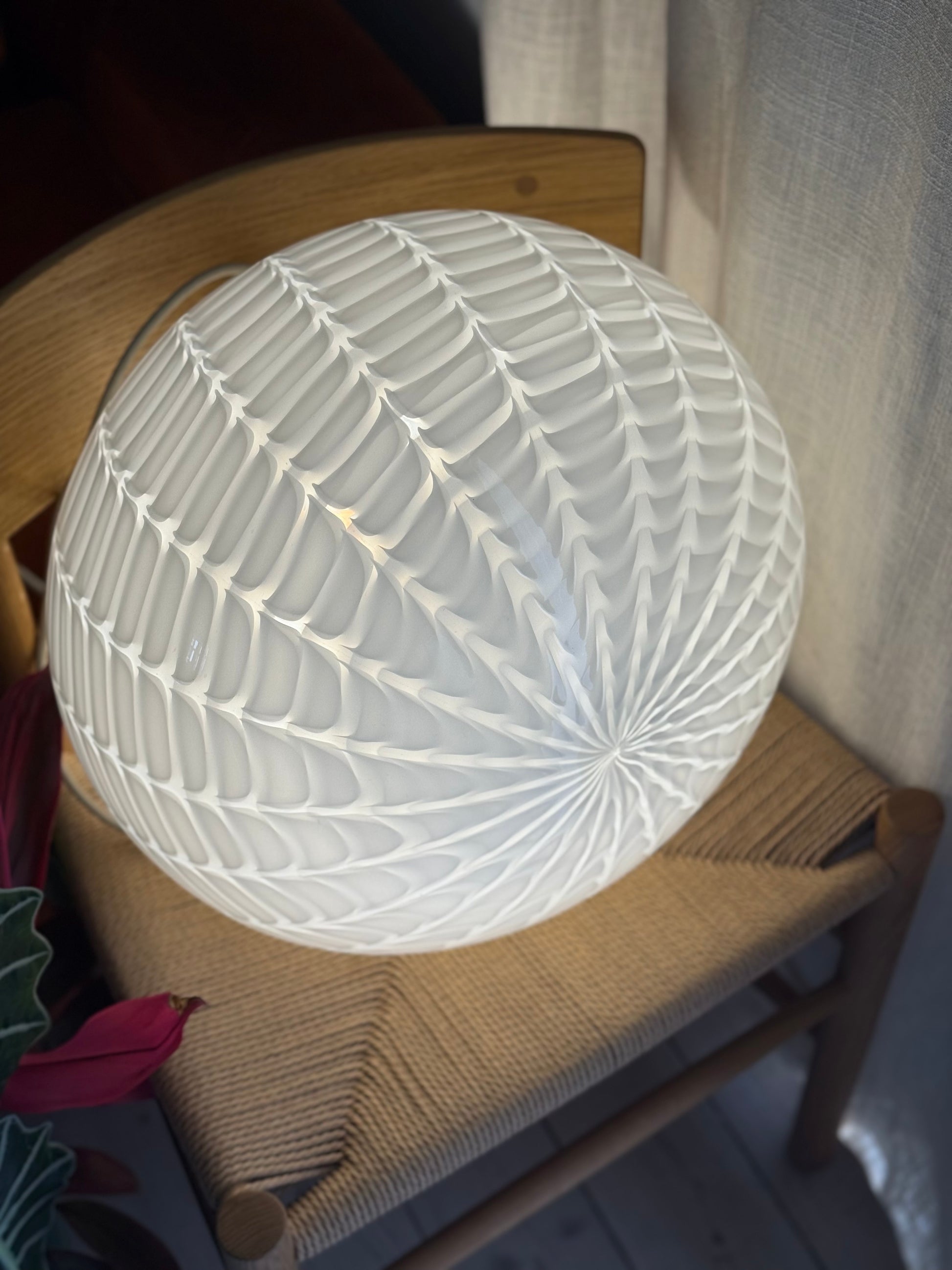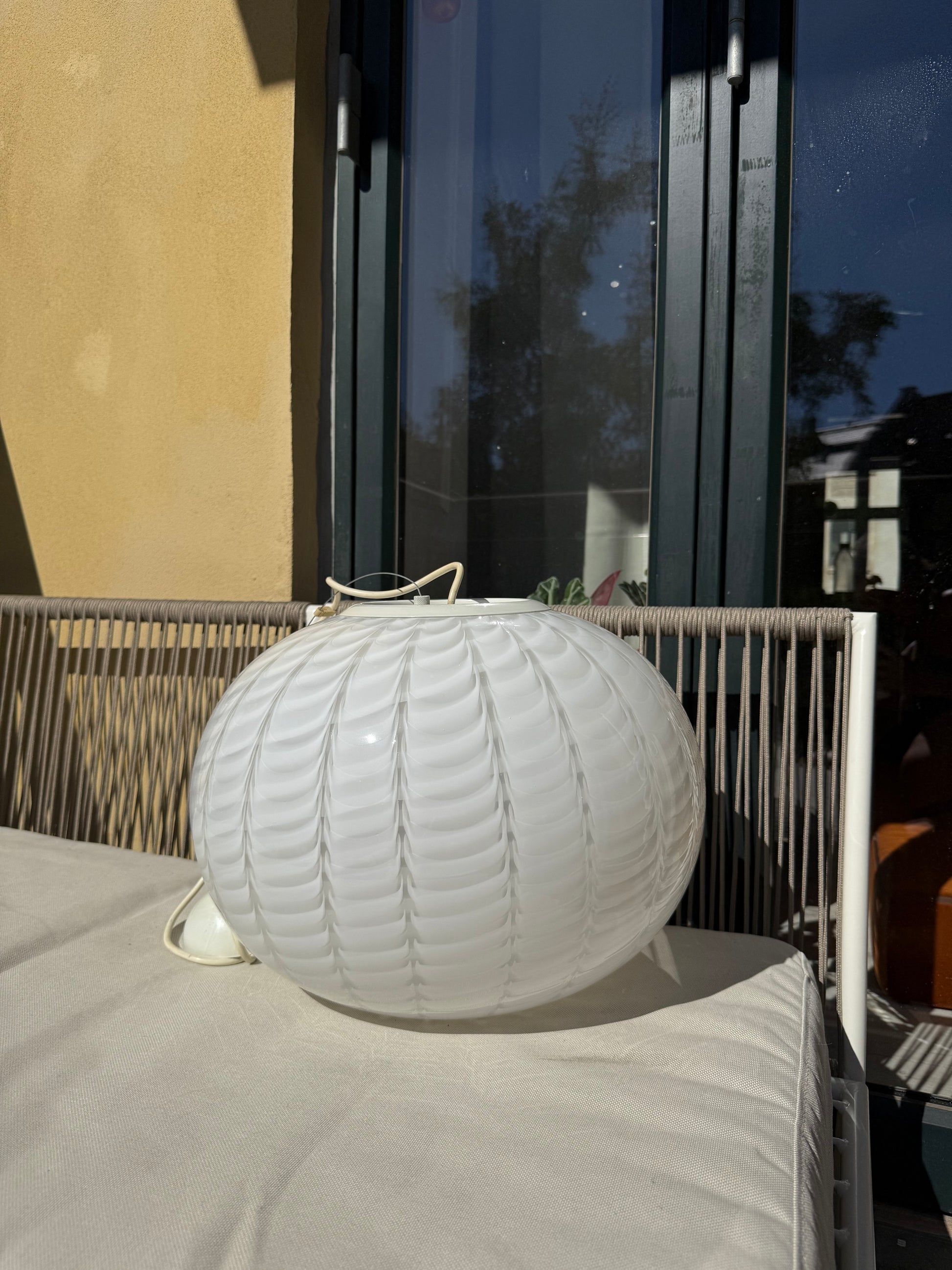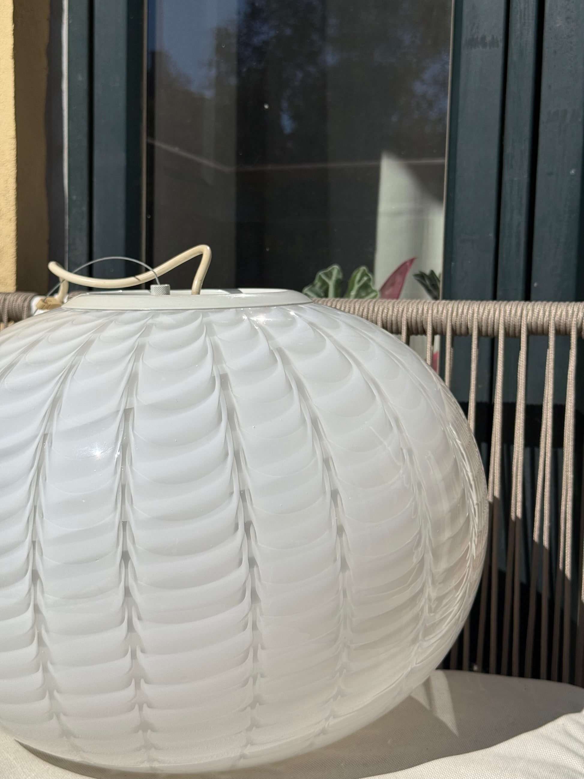 Denne vintage lampe direkte fra Murano står med sit peacock mønsker utroligt smuk. Den er håndlavet i 1960/1970 og det gode håndværk kan både ses og mærkes i strukturen. Lampen er oval og måler hele 42cm i diameter og kommer med hvidt greb.