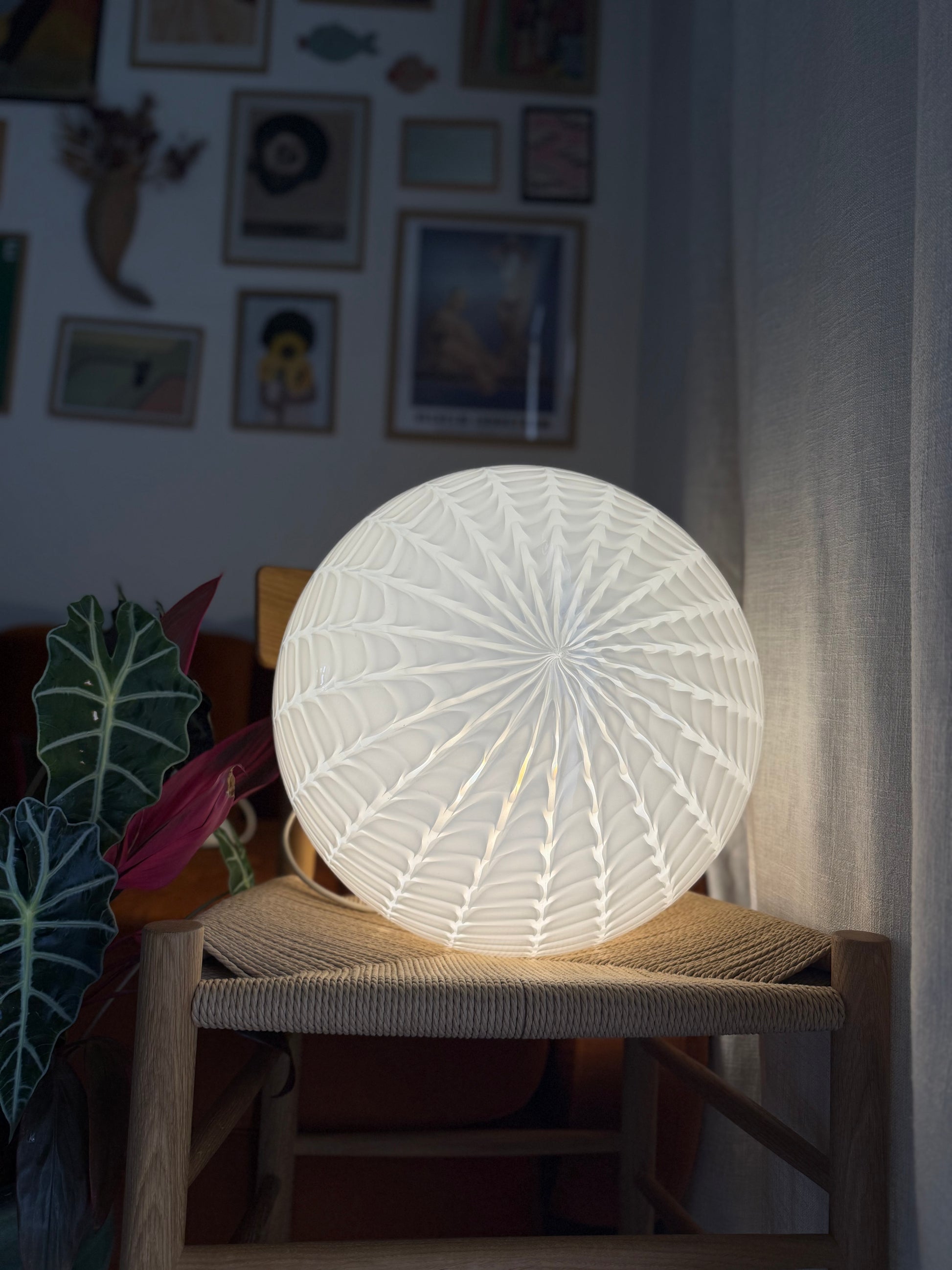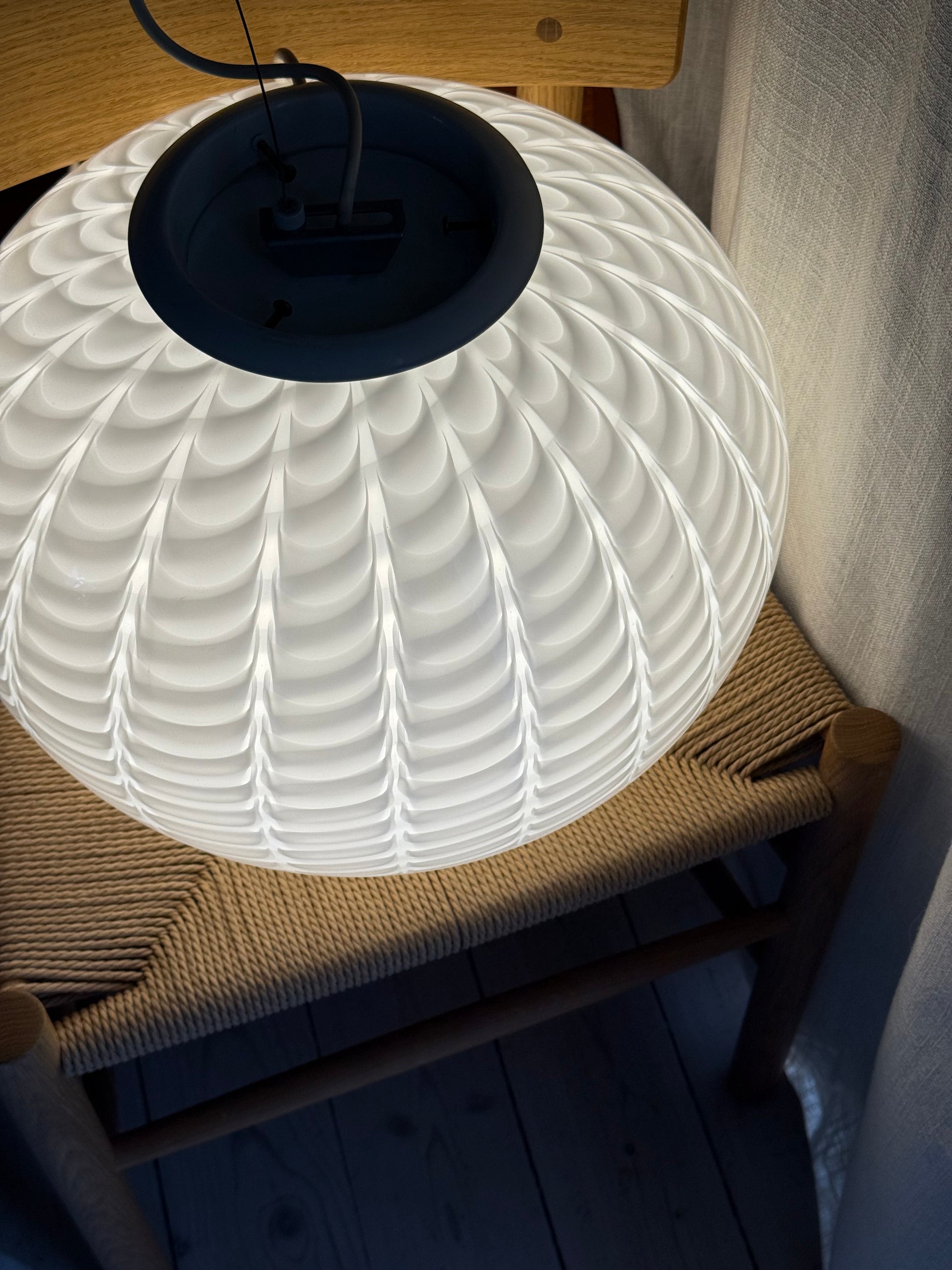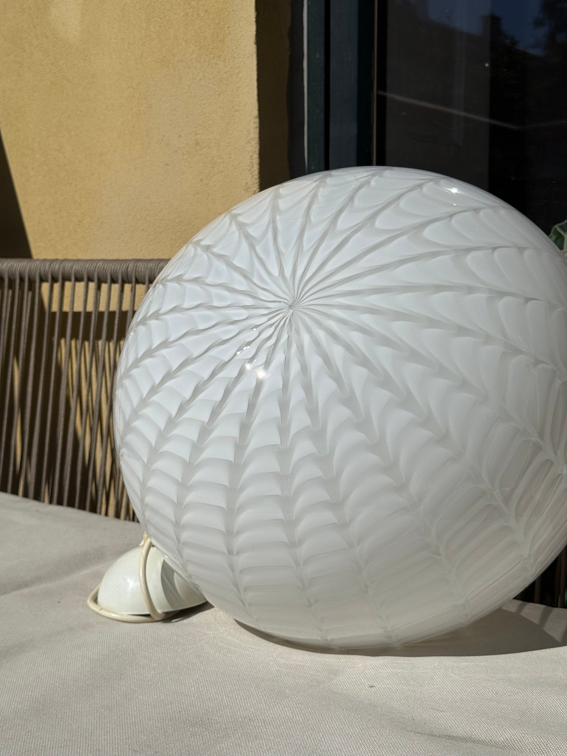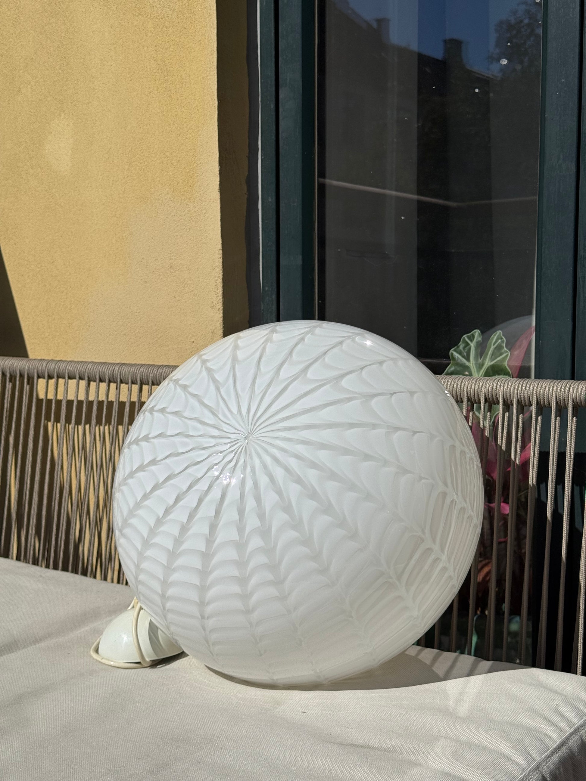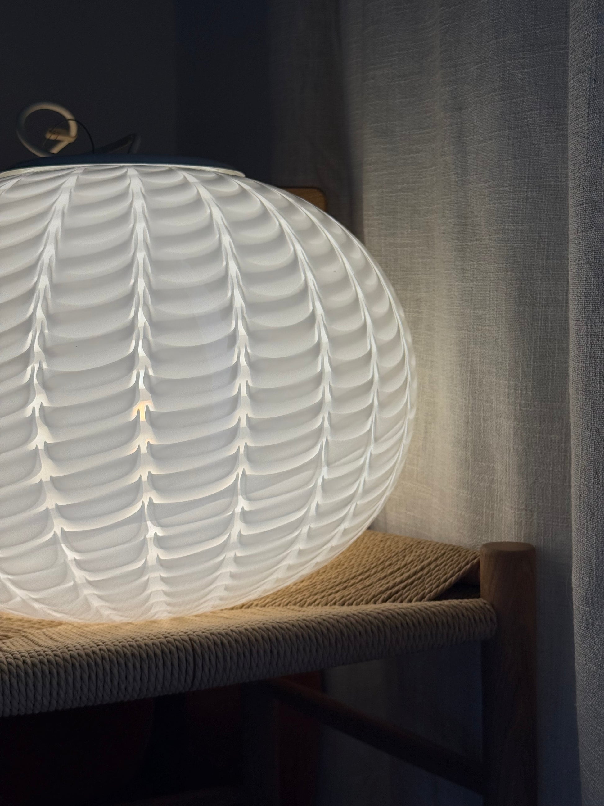 Denne vintage lampe direkte fra Murano står med sit peacock mønsker utroligt smuk. Den er håndlavet i 1960/1970 og det gode håndværk kan både ses og mærkes i strukturen. Lampen er oval og måler hele 42cm i diameter og kommer med hvidt greb.