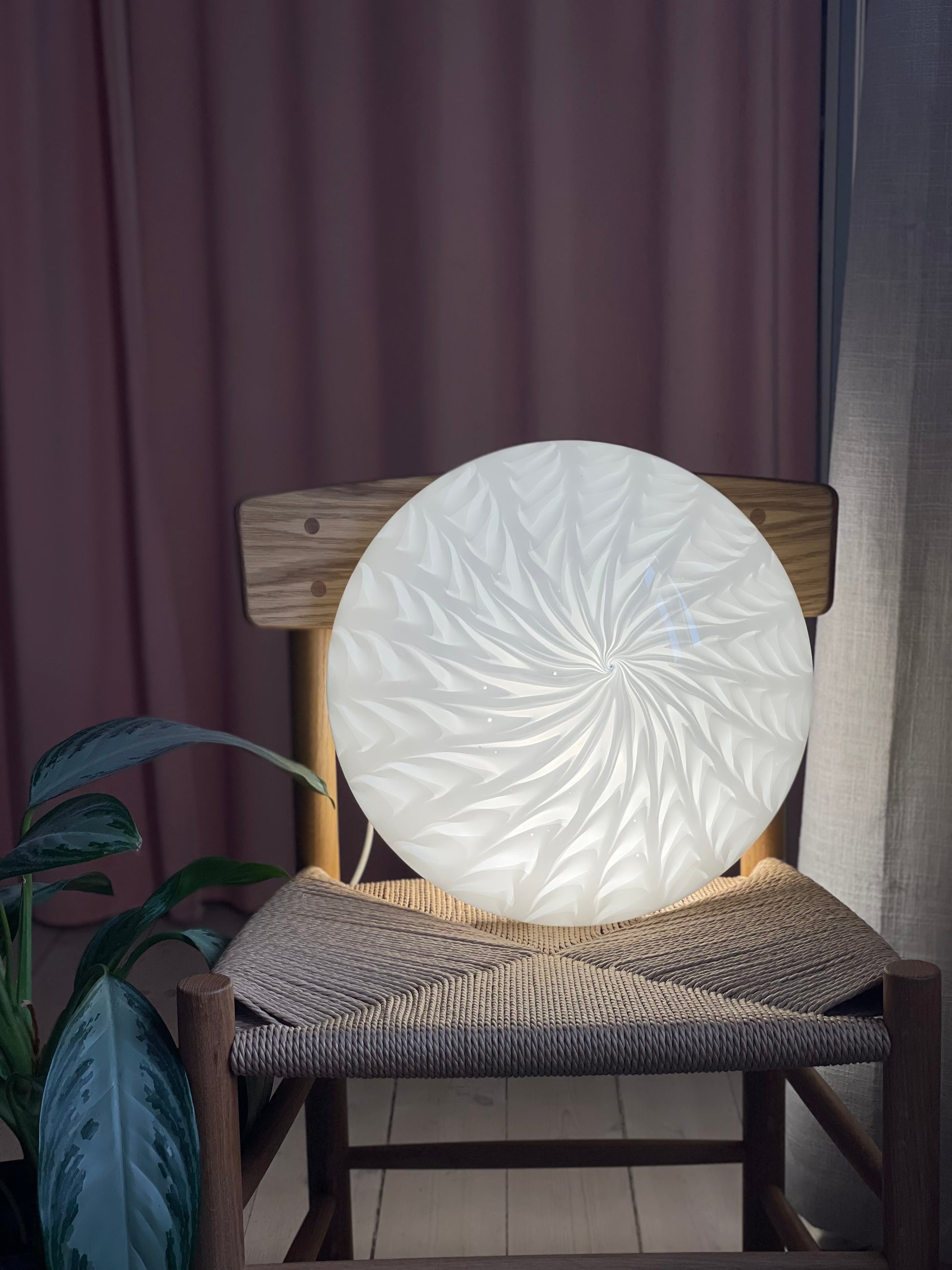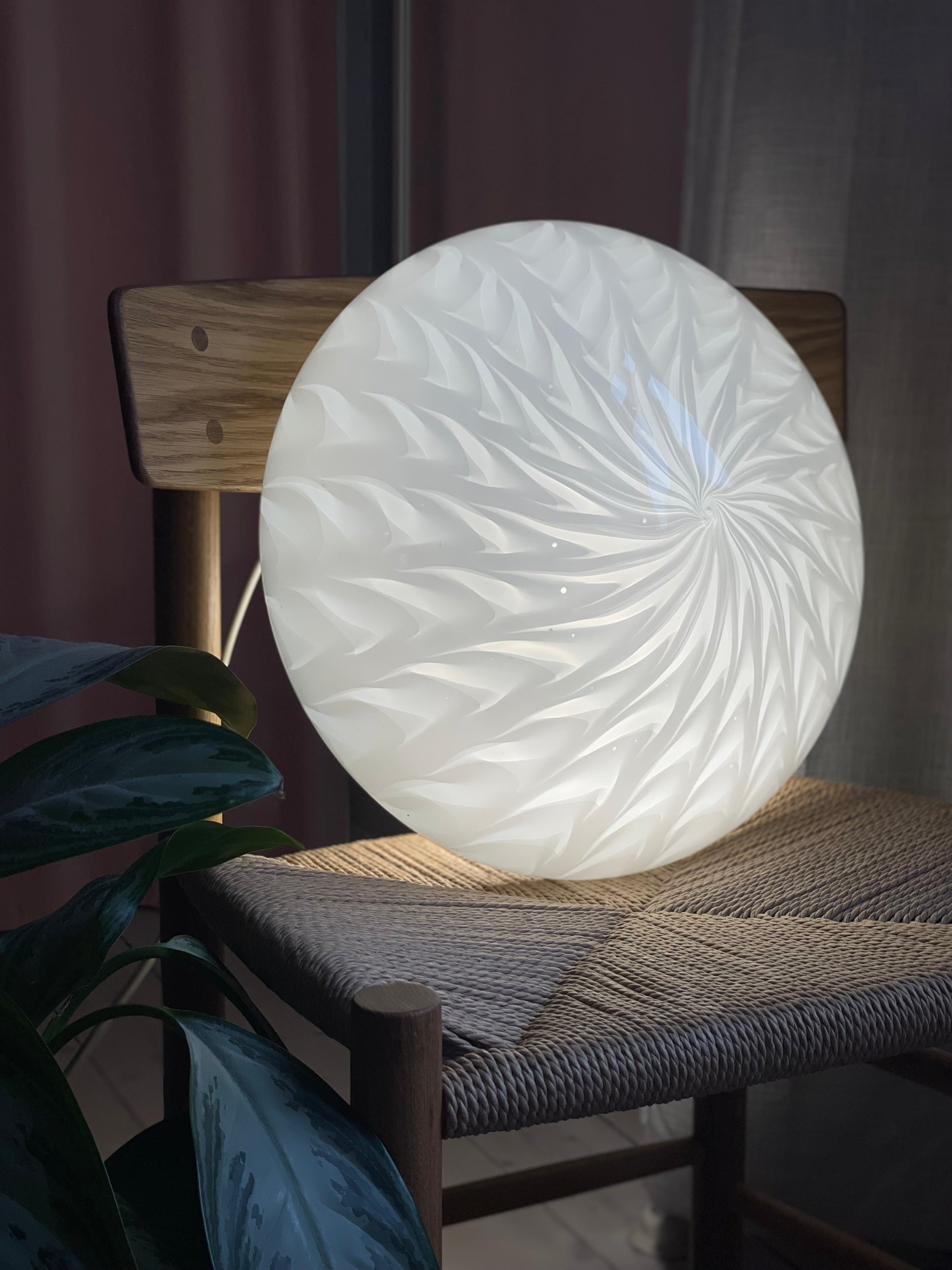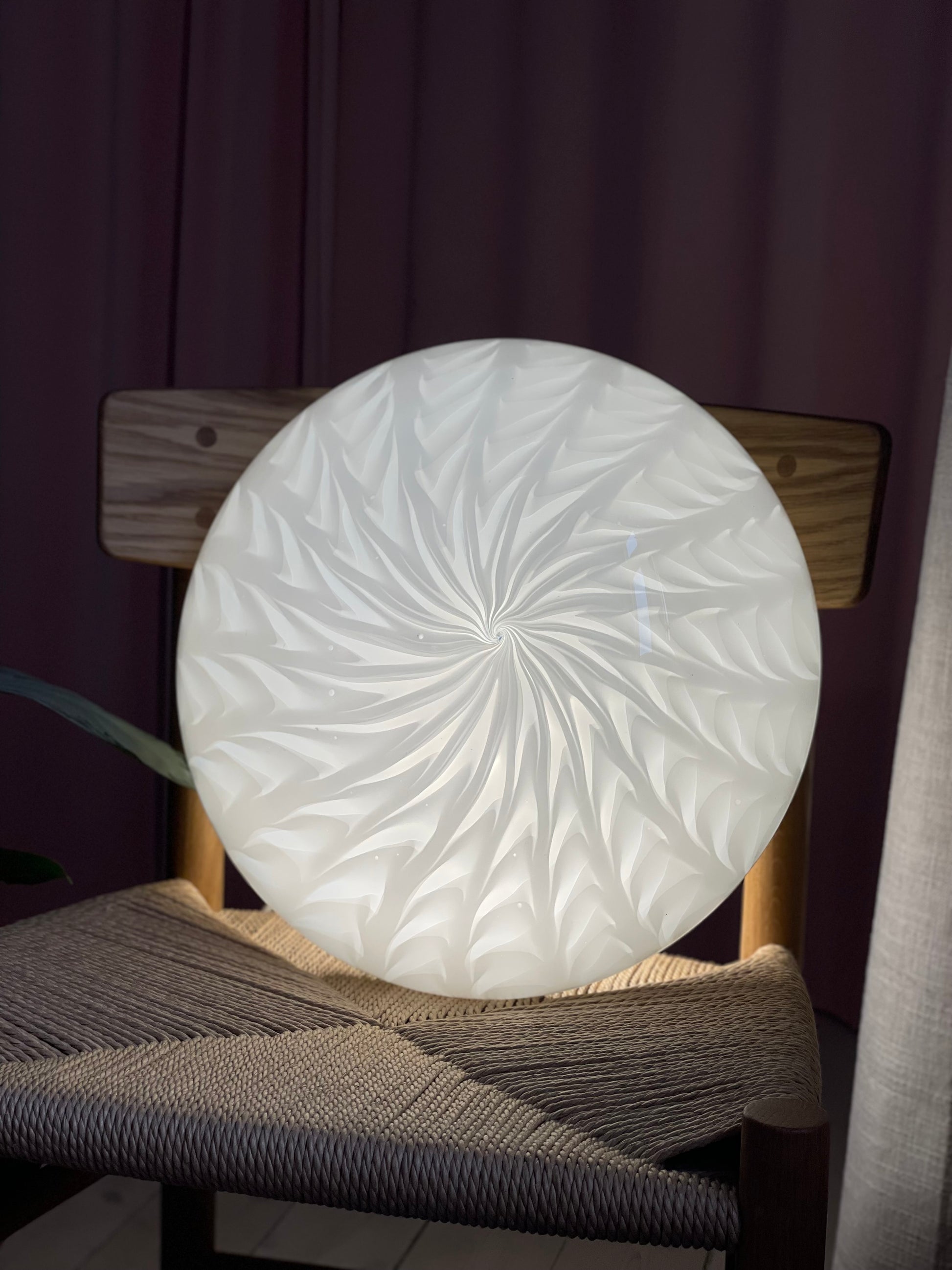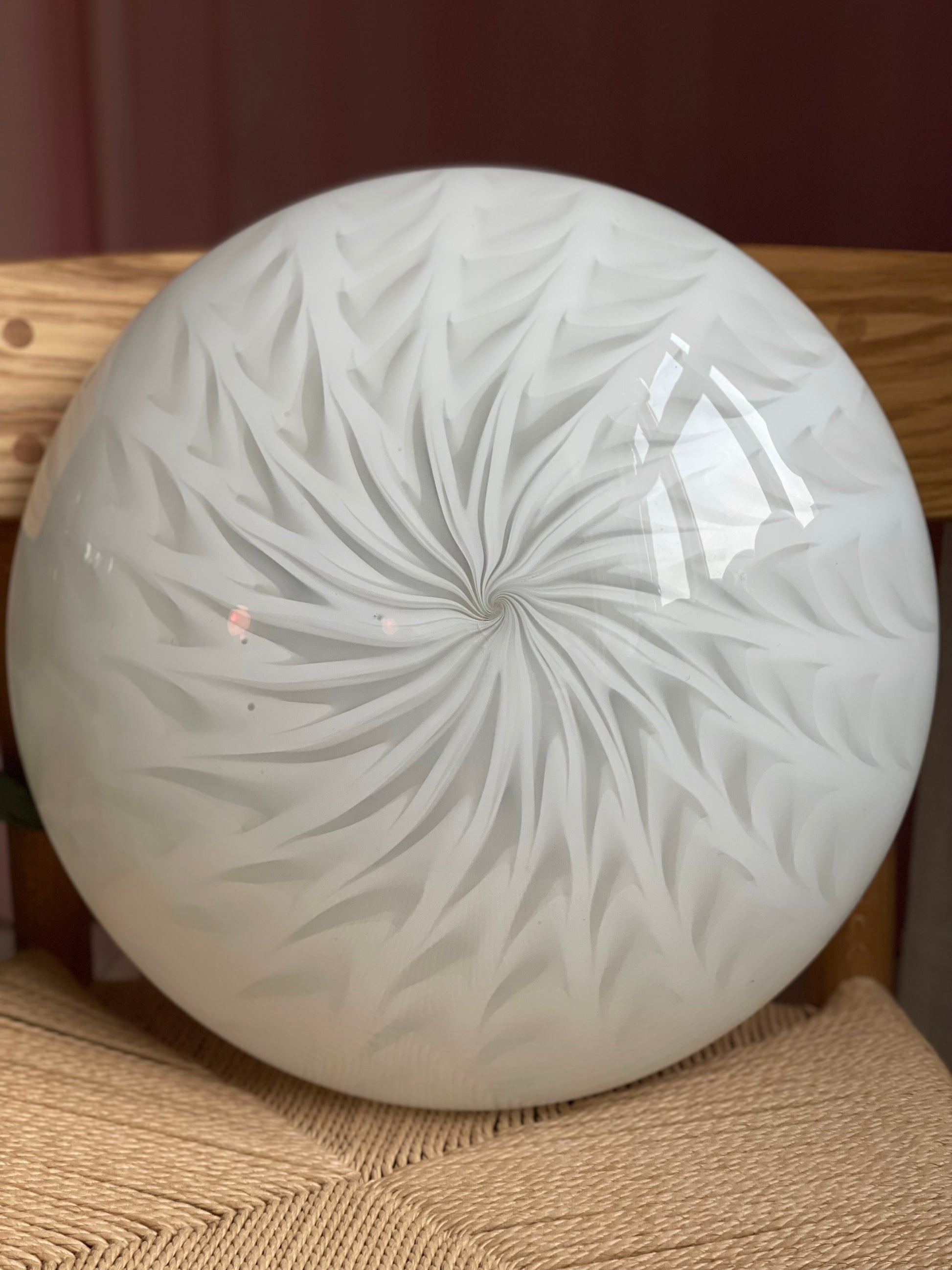 En smuk muranolampe i et mere sjældent mønster. Den giver det smukkeste lys. Lampen er både til montering i loft eller på væg. Den måler 38cm i diameter. Kommer med 2 e27 fatninger