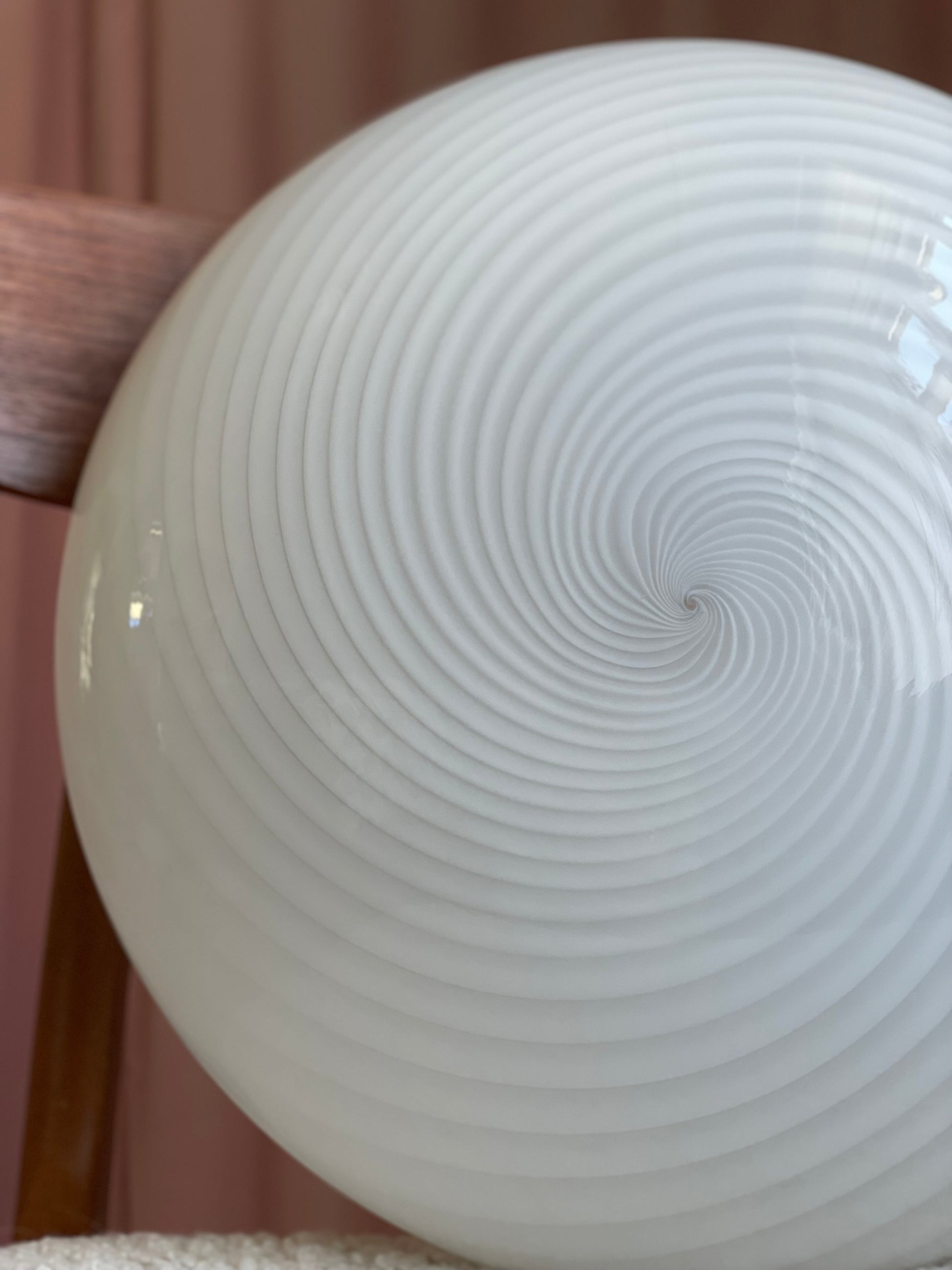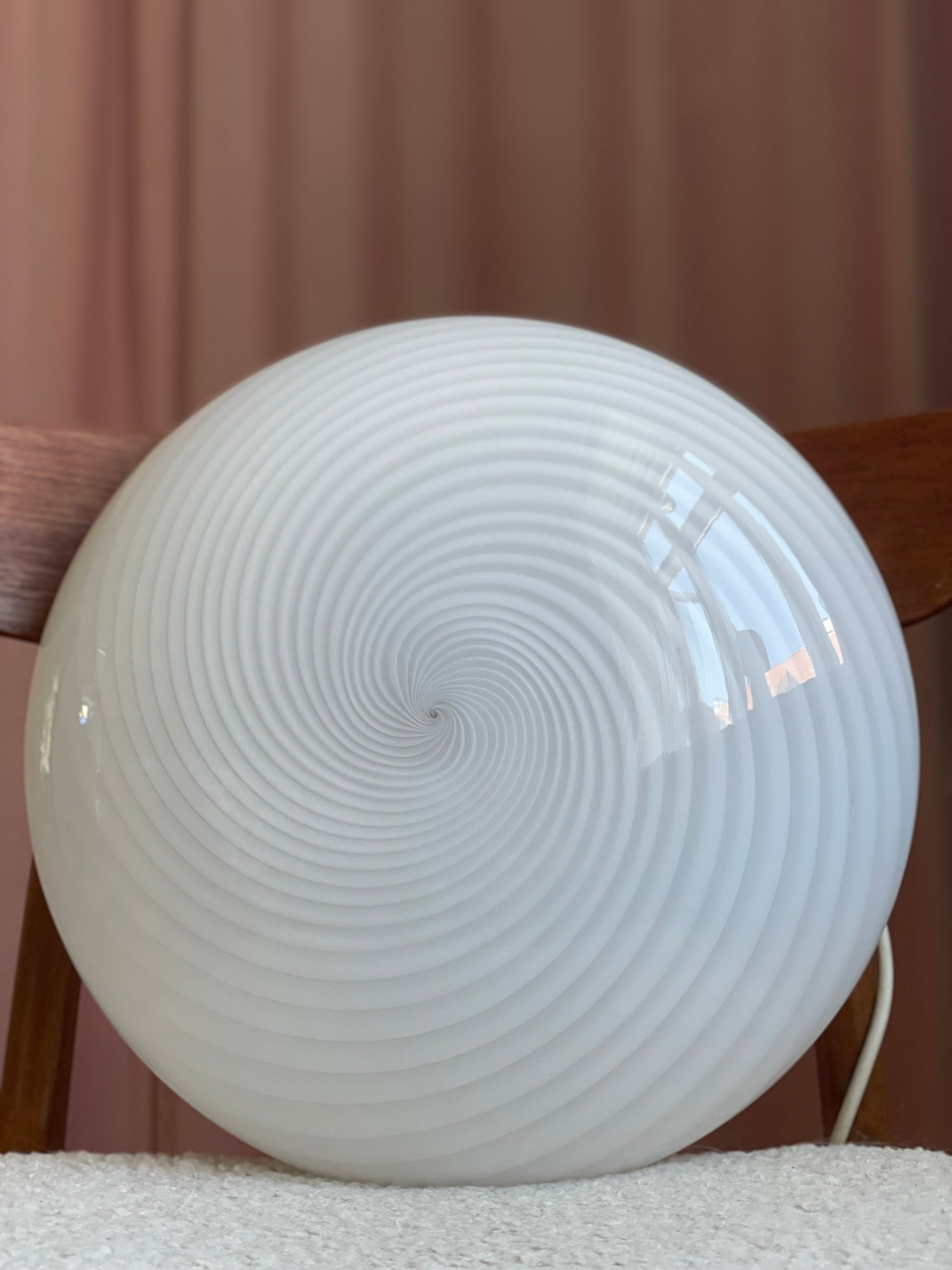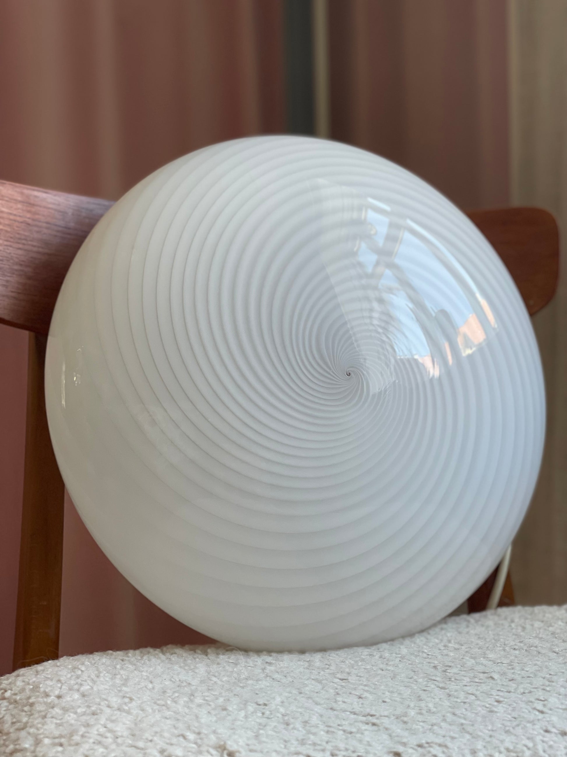 Smuk, klassisk hvid plafond i vintage murano glas med hvid swirl. Lampen kan opsættes både som væglampe og som loftlampe. Den kommer med 2 e27 fatninger og hvid base. Den måler 38cm i bredden.