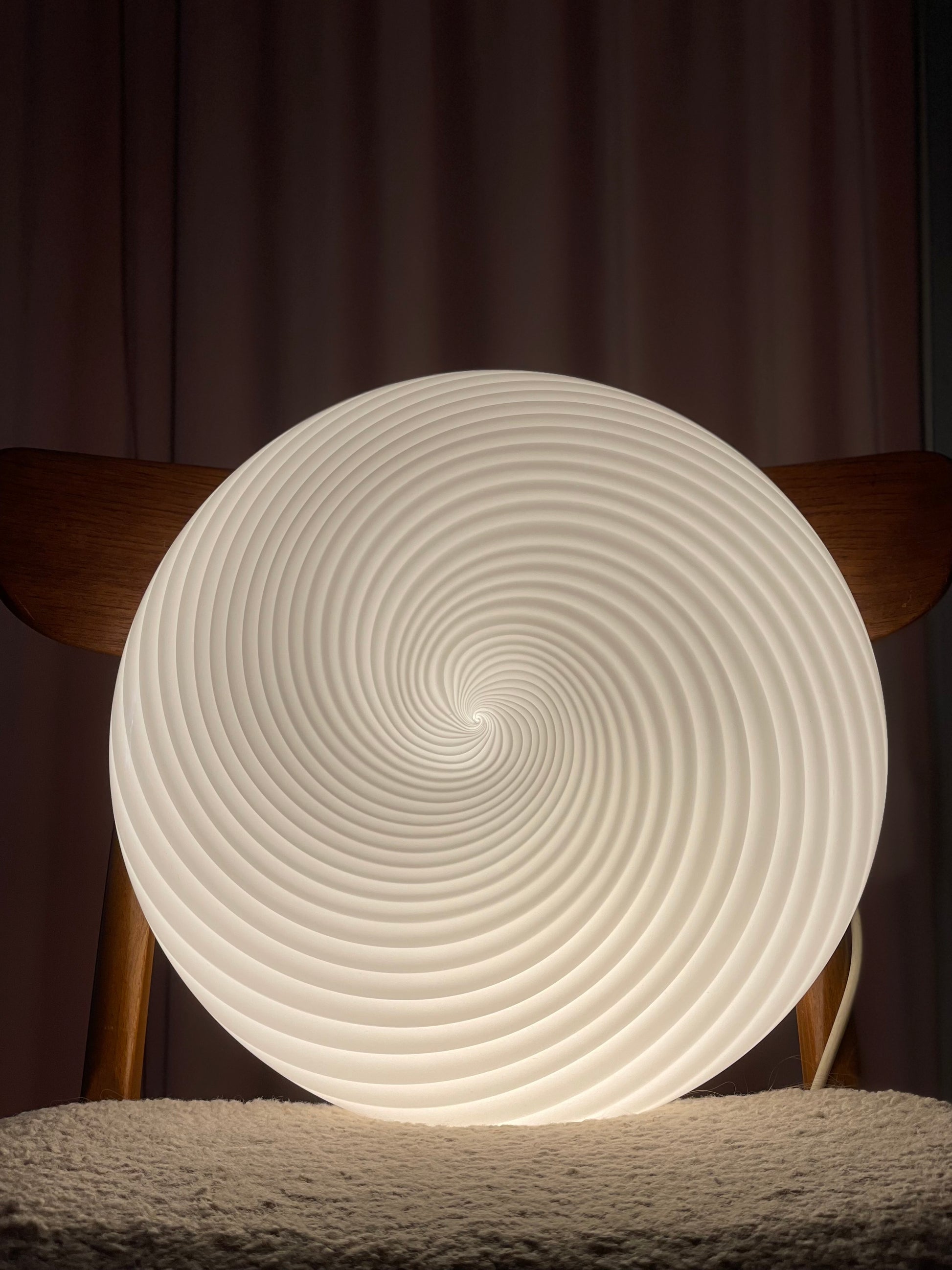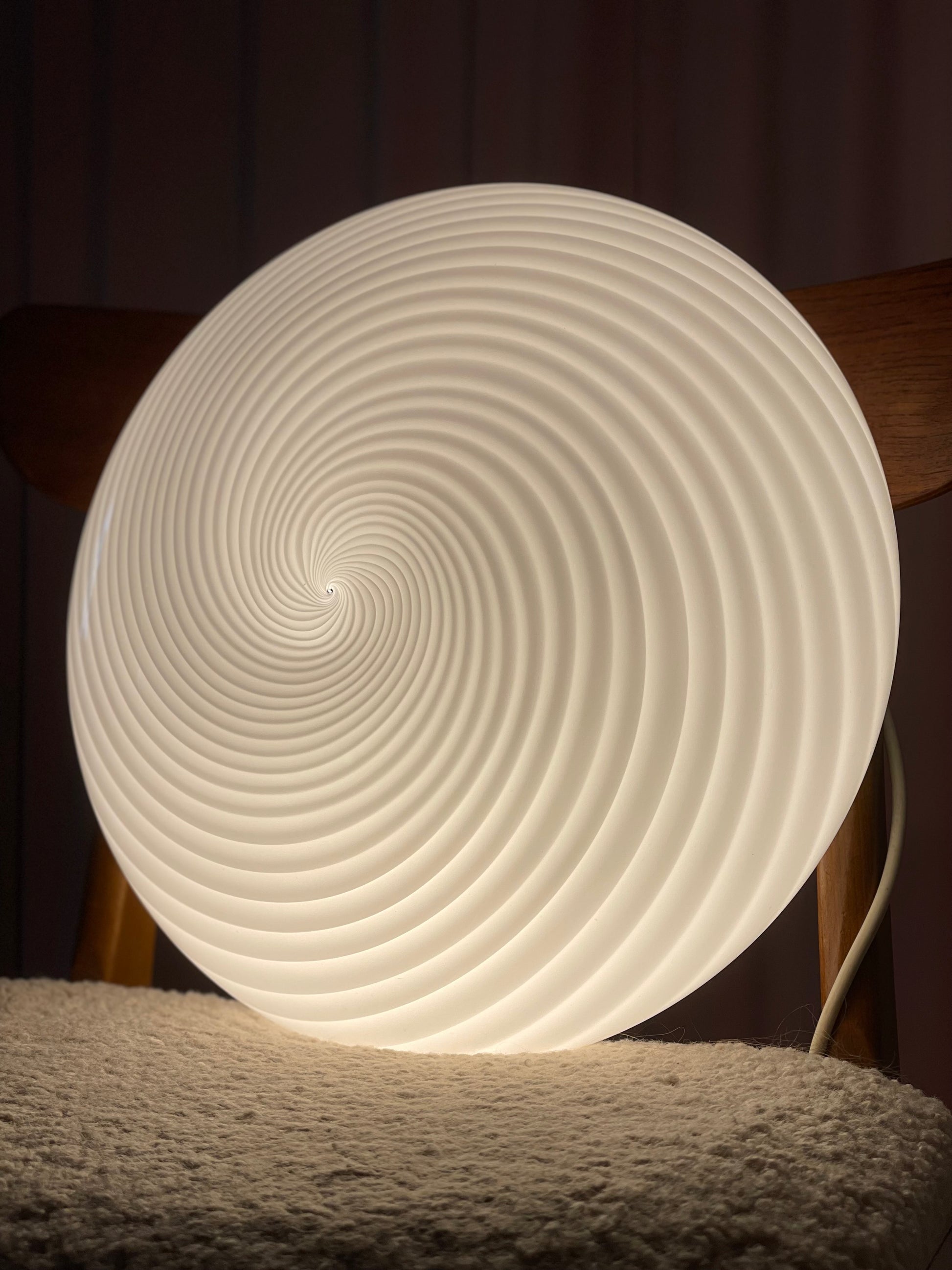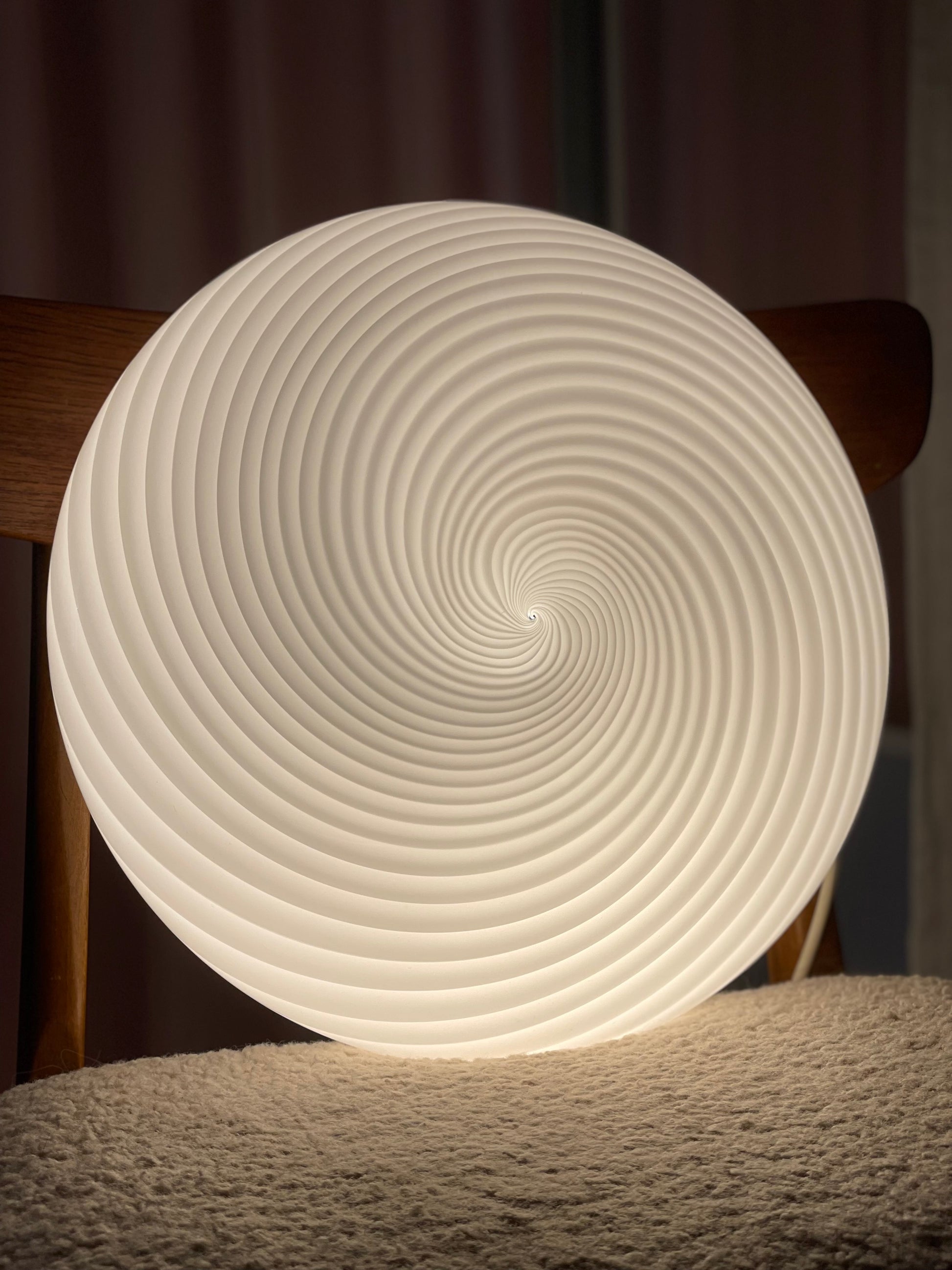 Smuk, klassisk hvid plafond i vintage murano glas med hvid swirl. Lampen kan opsættes både som væglampe og som loftlampe. Den kommer med 2 e27 fatninger og hvid base. Den måler 38cm i bredden.