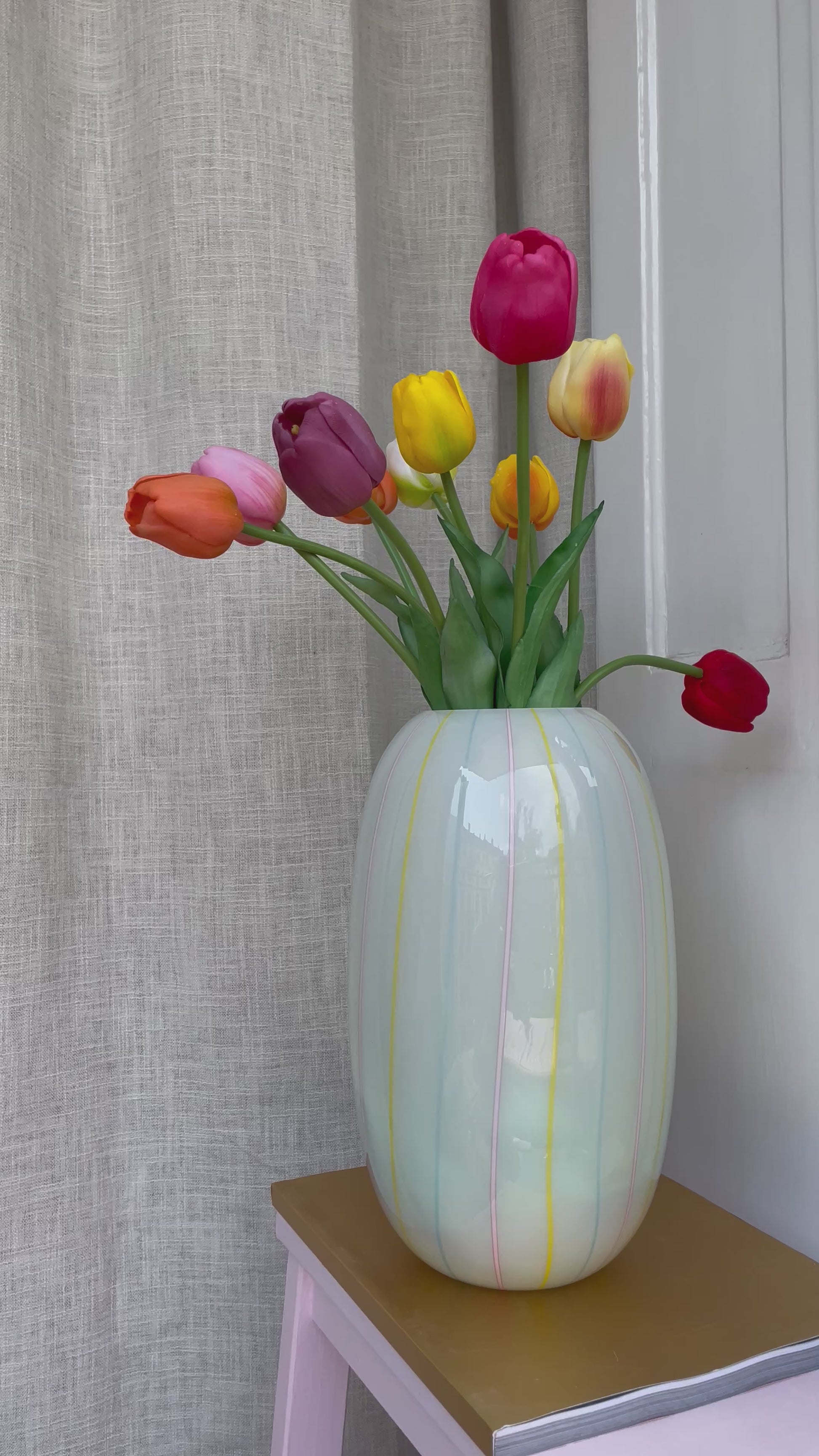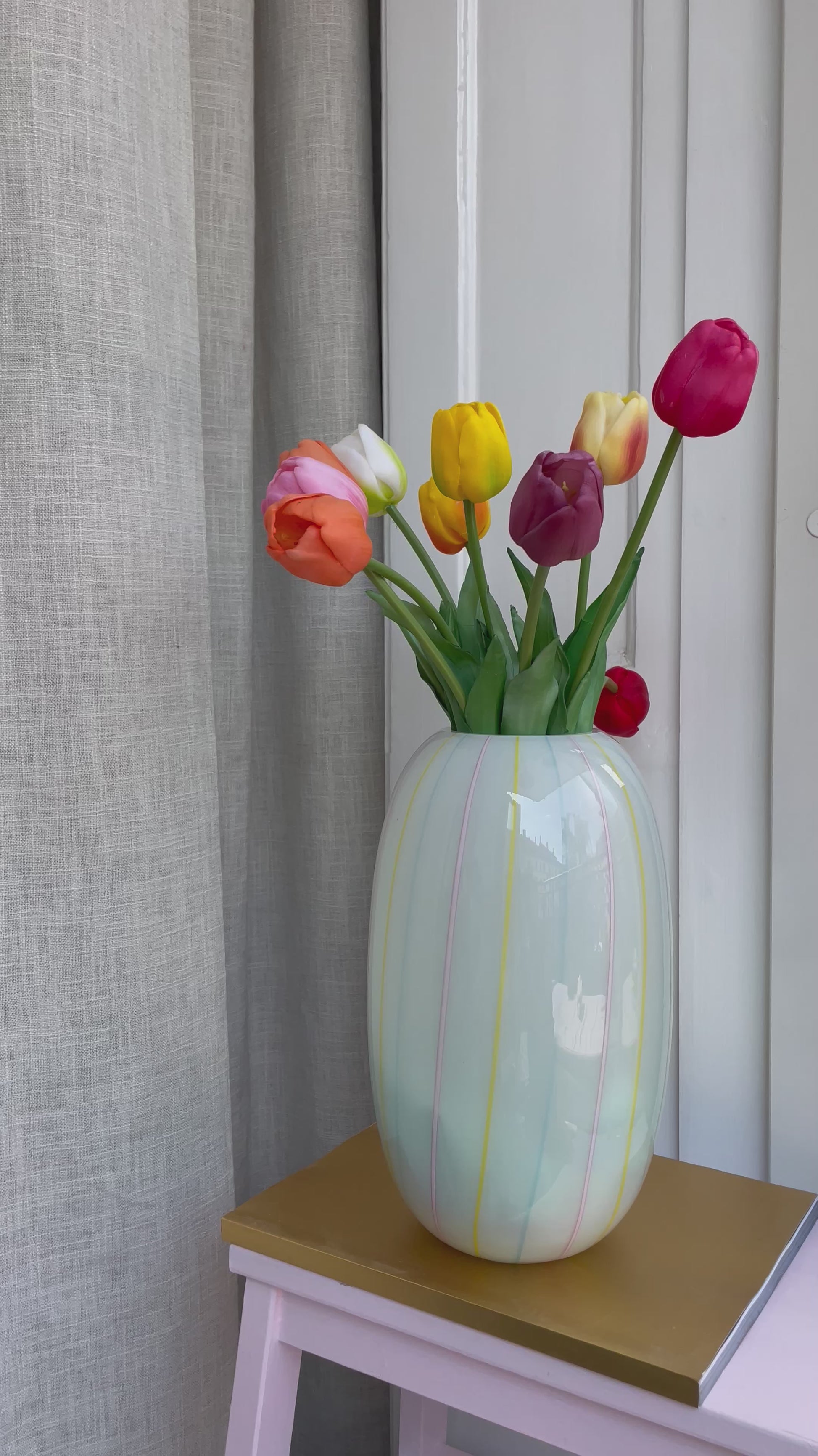 Fantastisk smuk stor Murano vase i hvidt glas med farvede striber. Vasen måler hele 31cm i højden og har en åbning på 8cm.