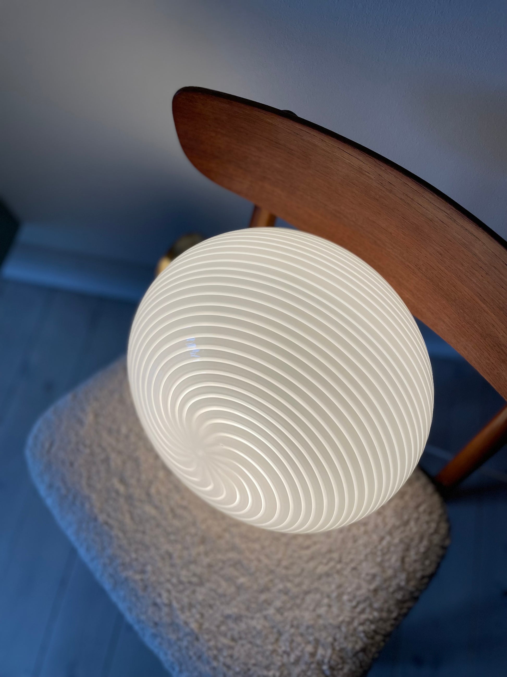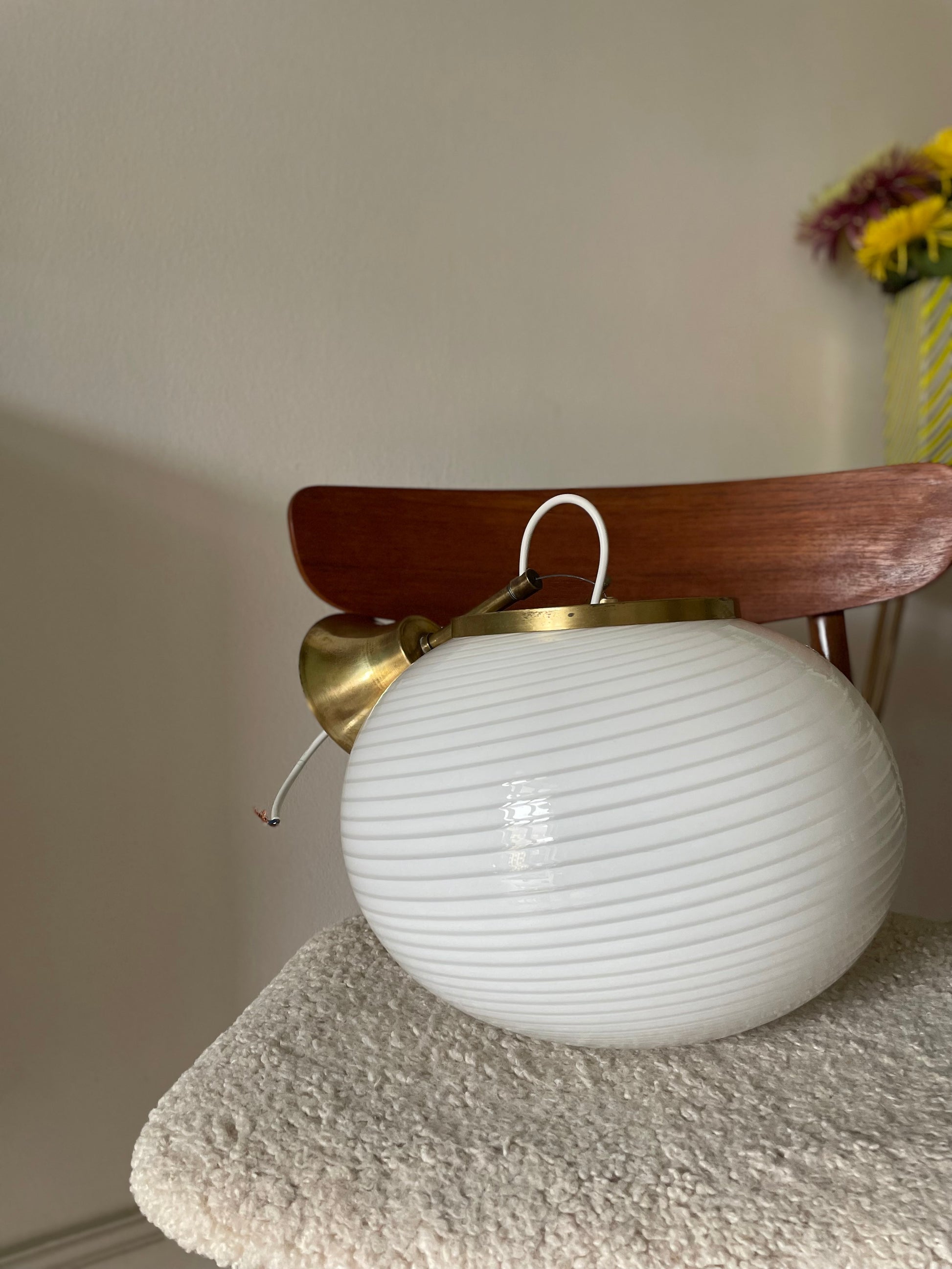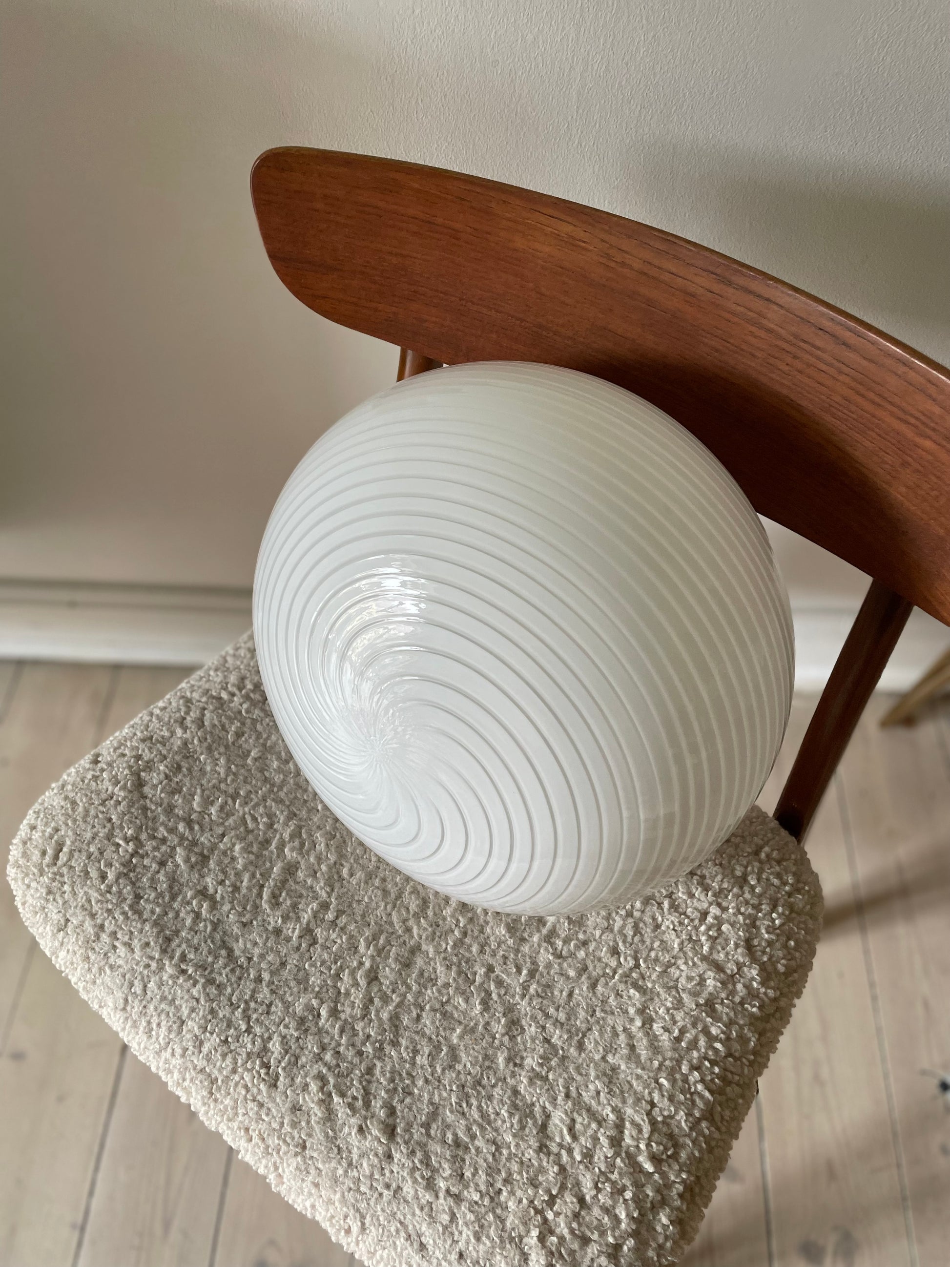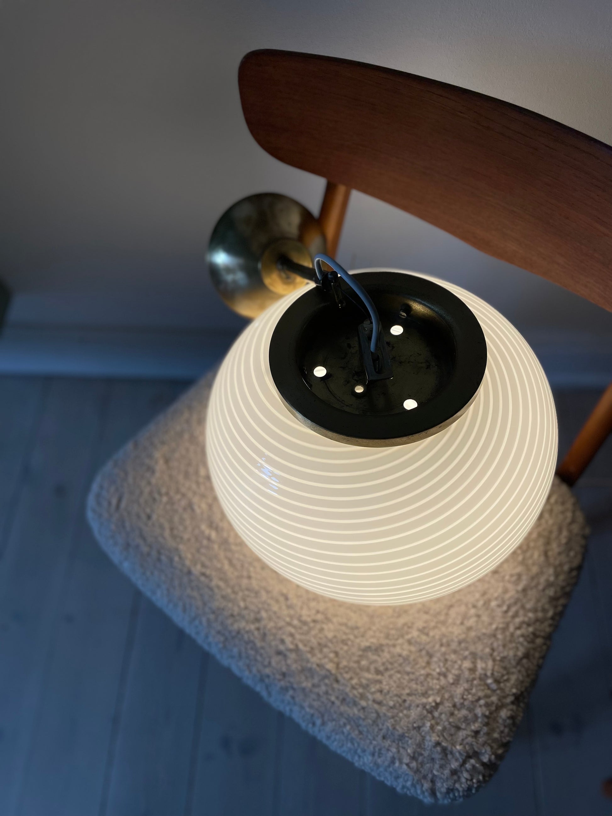 Den fineste lille pendel til børneværelset eller det lille hjørne. Lampen kommer i smukt udført hvidt glas med den fine swirl teknik. Den er oval og måler 35cm i bredden og 27cm i højden. Den kommer desuden med messing ophæng.